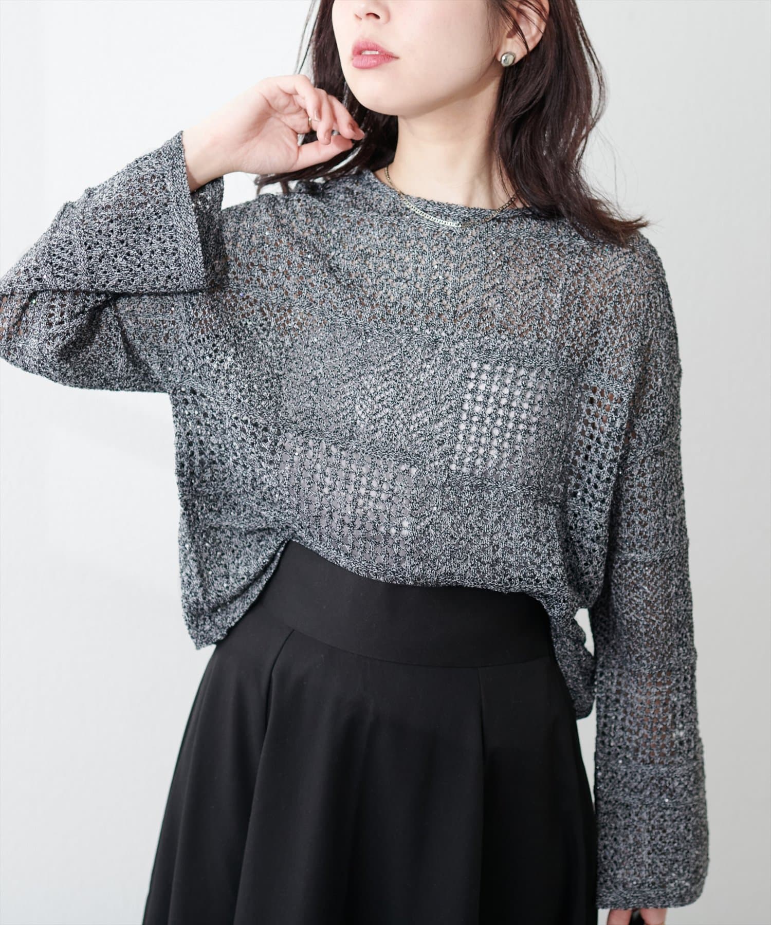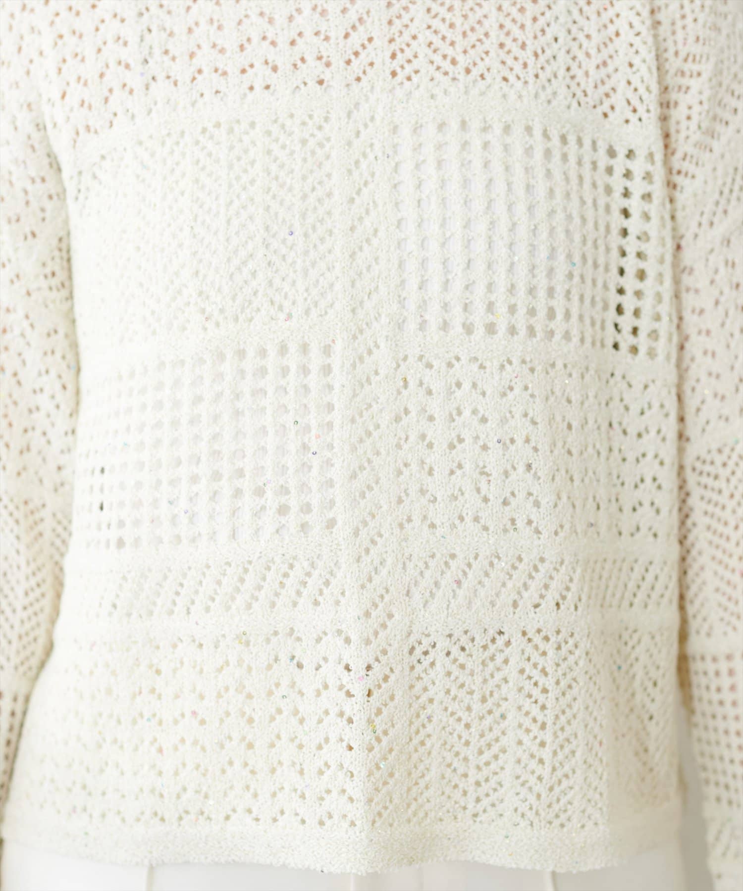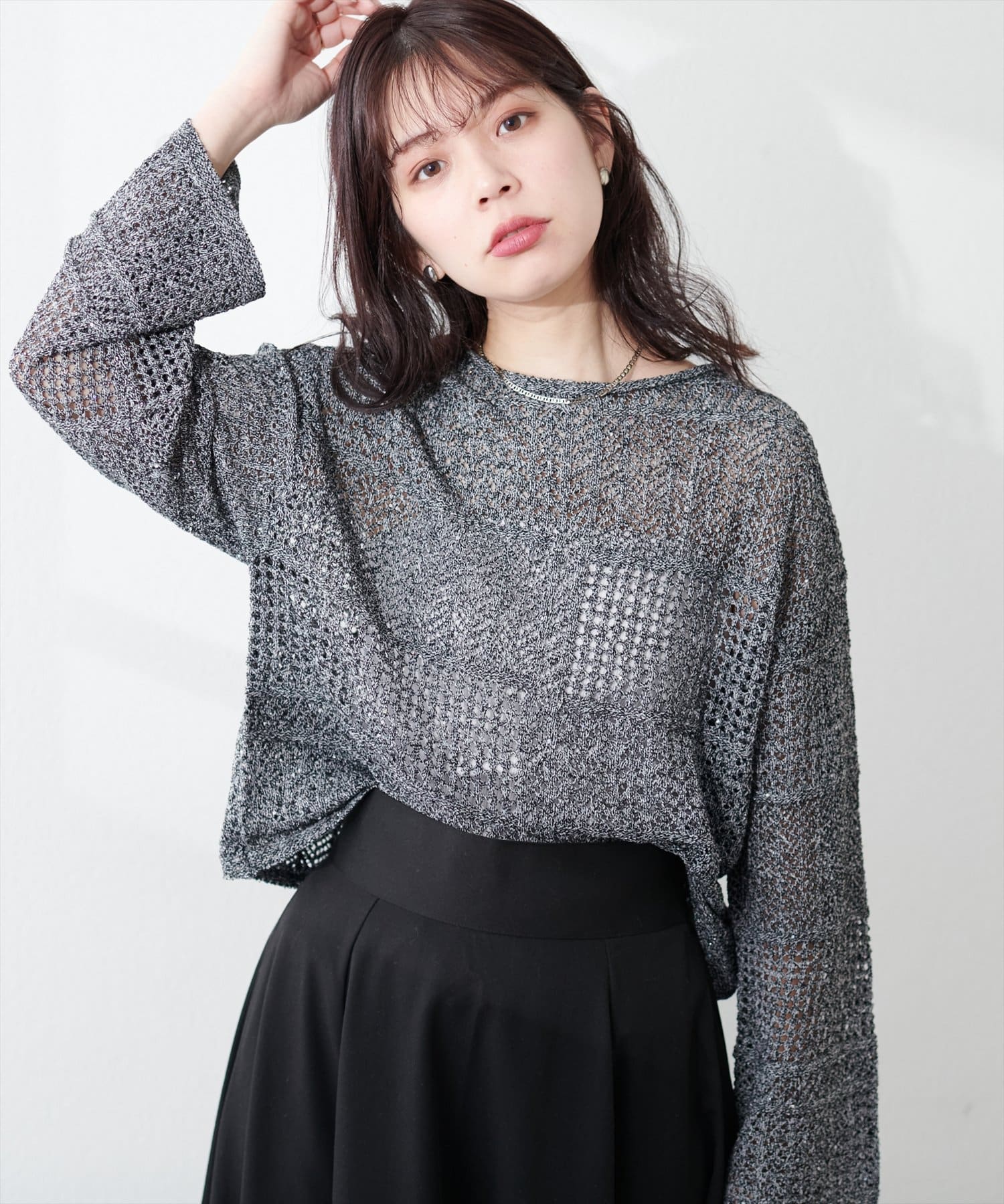 きらきらとしたシャイニー感が目を惹く透かし編みニット