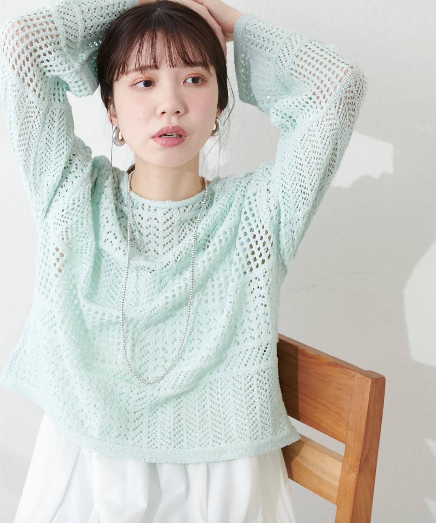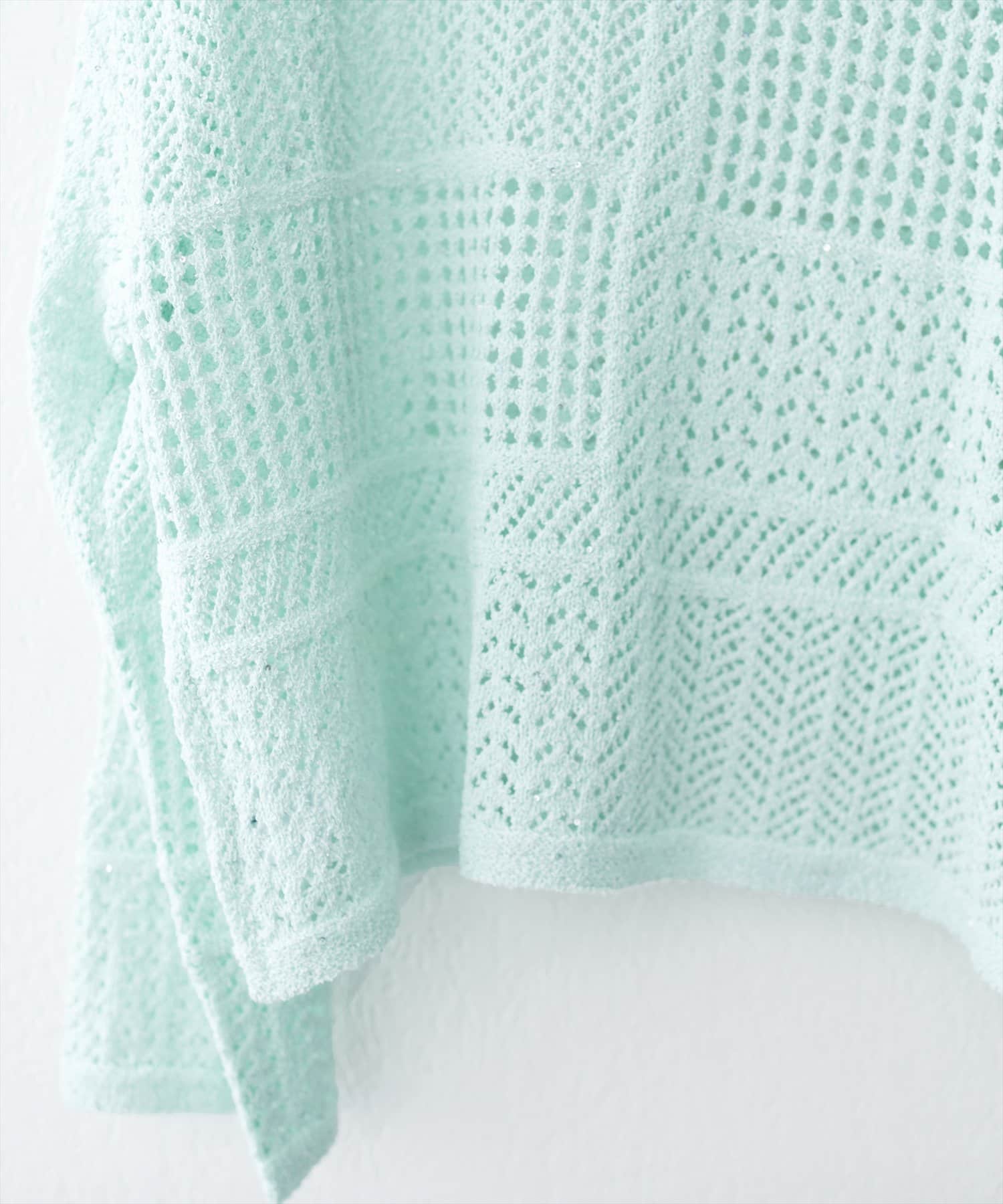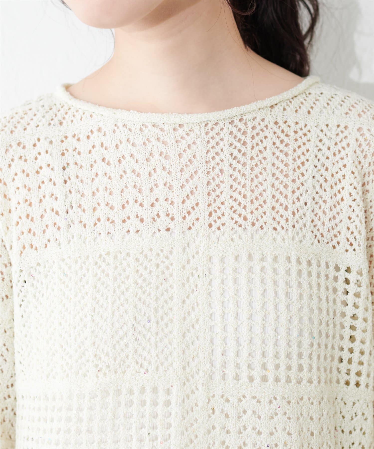 きらきらとしたシャイニー感が目を惹く透かし編みニット