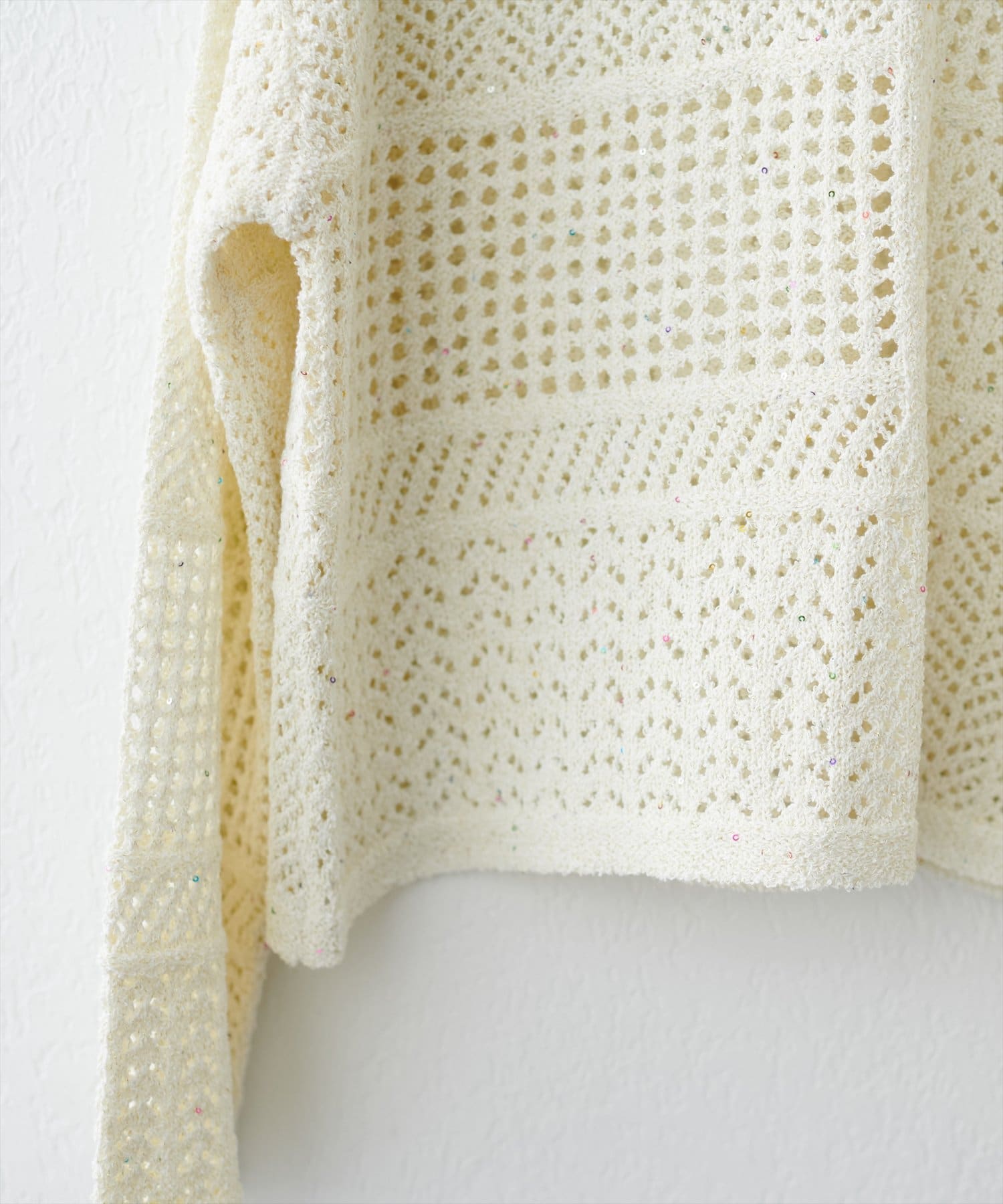キラキラとした細かなスパンコール糸で編み上げた、クラフト感のある大人ニット。