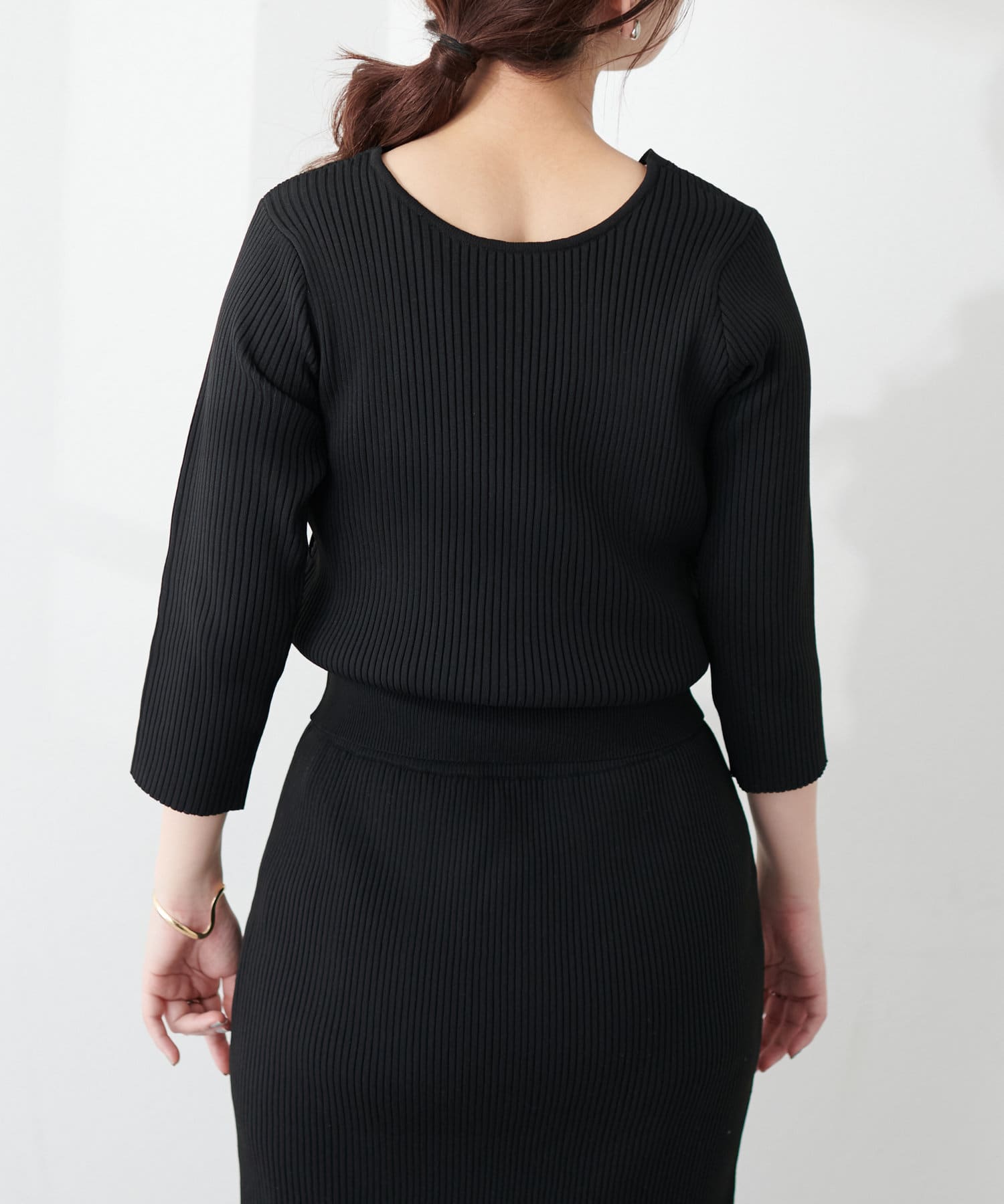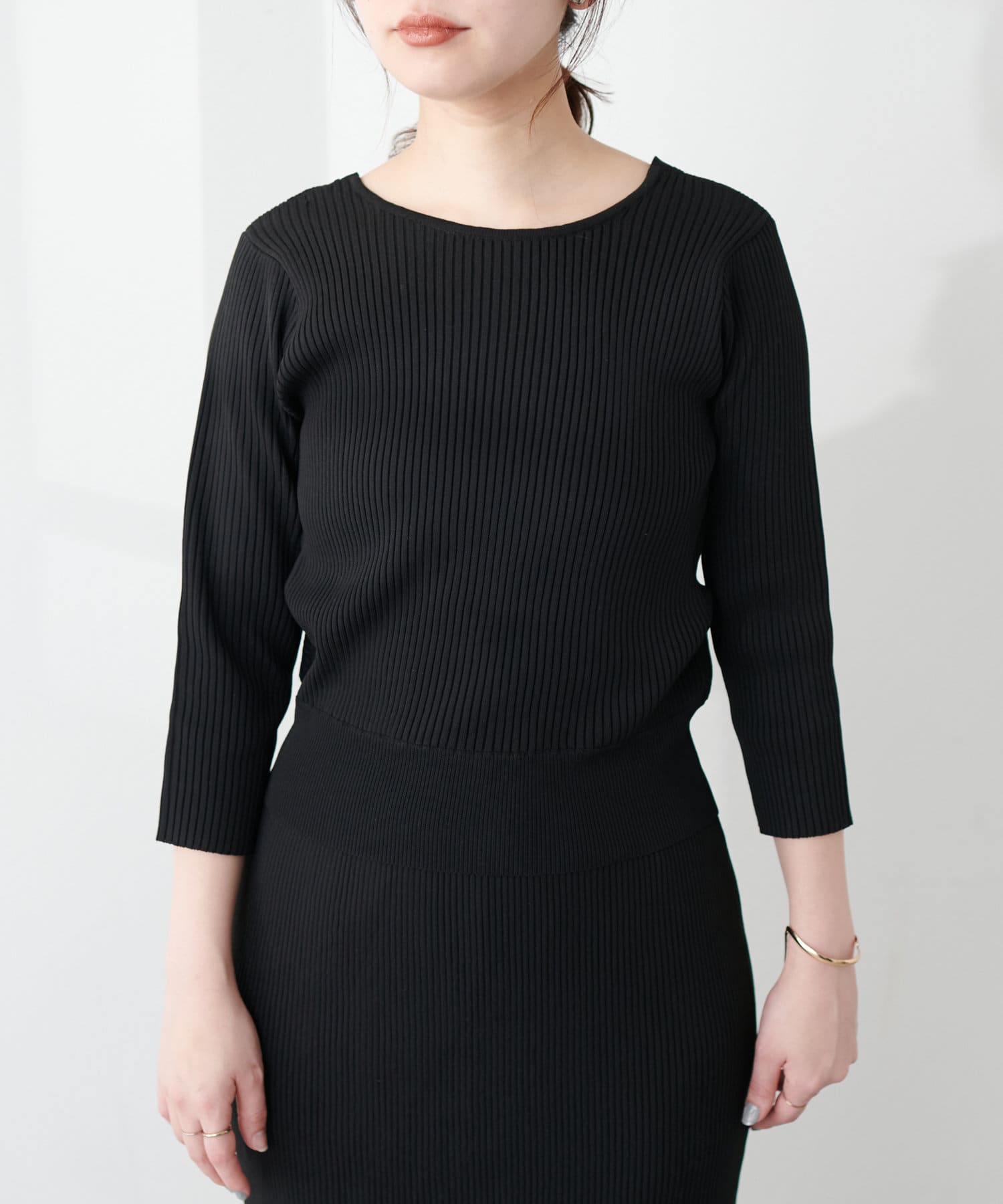 肌触りよく伸縮性もバツグンな細リブ素材を使用しており、細見え効果も◎