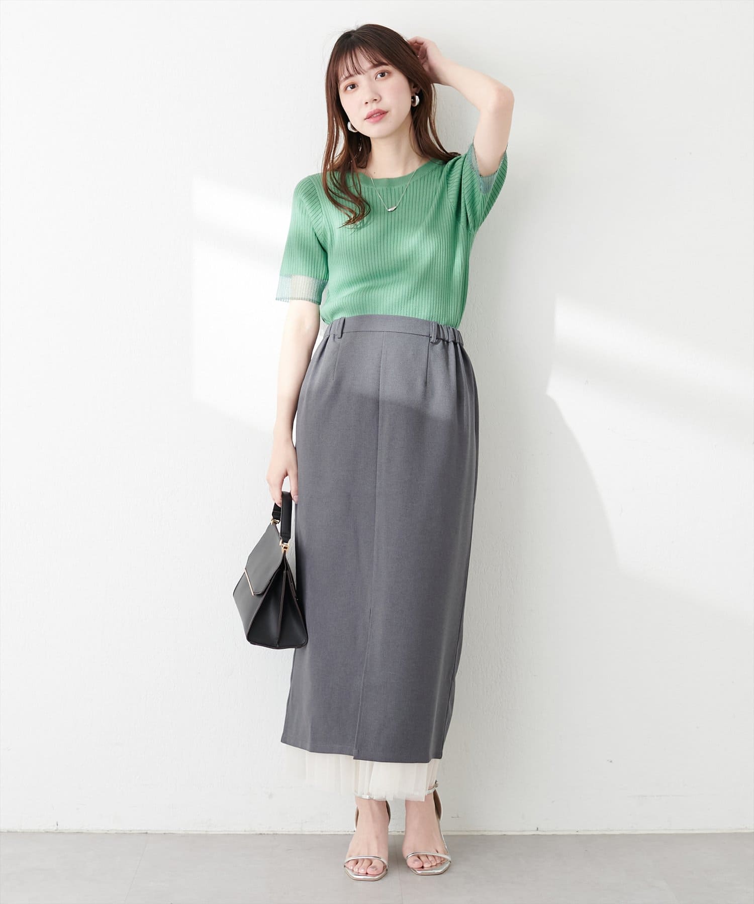 今季トレンドのスリットスカートや、ハイウエストのボトムスにウエストアウトですっきり合わせて頂くと、