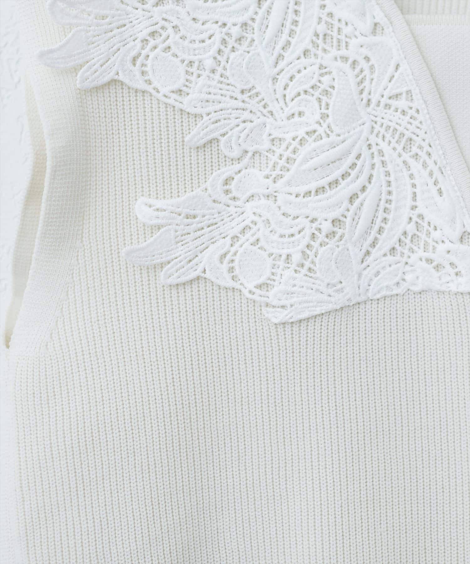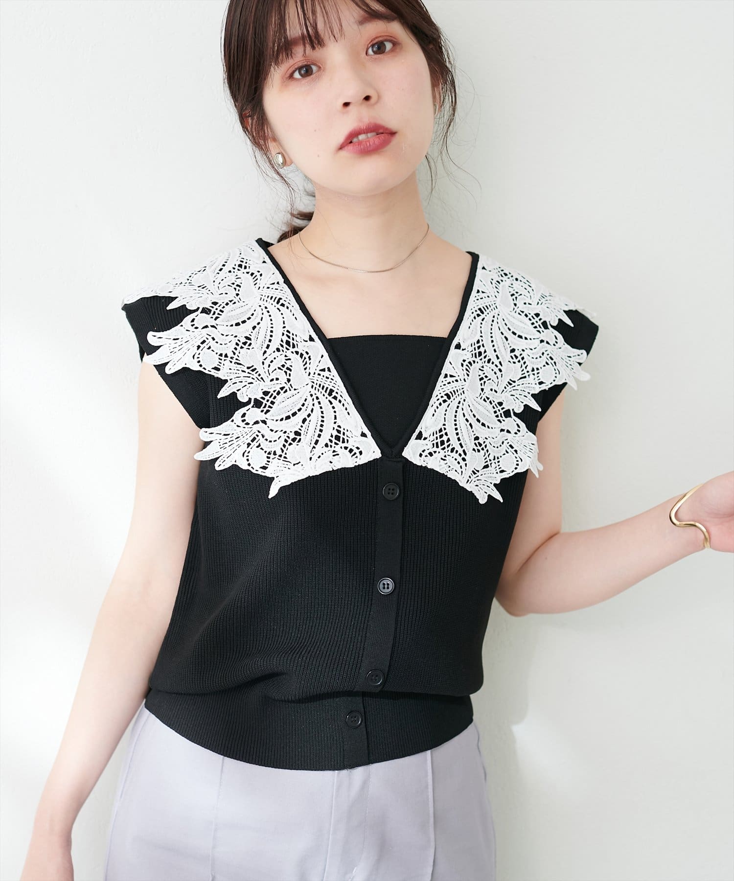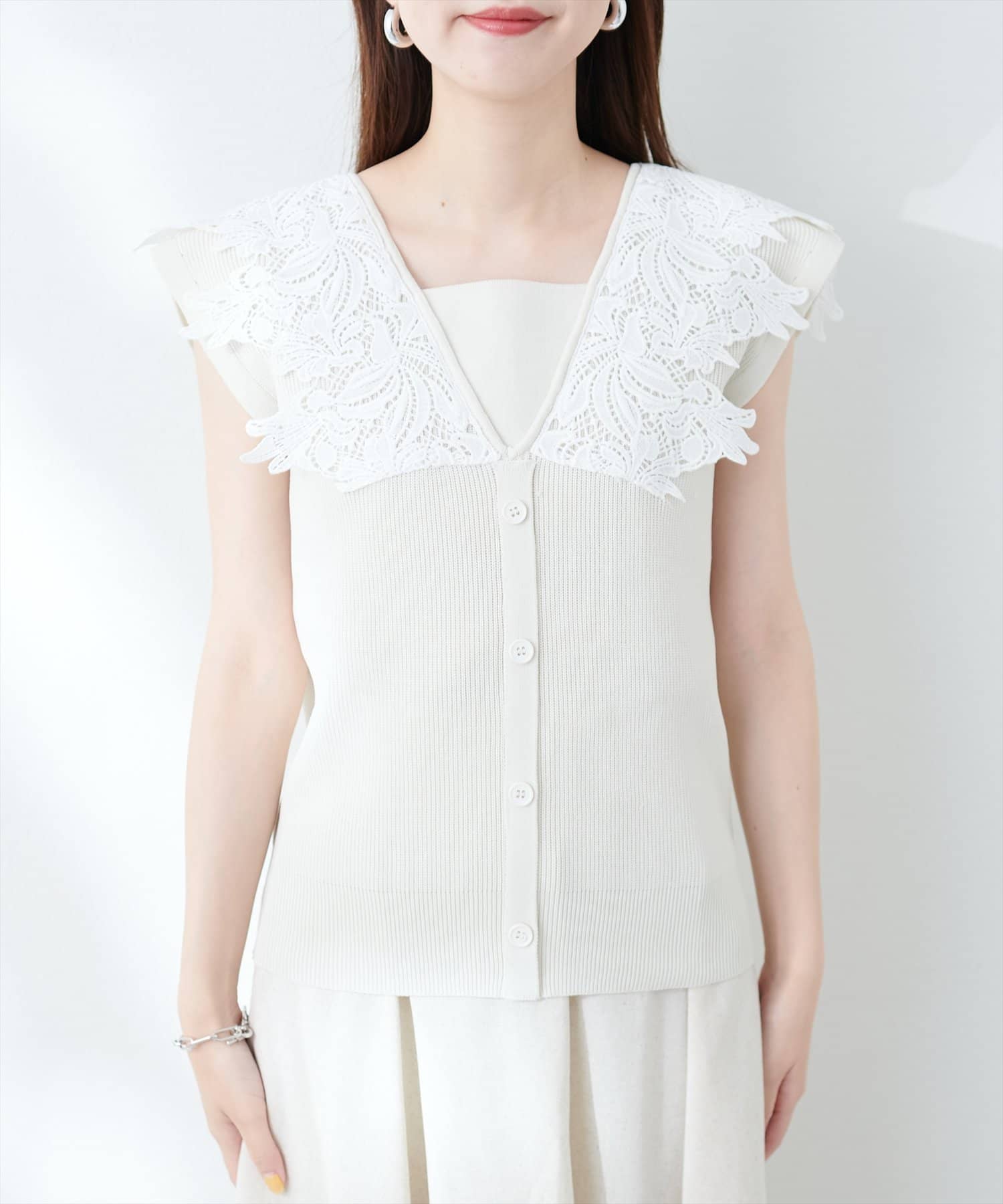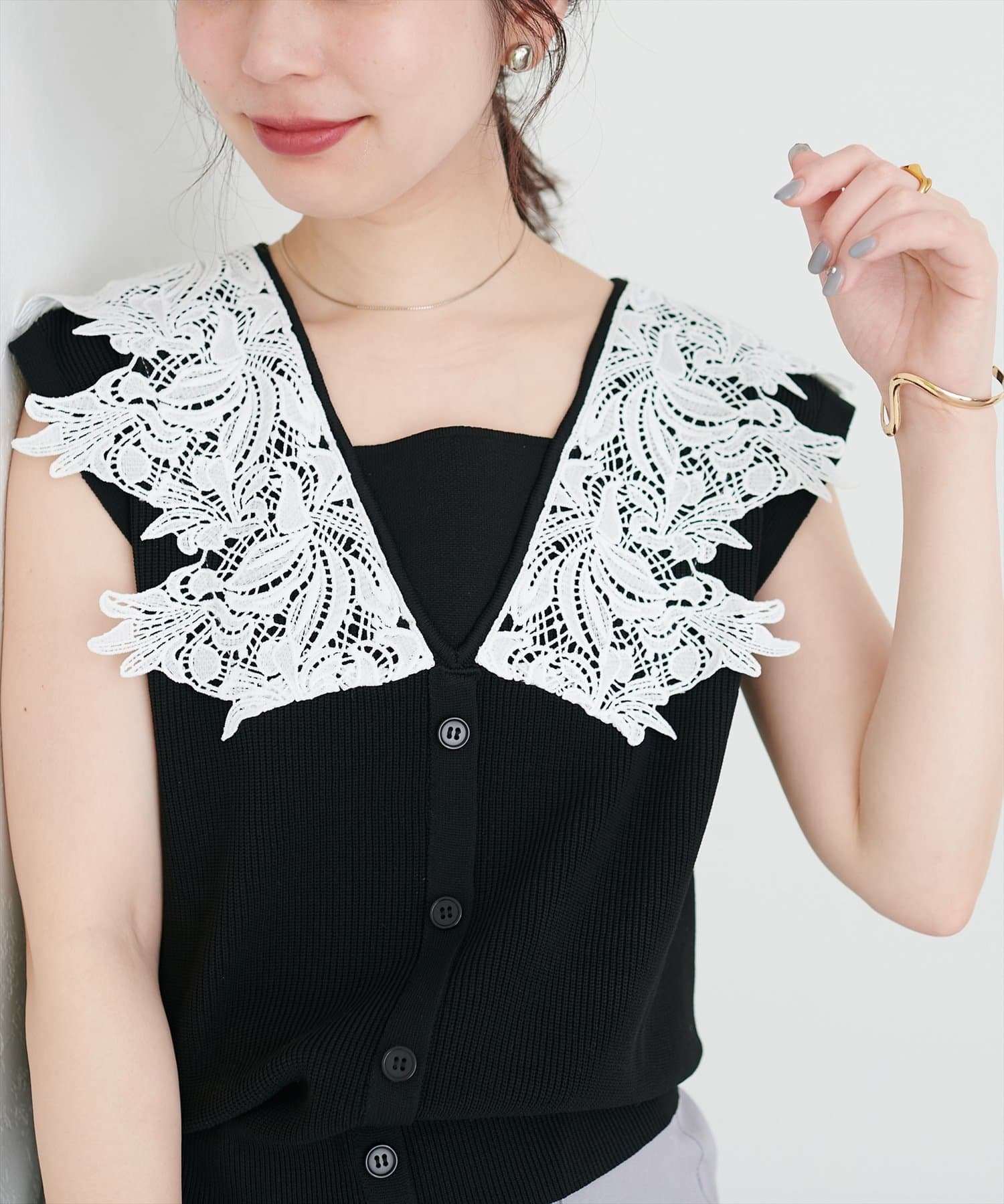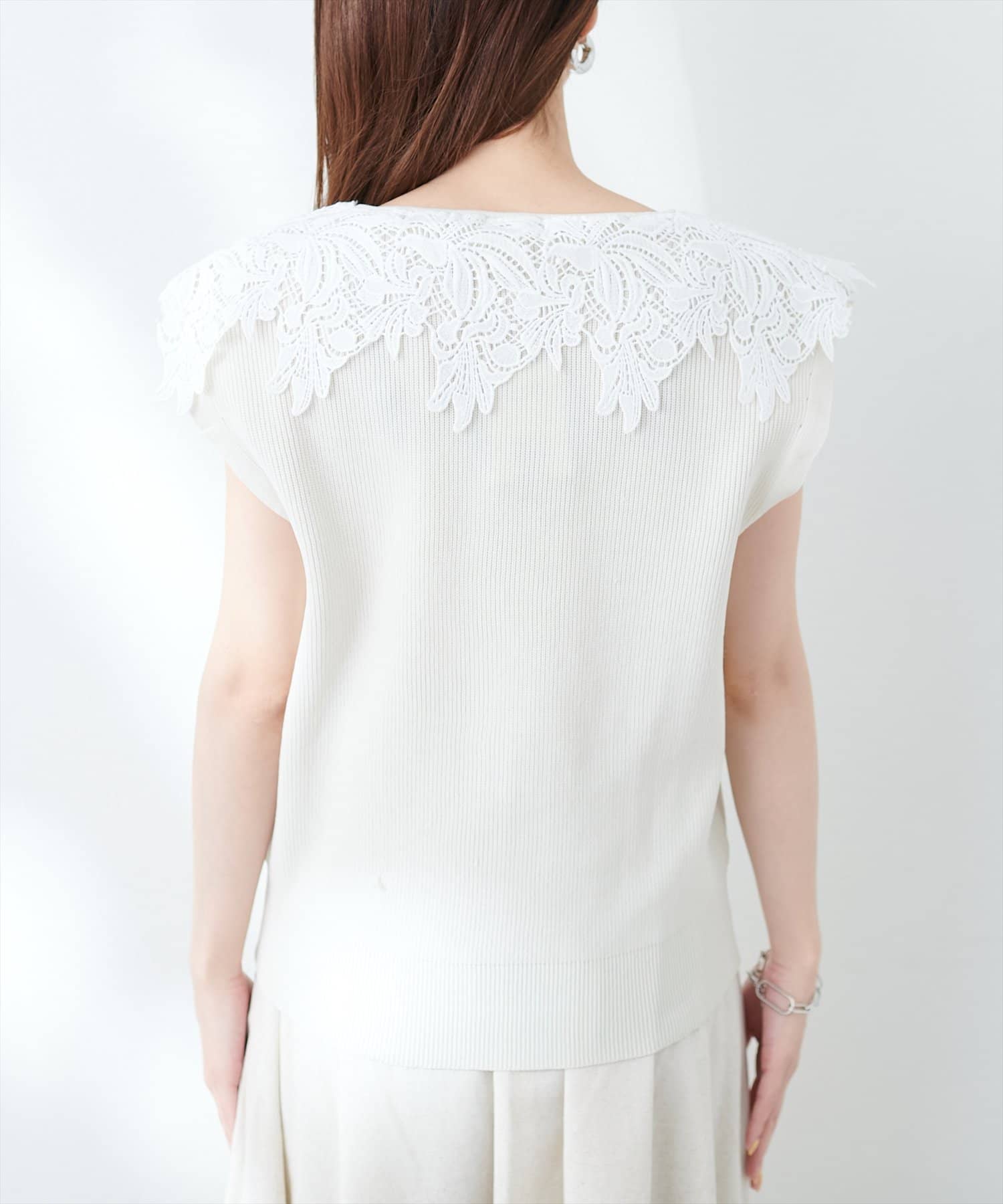 モチーフレースの大胆な衿が印象的なノースリーブニット。