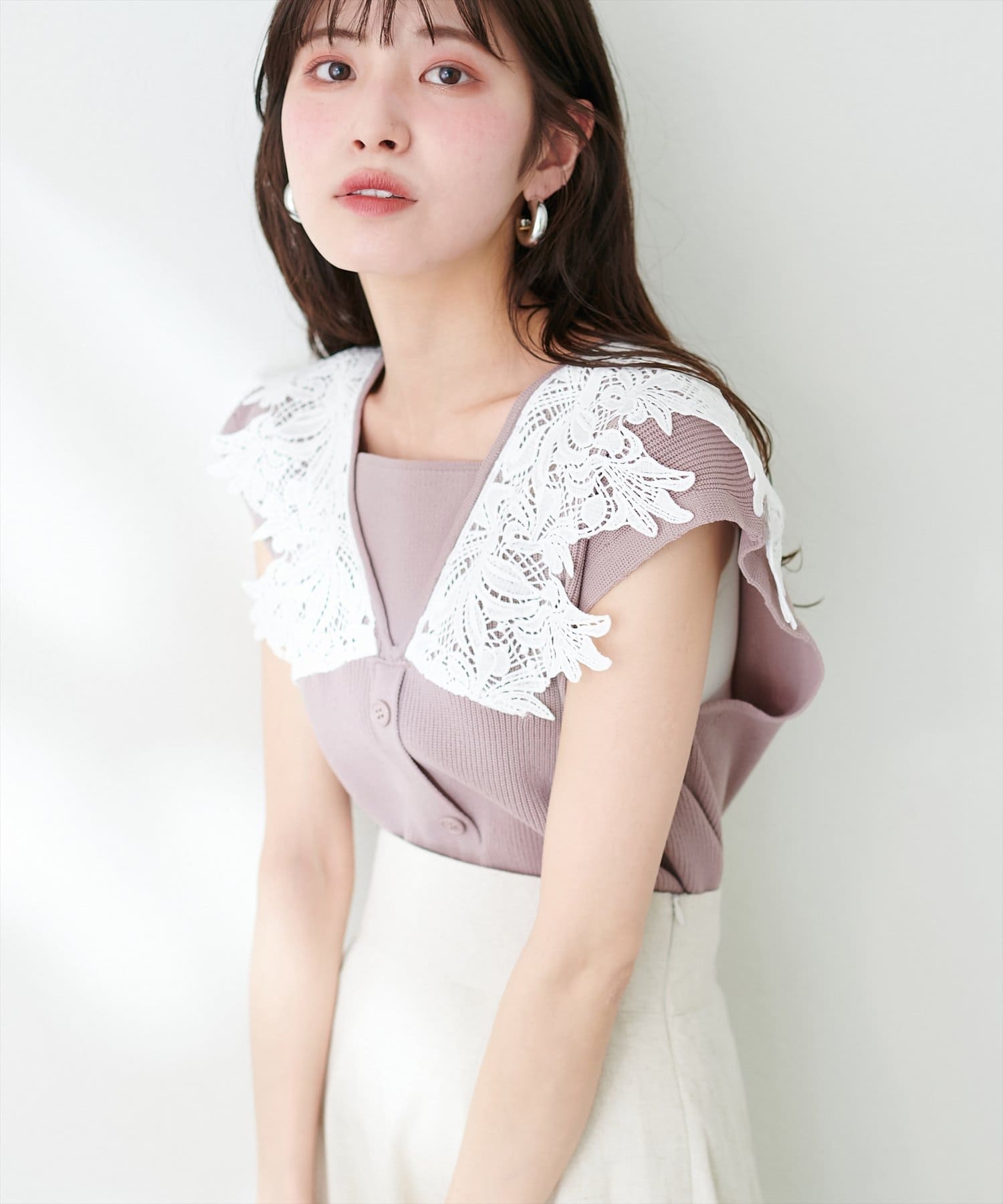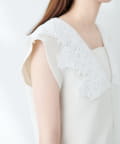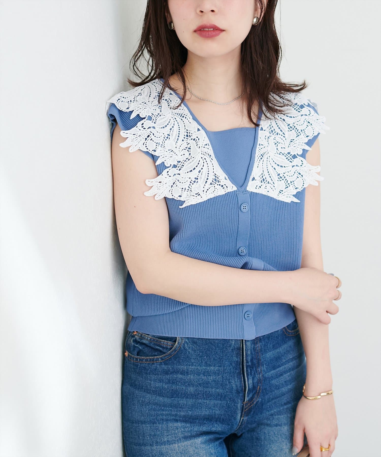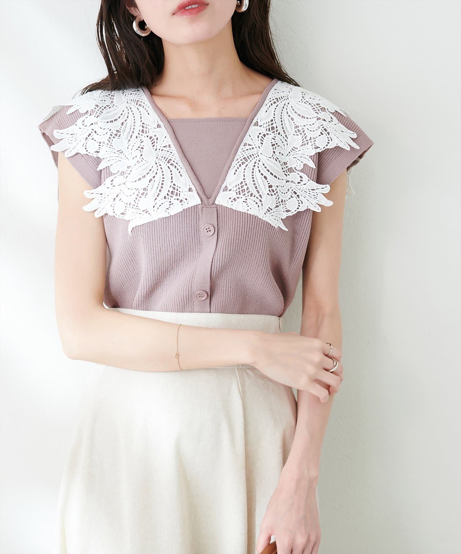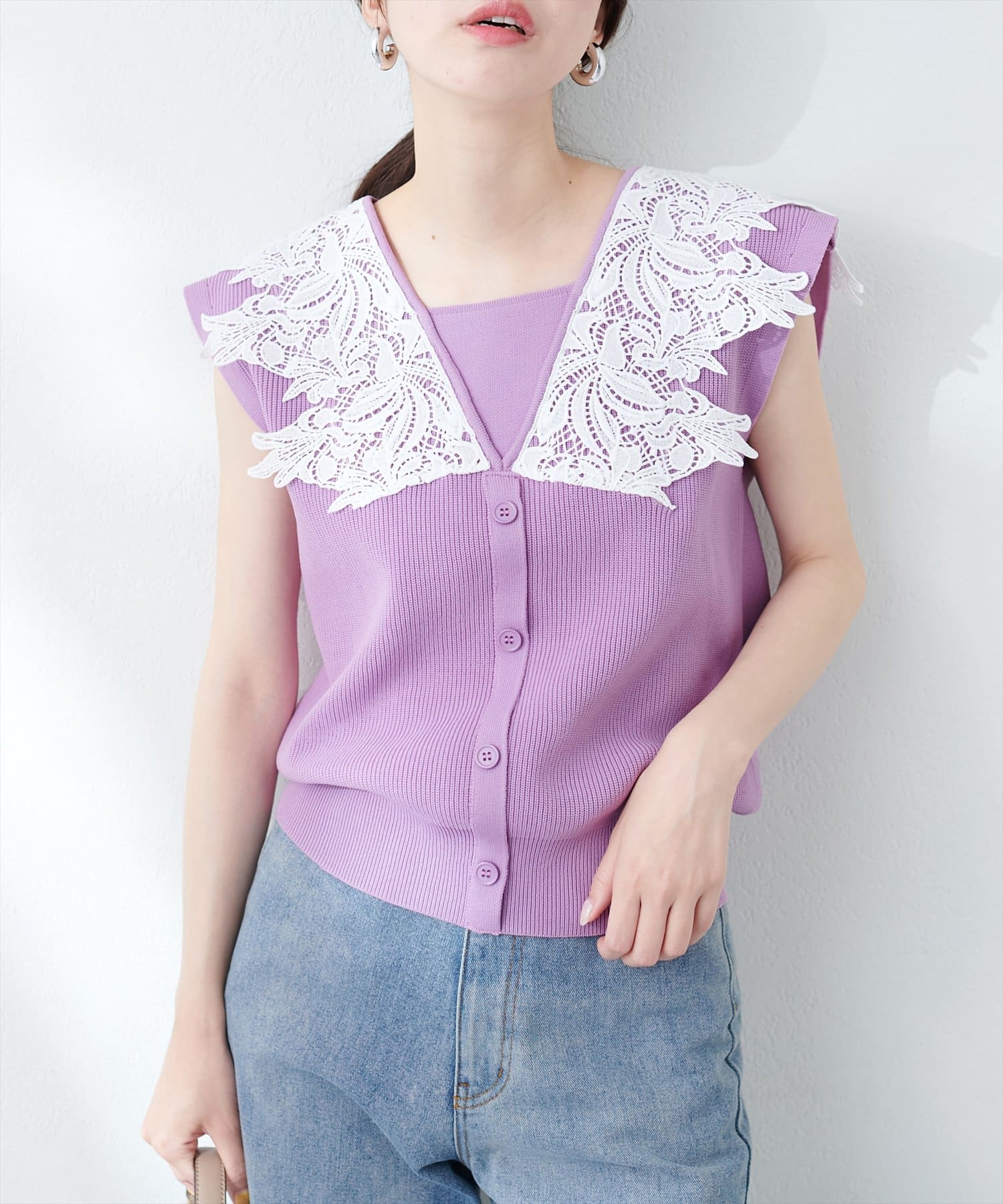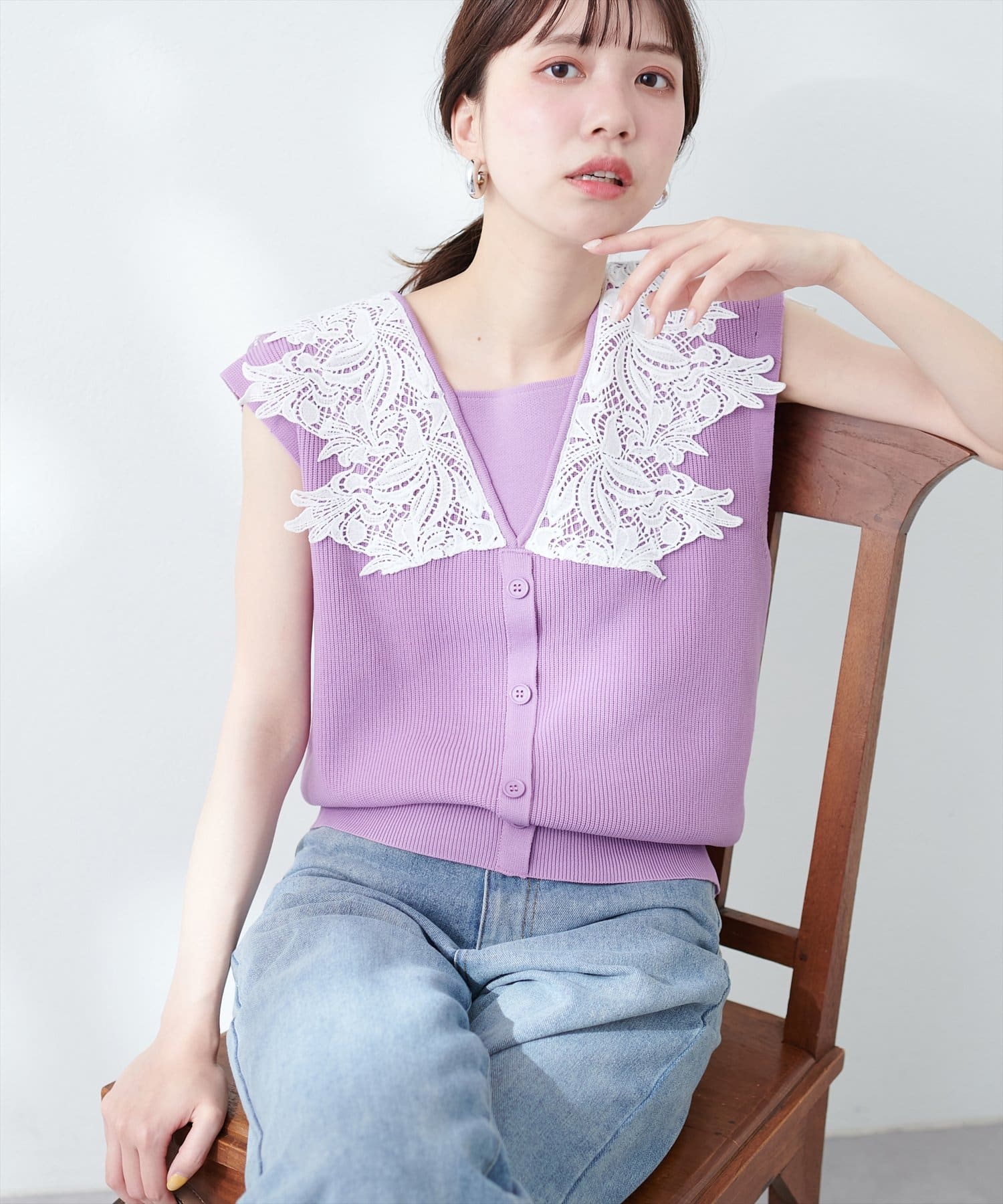 モチーフレースの大胆な衿が印象的なノースリーブニット。
