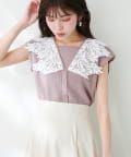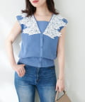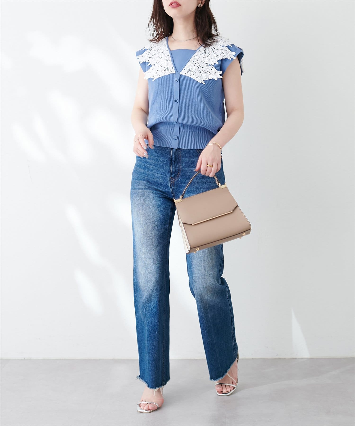 デニムと合わせたカジュアルなコーディネートも、フェミニンなレース衿で大人可愛くきまる1着。
