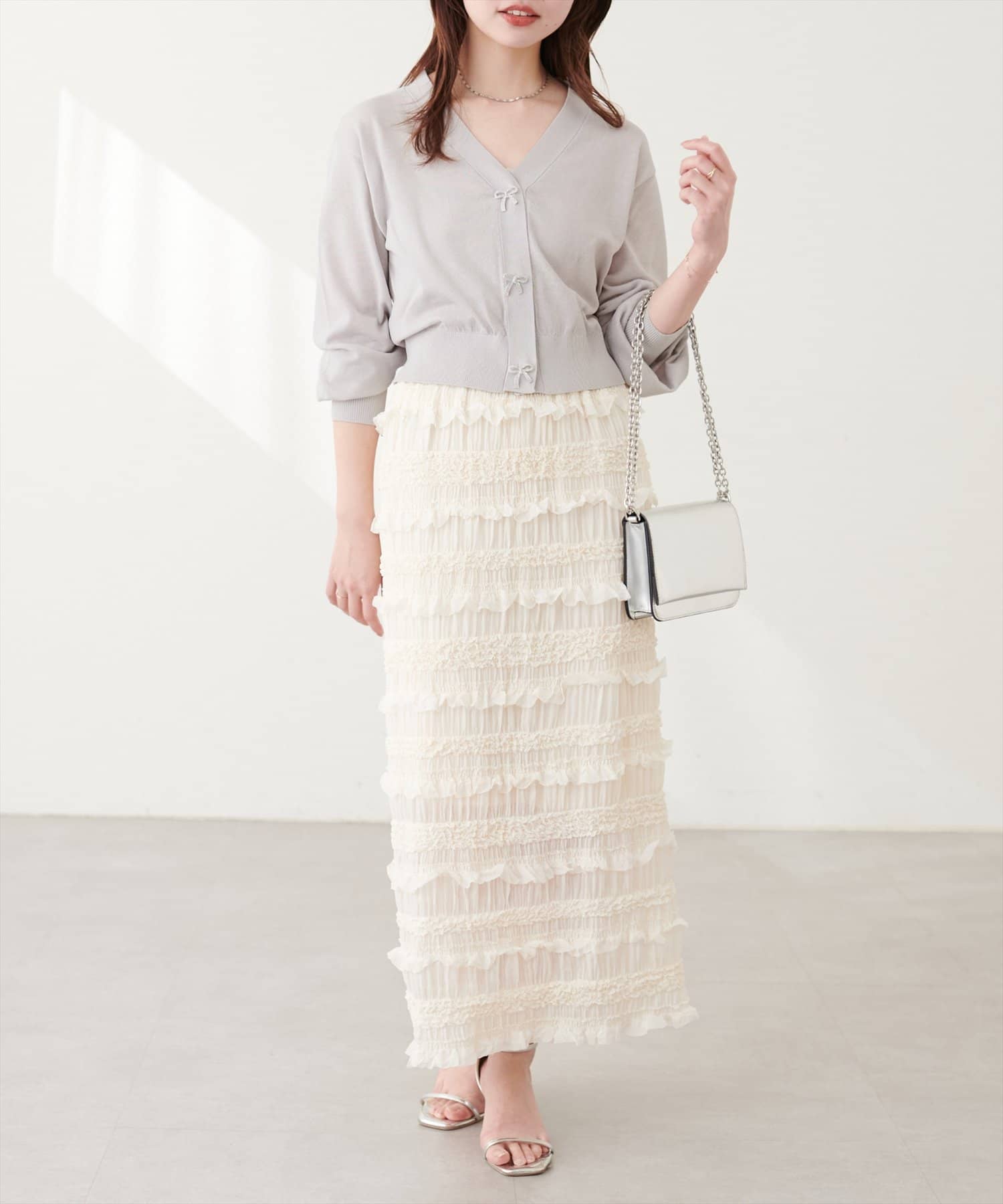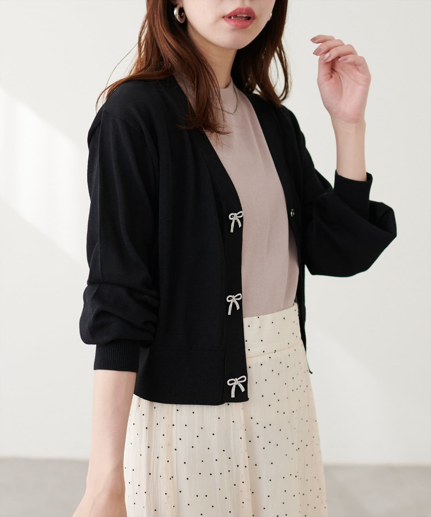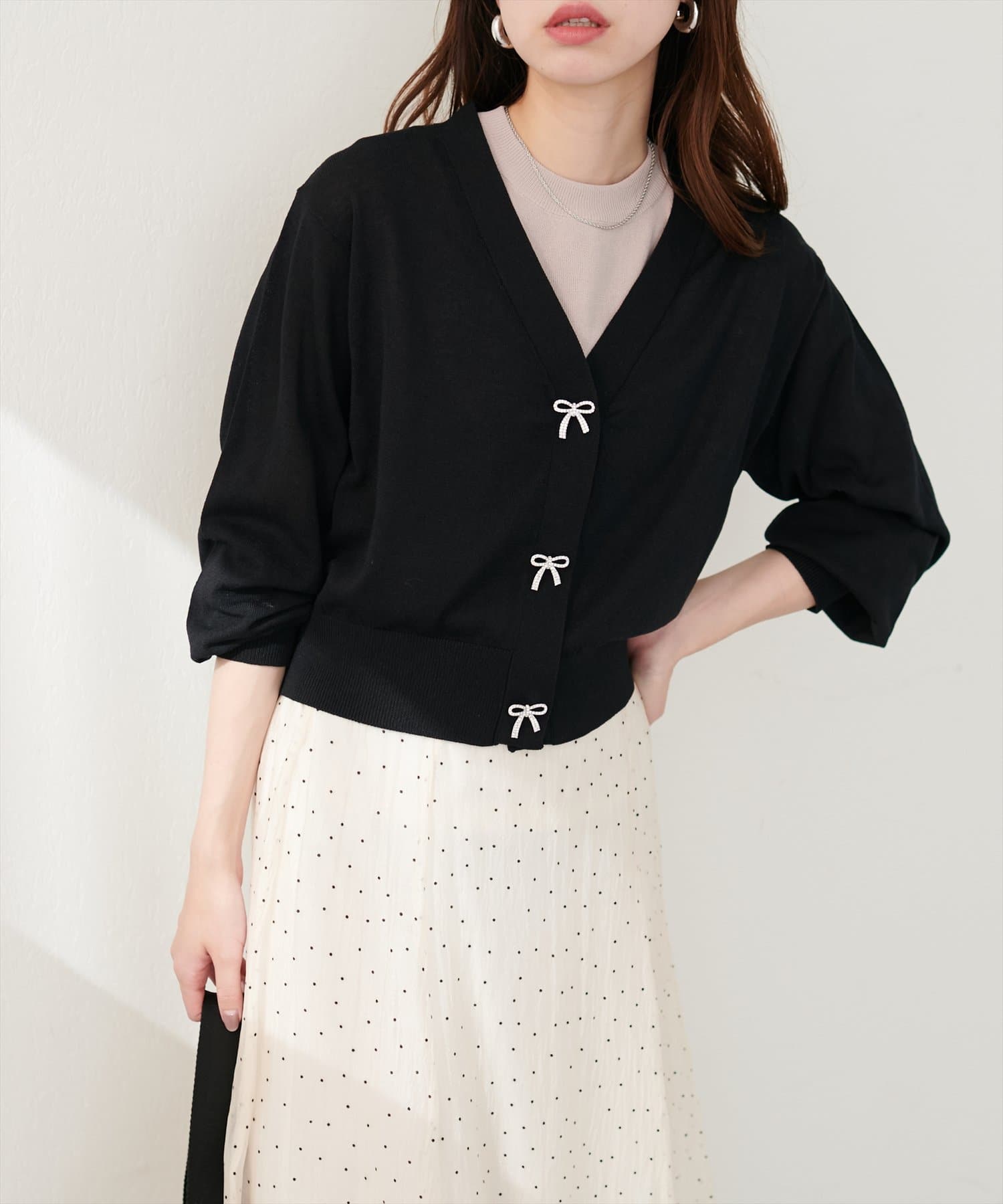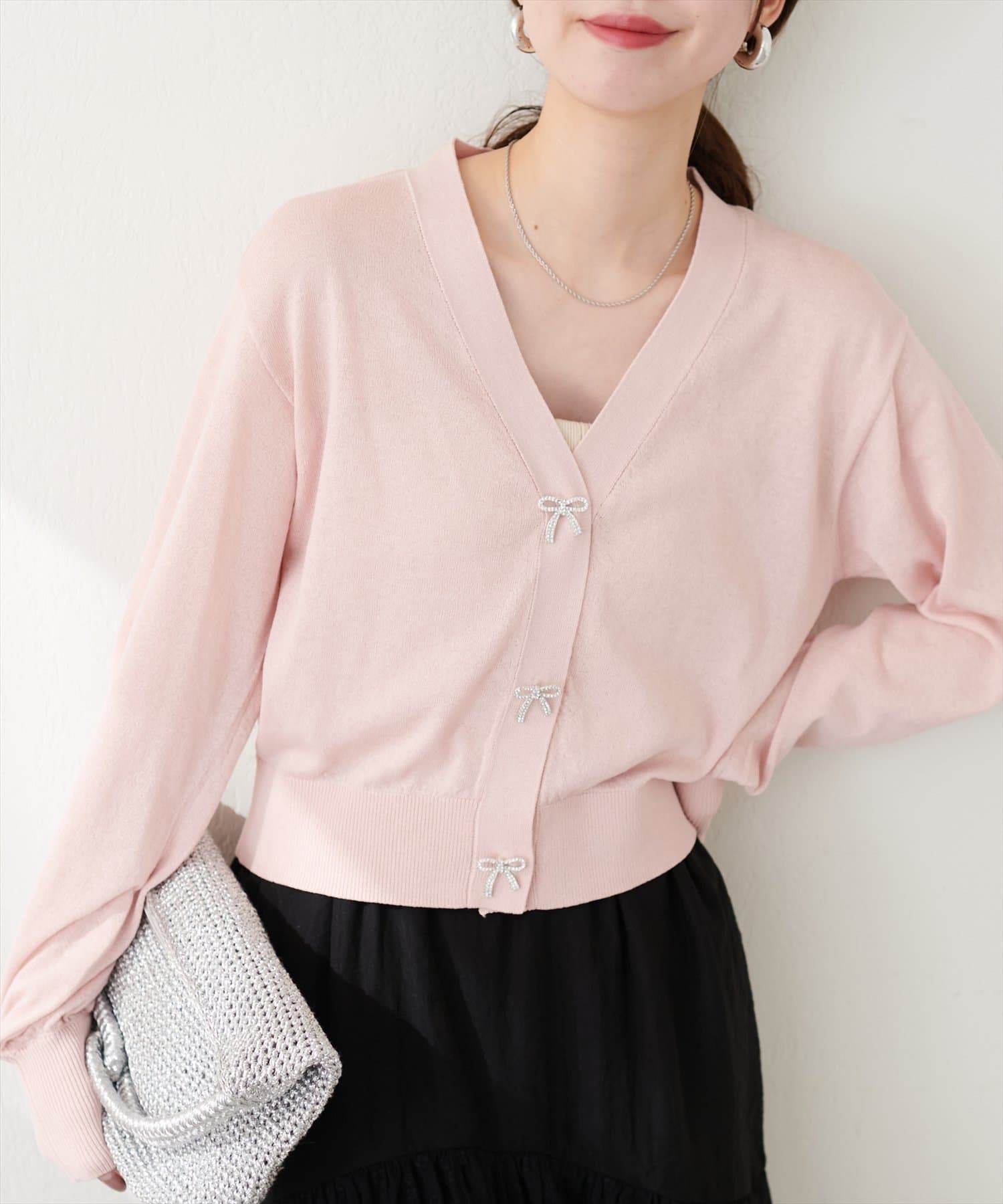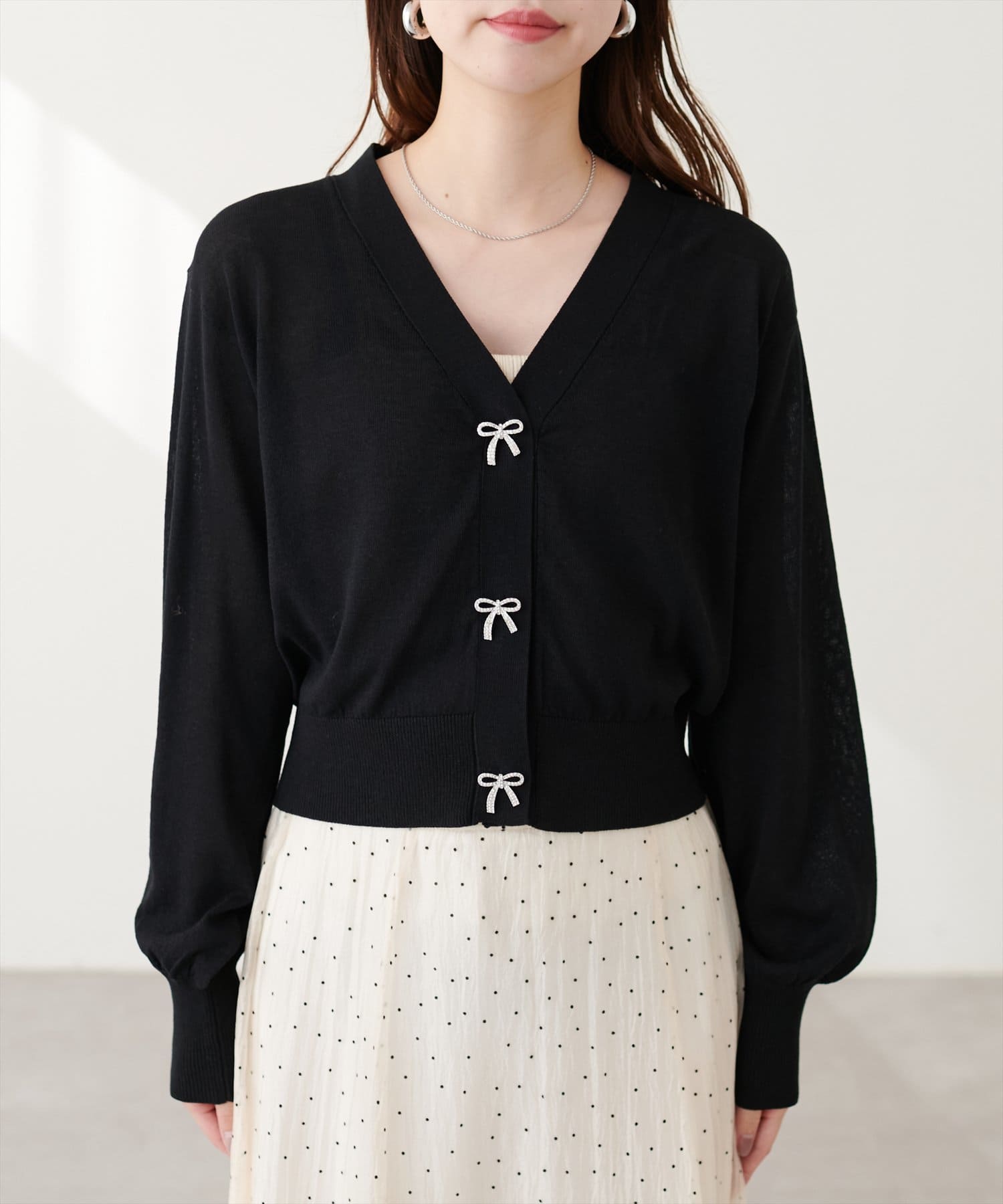 キャミソールの上からトップスのように着て頂き、シンプルながらもリボンが映えるコーデに。