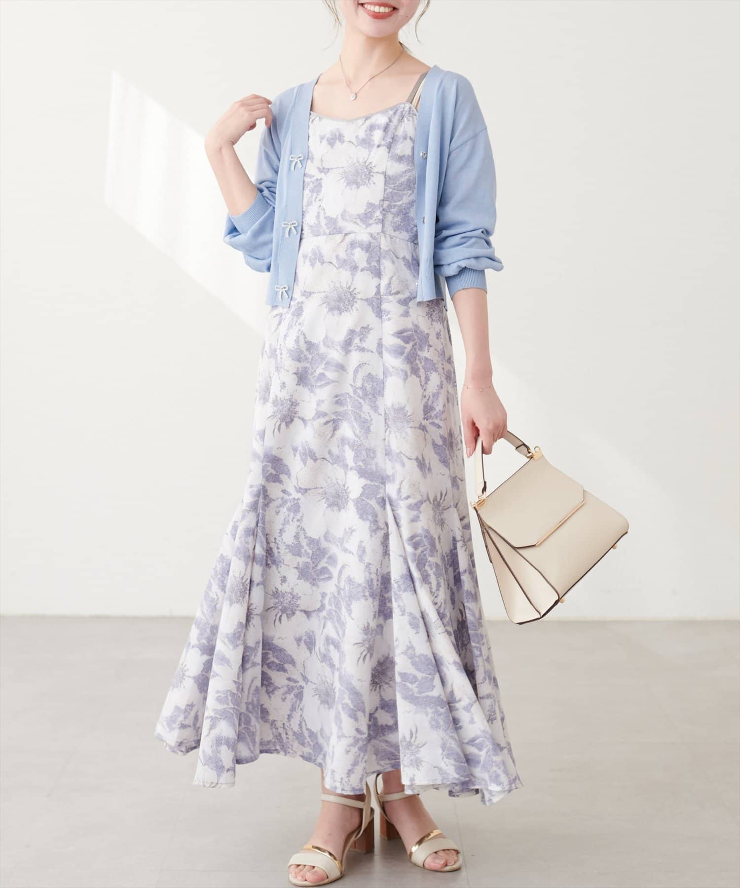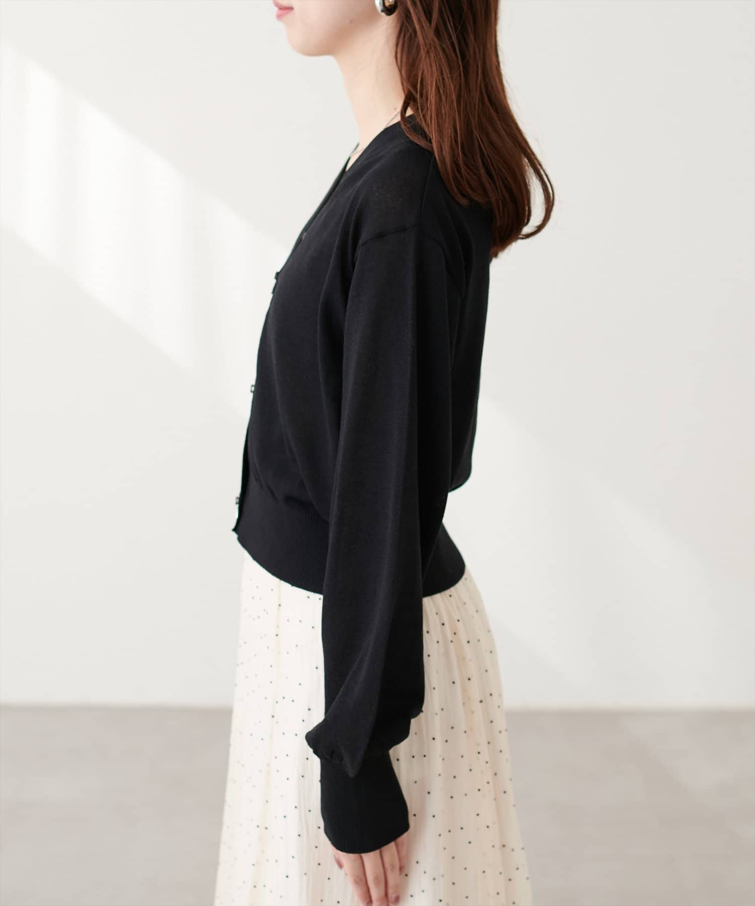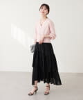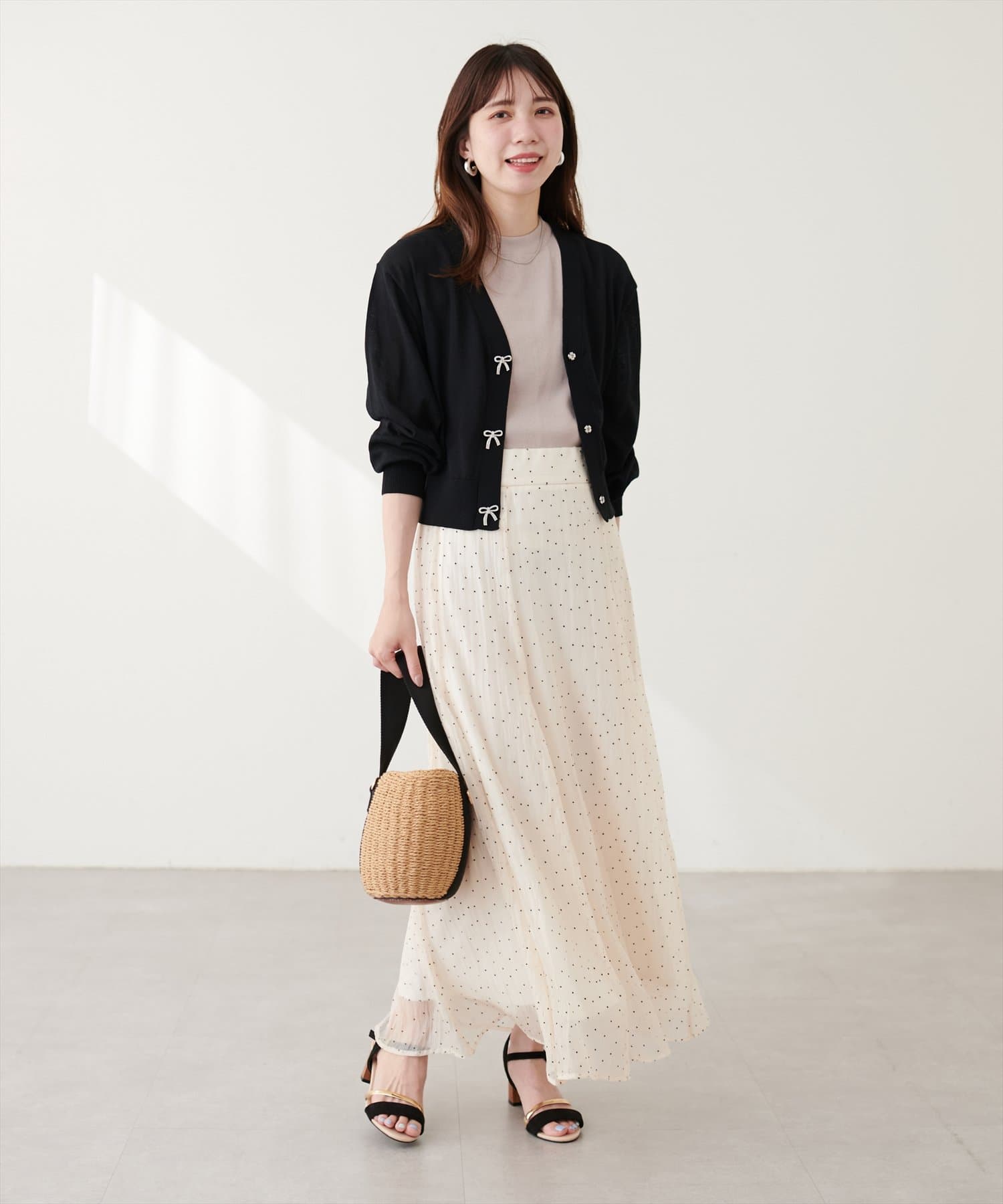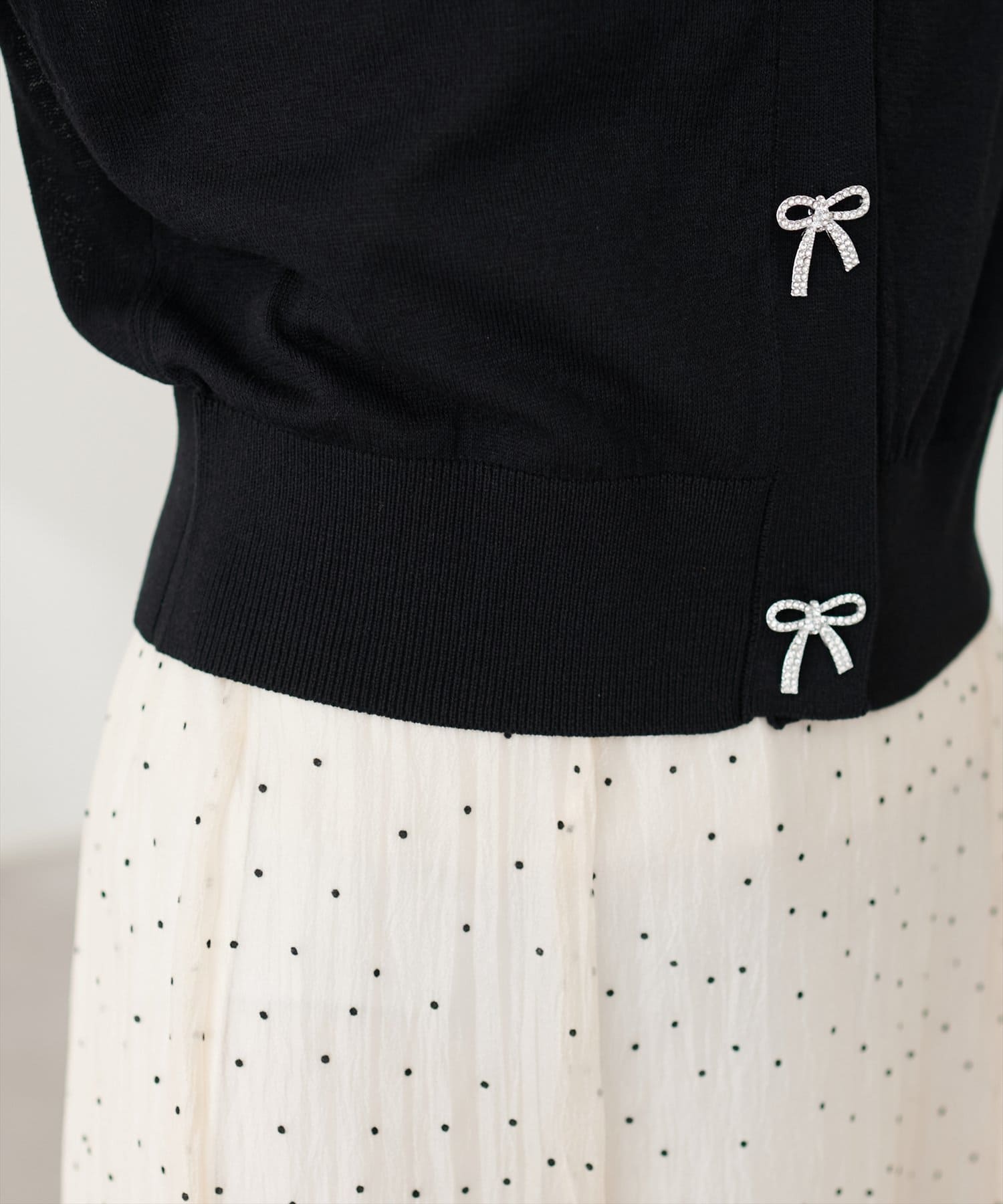 キャミソールの上からトップスのように着て頂き、シンプルながらもリボンが映えるコーデに。