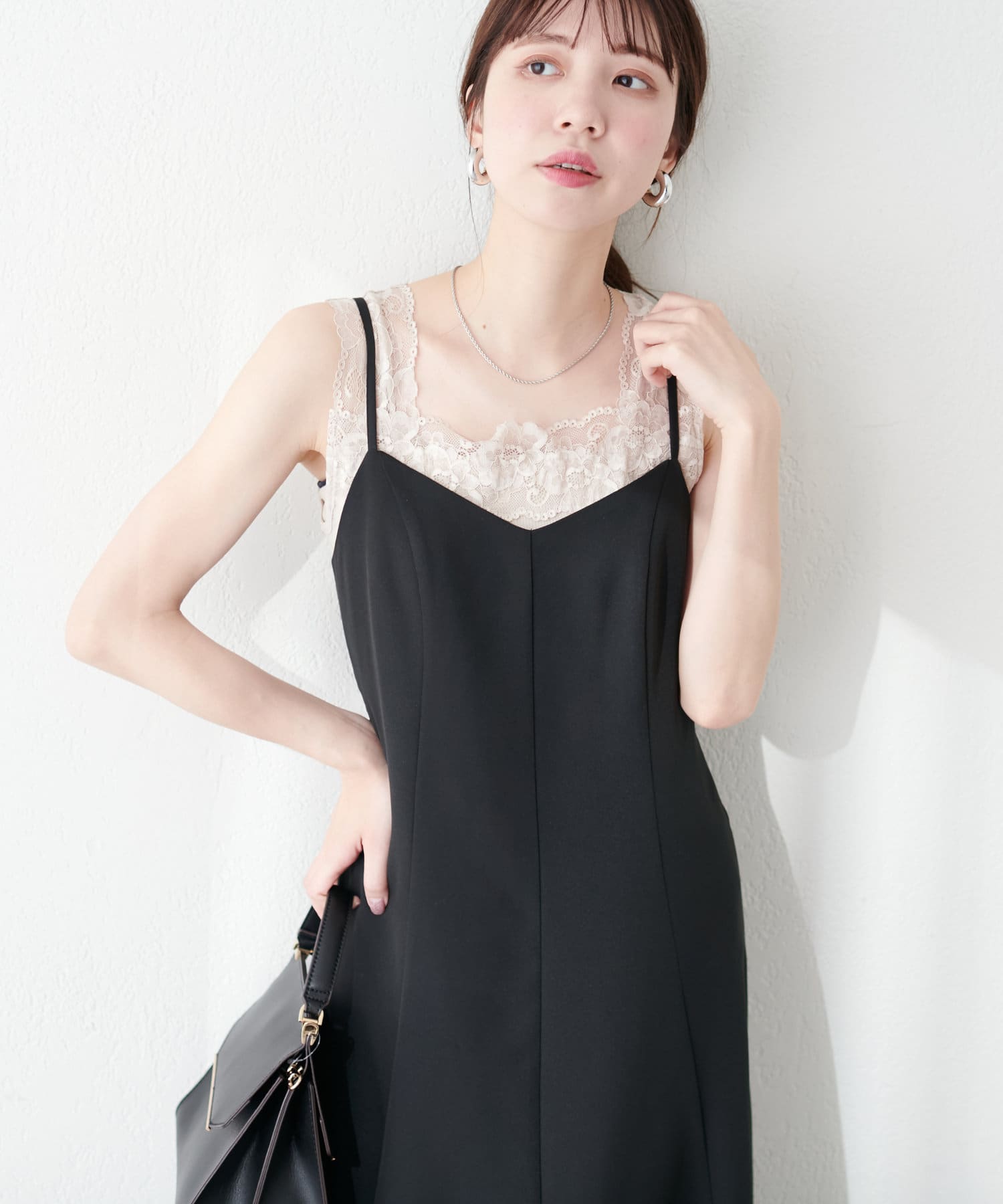 胸元と肩に繊細なレースを施した、大人見えする上品なデザイン。