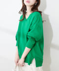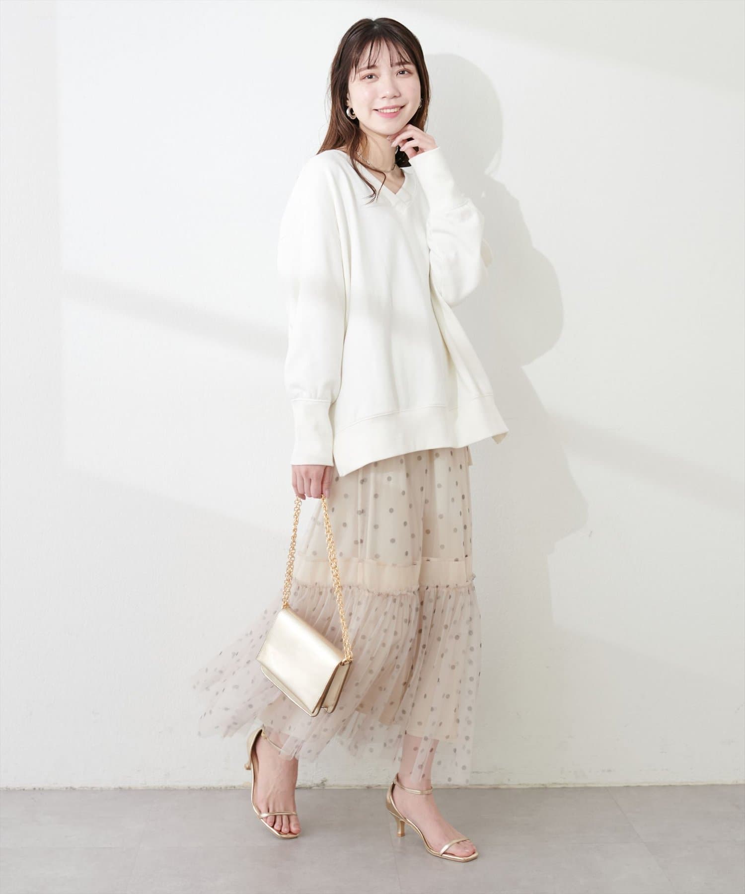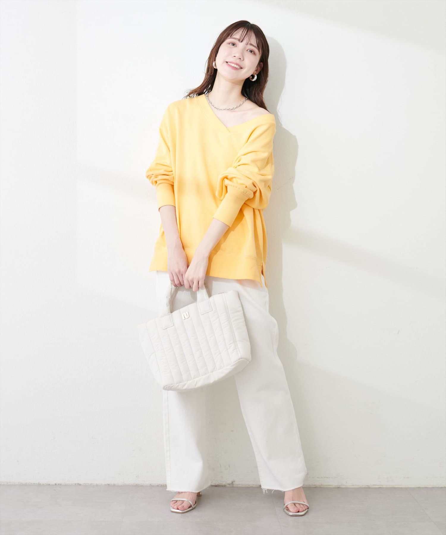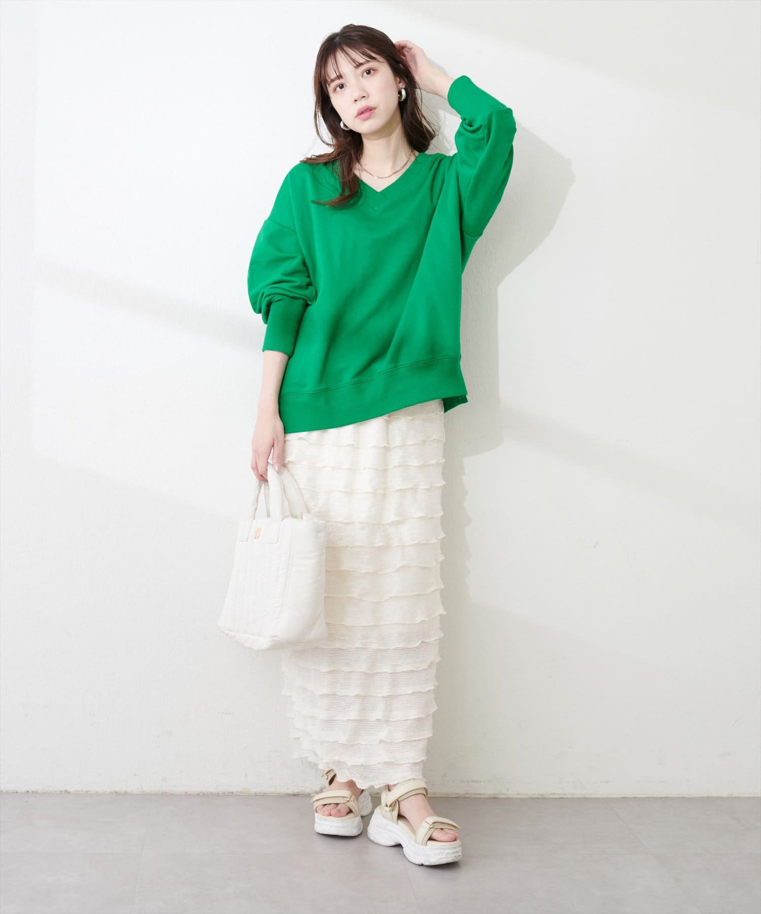 やや肩を落としたドロップショルダーで、カジュアルな中にもフェミニン感をプラス。