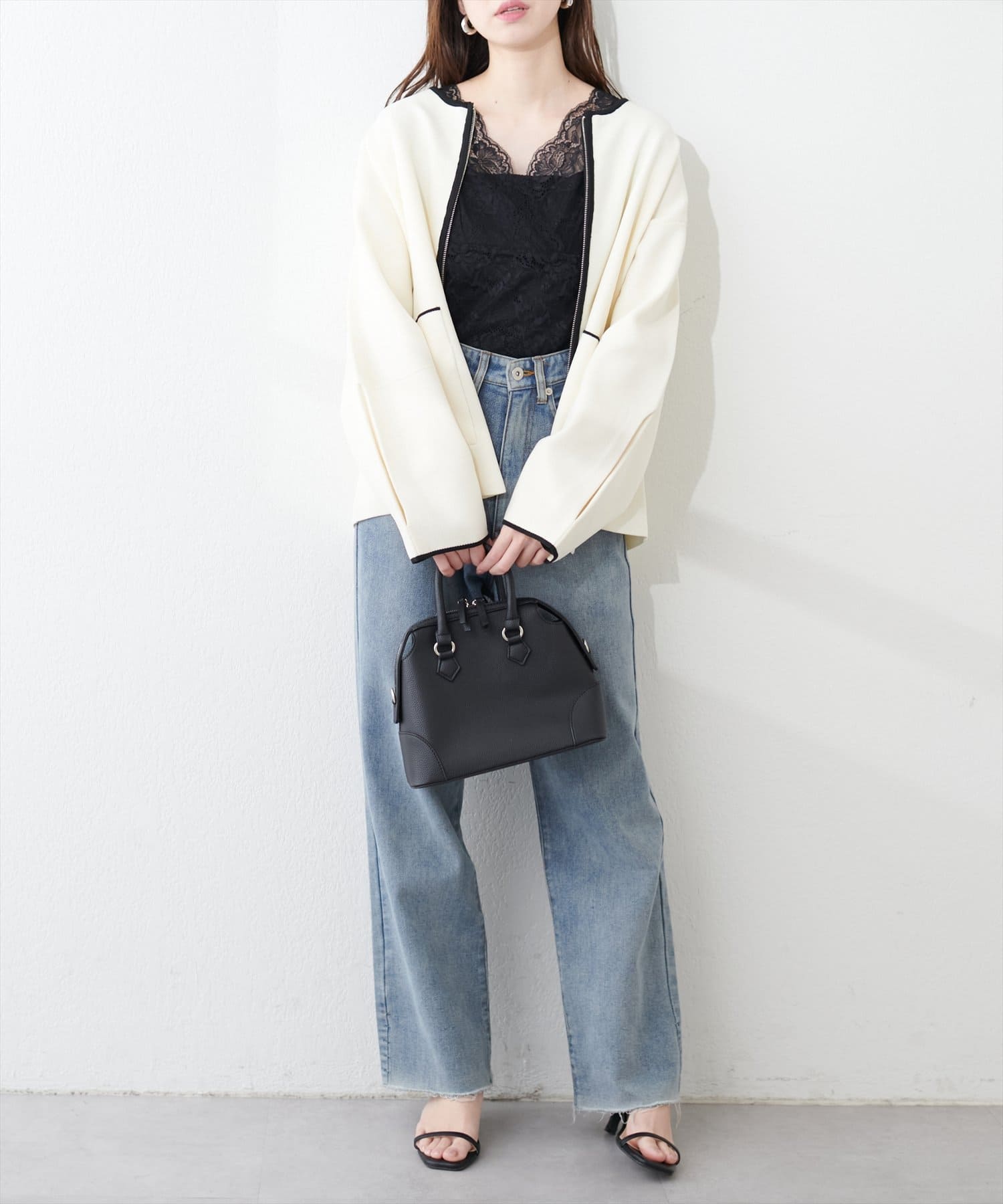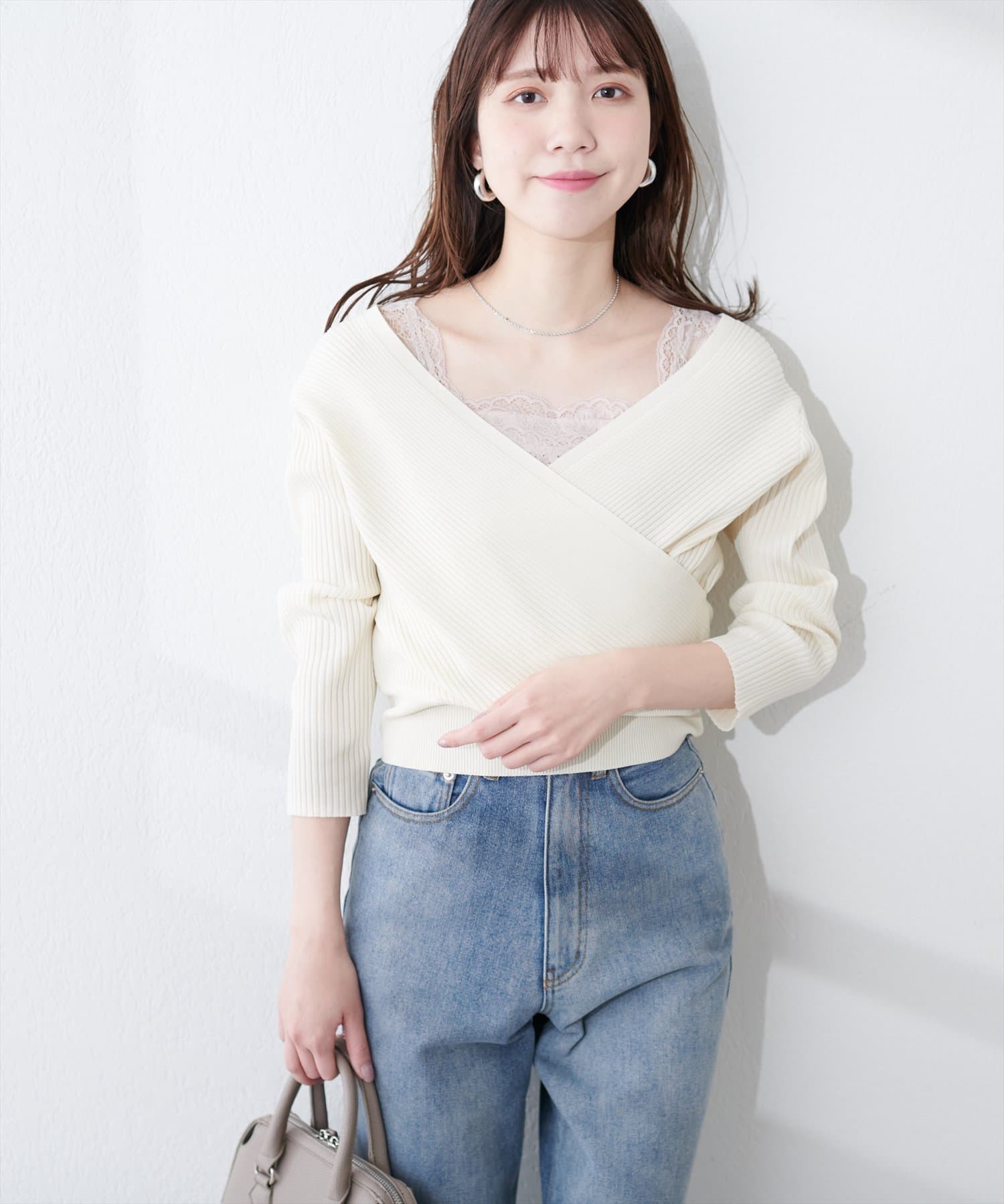 Vネックとスクエアネック、2つの顔が楽しめる華やかな印象のインナー。