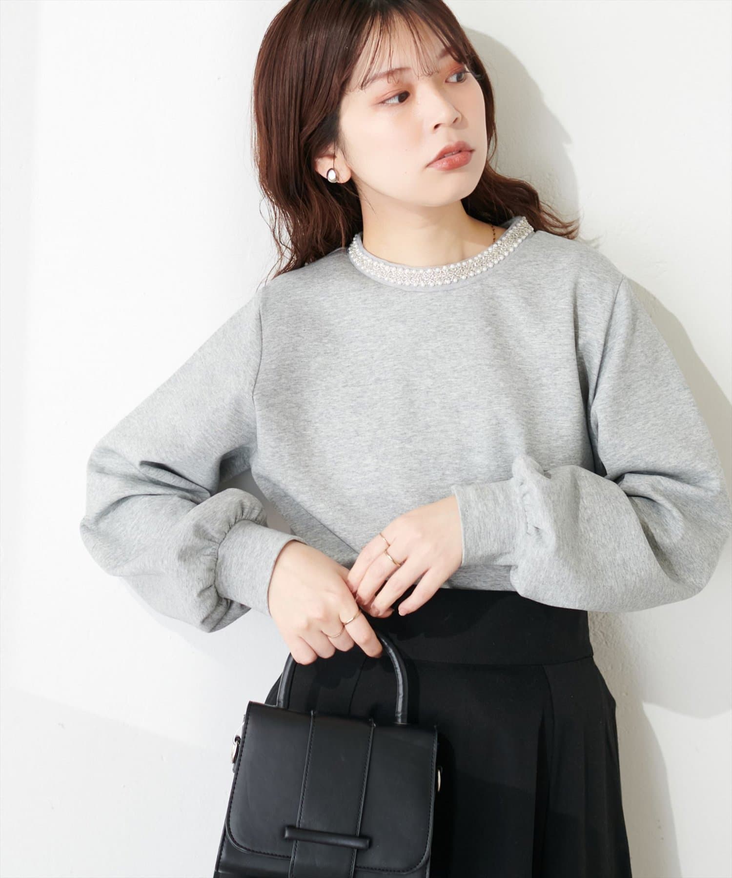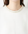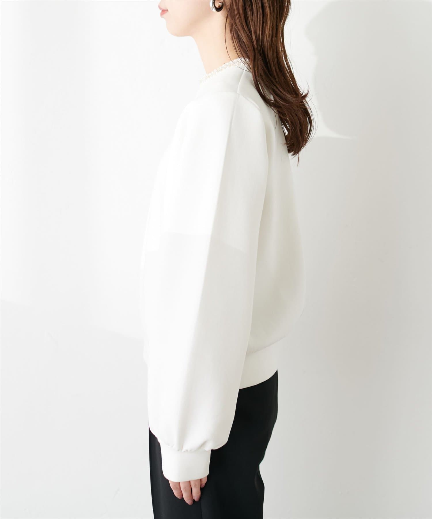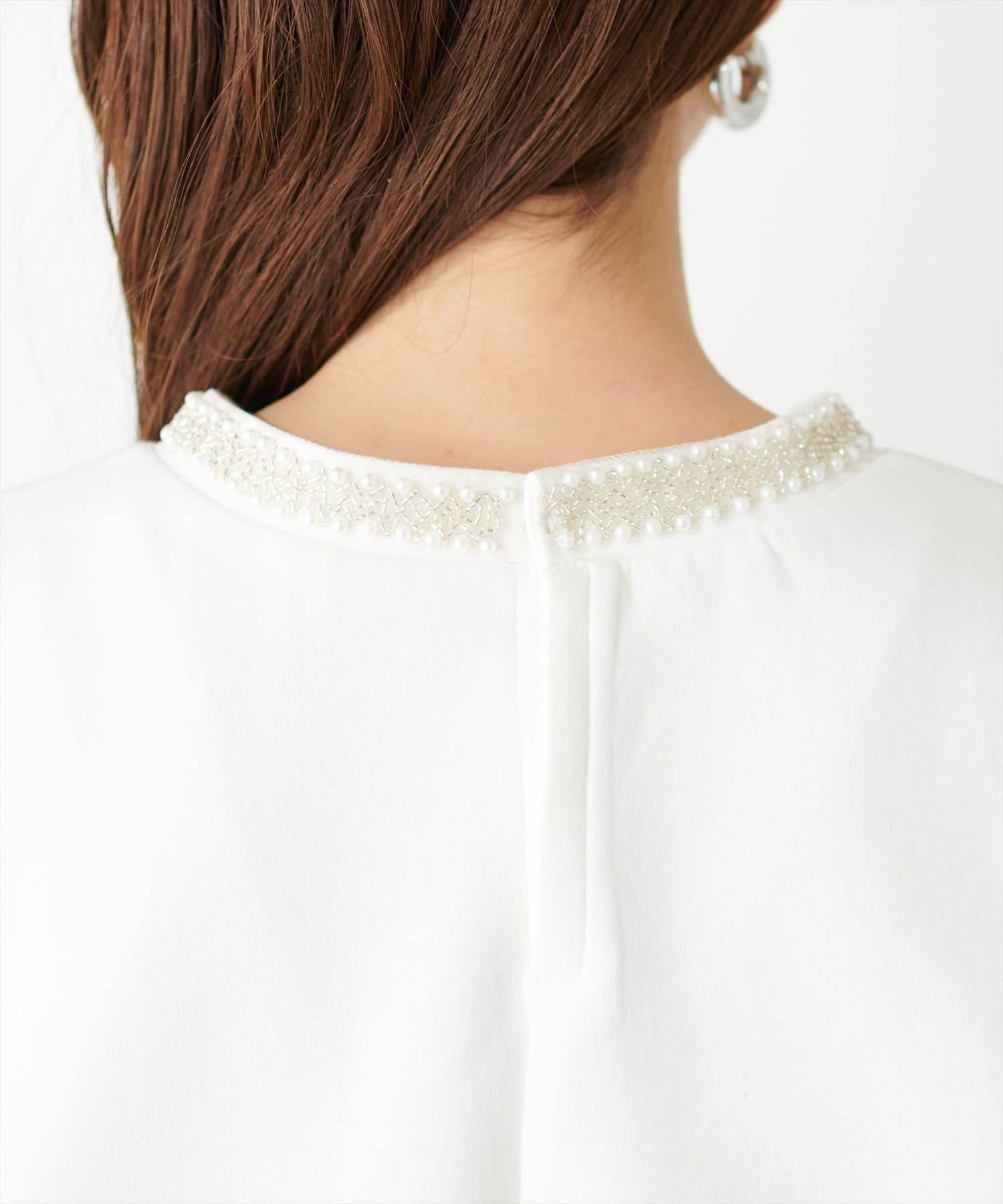 シンプルなトップスの衿元にビジューを施し、華やかな印象に。