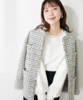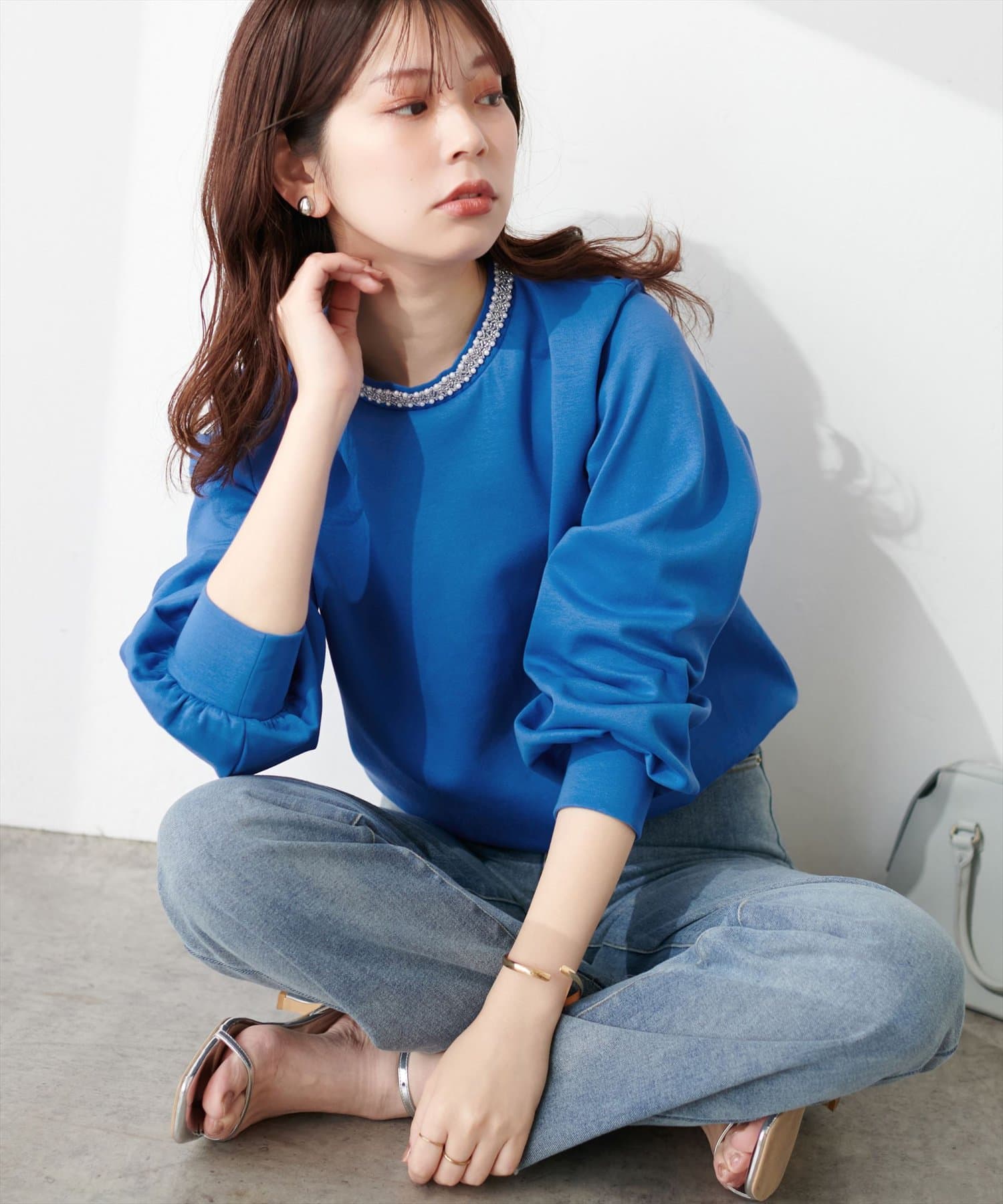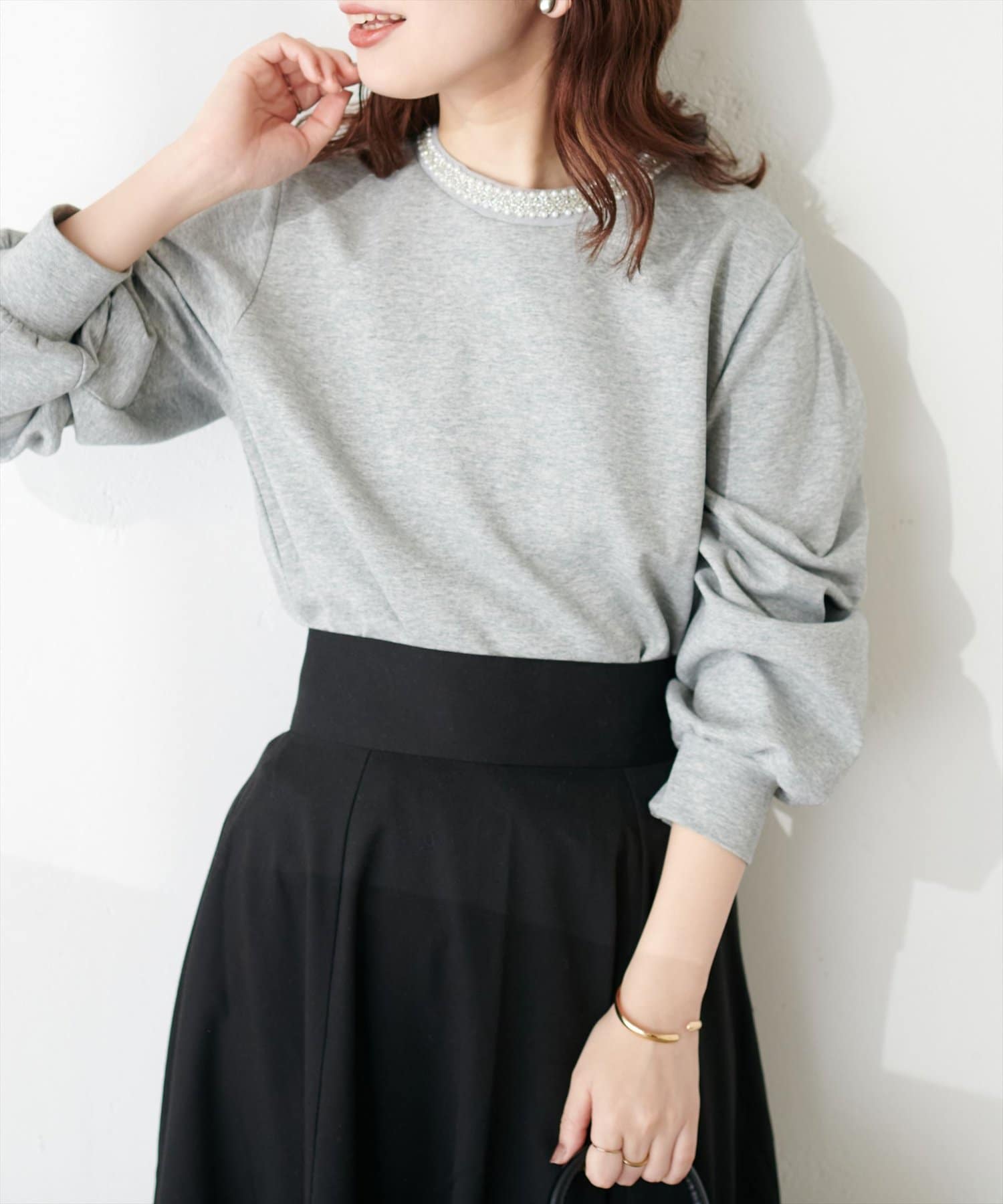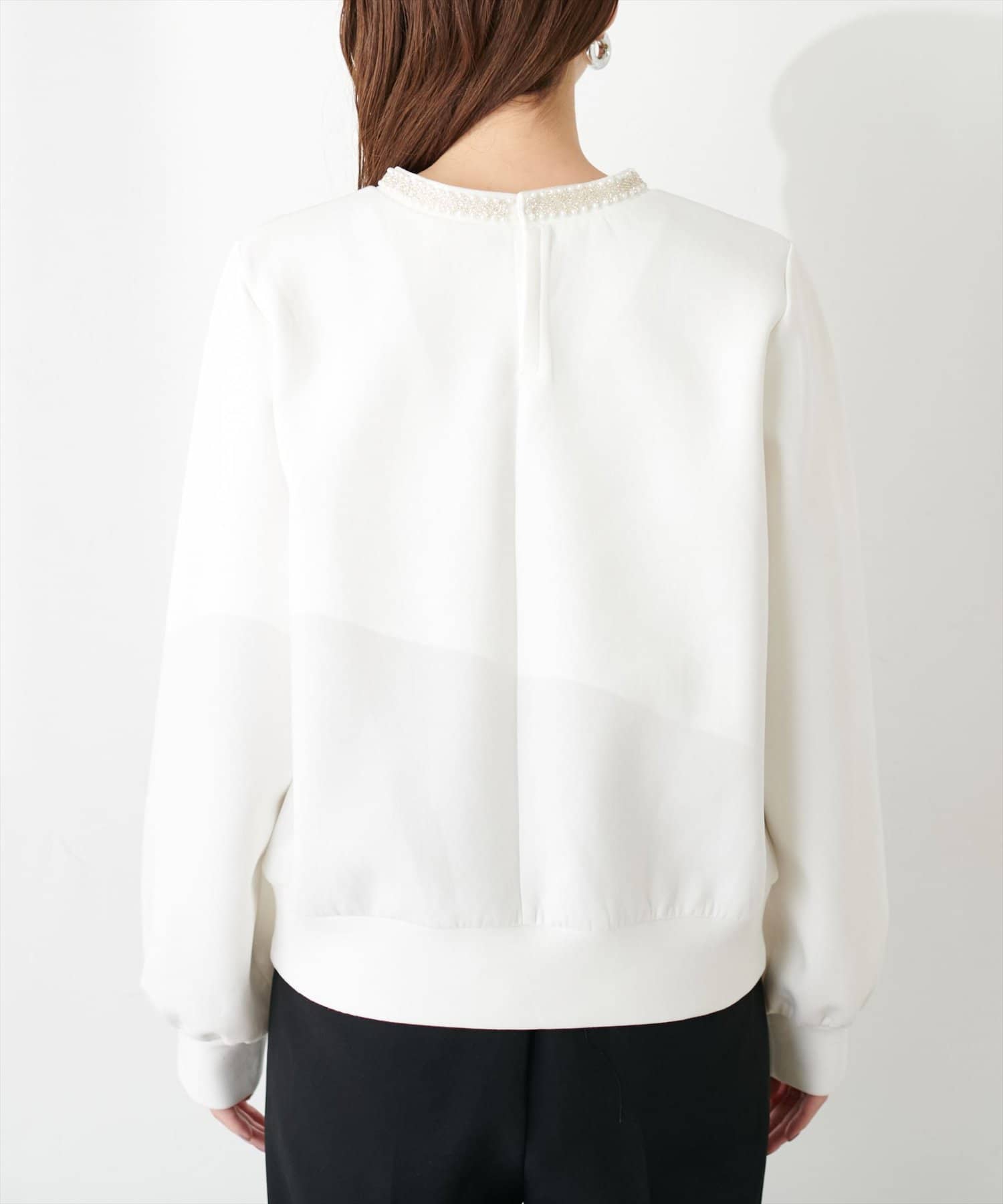 シンプルなトップスの衿元にビジューを施し、華やかな印象に。