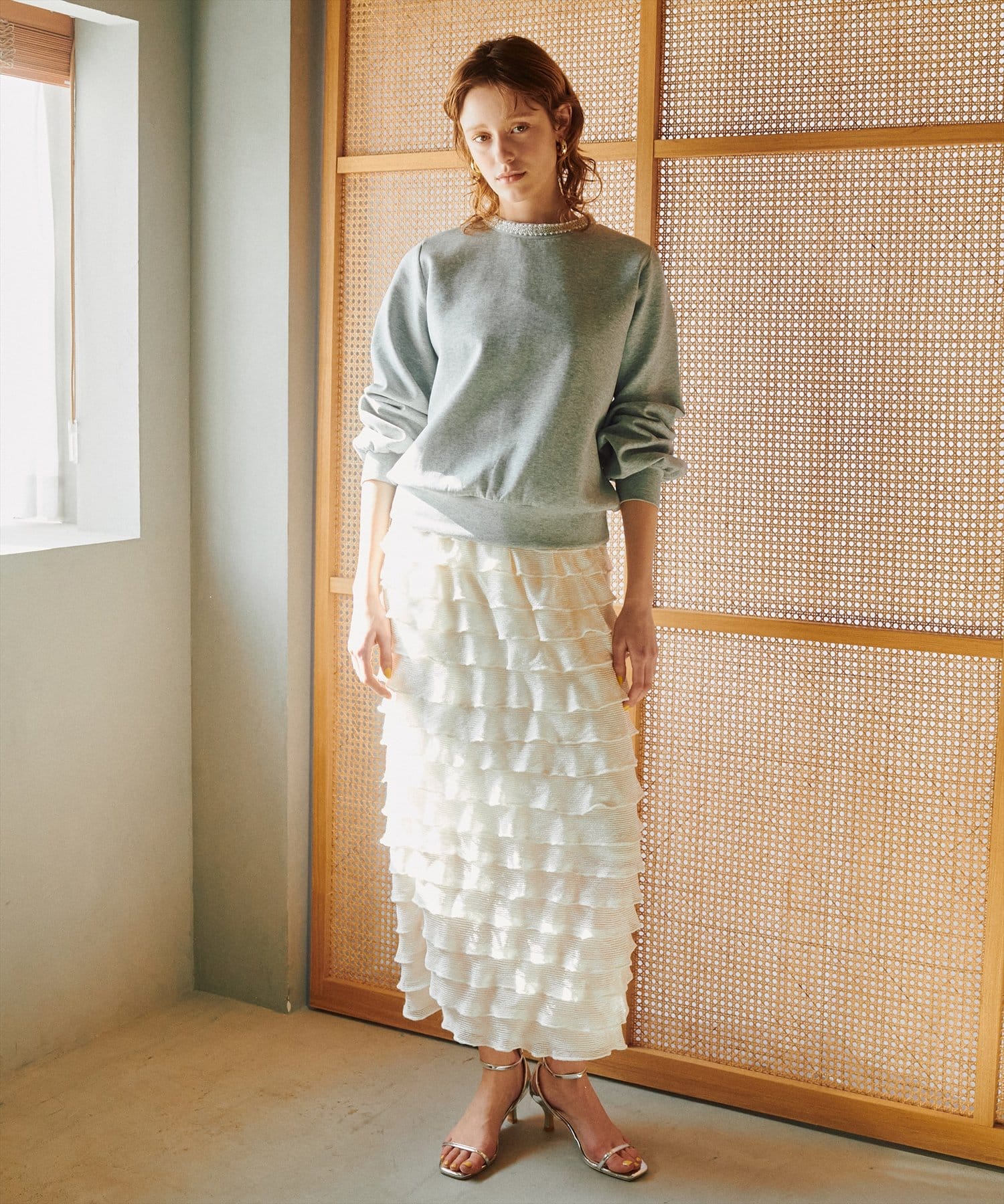 足元はサンダルやパンプスなどと合わせるとフェミニンテイストに仕上がります。