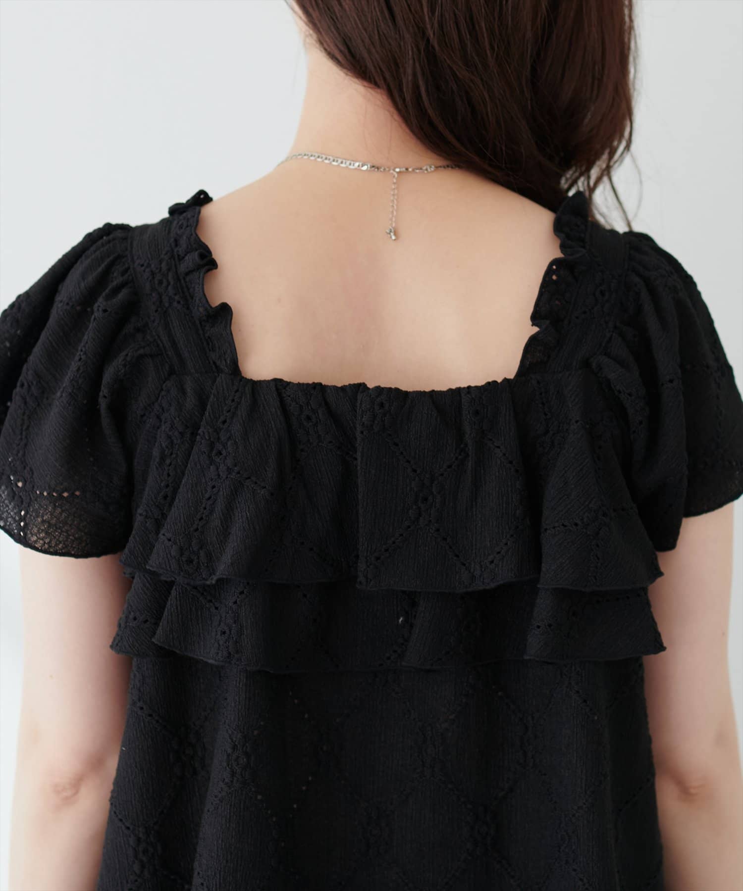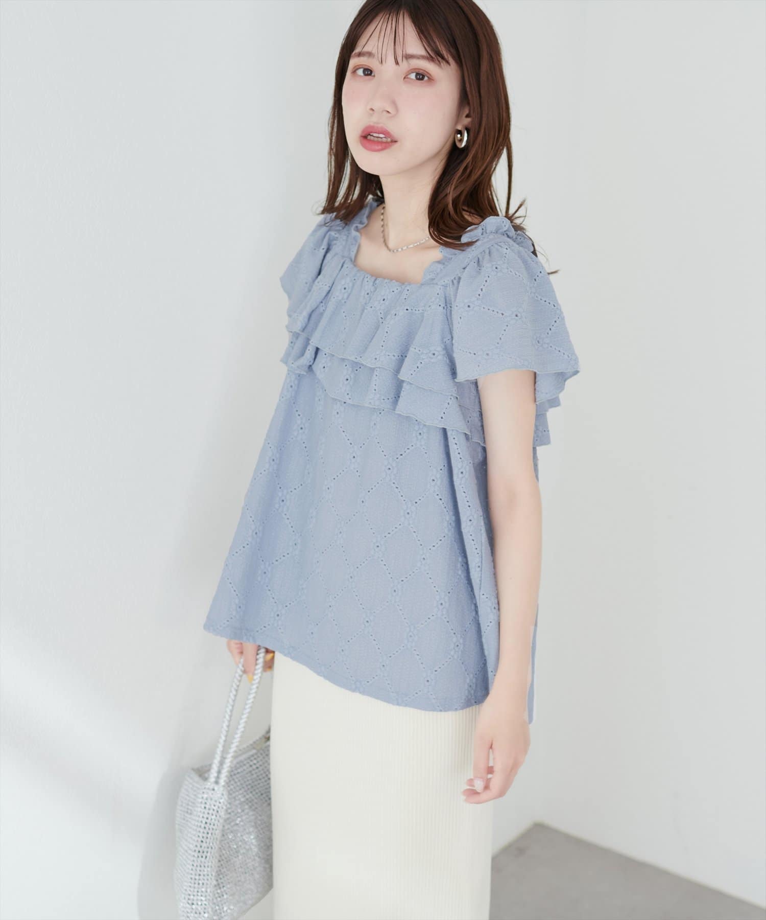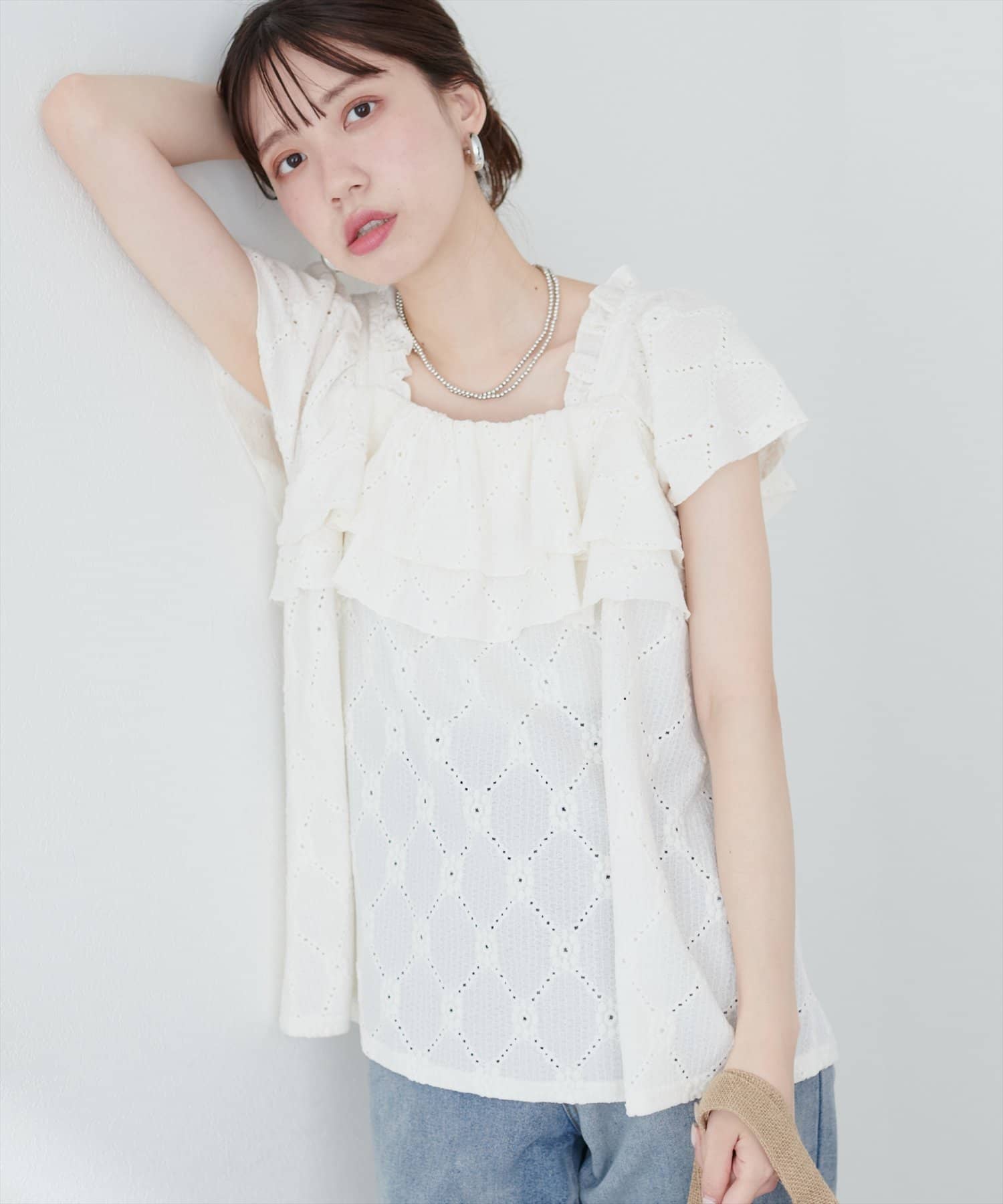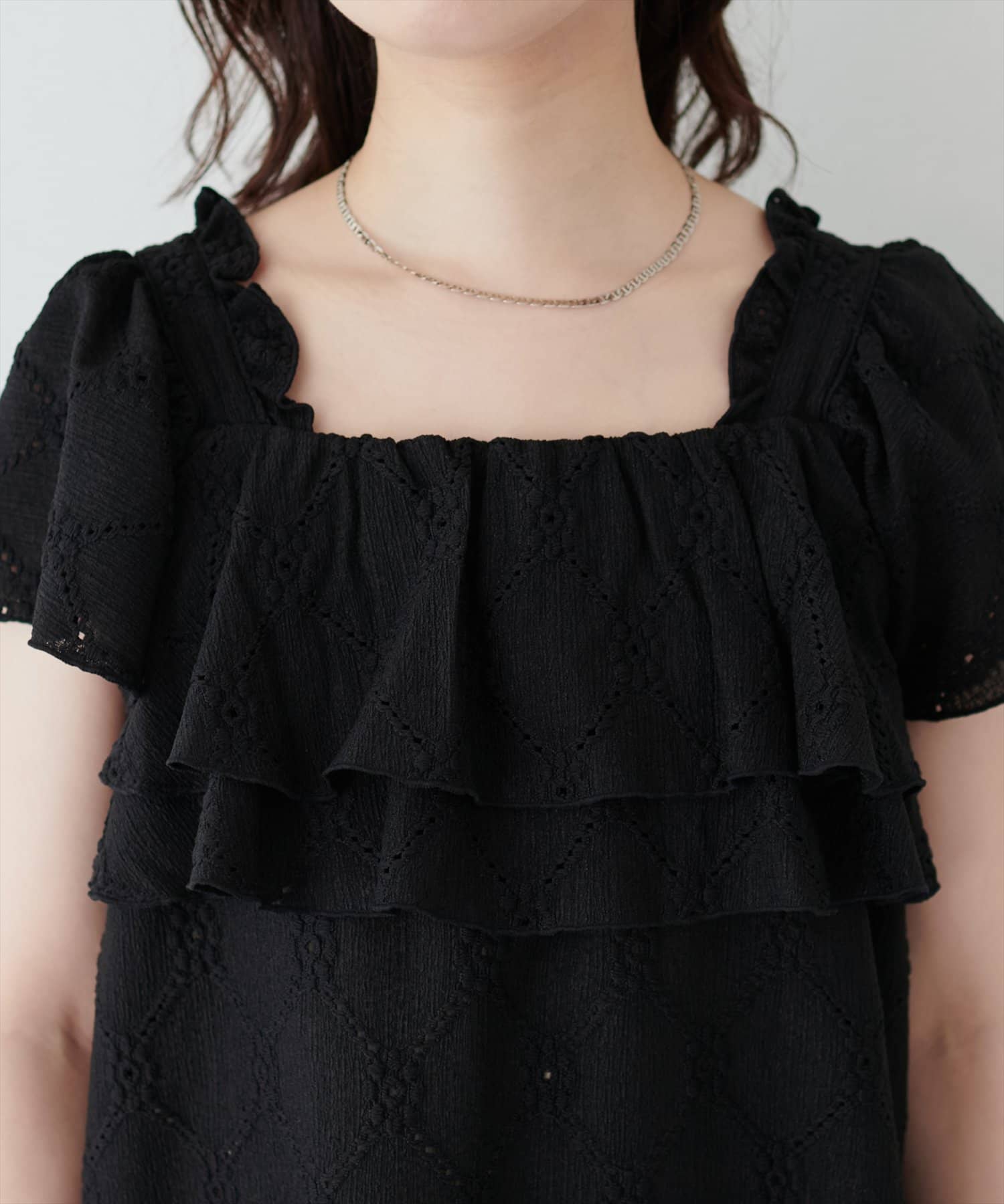 たっぷりなフリルと、カットレースで大人フェミニンスタイルに。