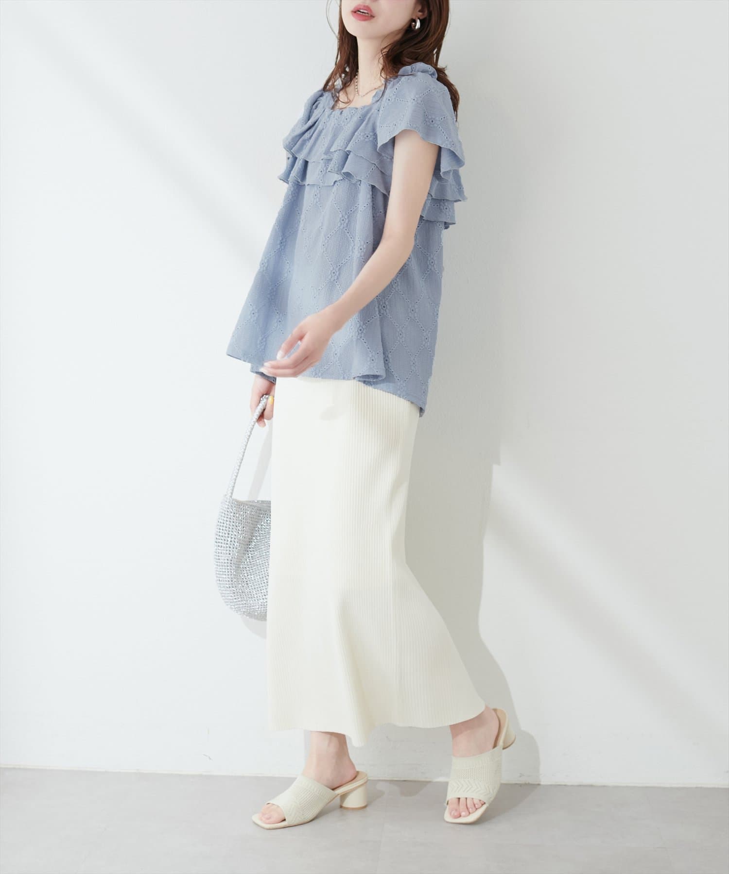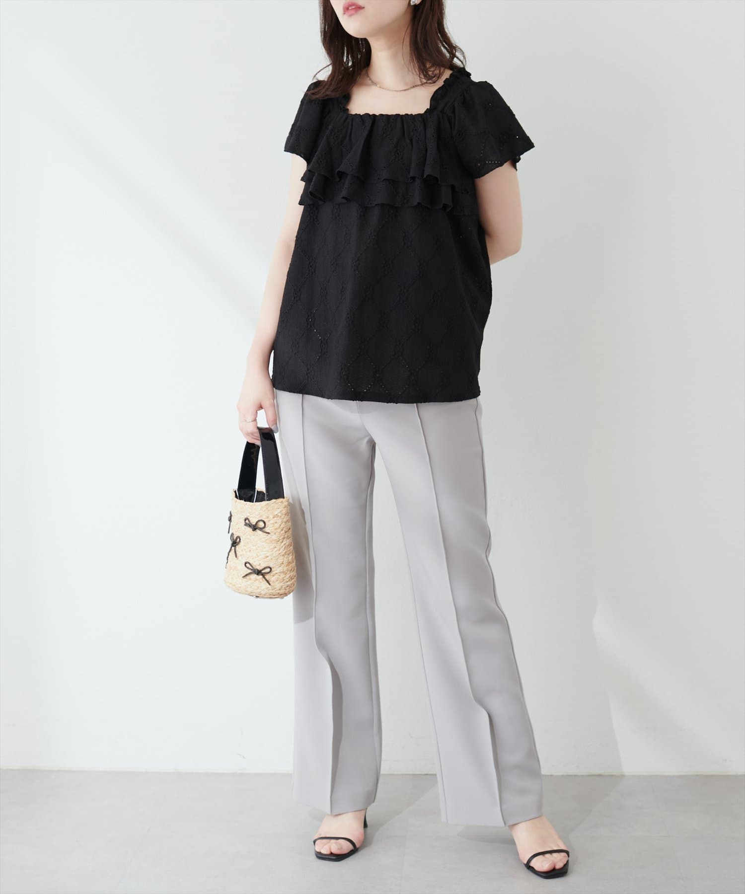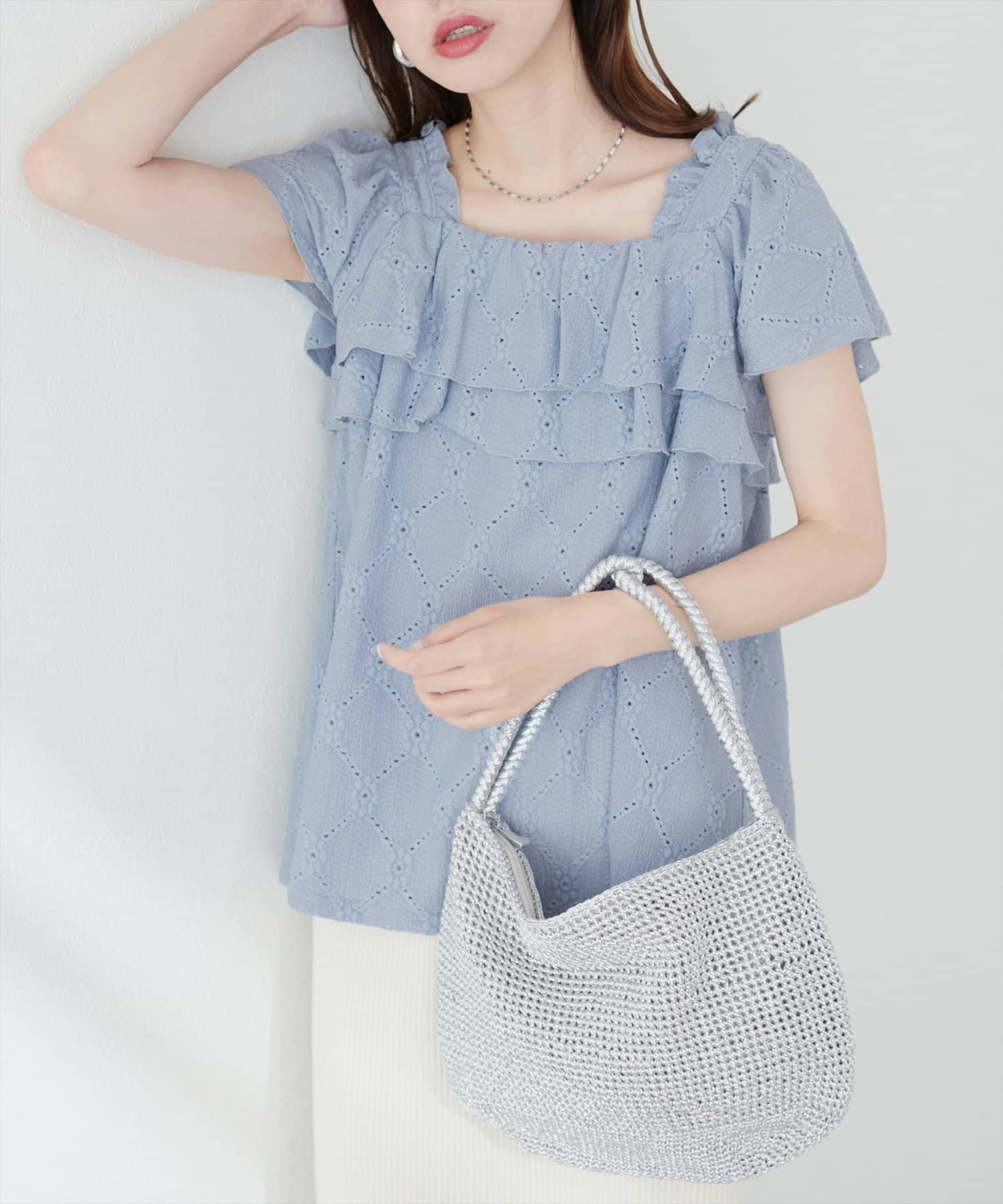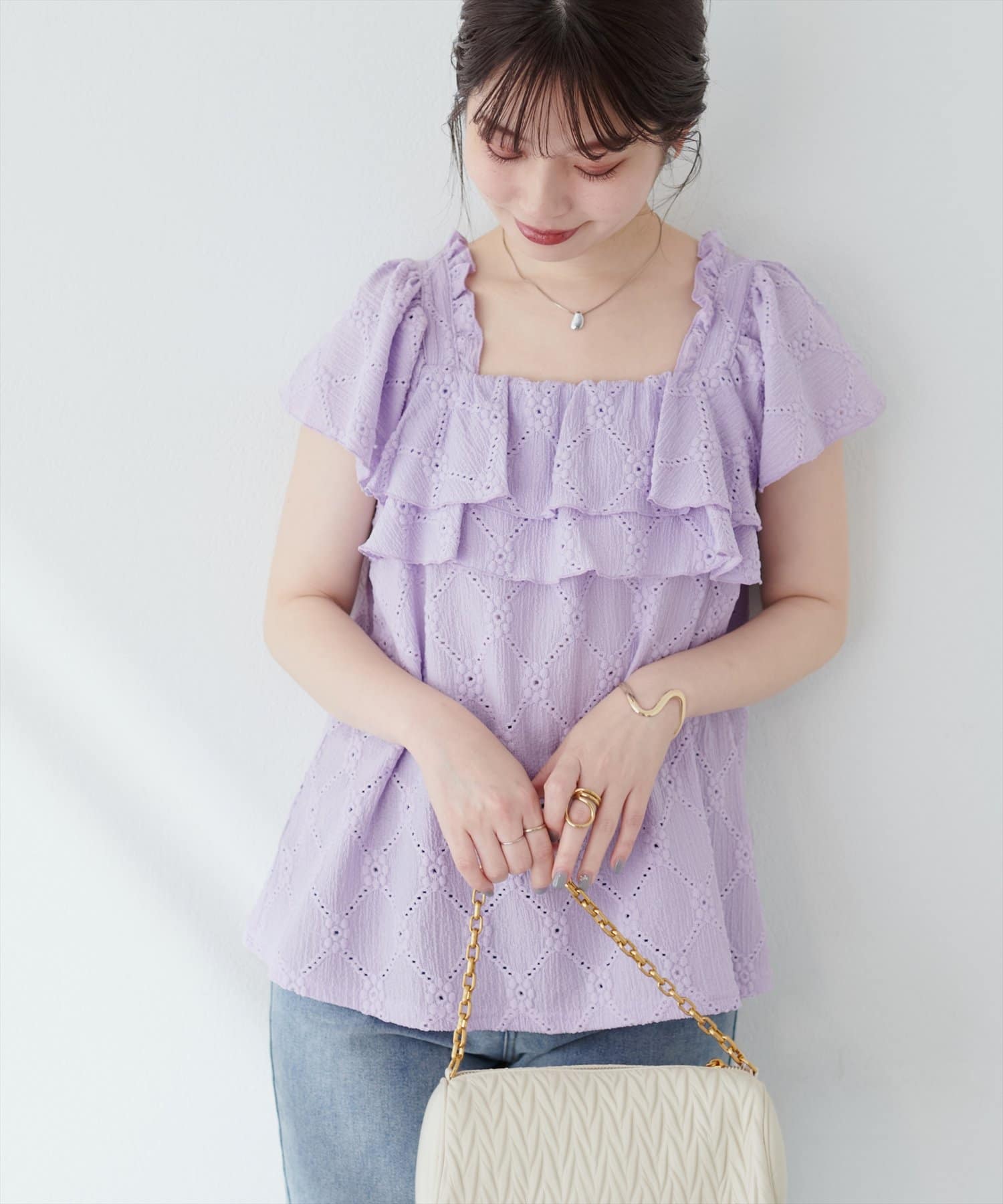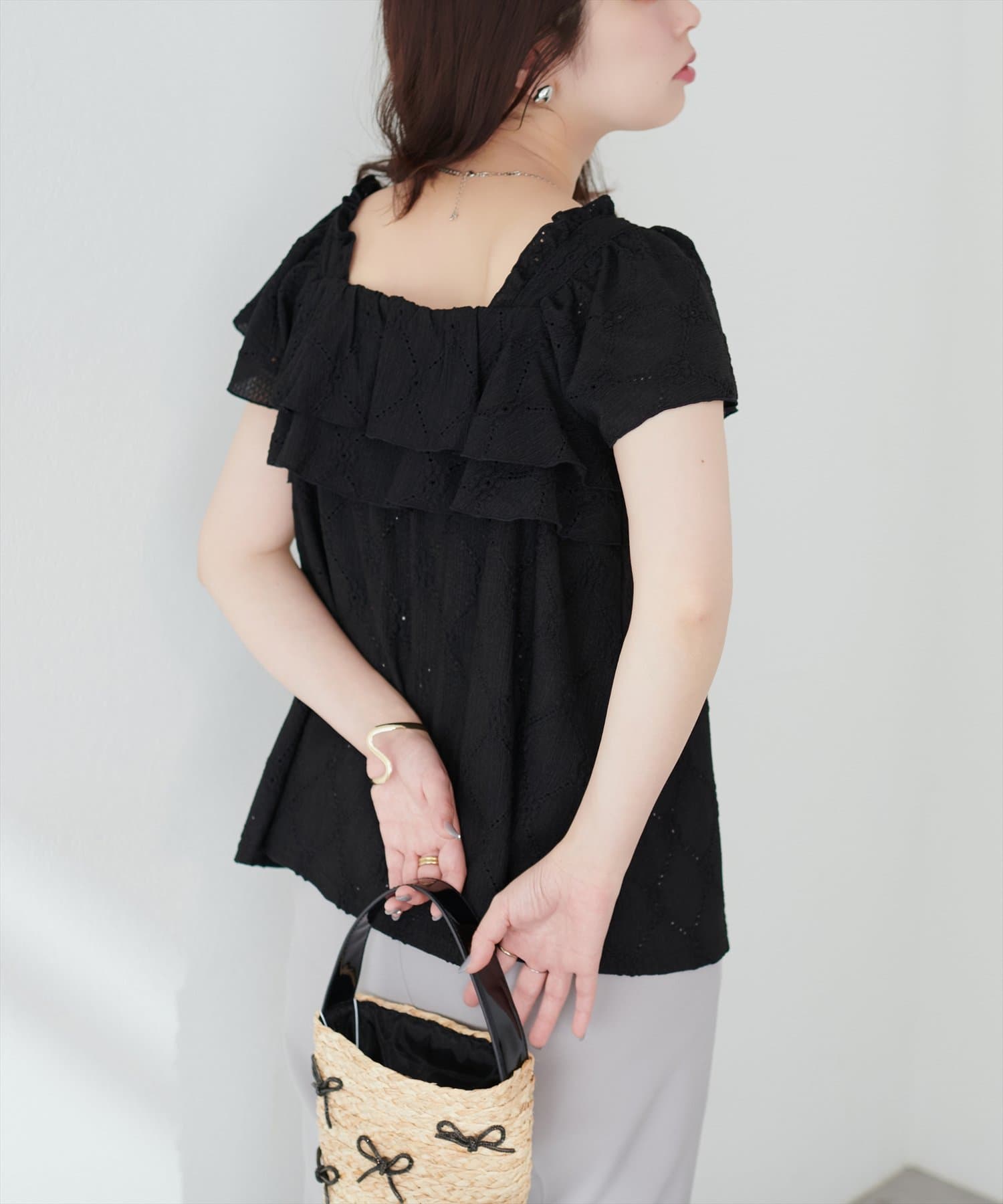 たっぷりなフリルと、カットレースで大人フェミニンスタイルに。