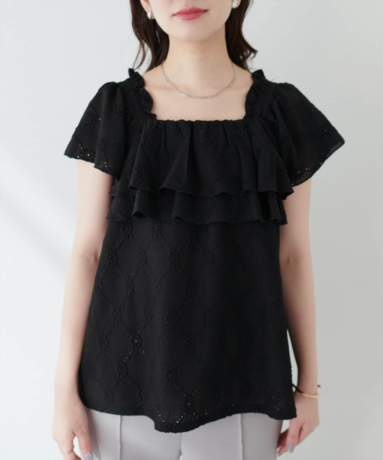たっぷりフリルが華やかなカット素材のトップス