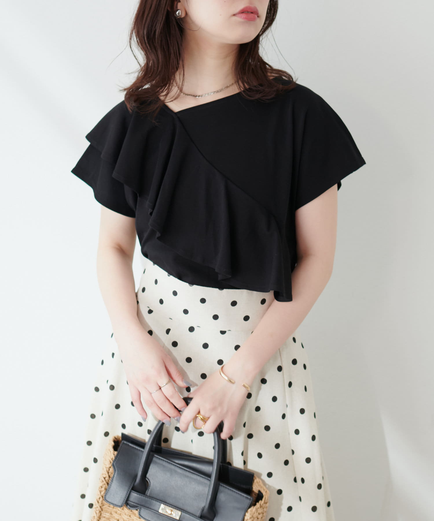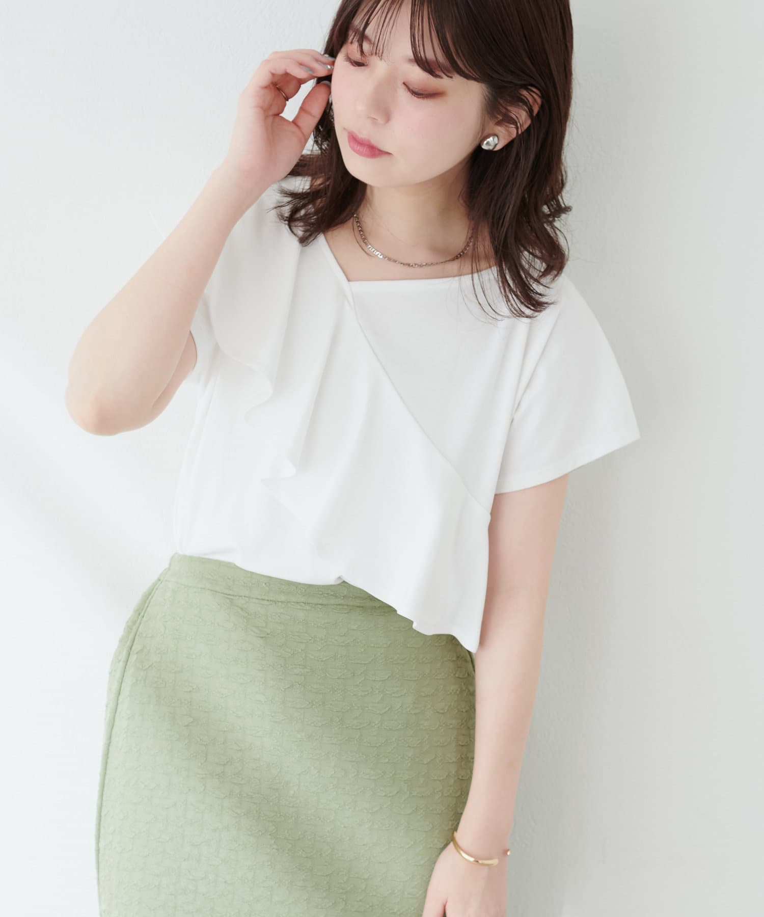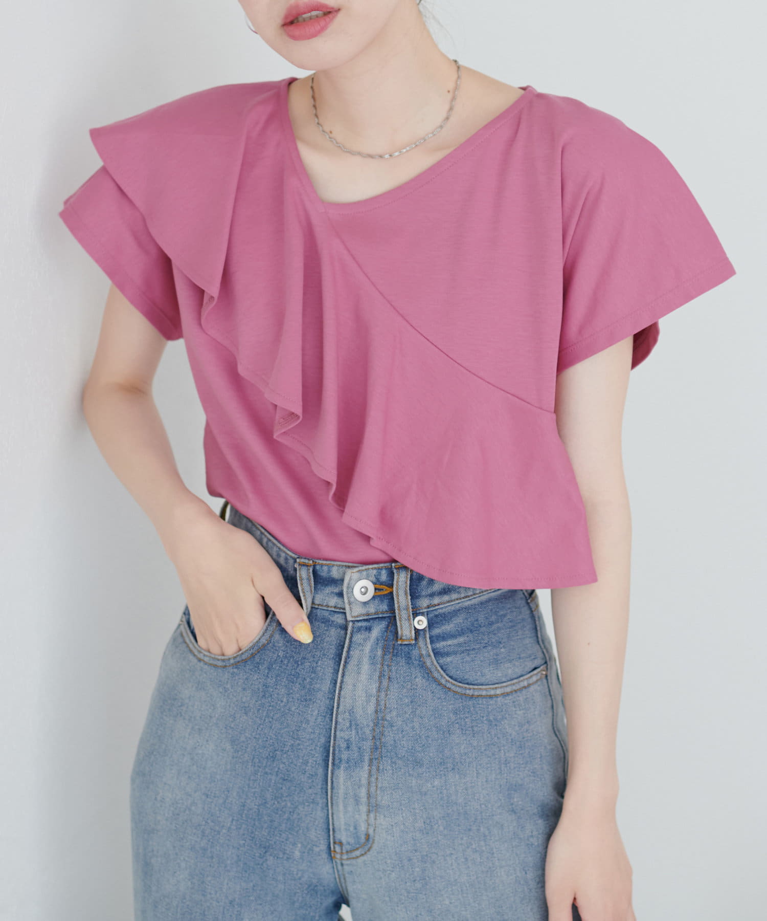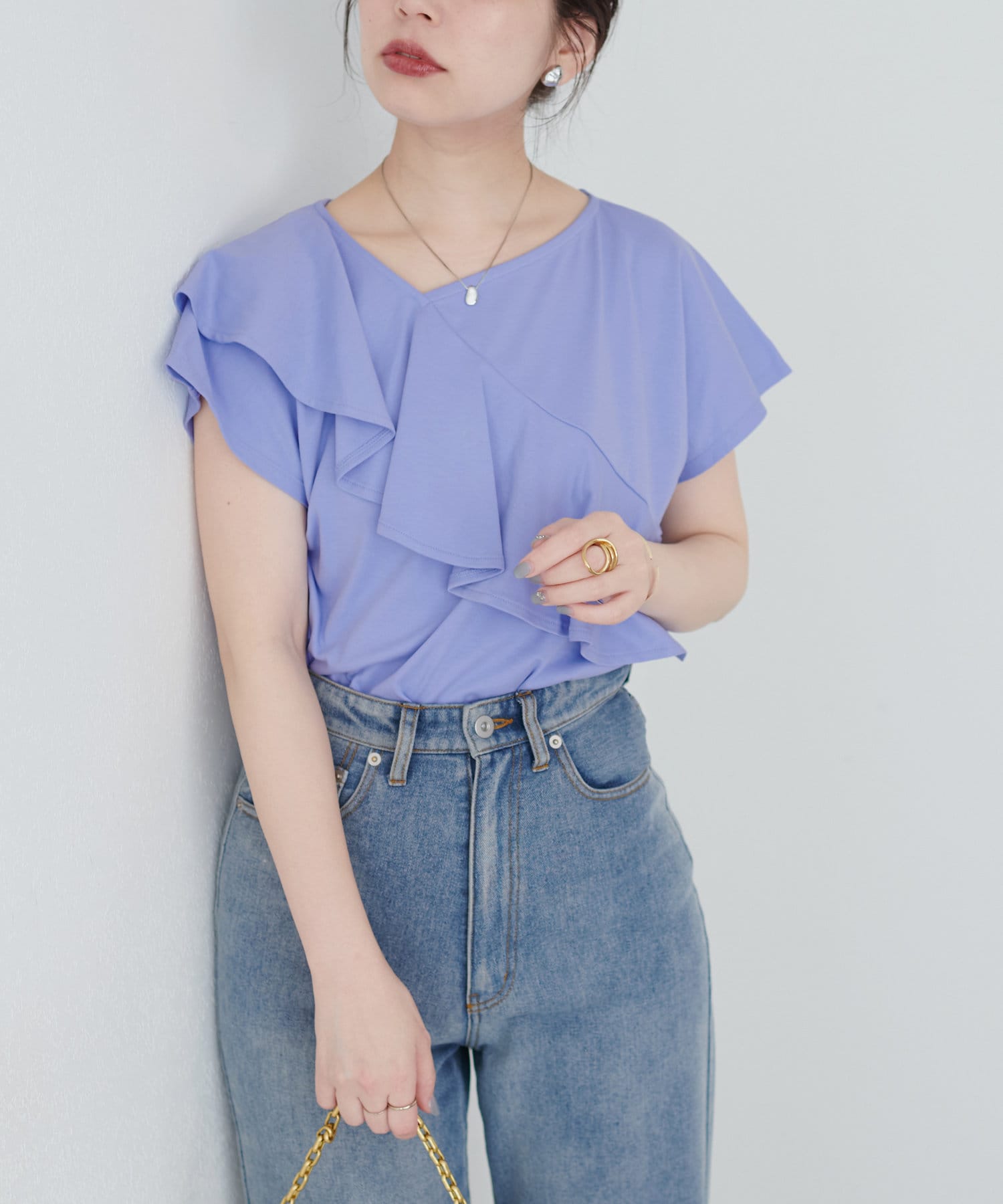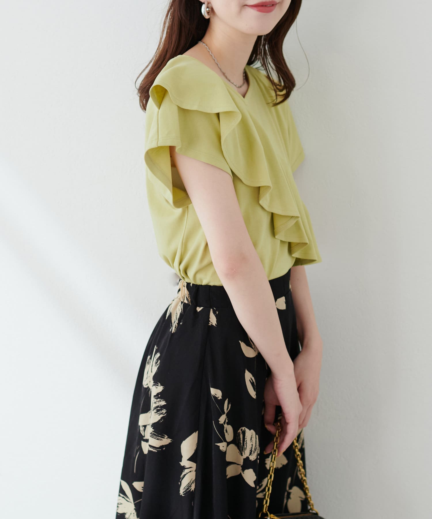 シンプルなカットソーに大胆なフリルを施してフェミニンに仕上げた1着。