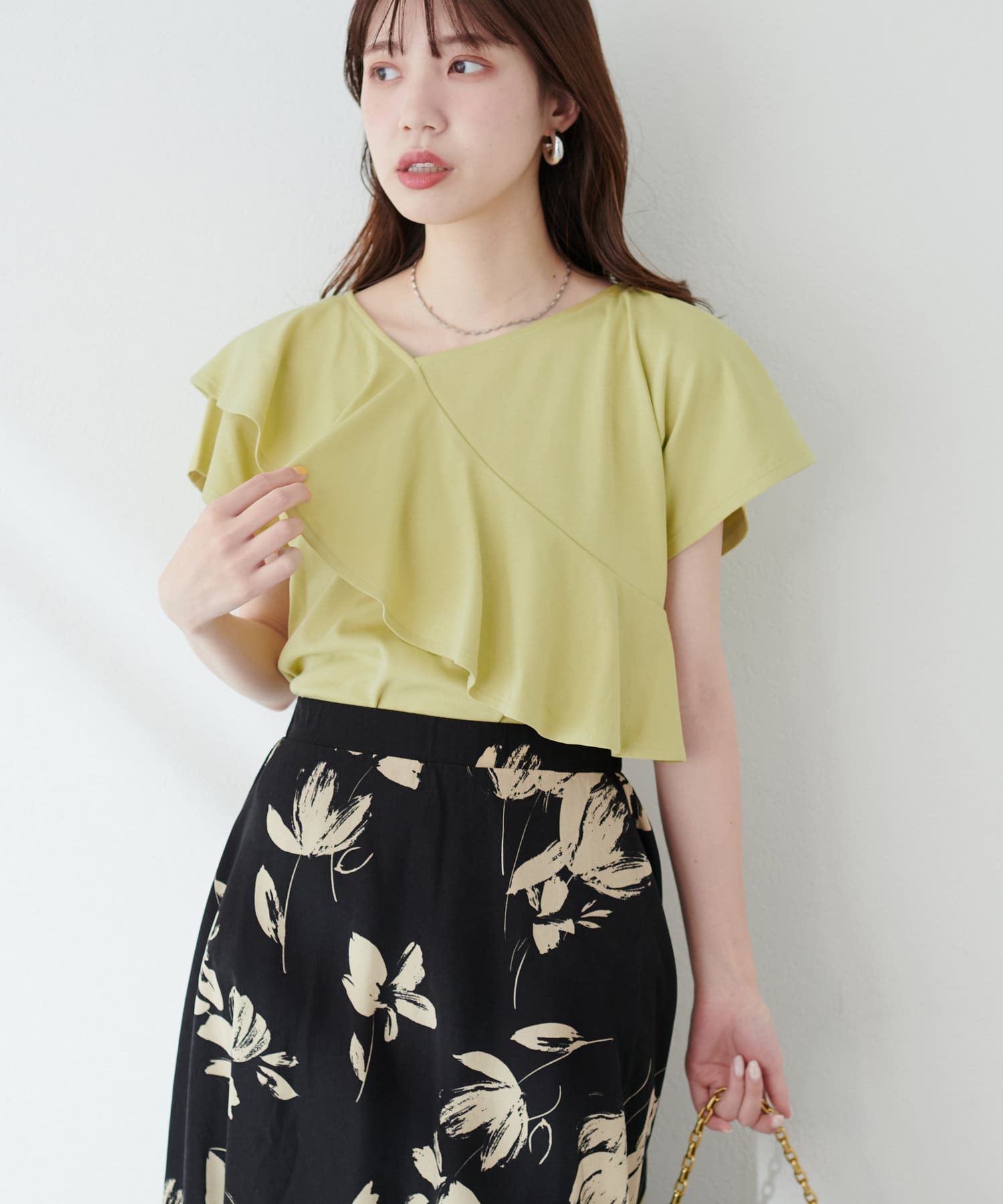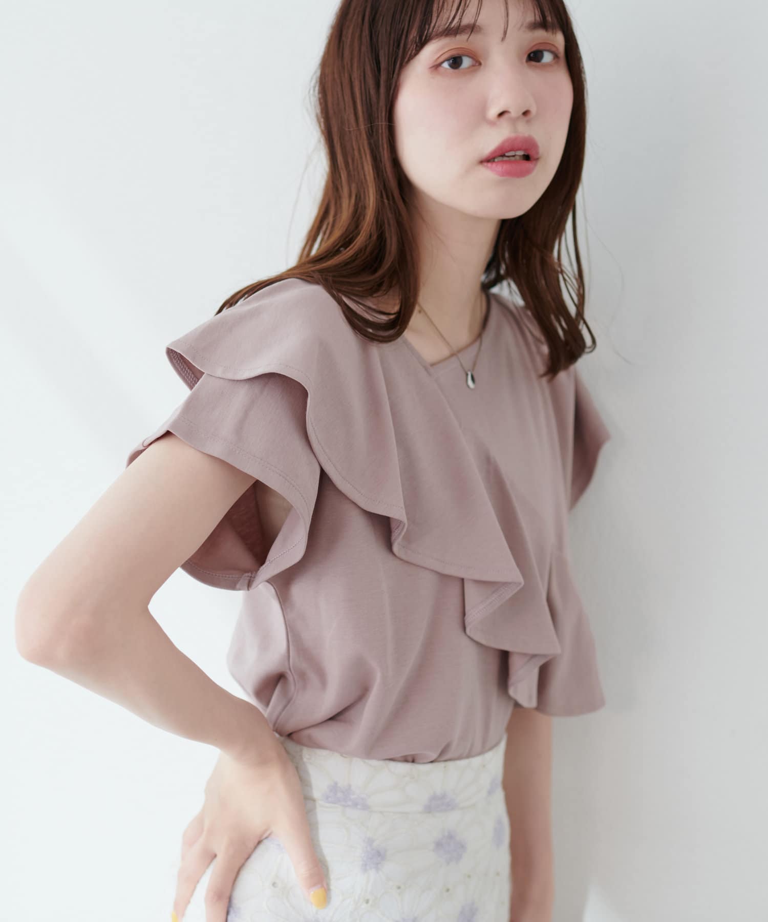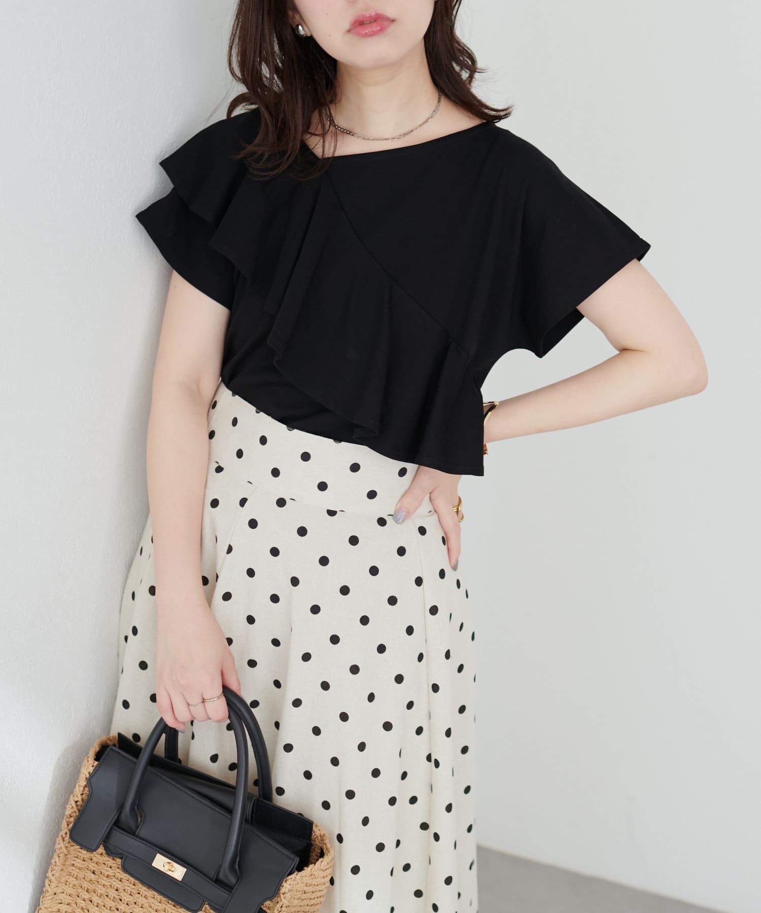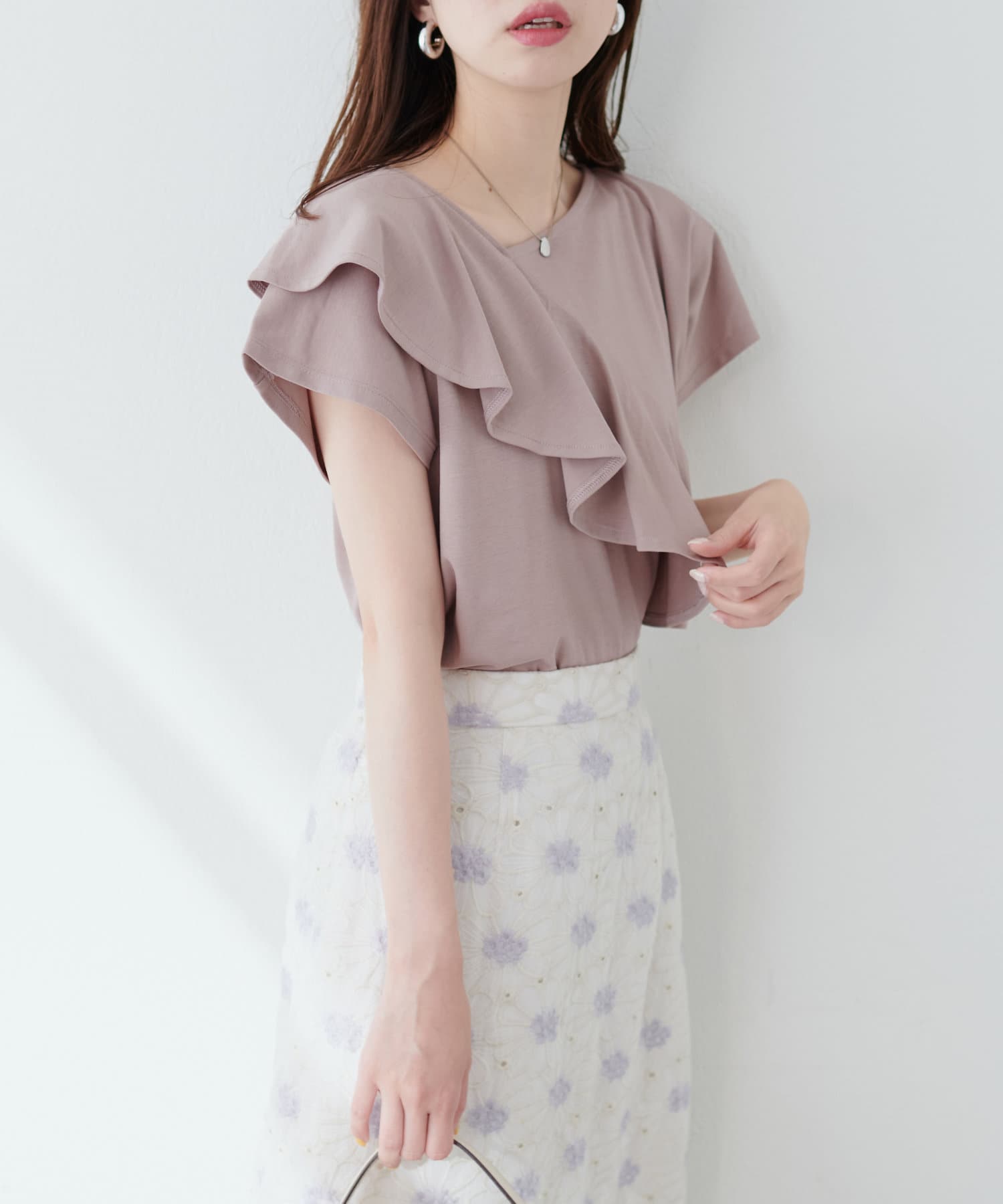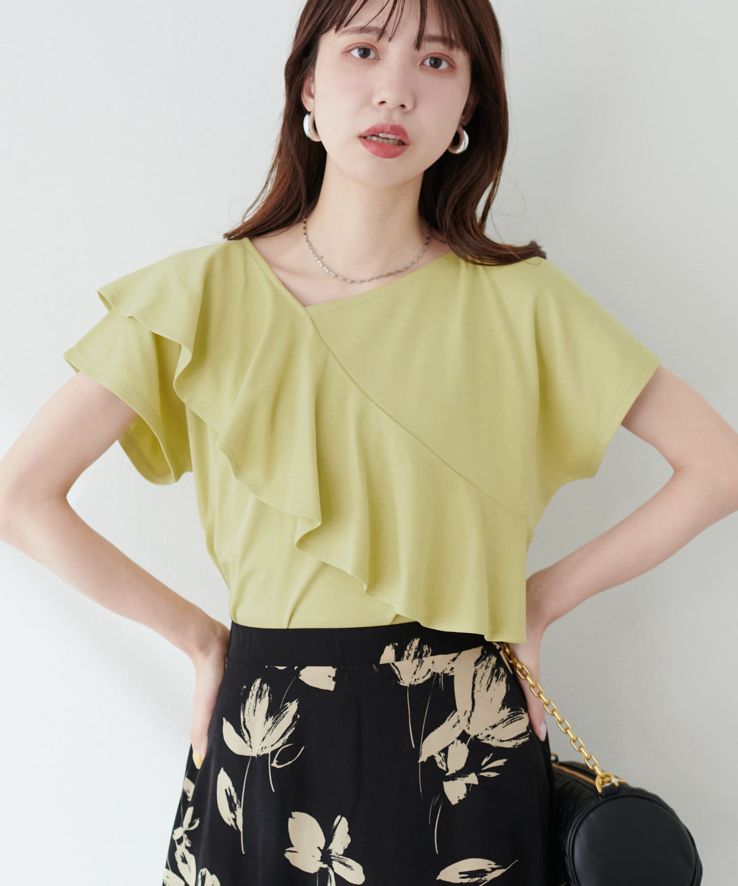 シンプルなカットソーに大胆なフリルを施してフェミニンに仕上げた1着。
