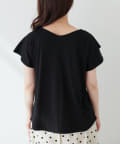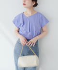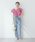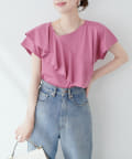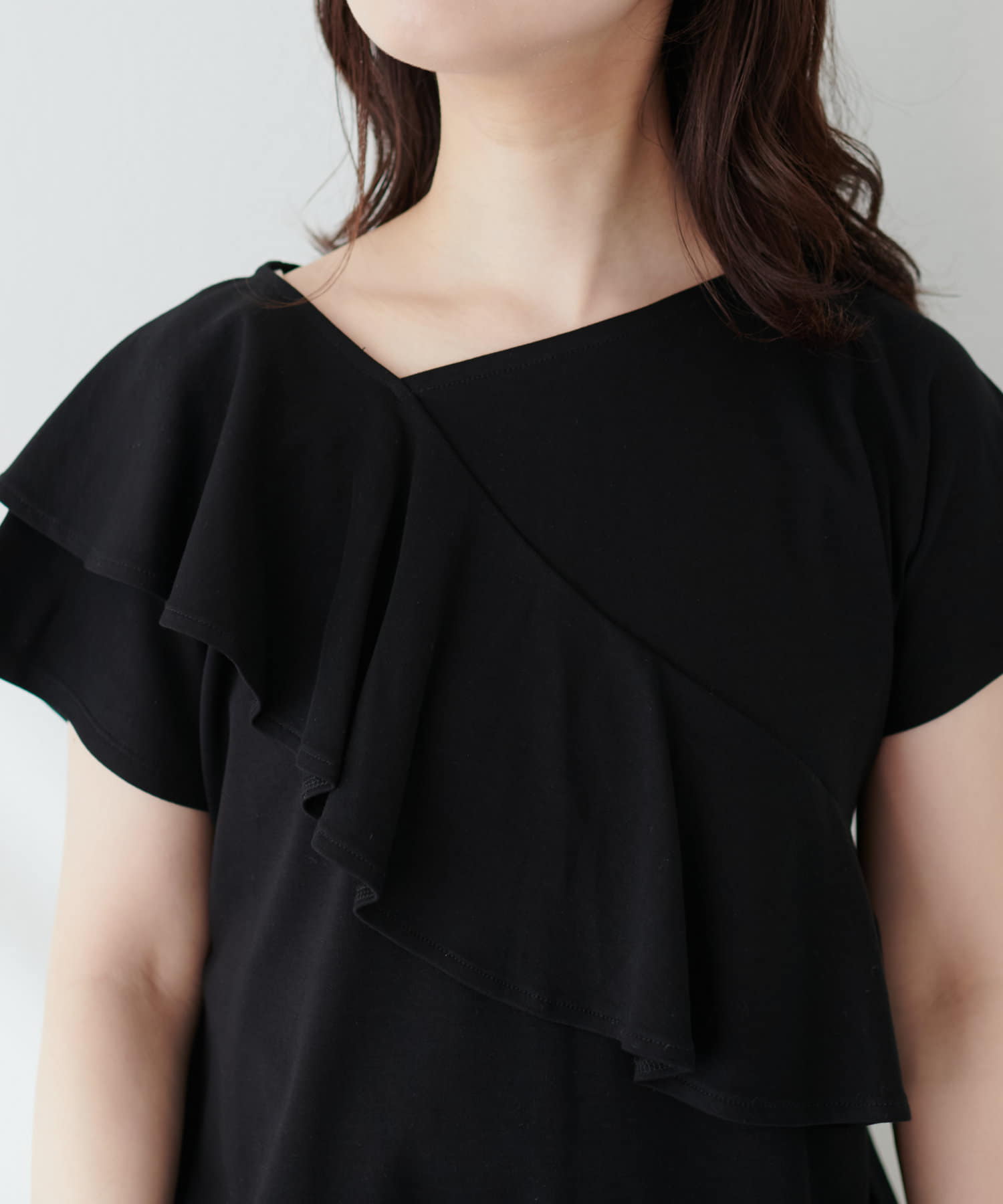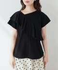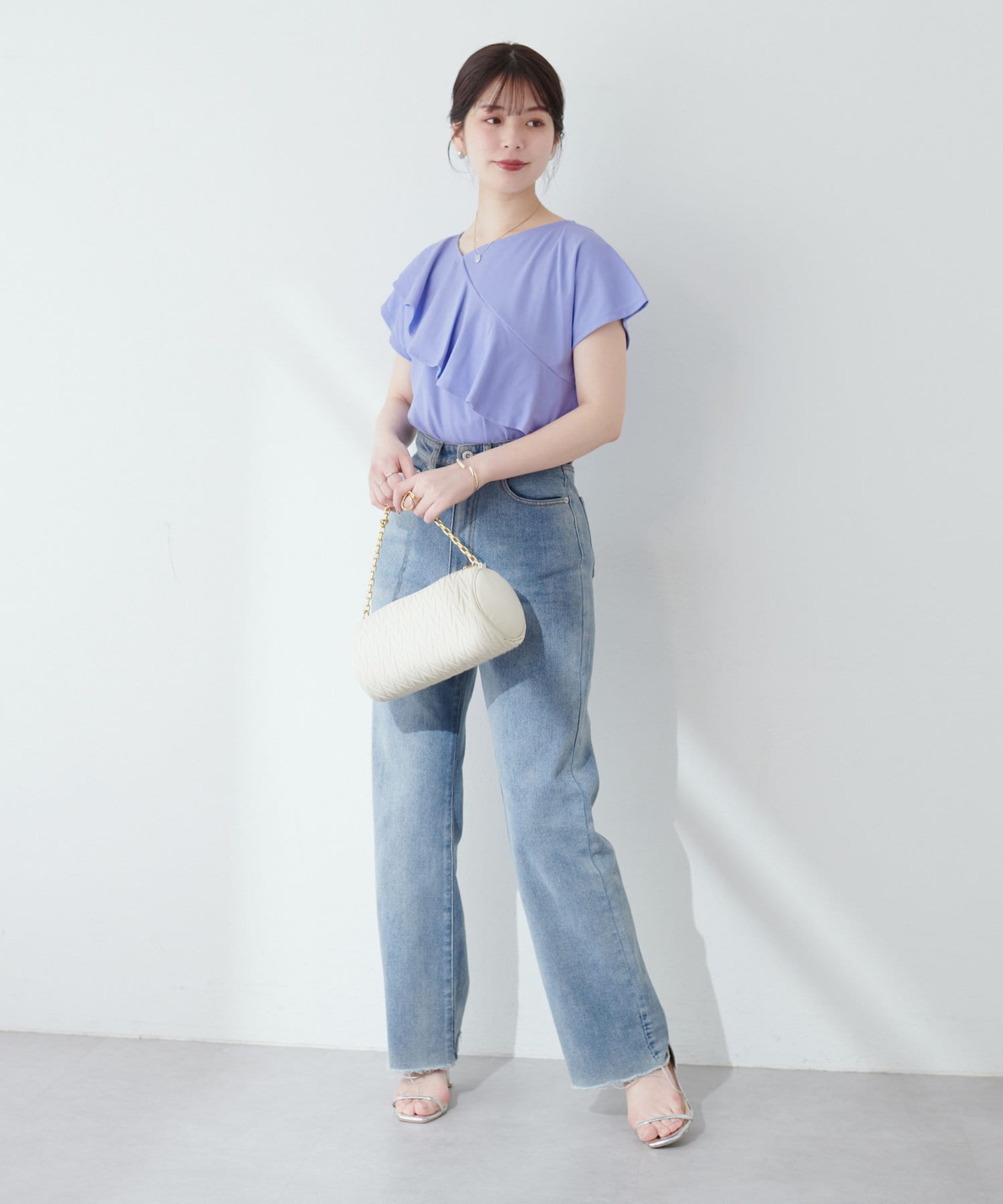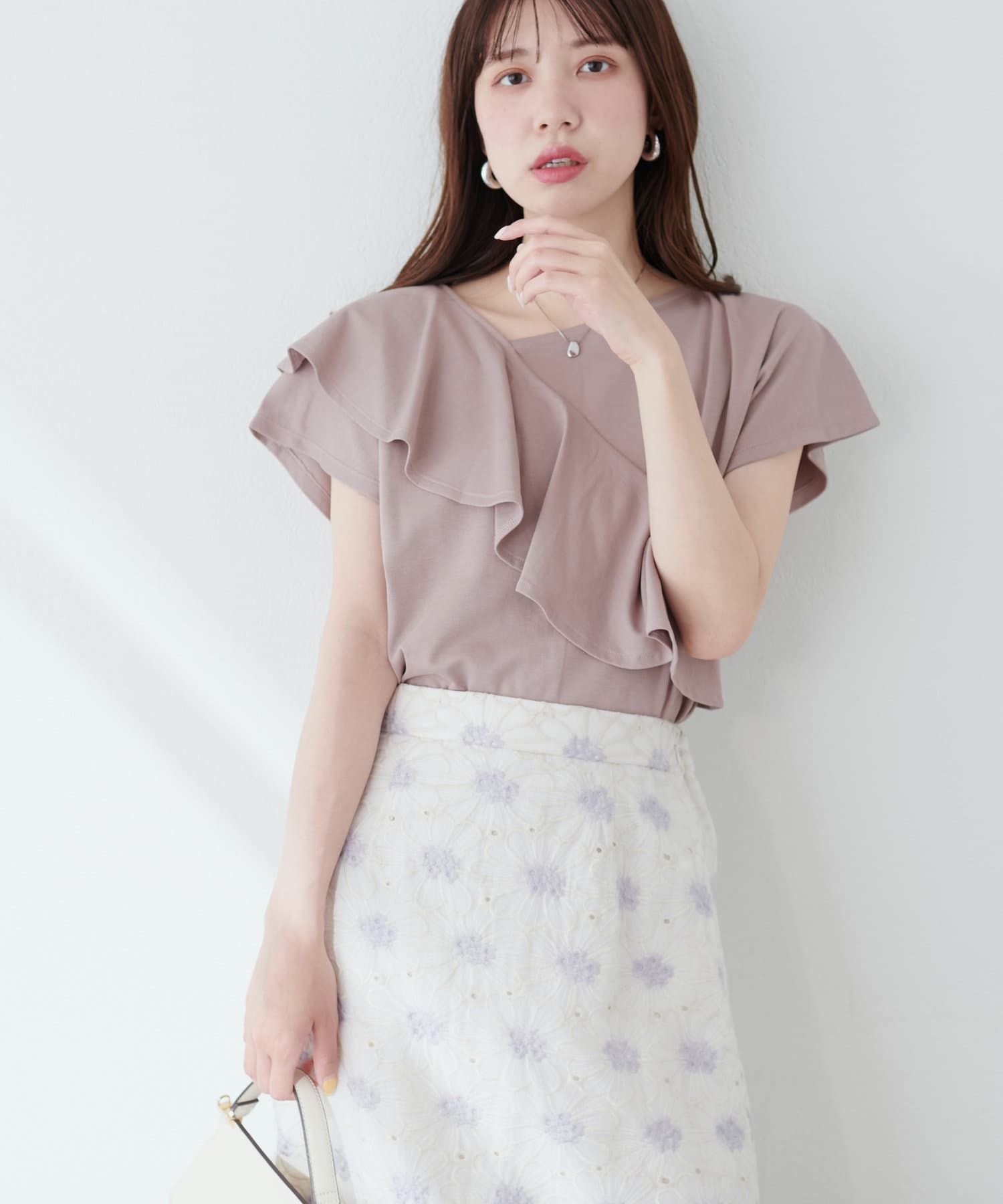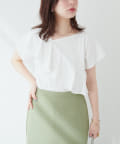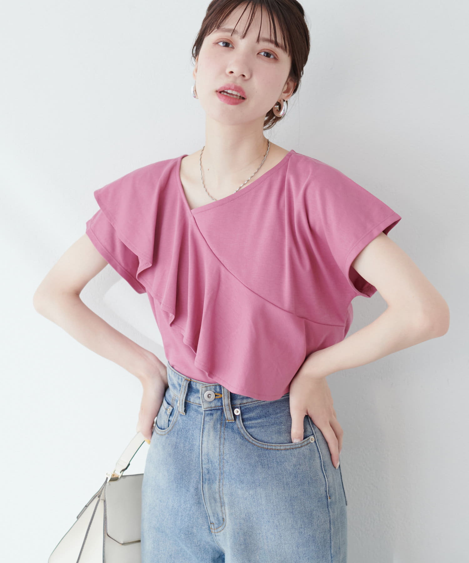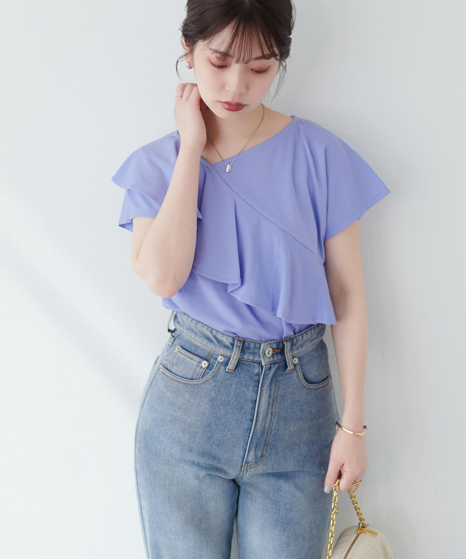 シンプルなカットソーに大胆なフリルを施してフェミニンに仕上げた1着。