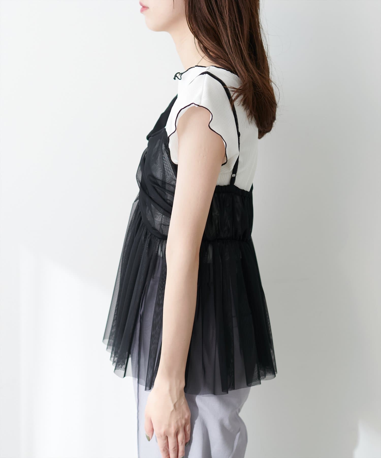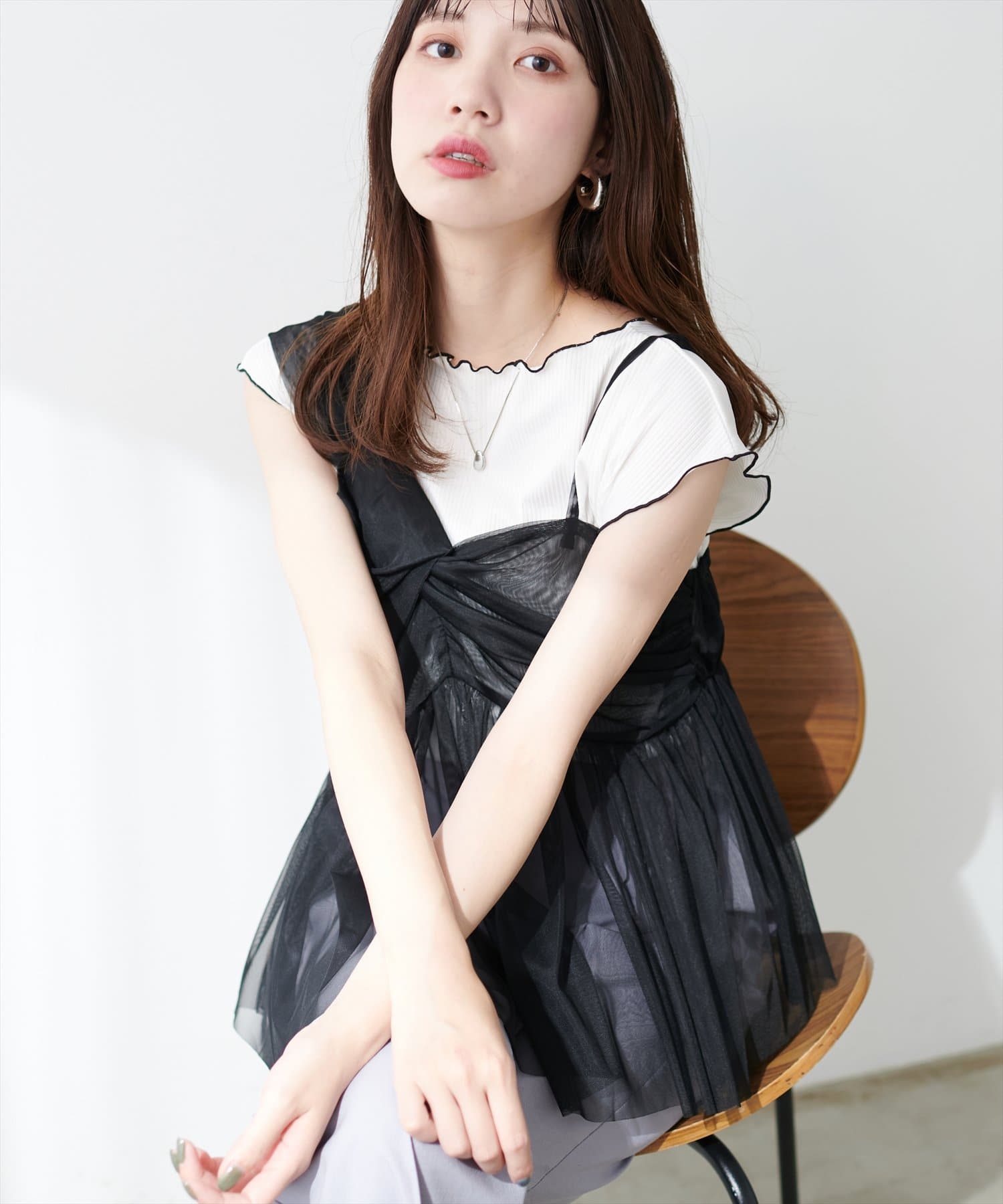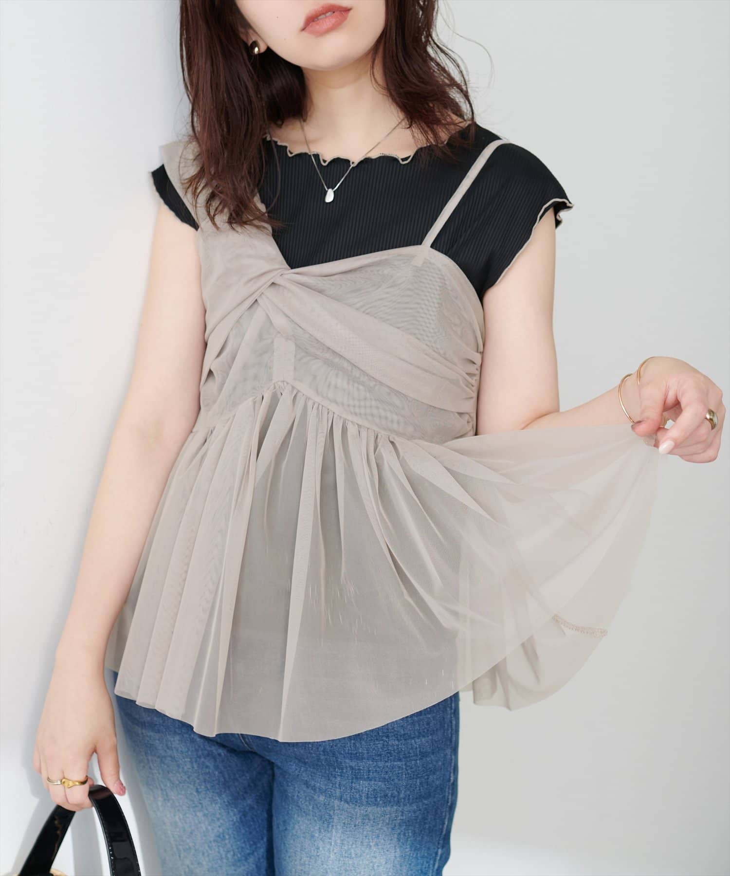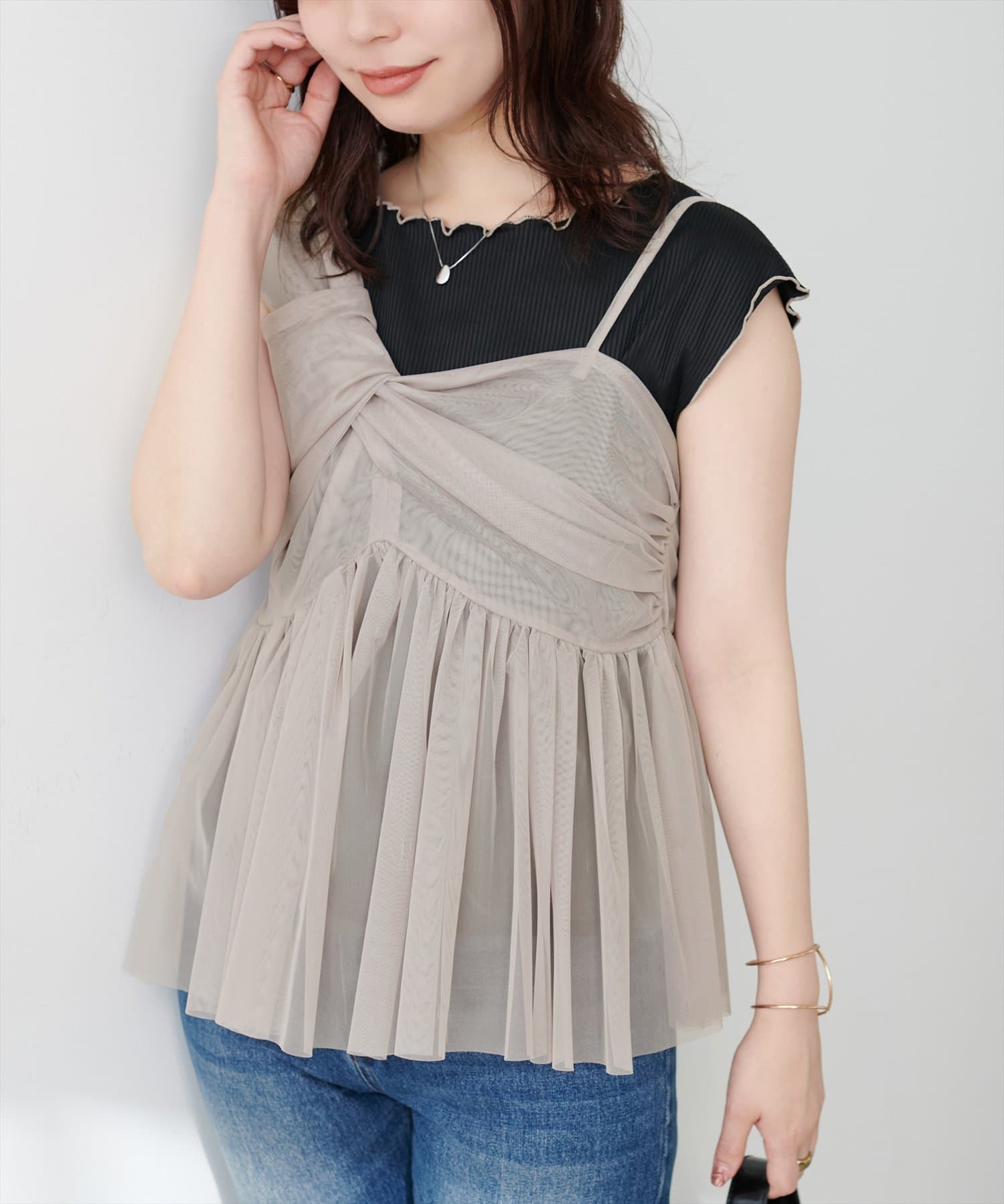 トレンド感たっぷりのチュールキャミとメロートップスがセットになったアイテム。