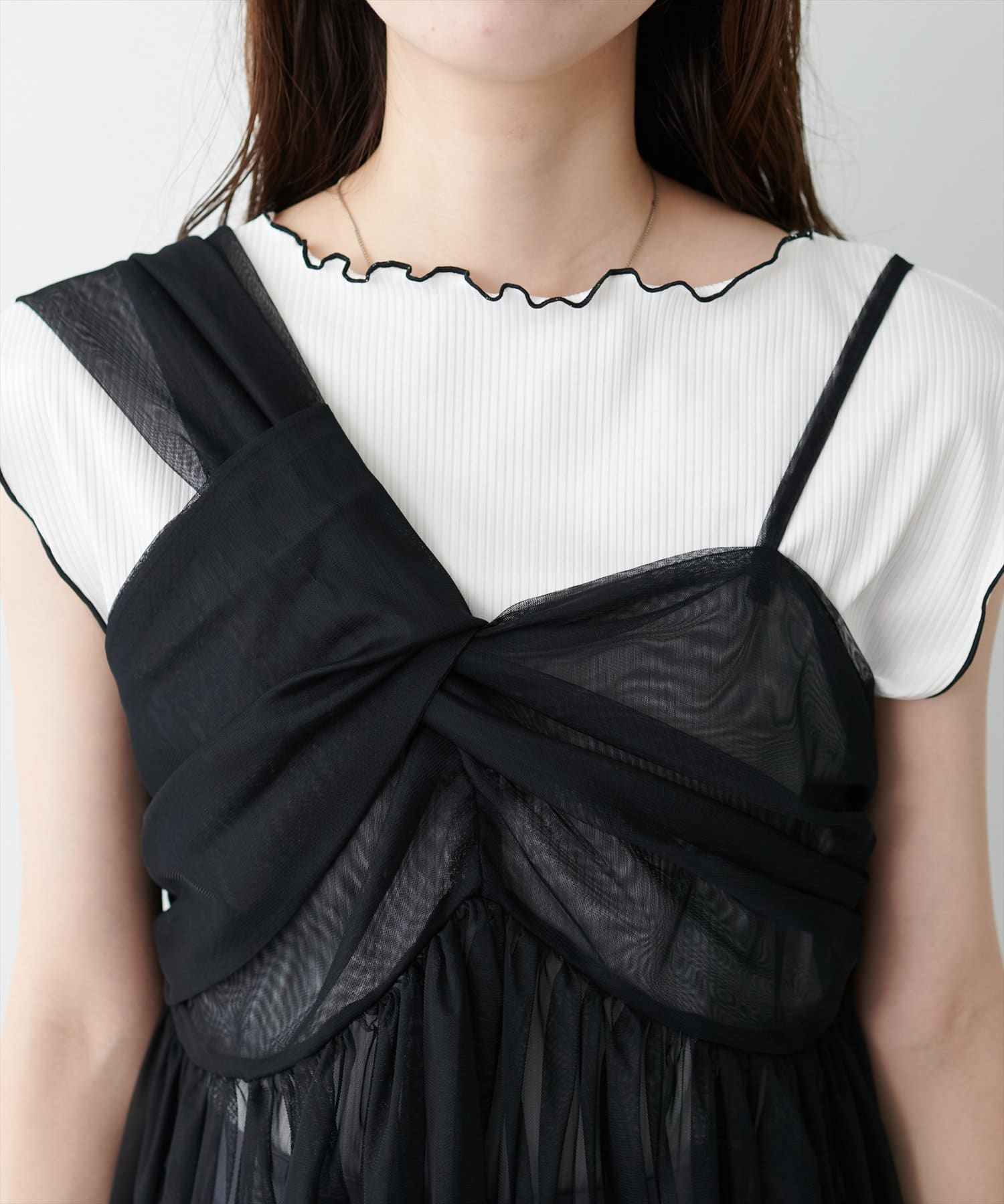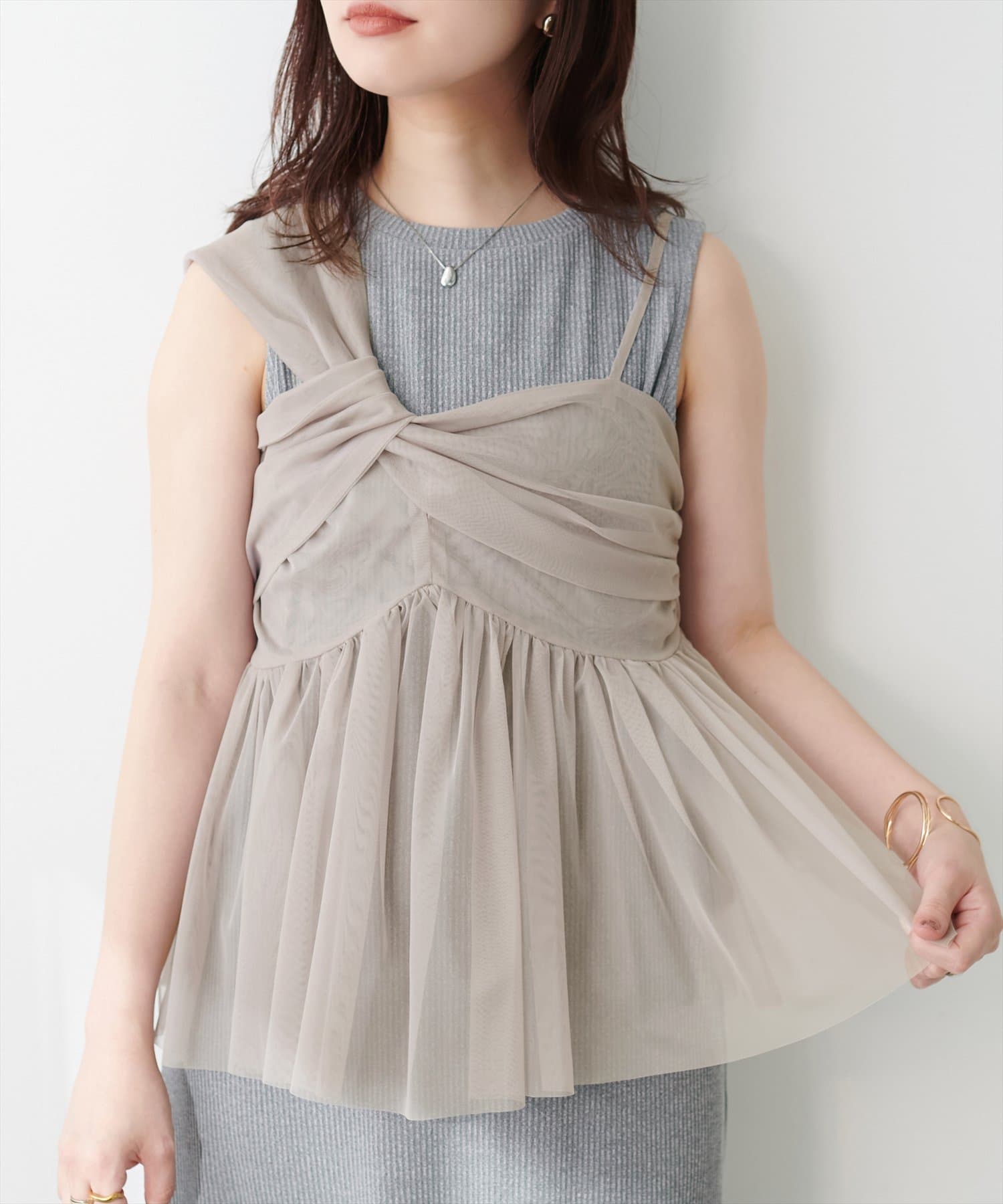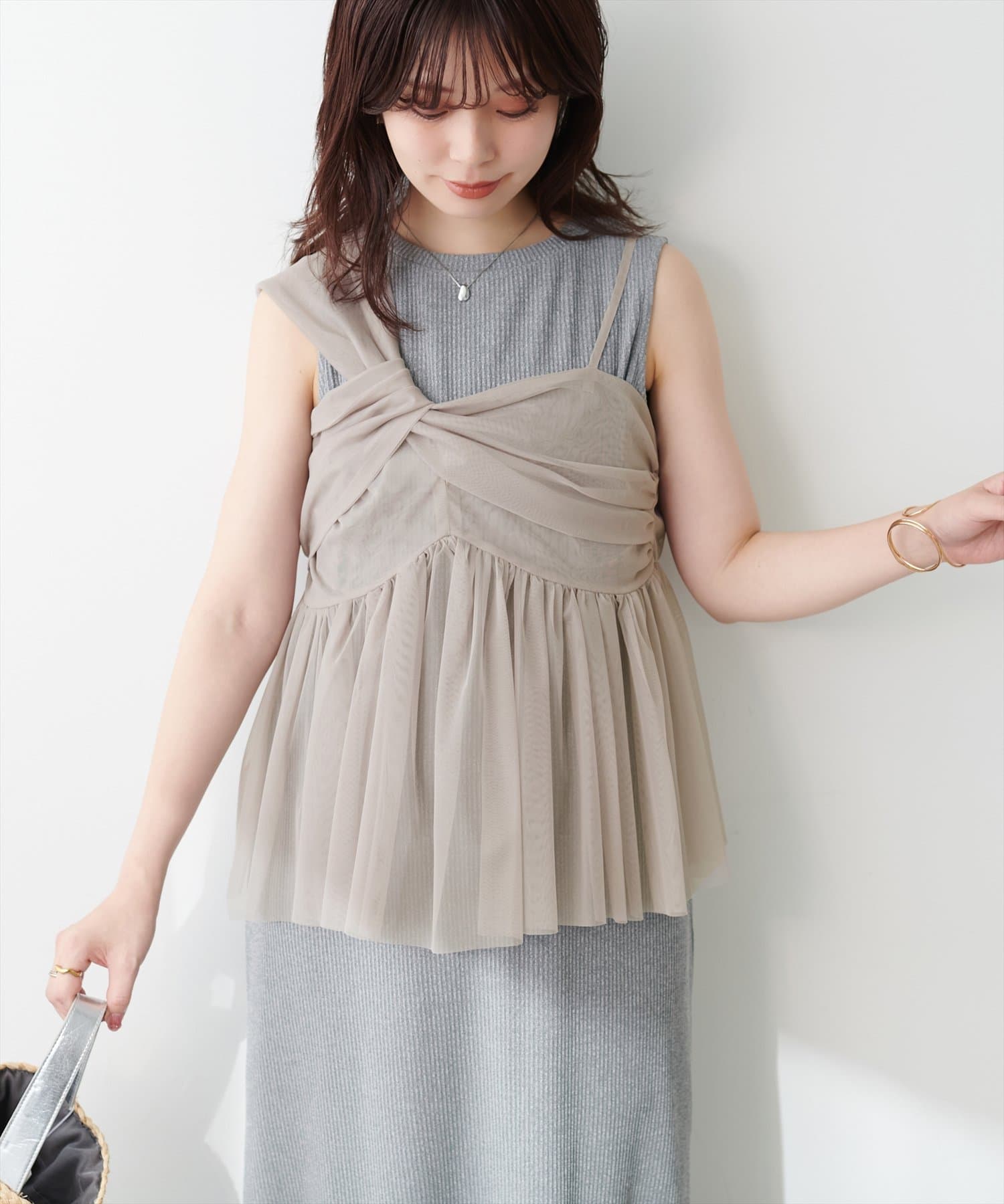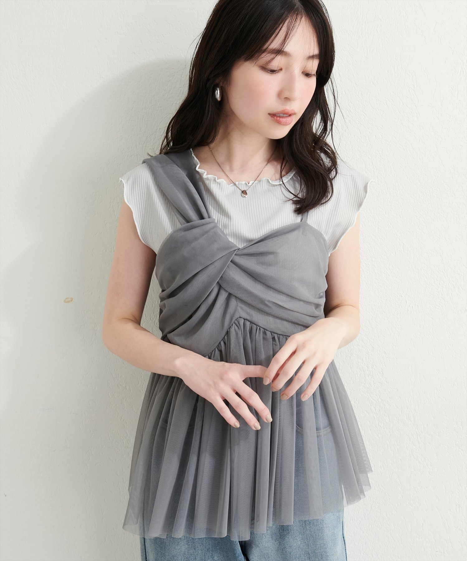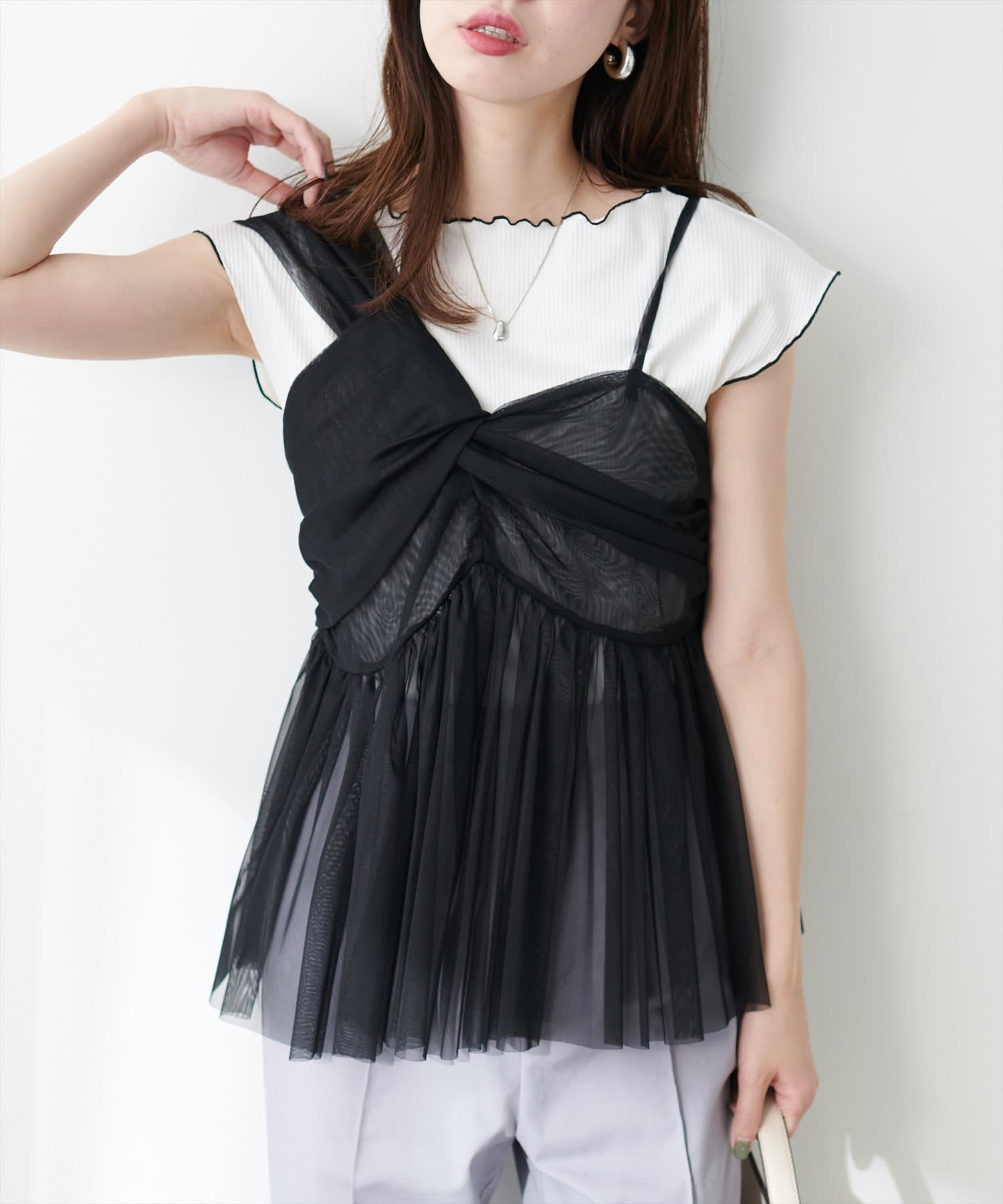 トレンド感たっぷりのチュールキャミとメロートップスがセットになったアイテム。