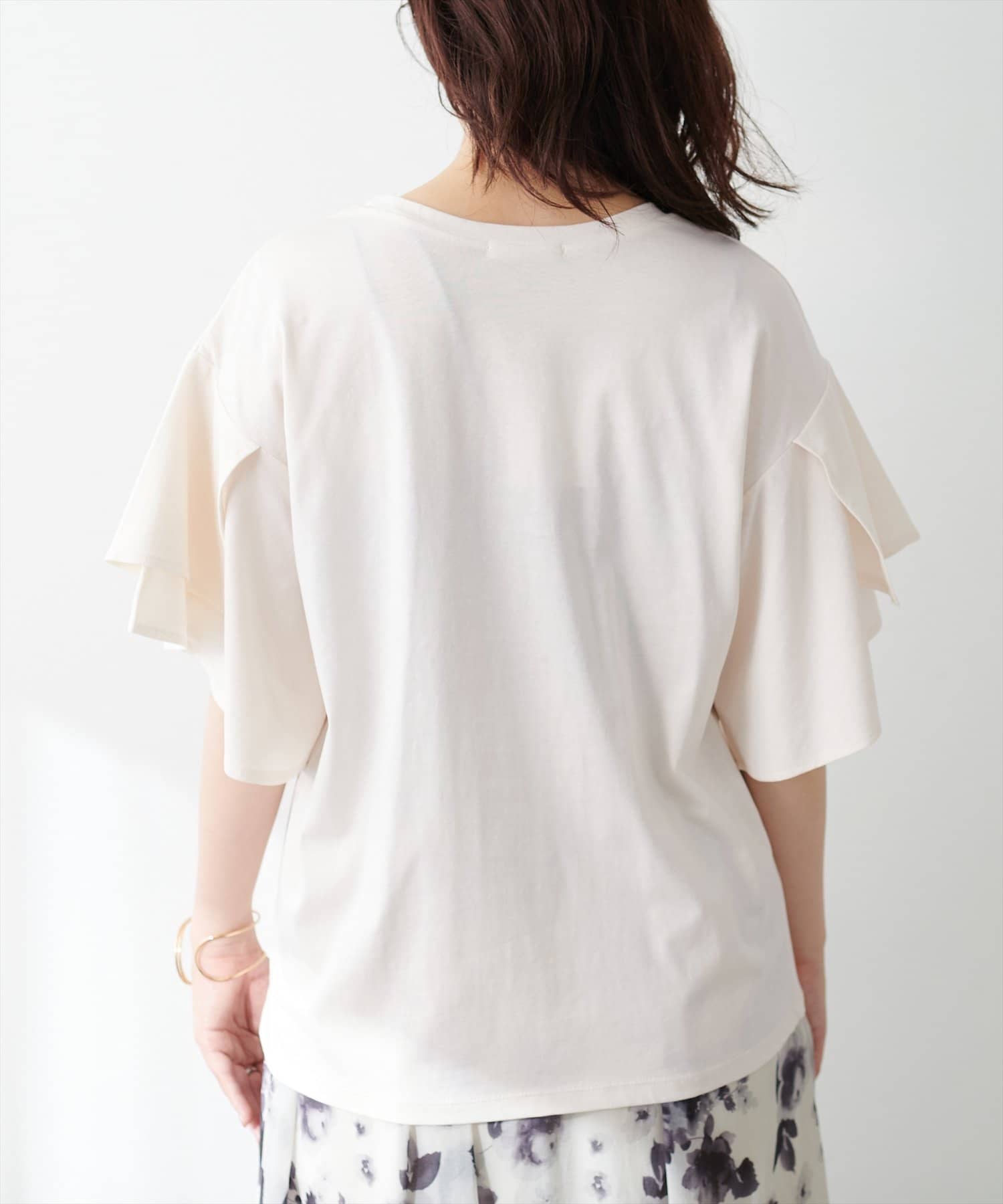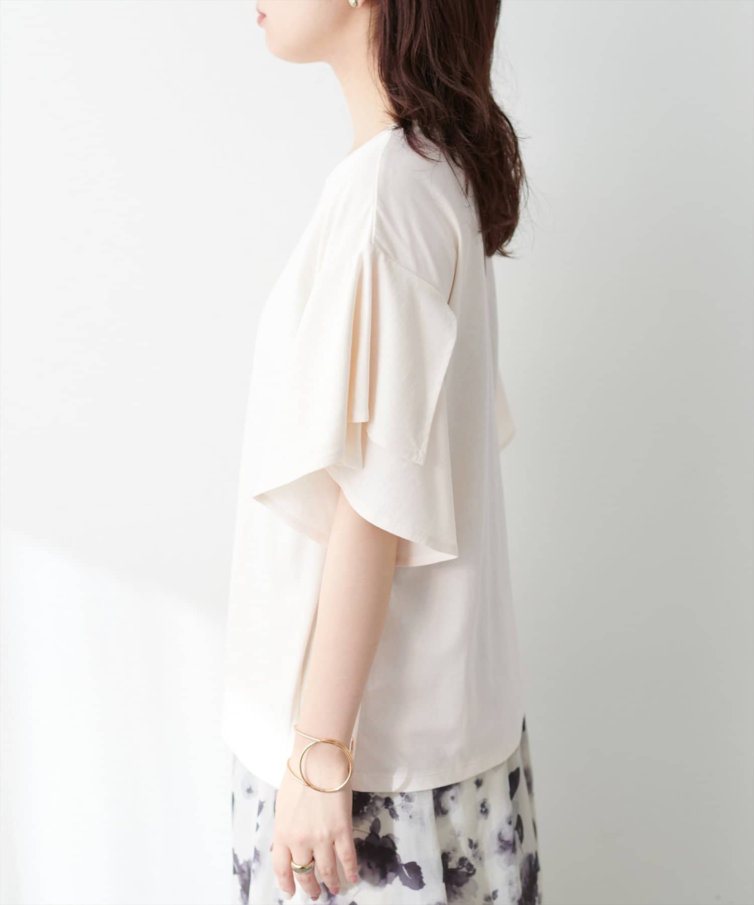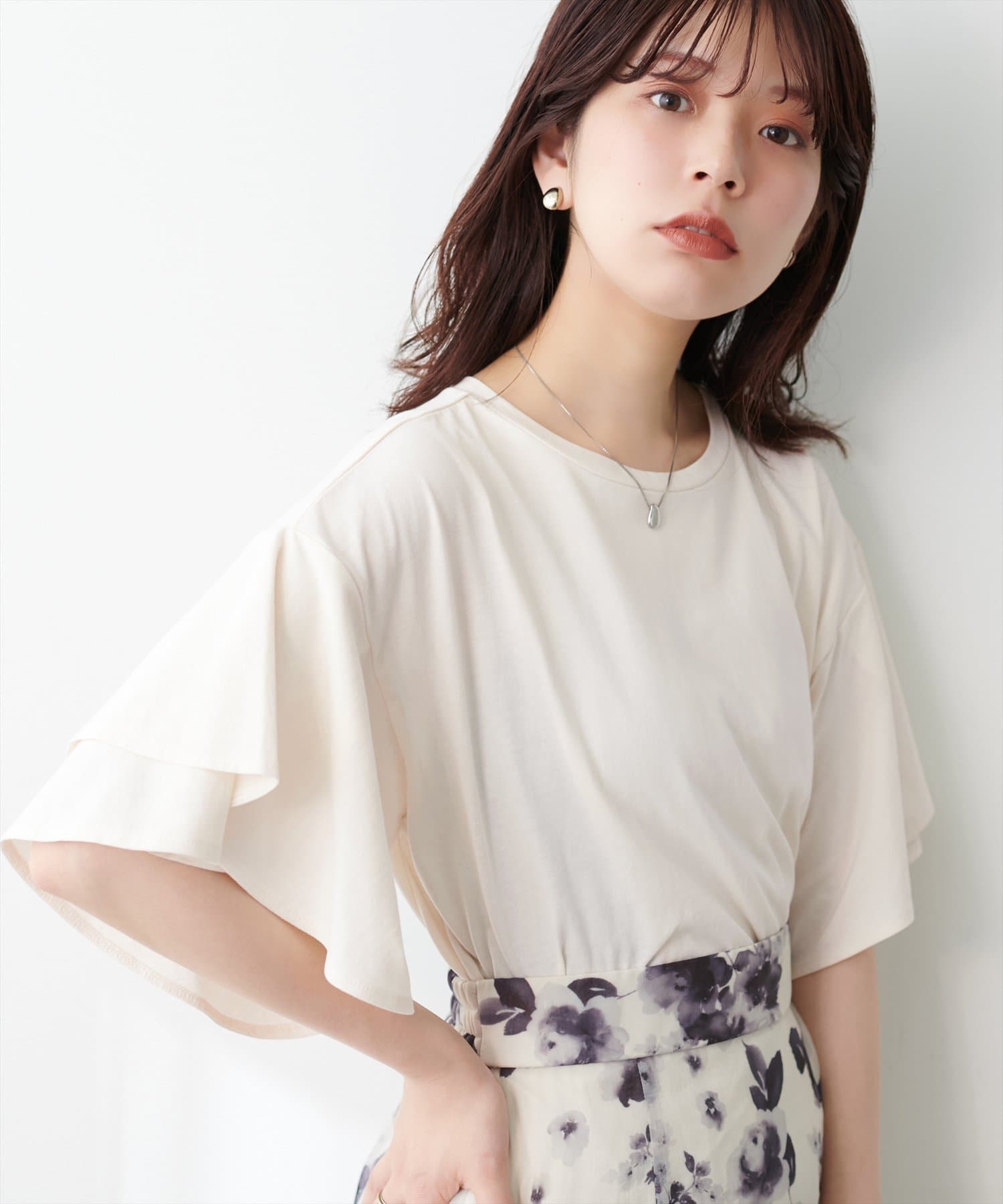 シンプルなカットソーにデザイン性をプラスしてフェミニンに仕上げた1着。