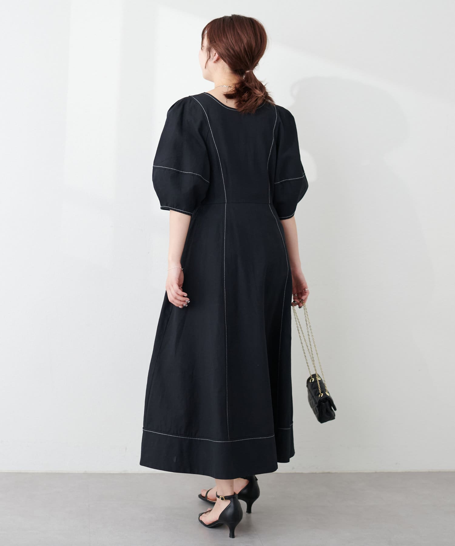 腕を華奢に見せてくれるランタンスリーブが目を引く1着。