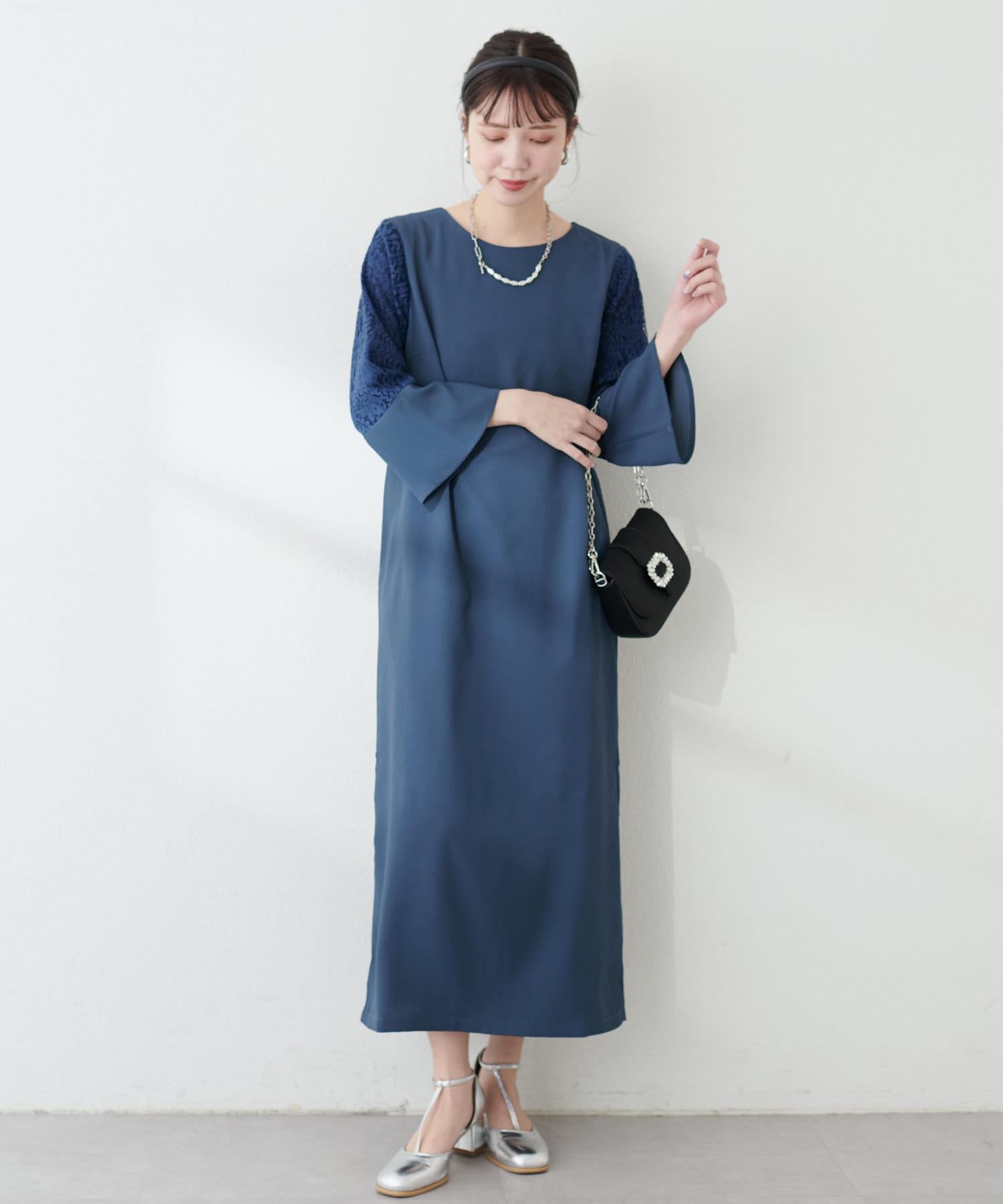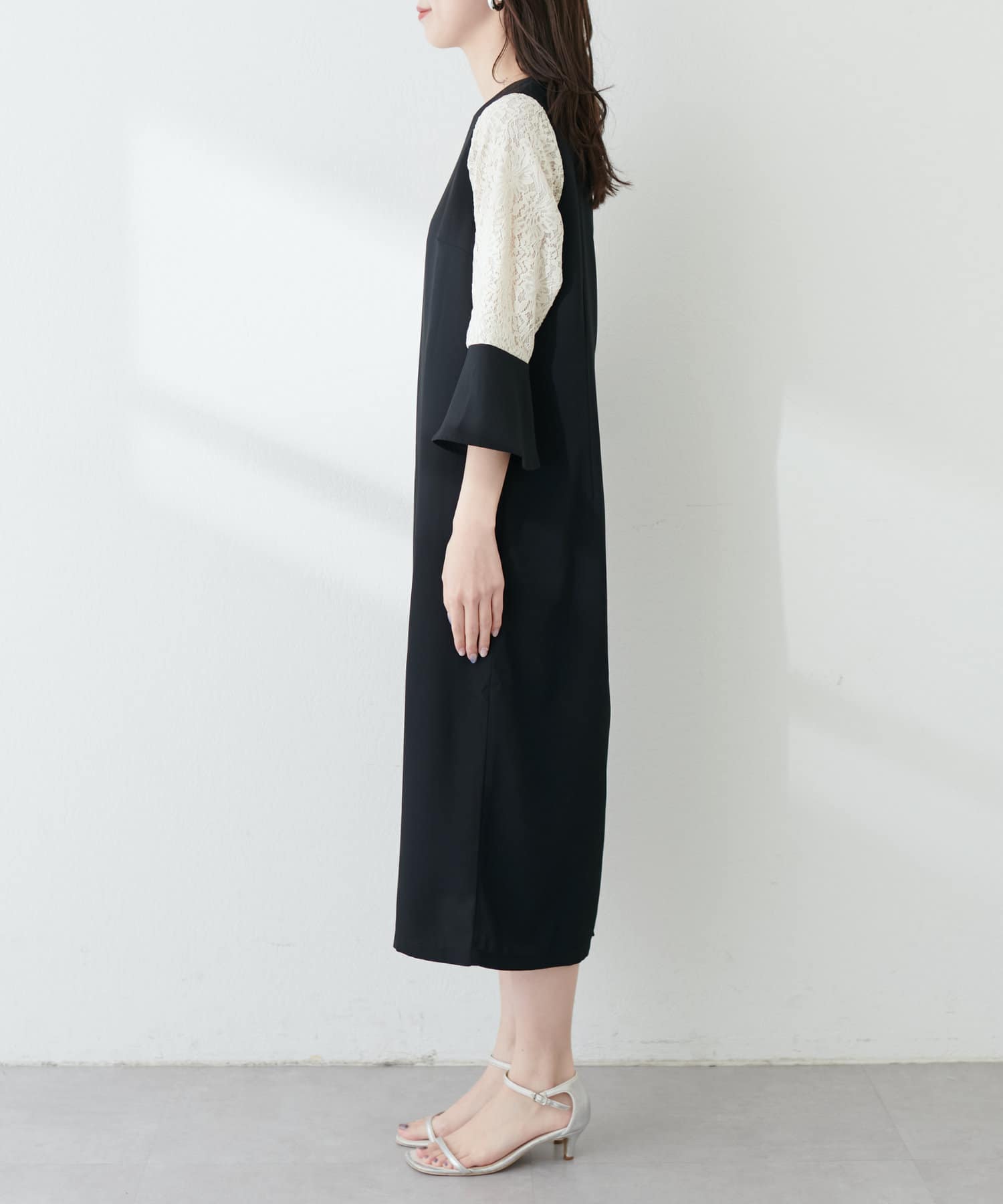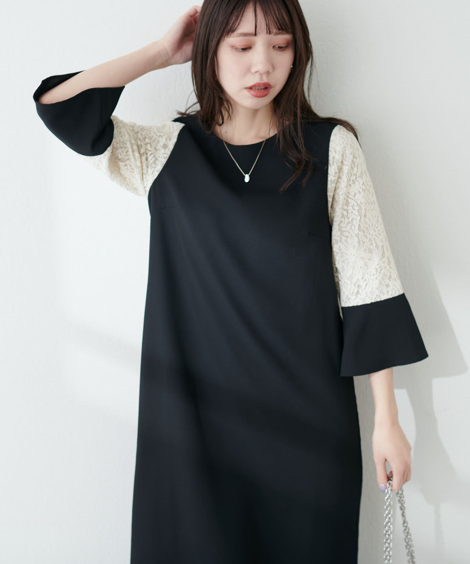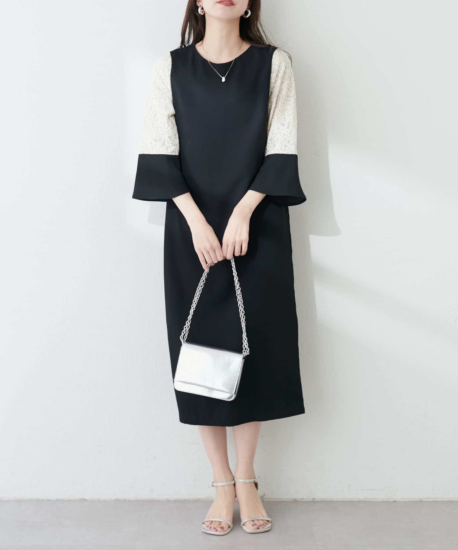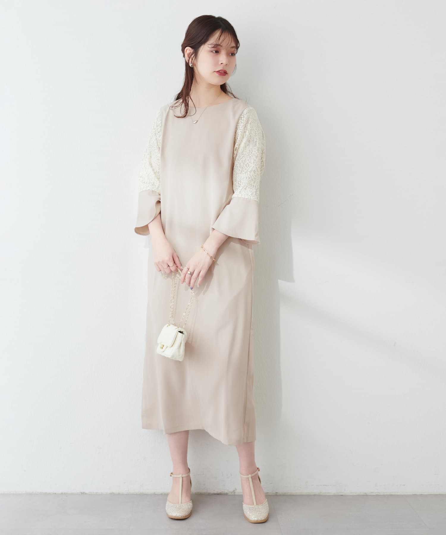 スリーブ部分の繊細なレース使いとフレア袖が上品な印象のワンピース。