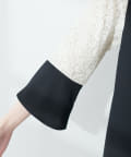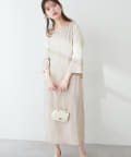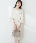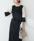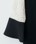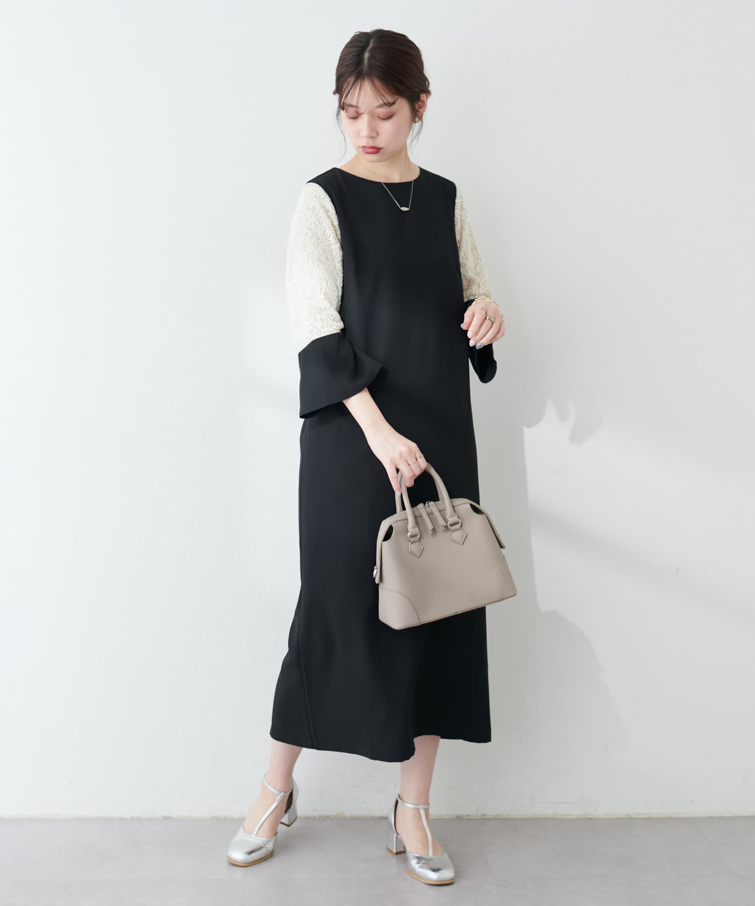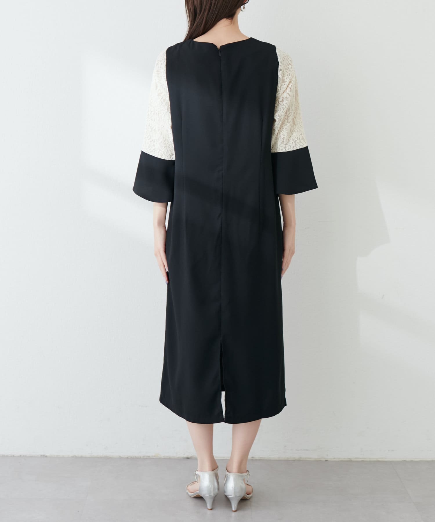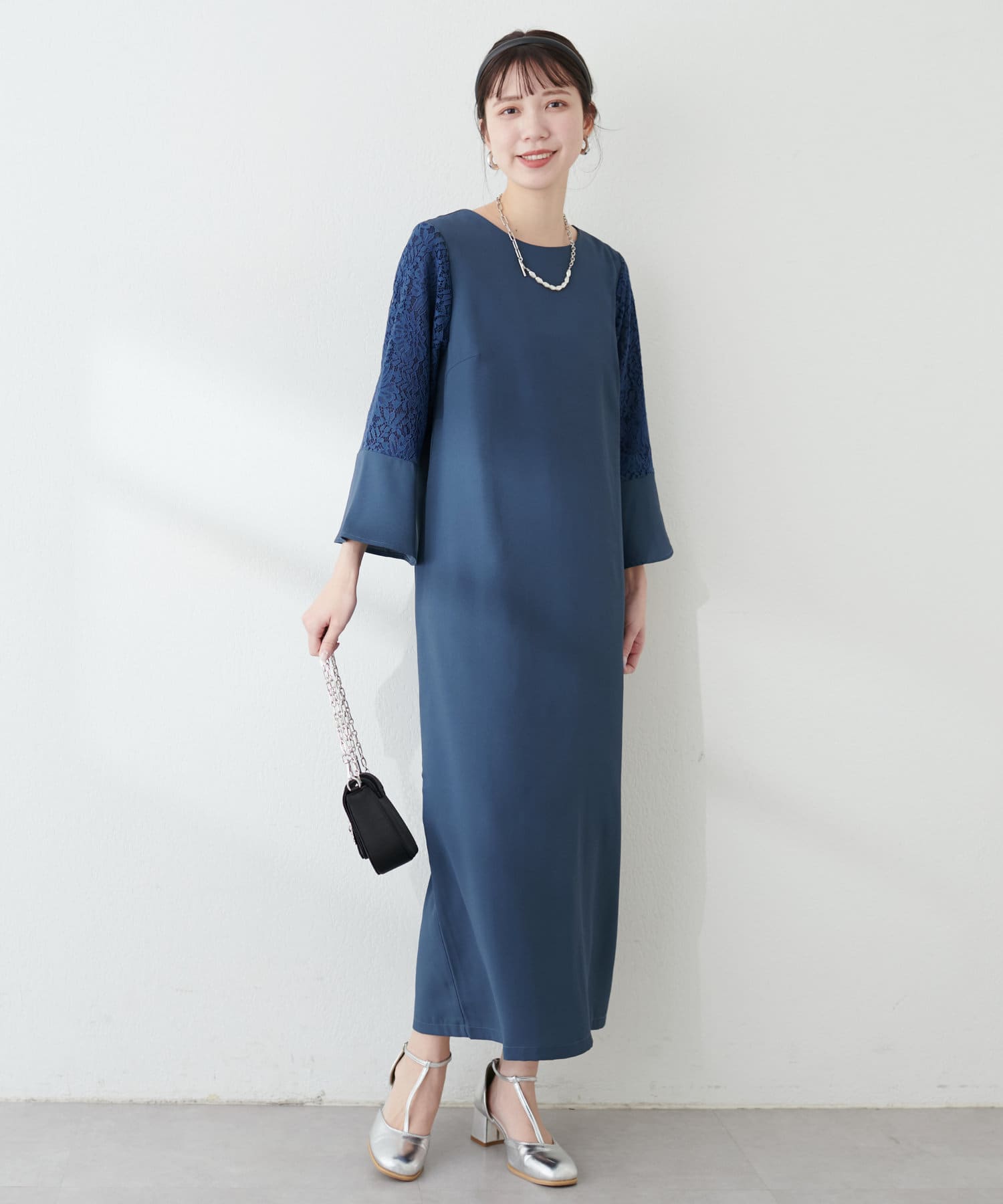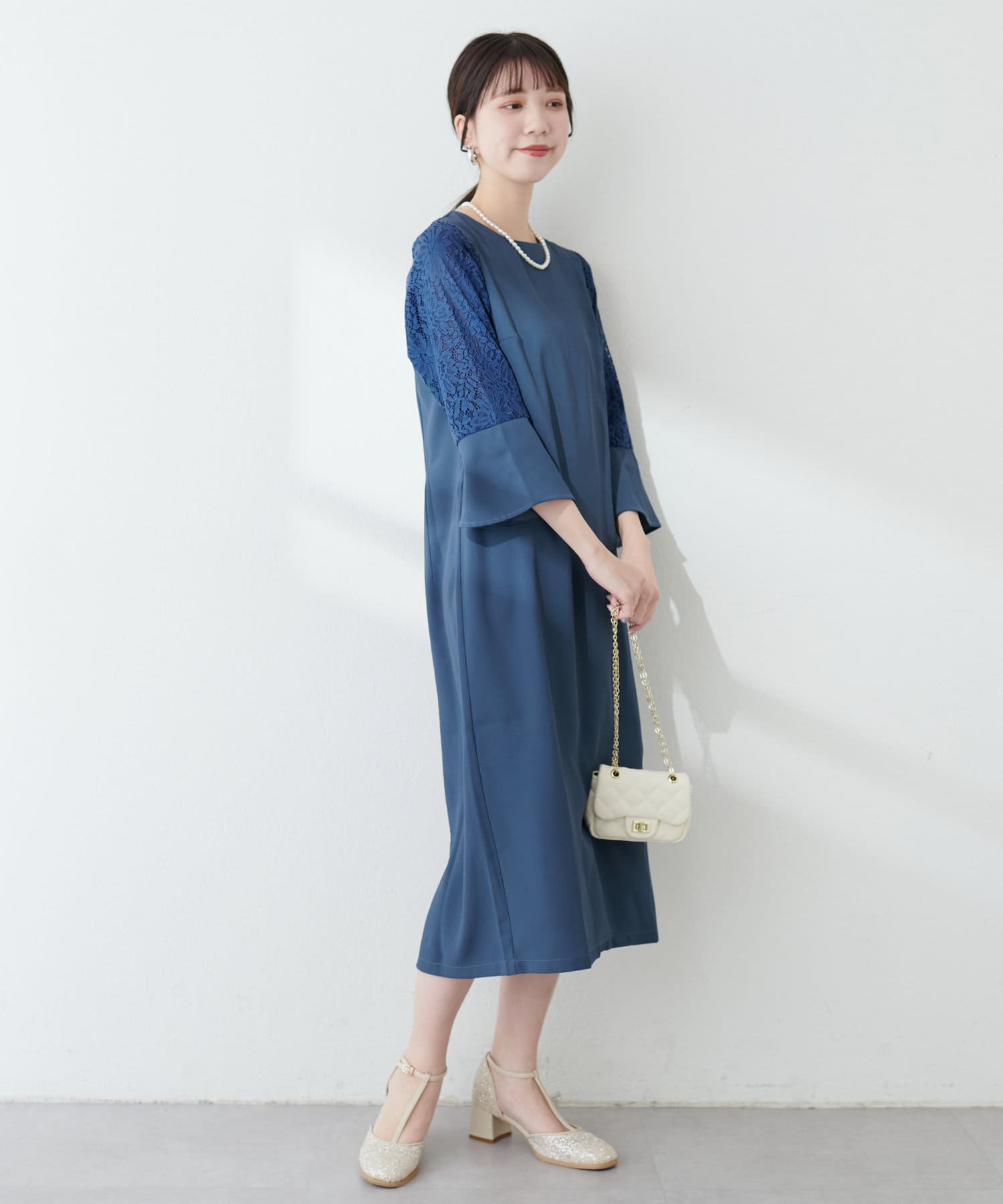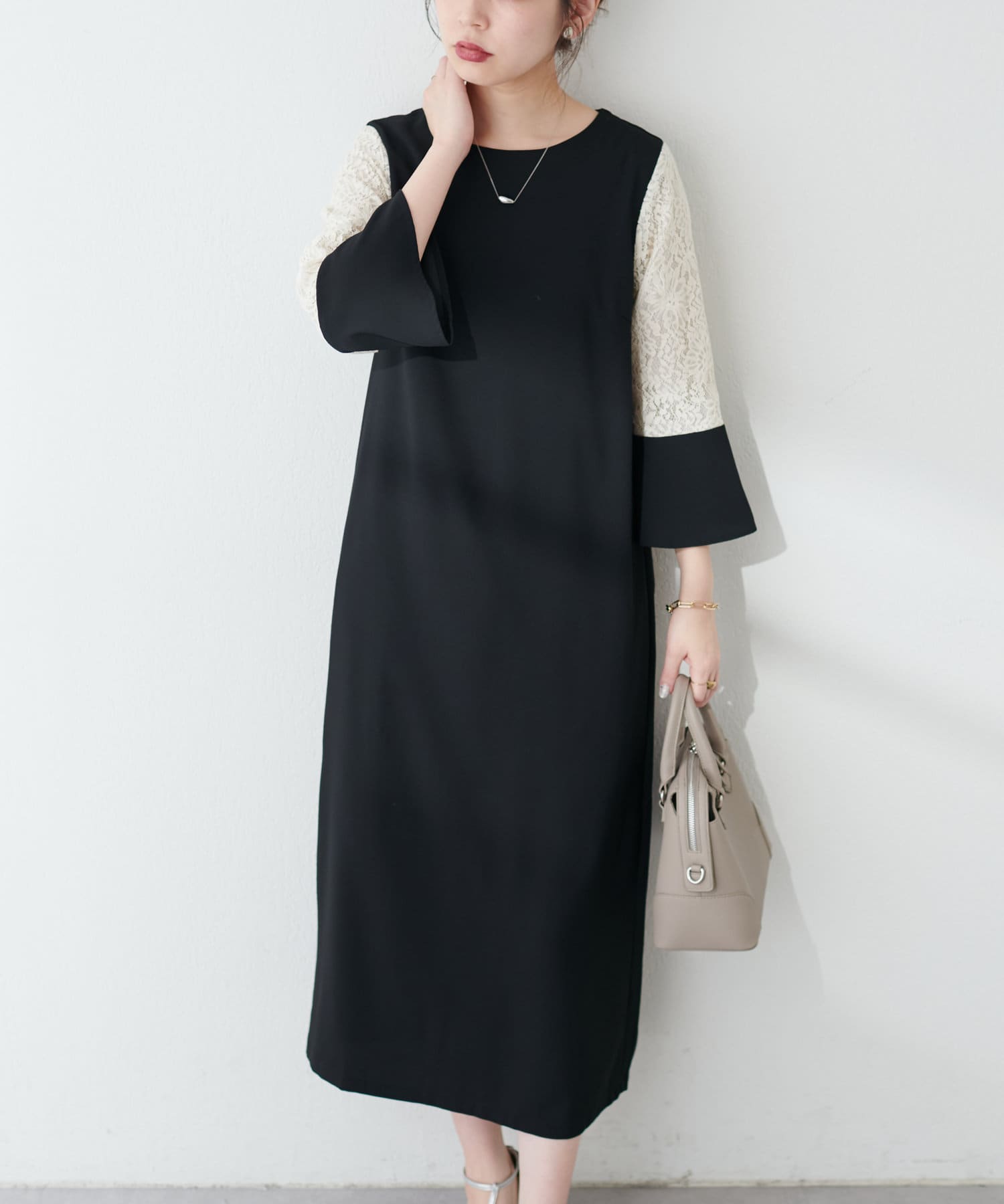 スリーブ部分の繊細なレース使いとフレア袖が上品な印象のワンピース。