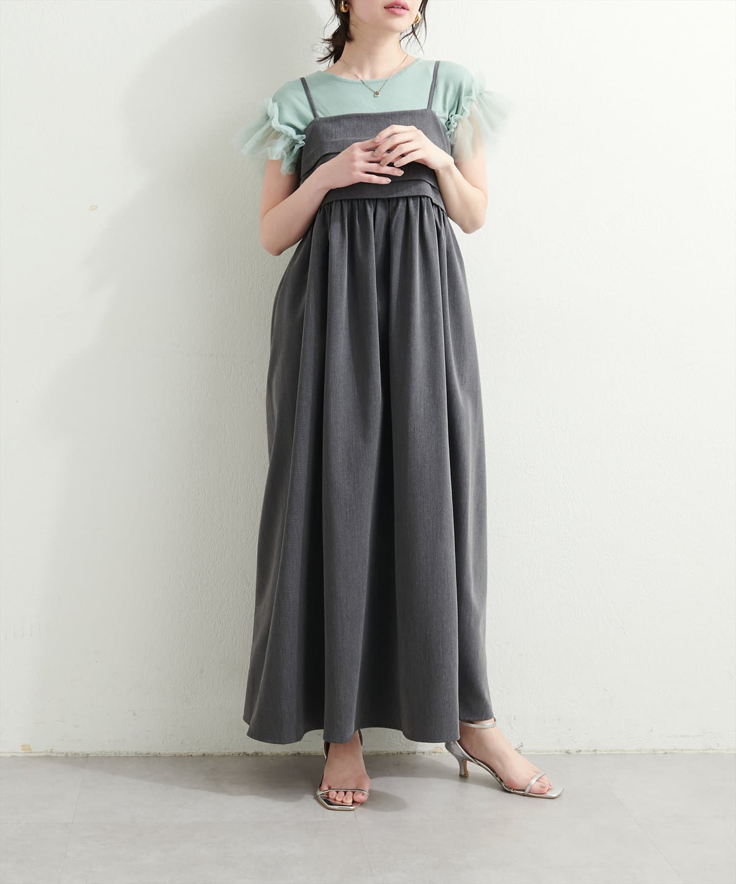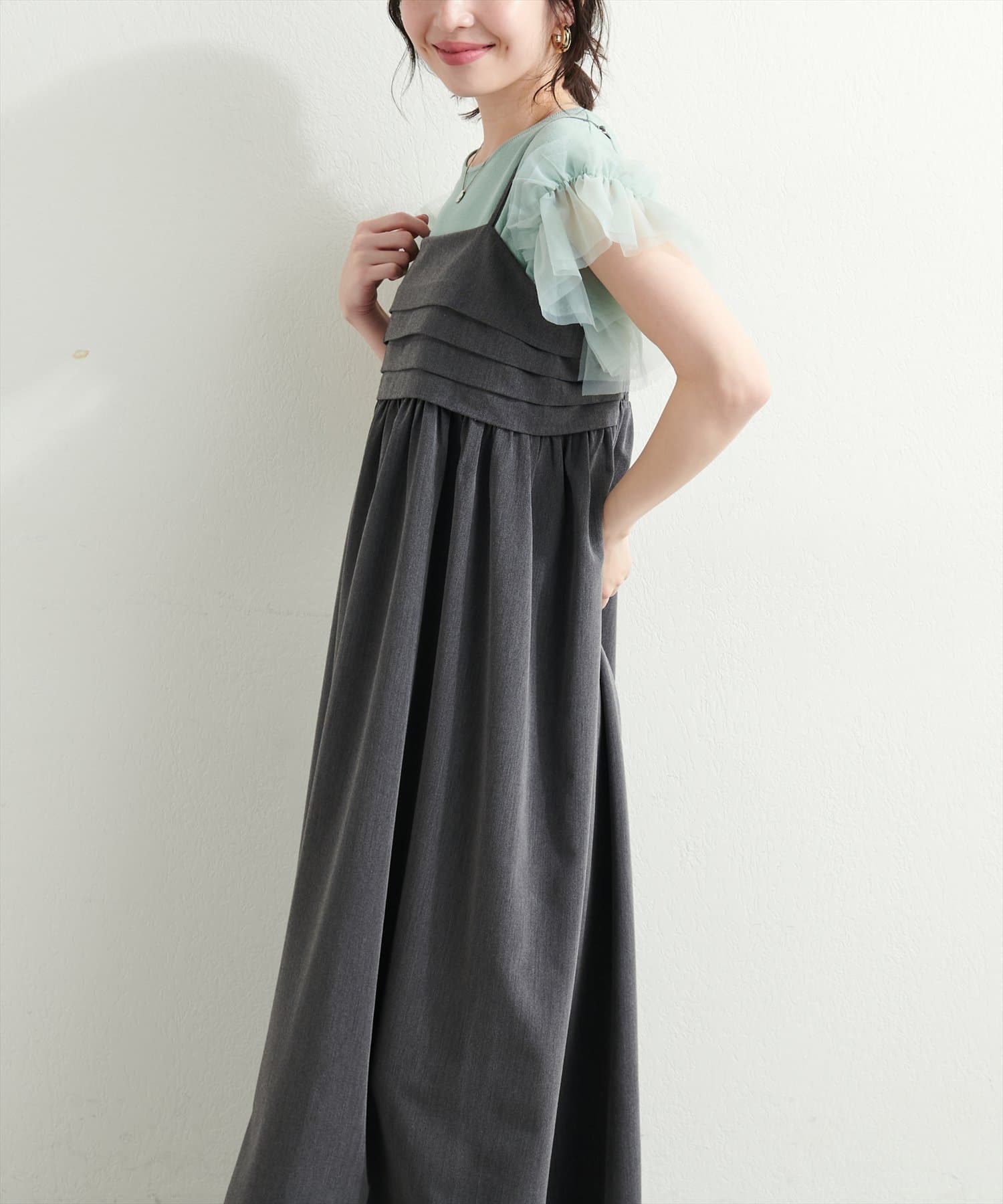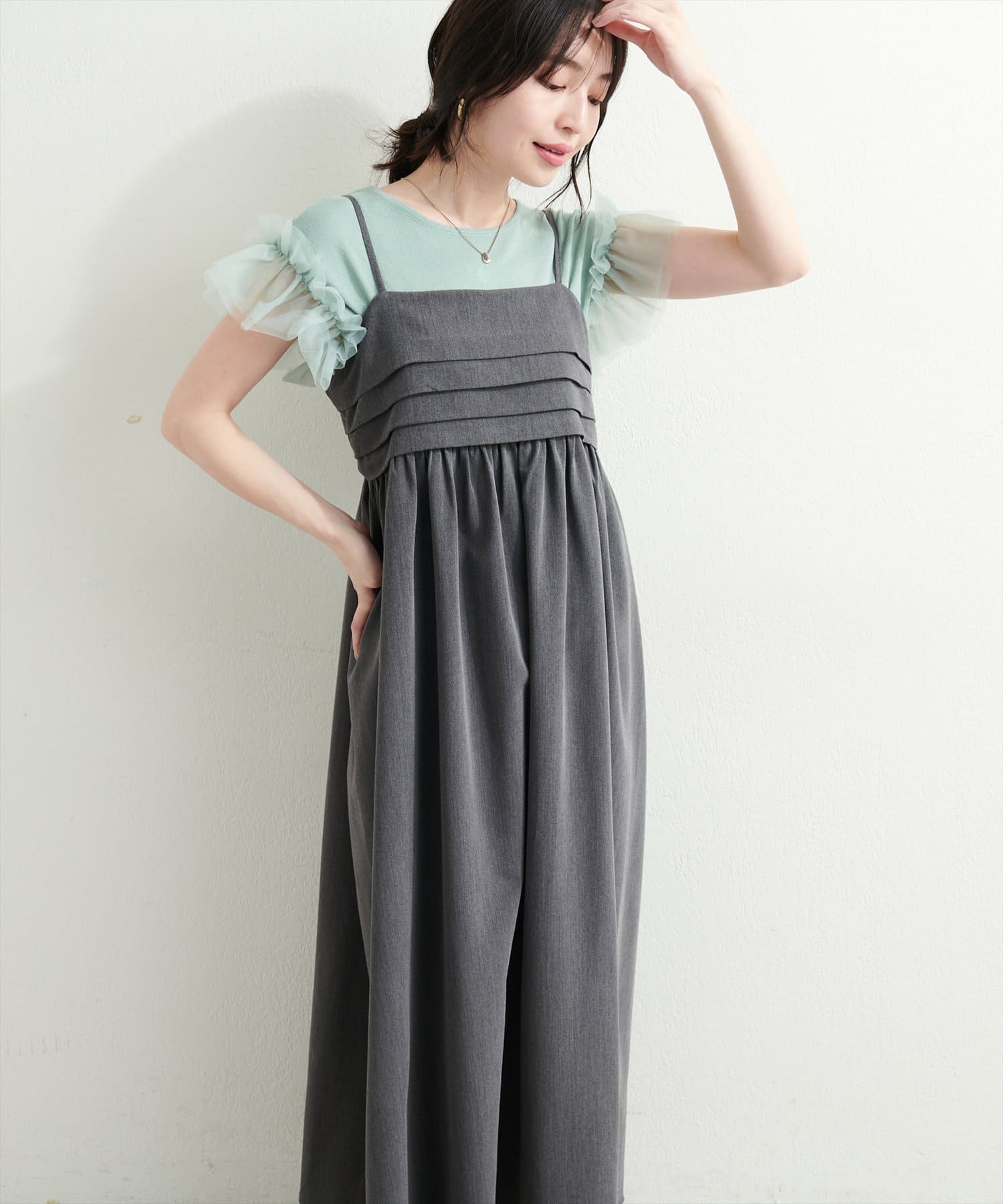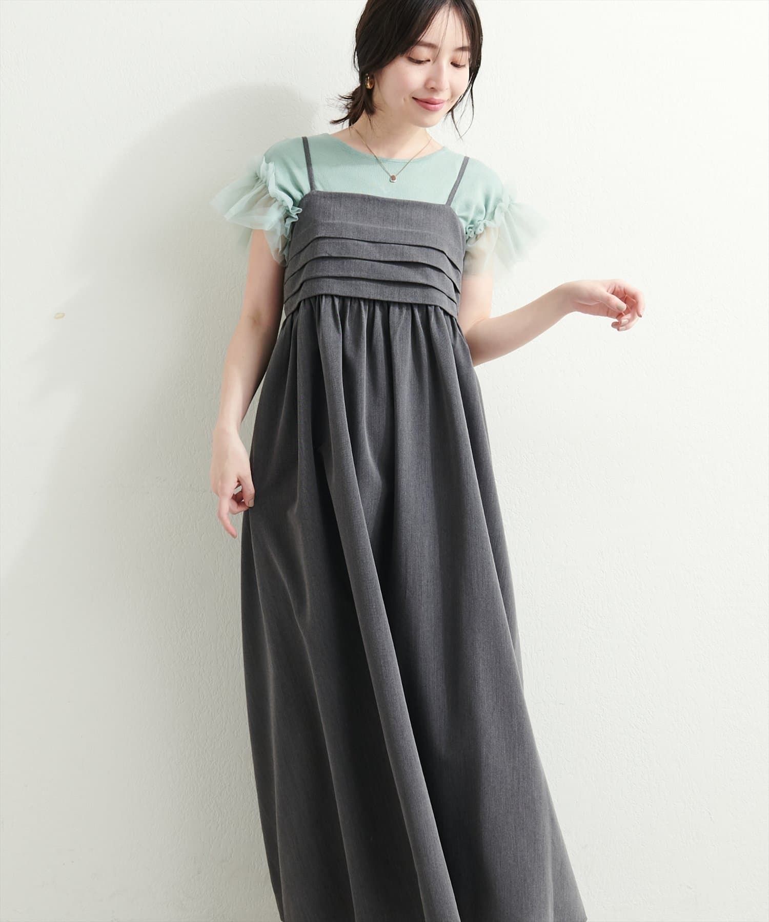 胸元のタックデザインがポイントのキャミワンピース。
