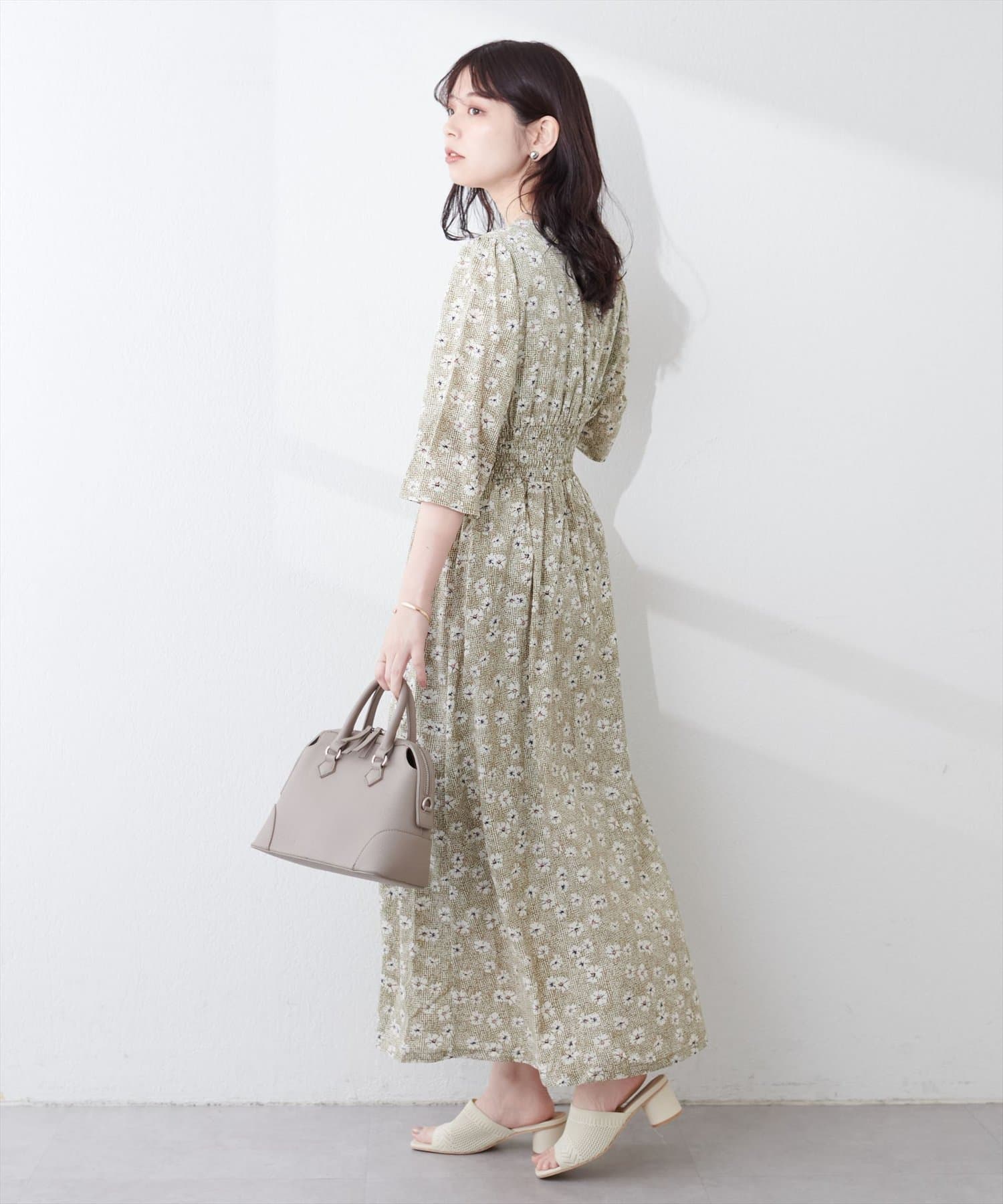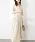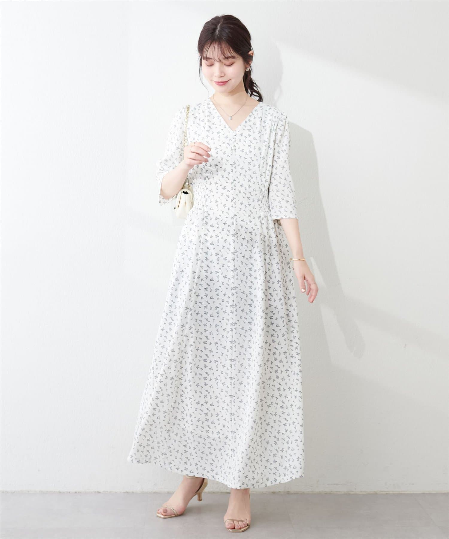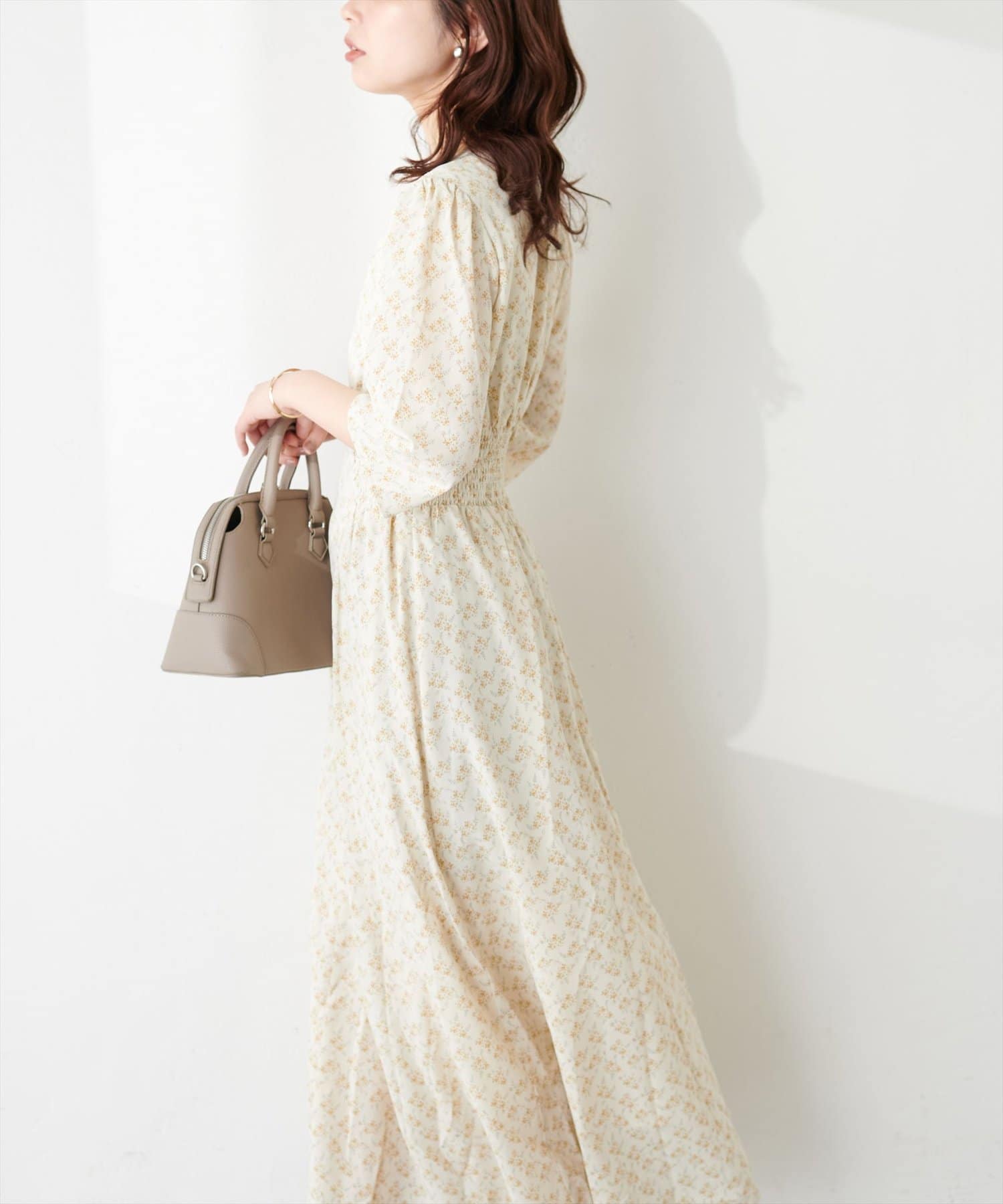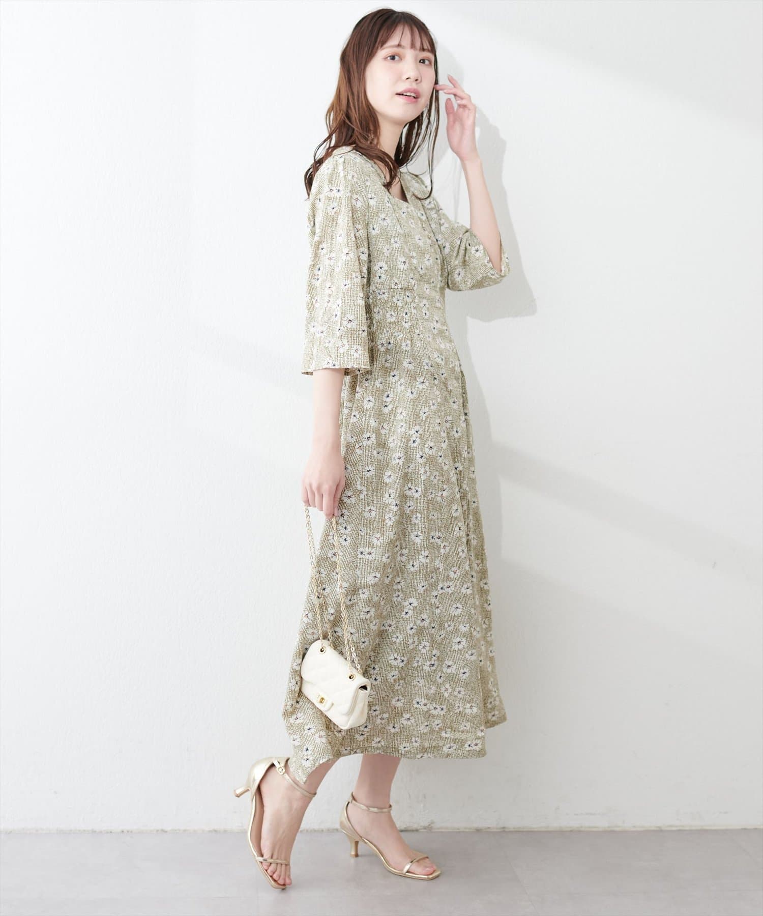 やや高めのウエストラインから緩やかに流れる美シルエットラインが魅力のワンピース。