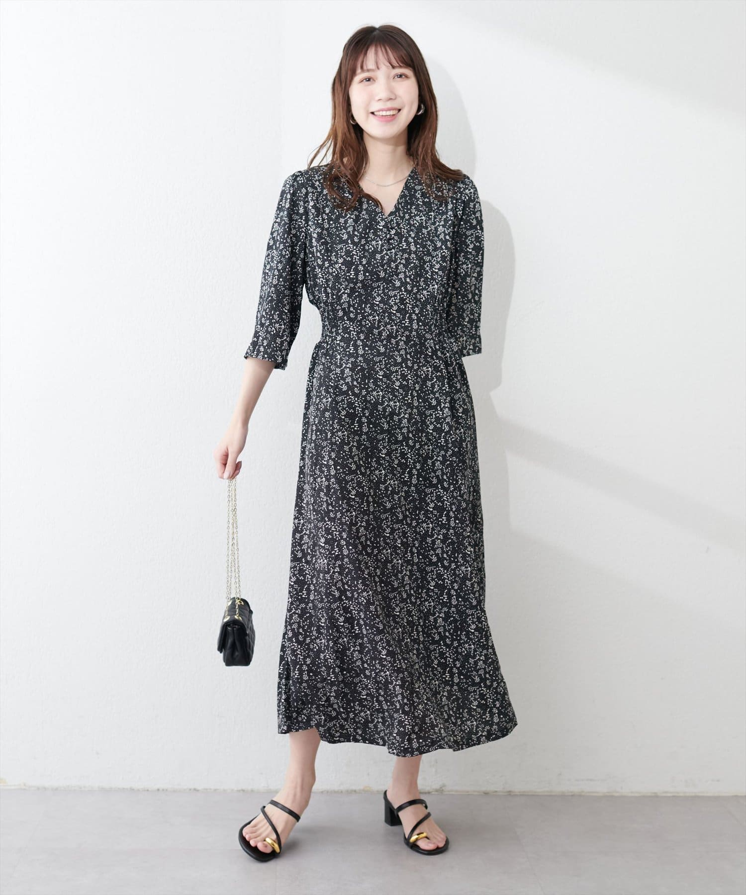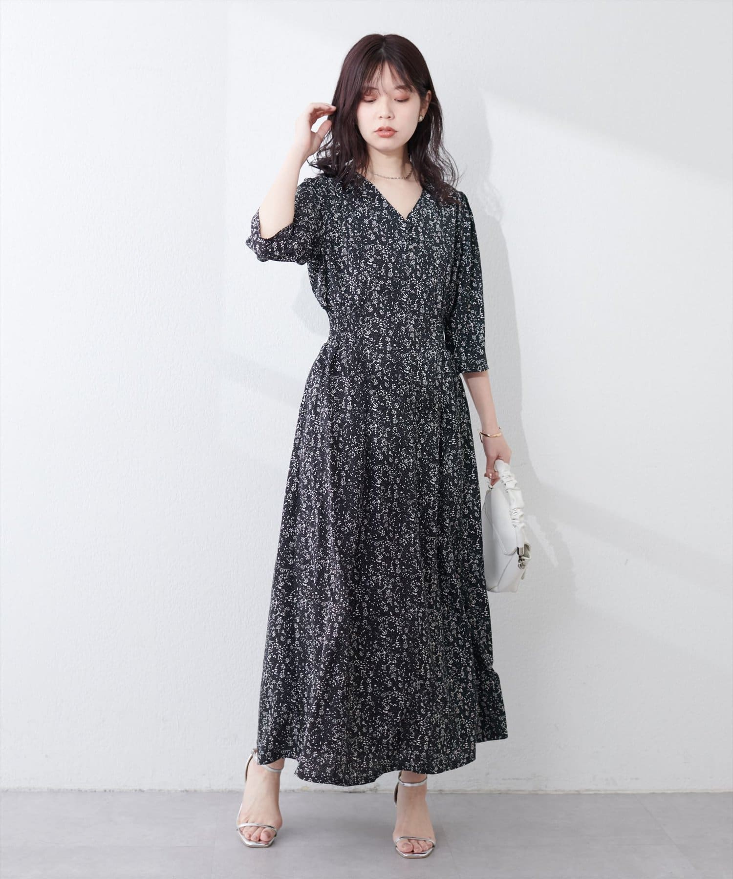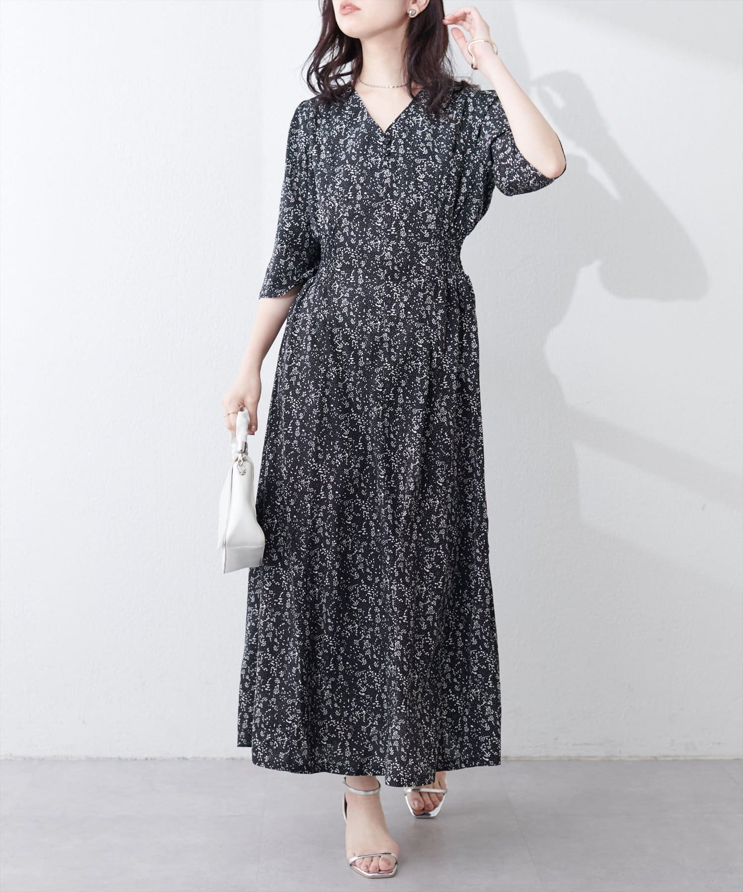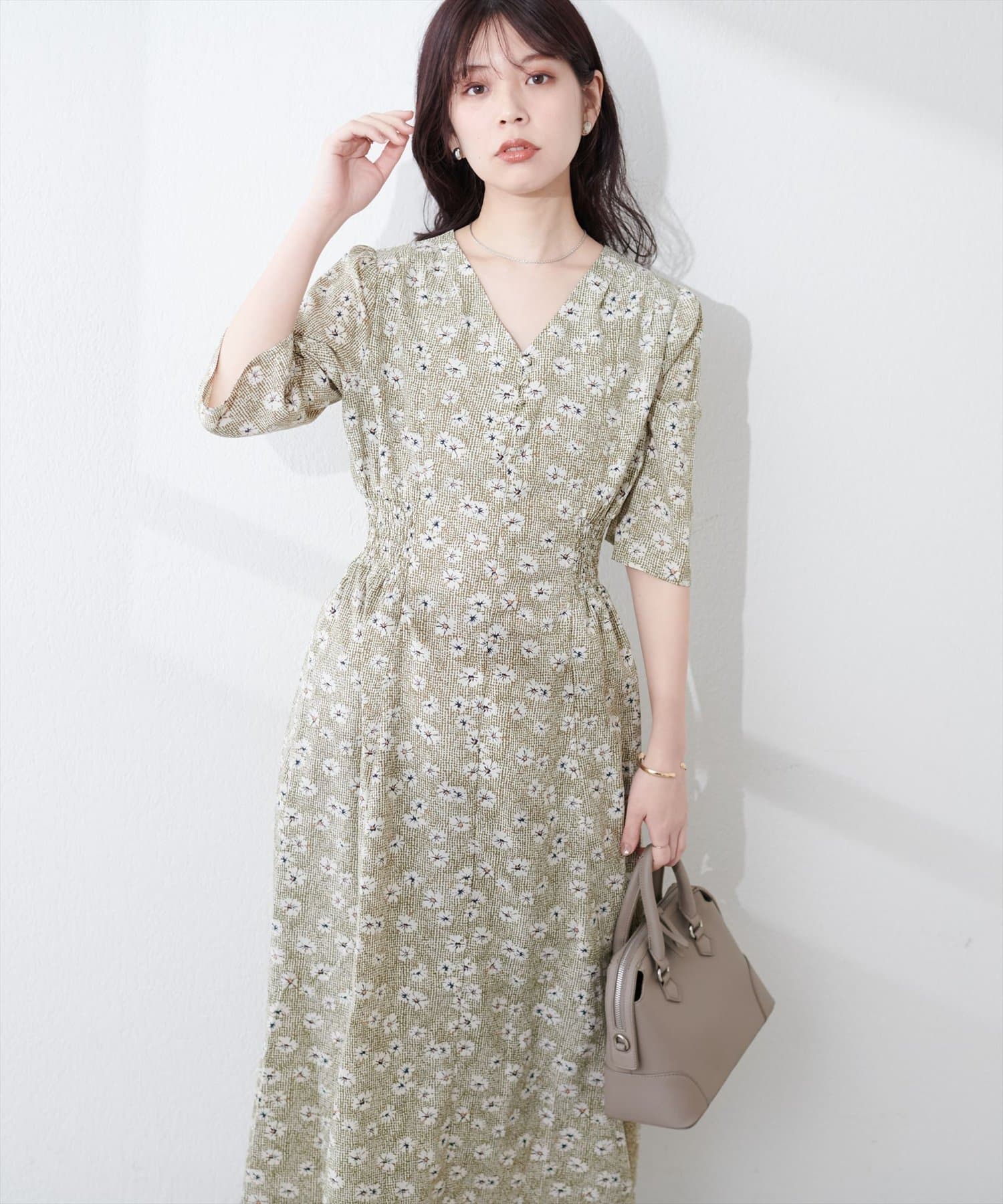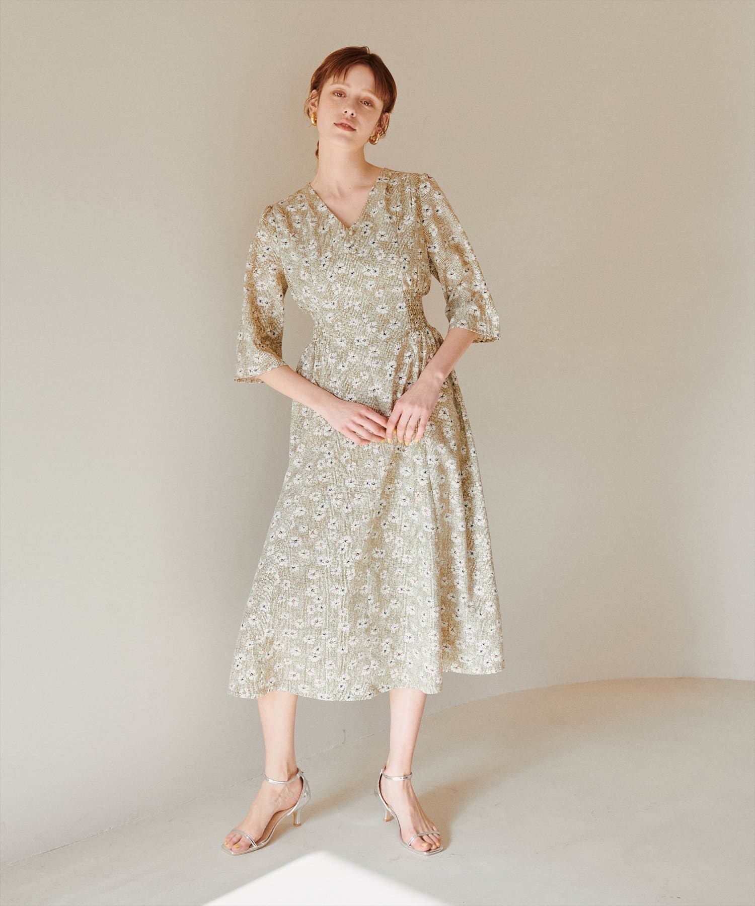 やや高めのウエストラインから緩やかに流れる美シルエットラインが魅力のワンピース。