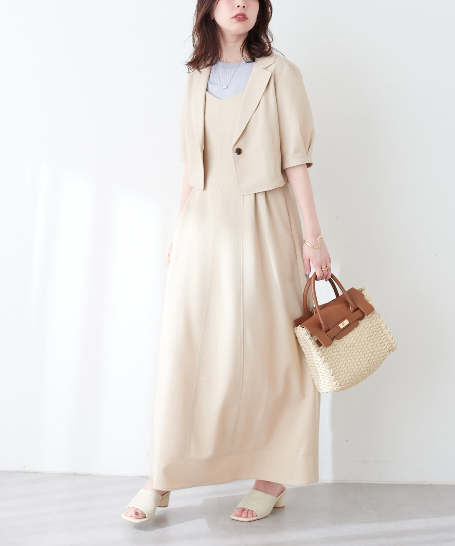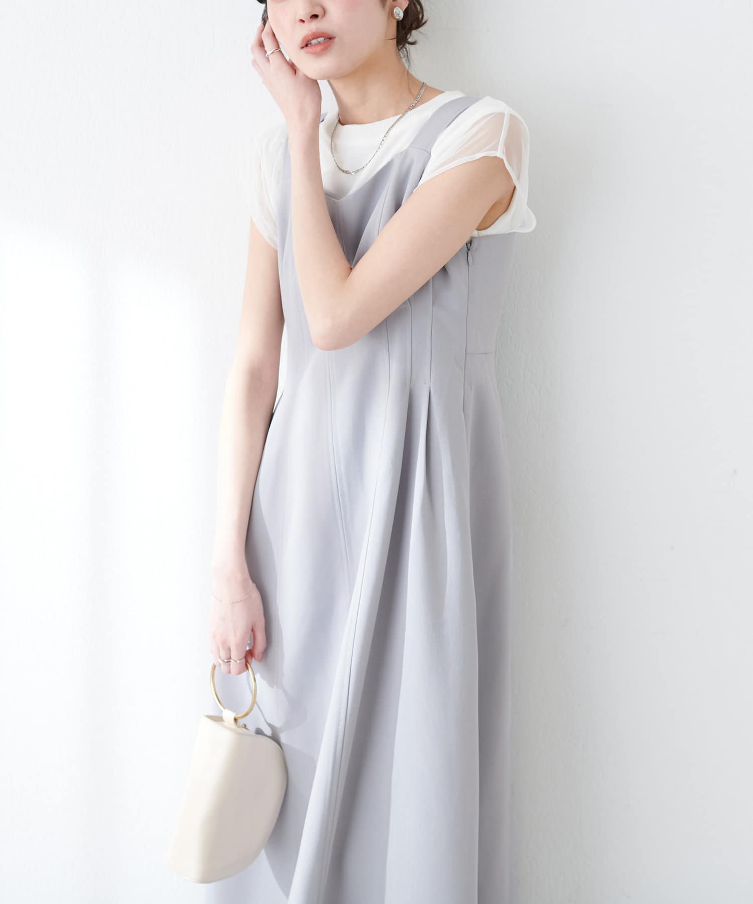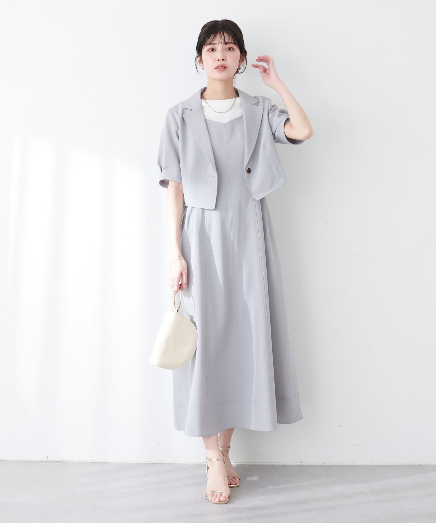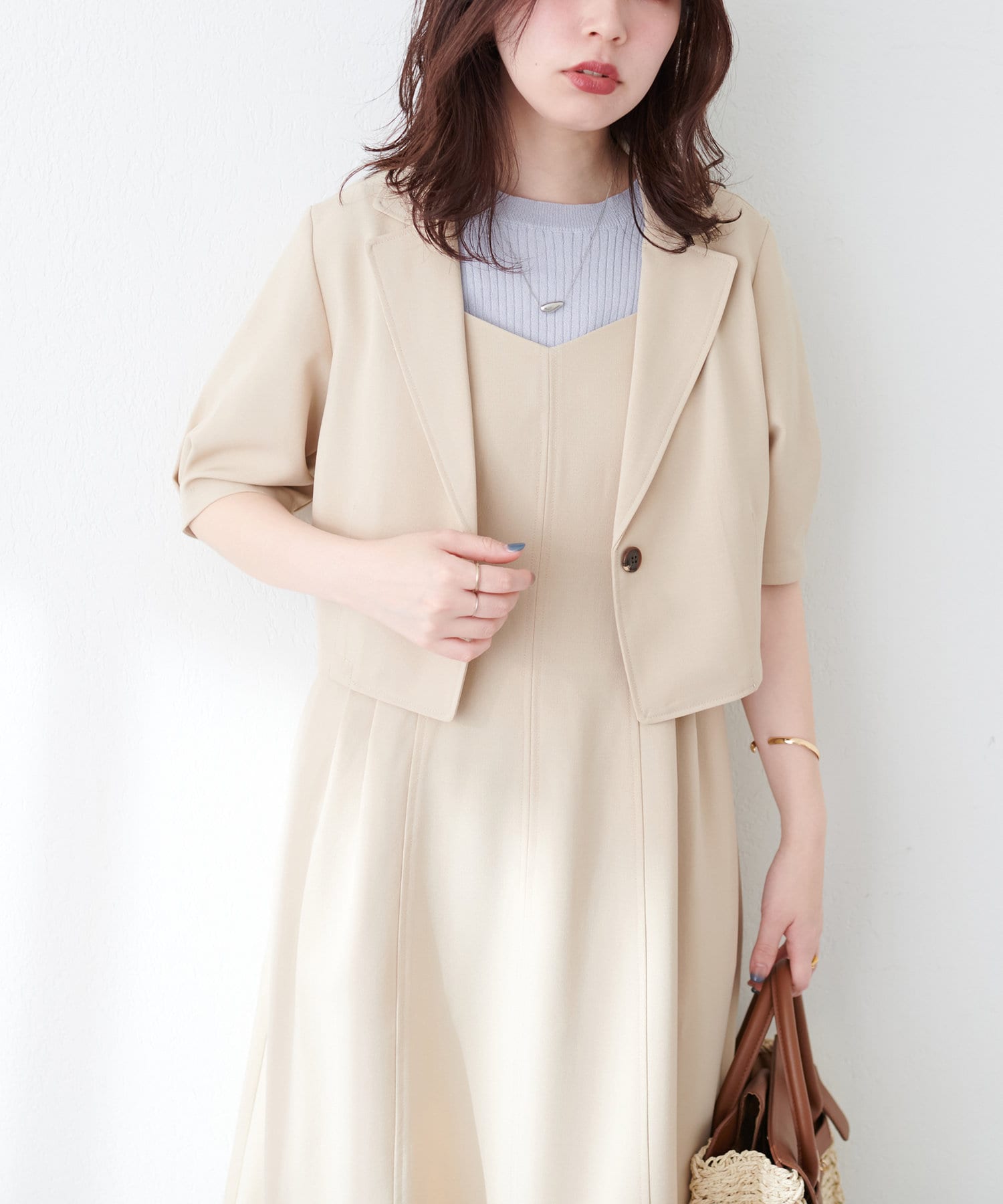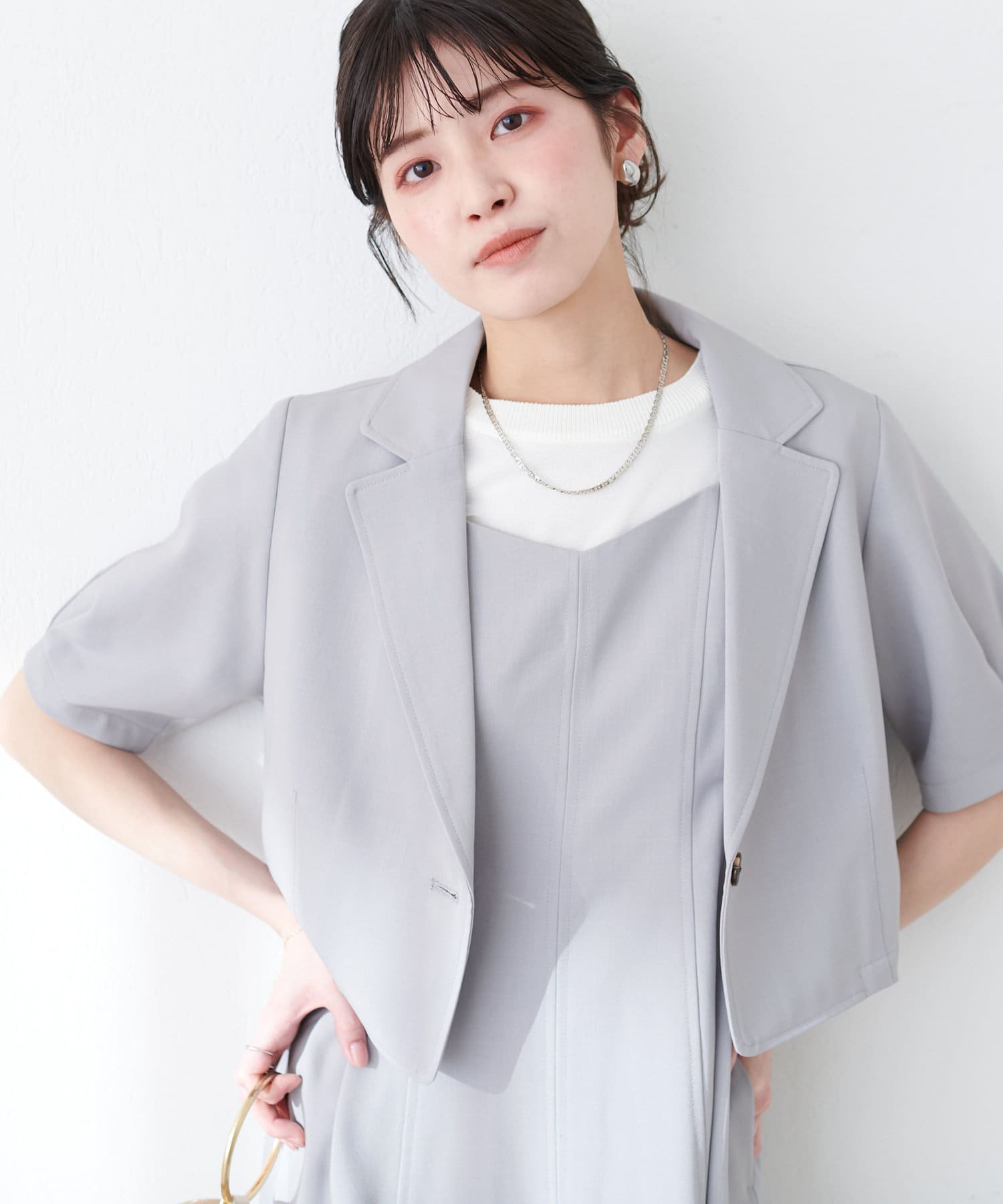 ワンピースはSETのジャケット以外に、旬のシアーカーデやシャツを羽織ったり、中にロゴTやシアーインナーを入れても◎