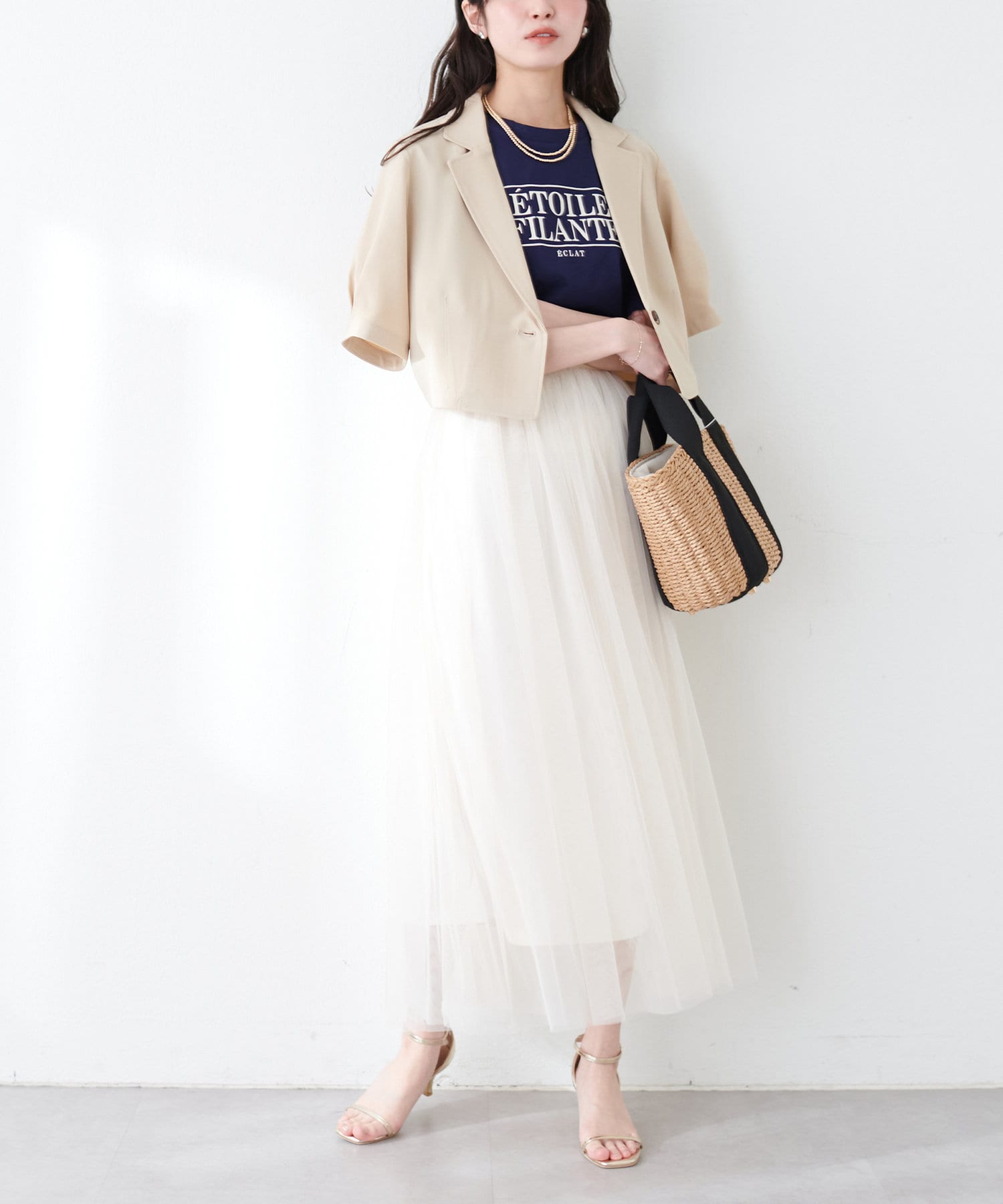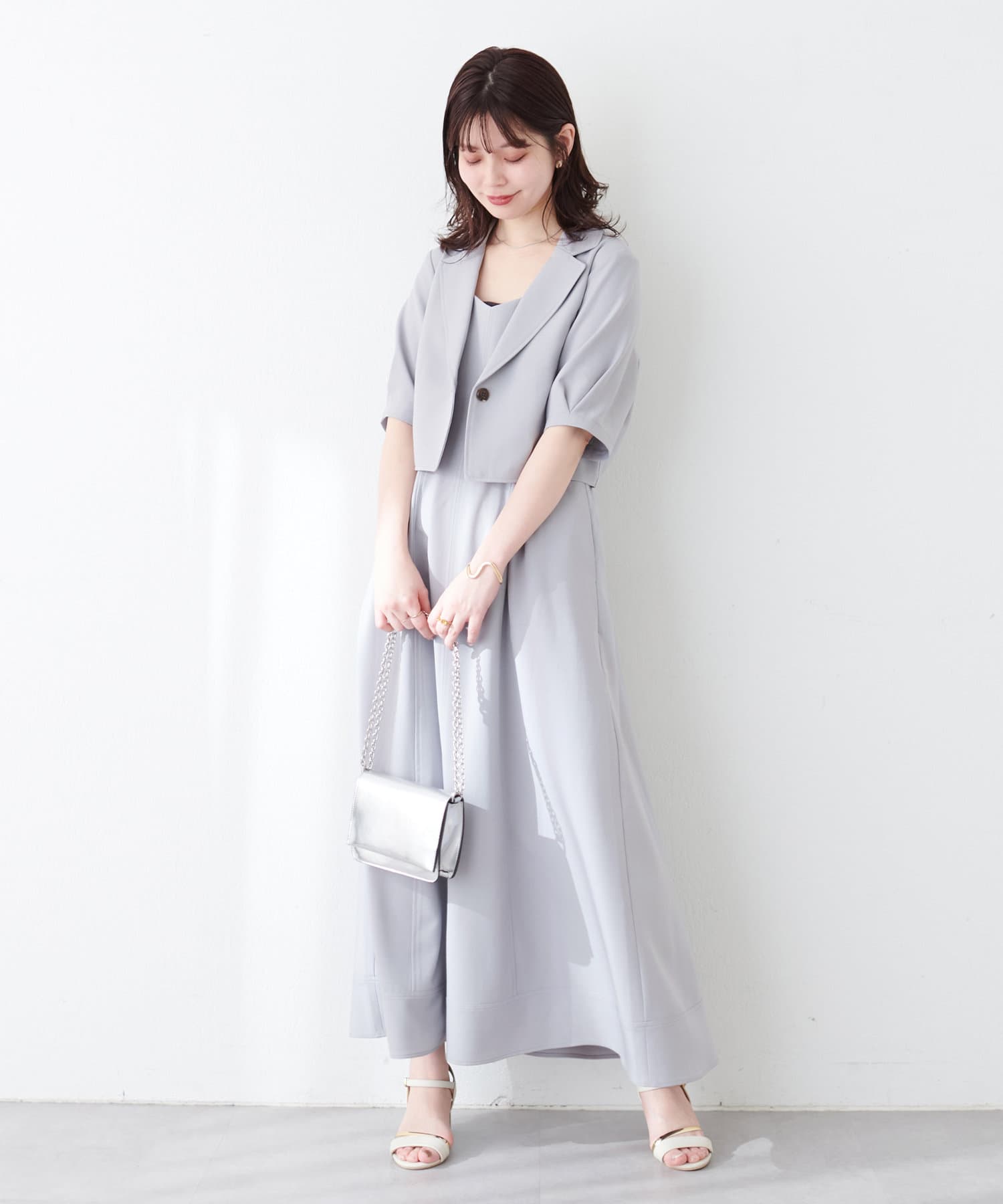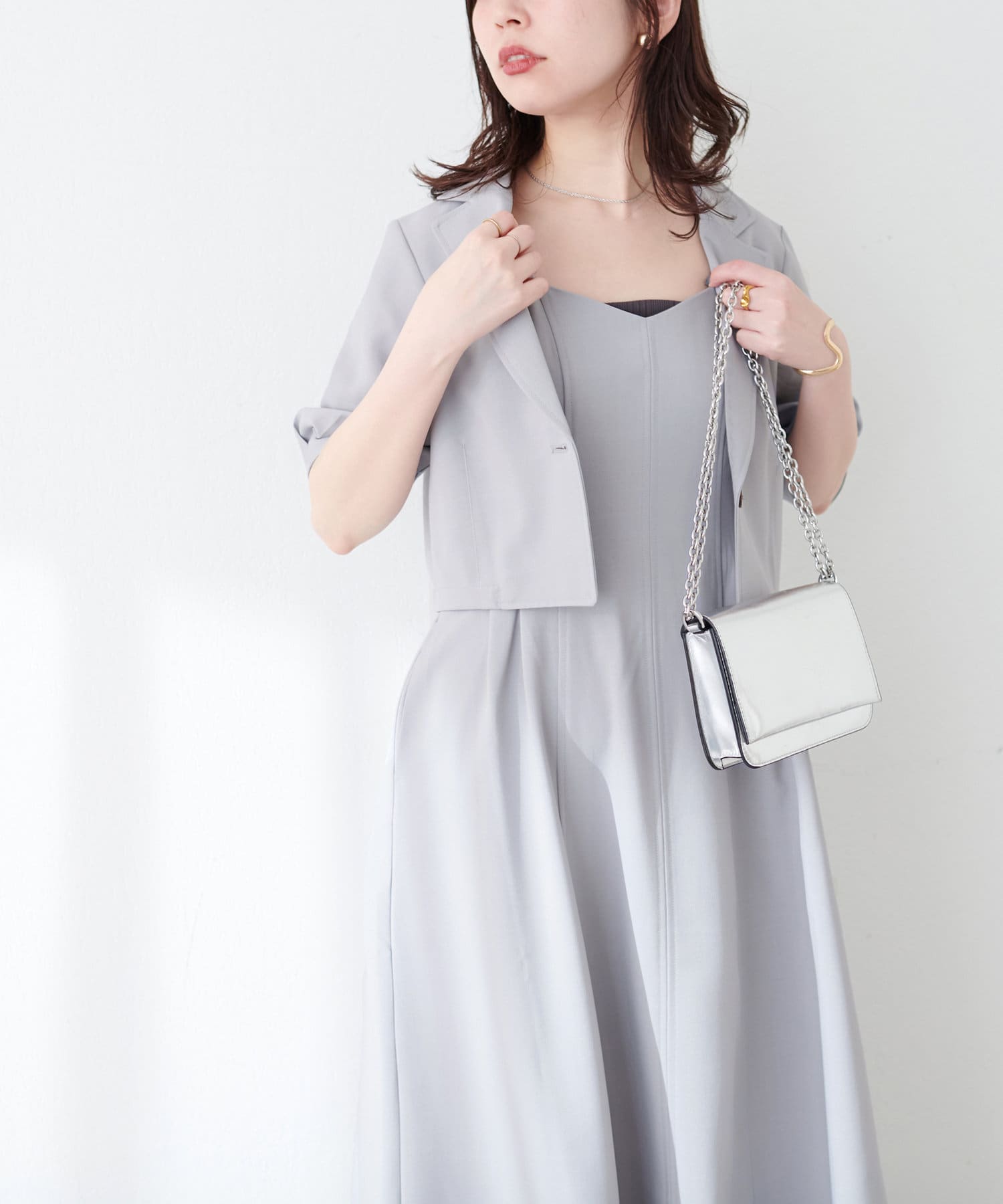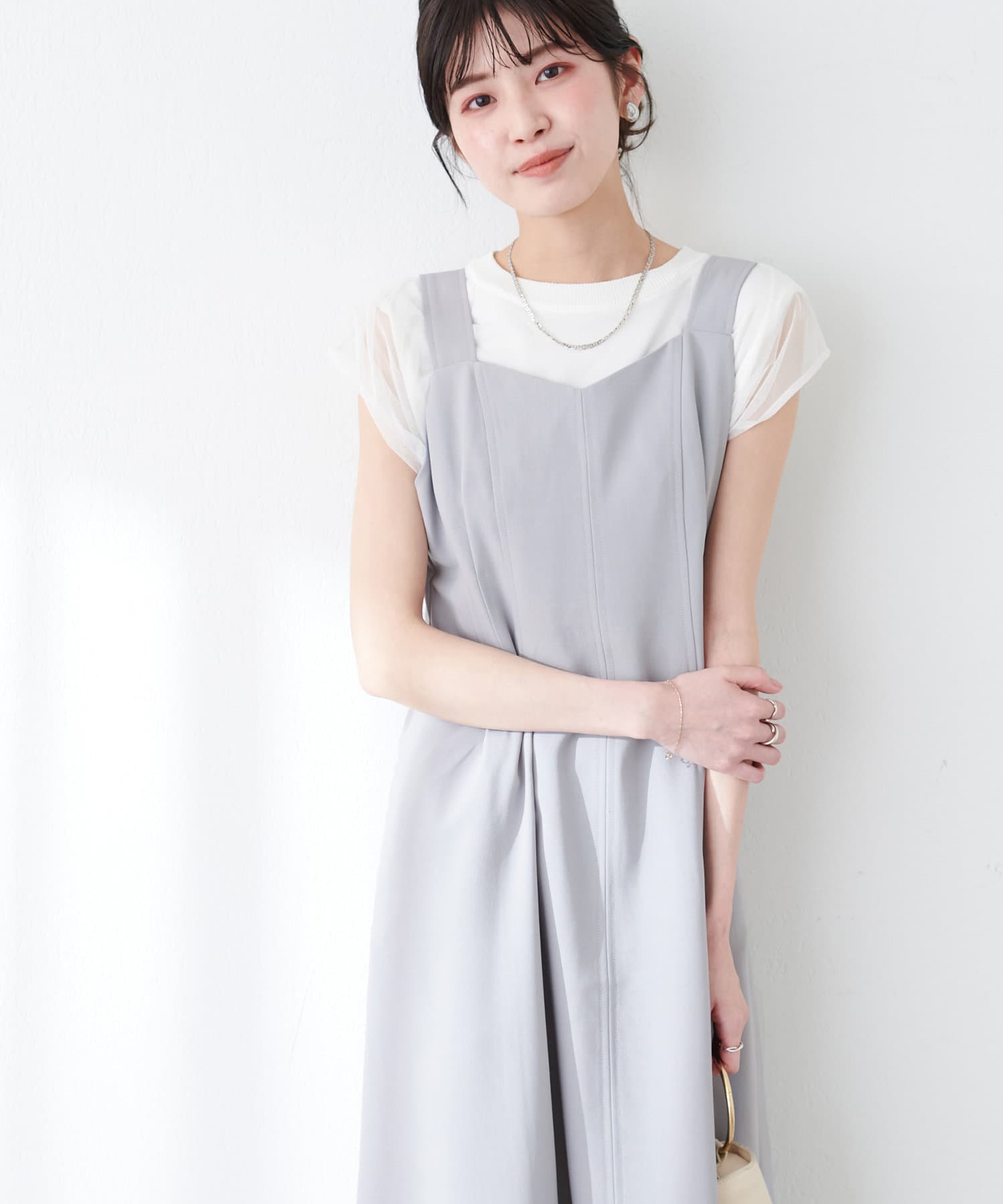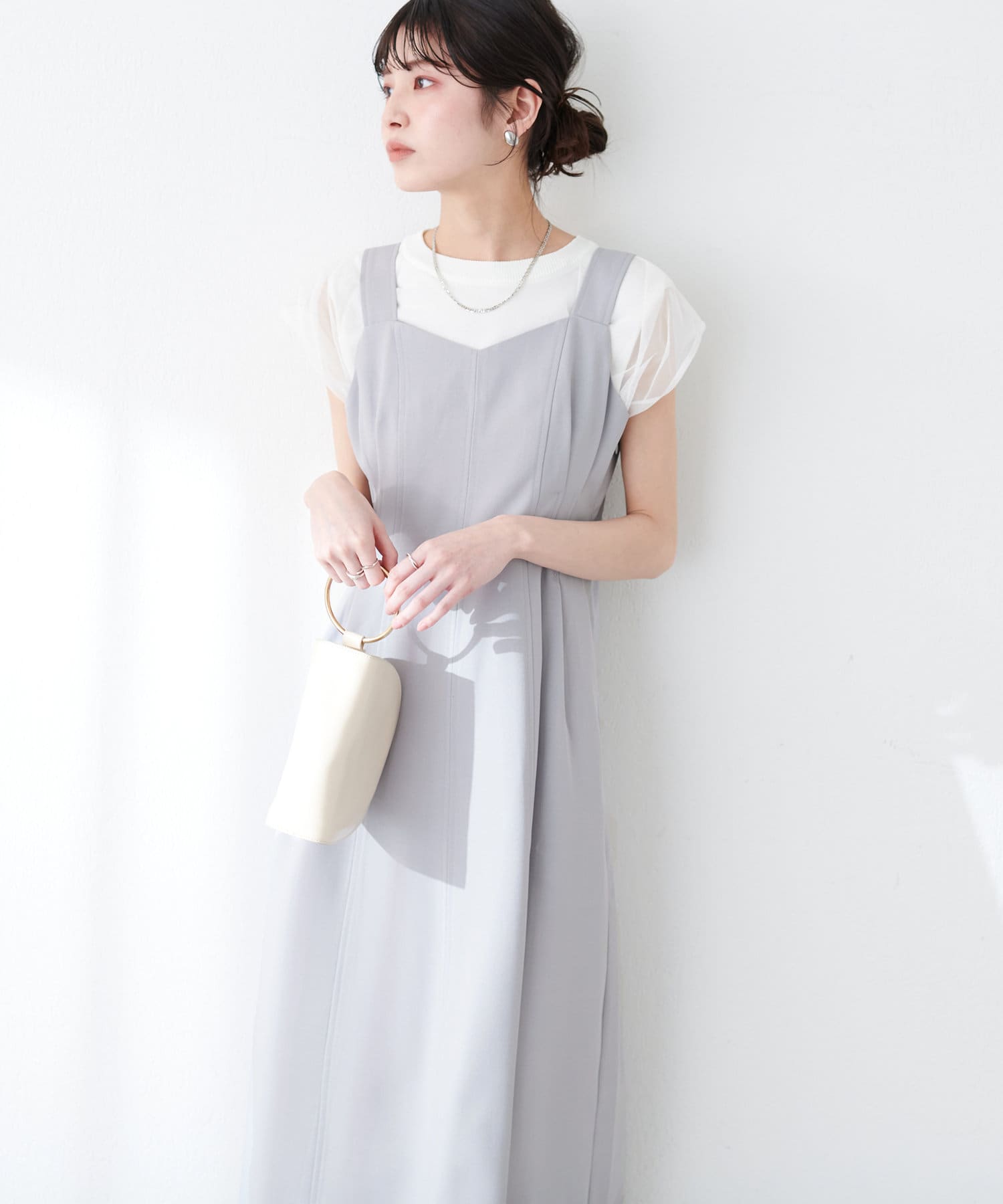ワンピースはSETのジャケット以外に、旬のシアーカーデやシャツを羽織ったり、中にロゴTやシアーインナーを入れても◎