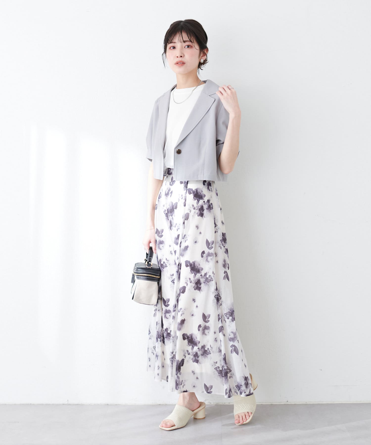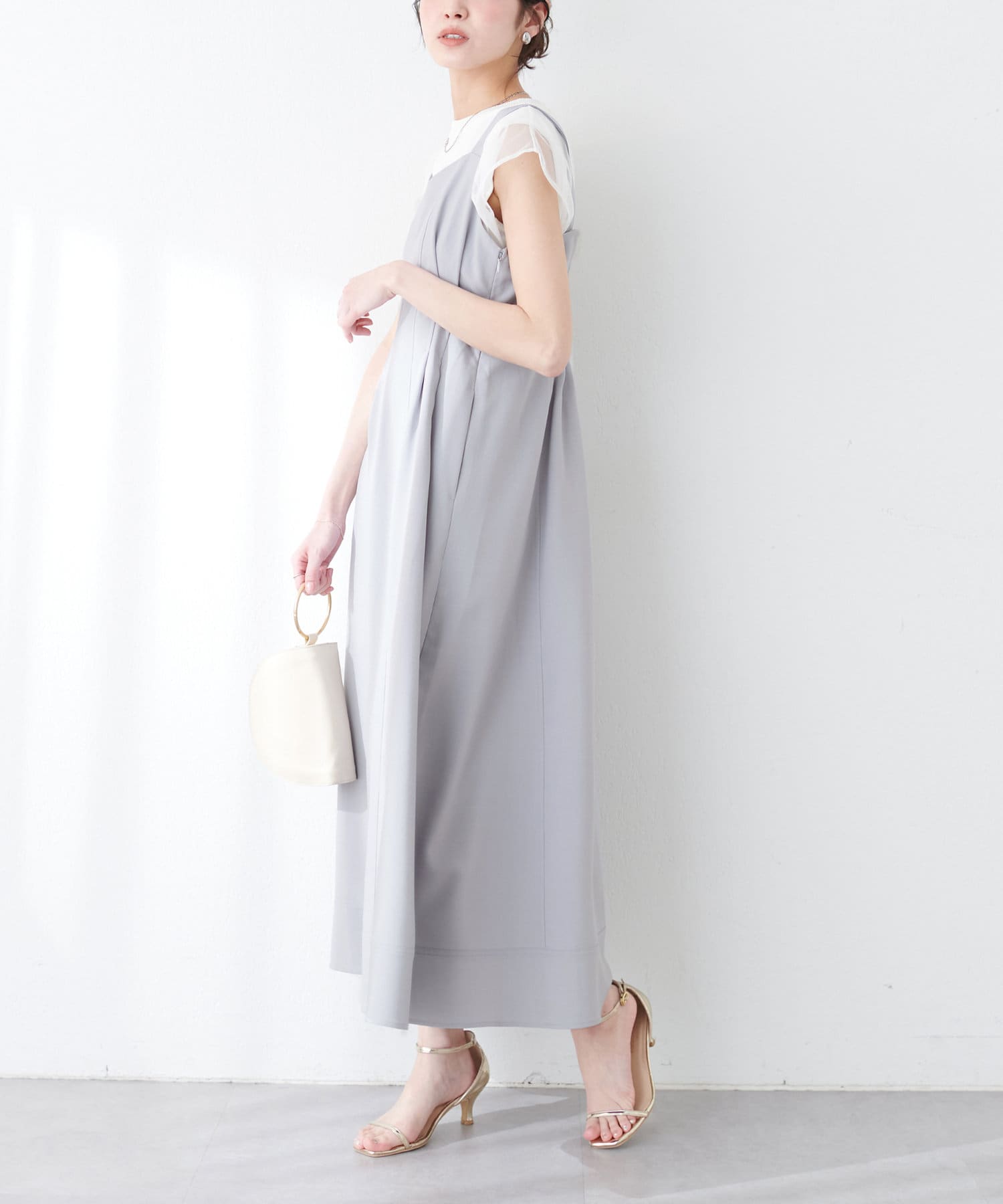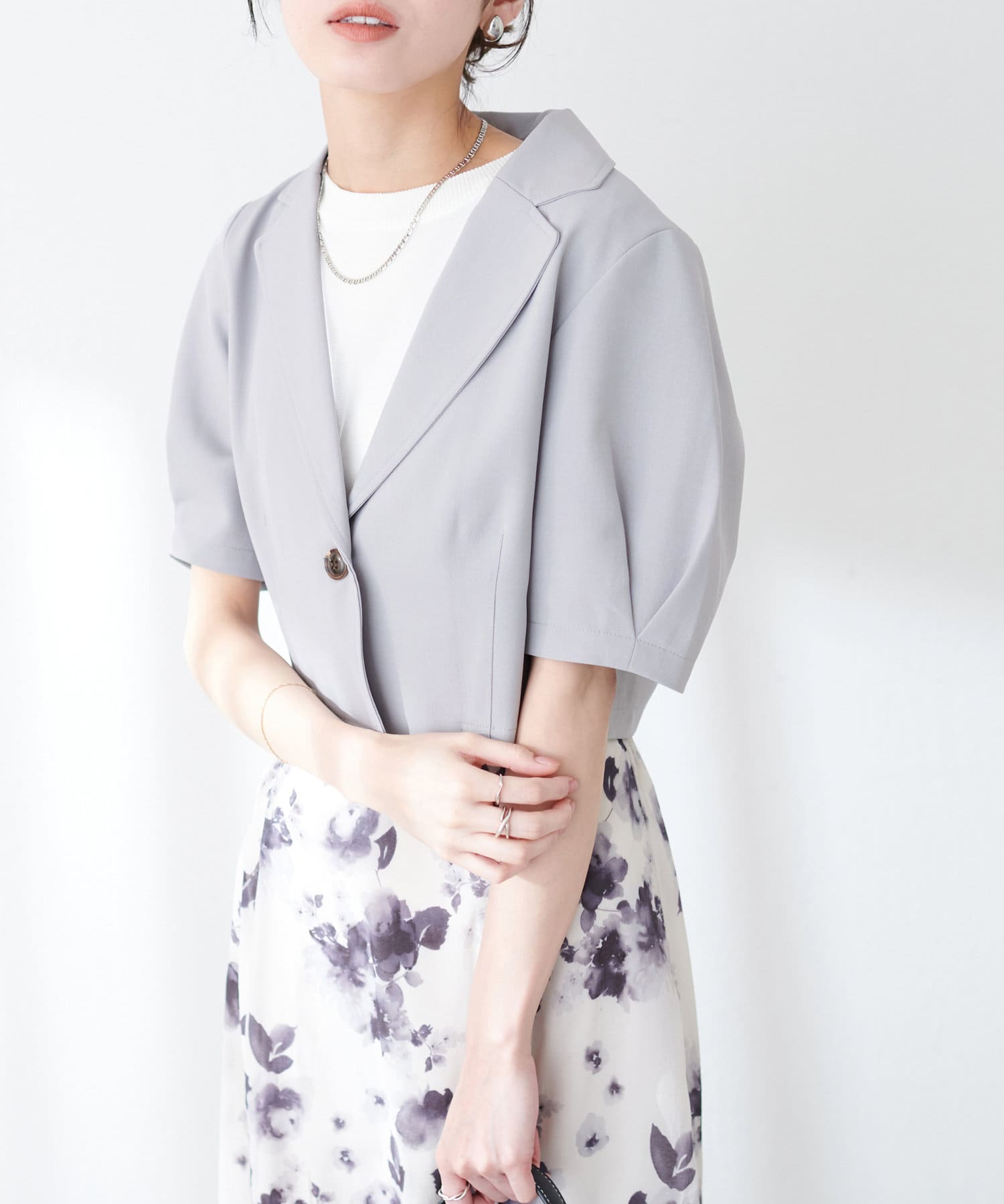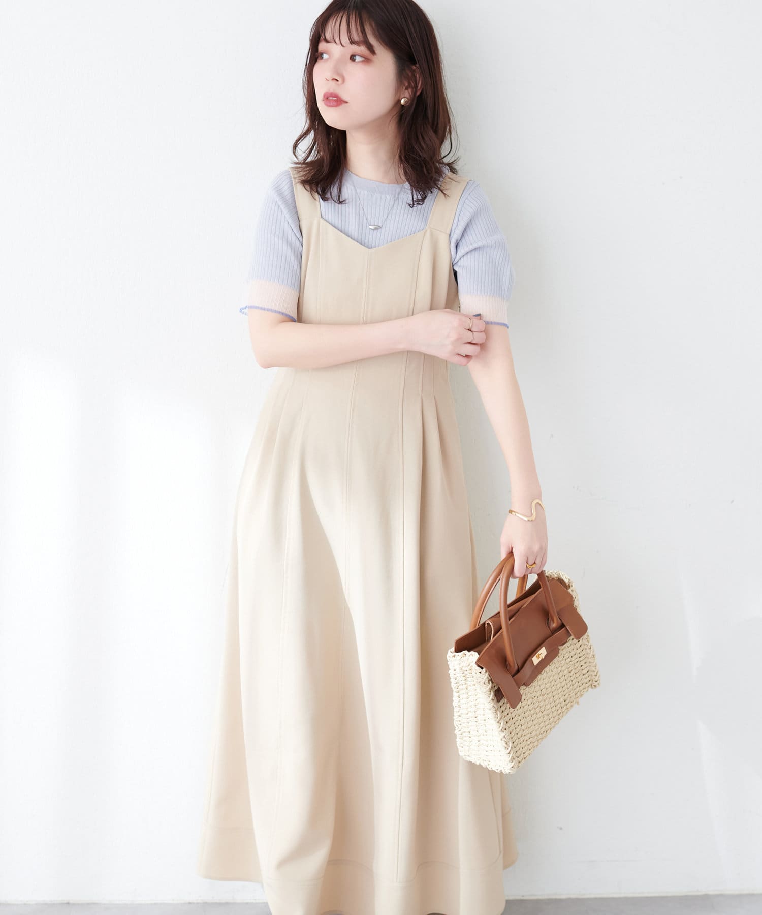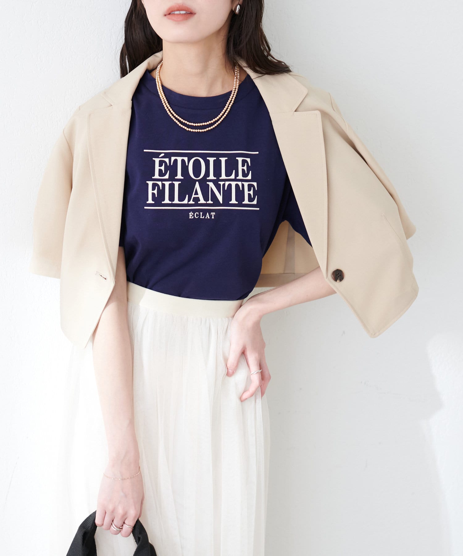 ワンピースはSETのジャケット以外に、旬のシアーカーデやシャツを羽織ったり、中にロゴTやシアーインナーを入れても◎