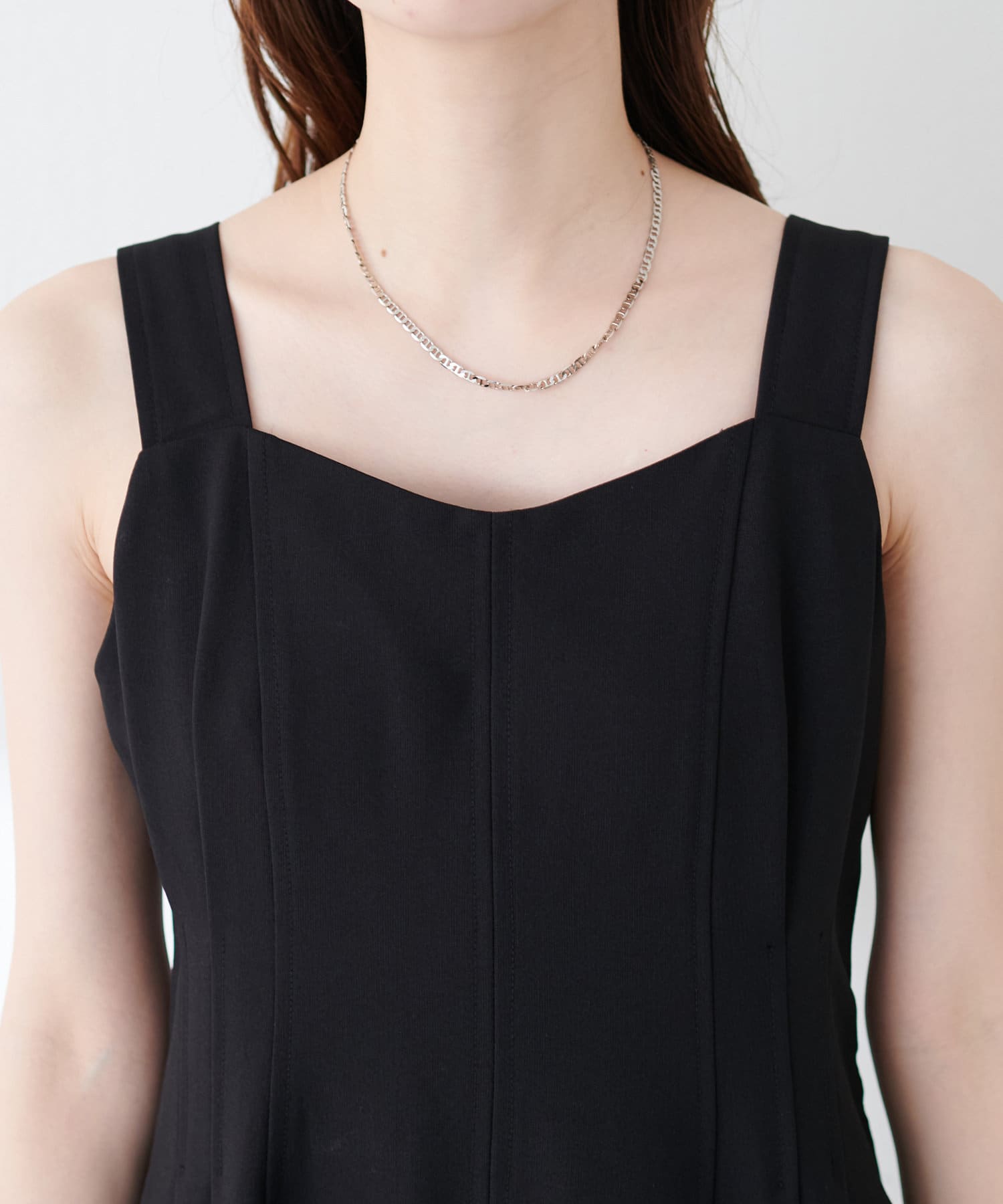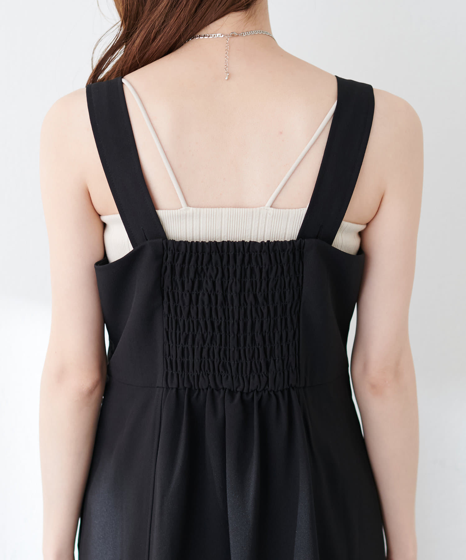 ワンピースの肩紐はボタンで調節可能です。左側にアジャスターが付いているので着脱も楽にして頂けます。