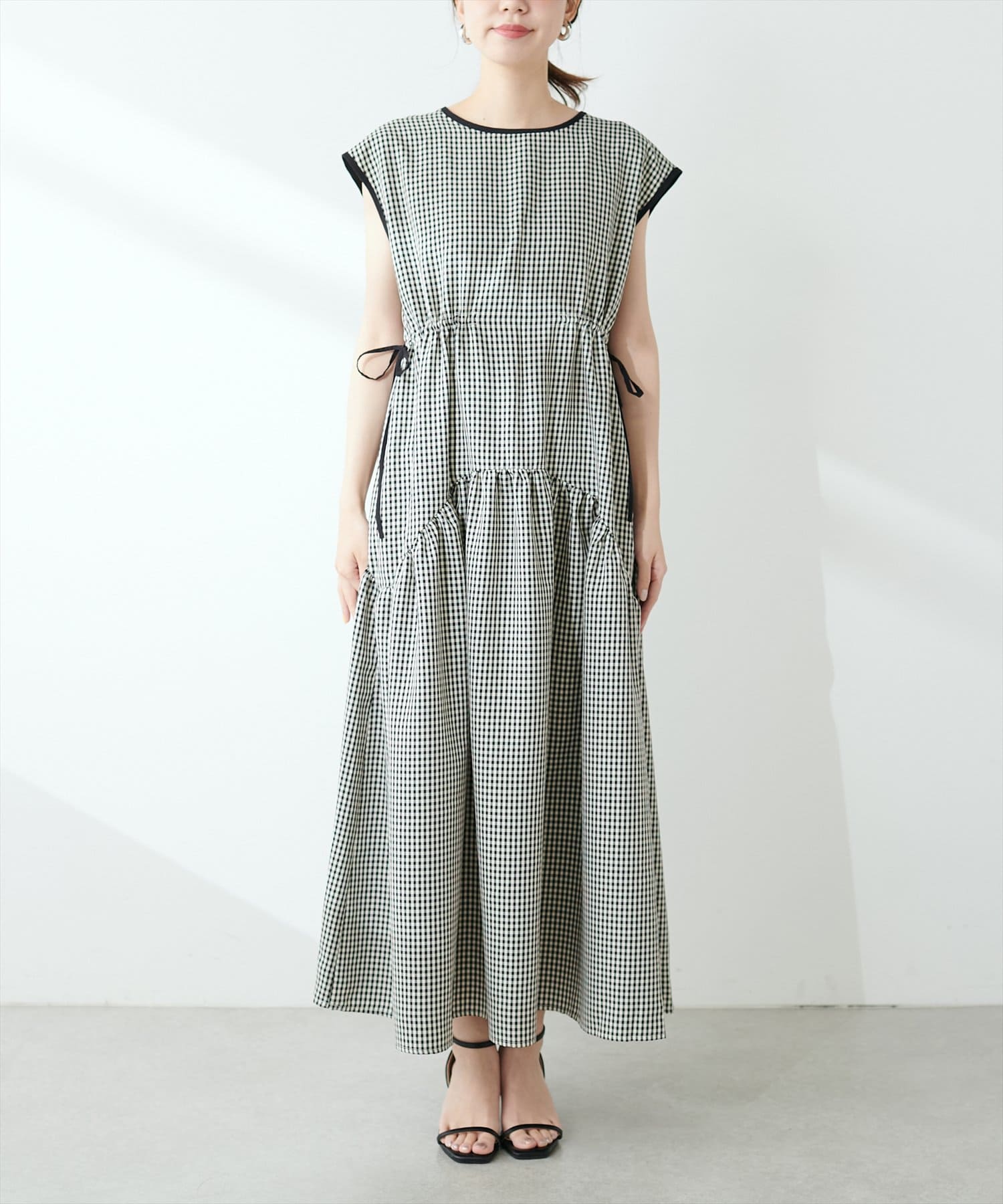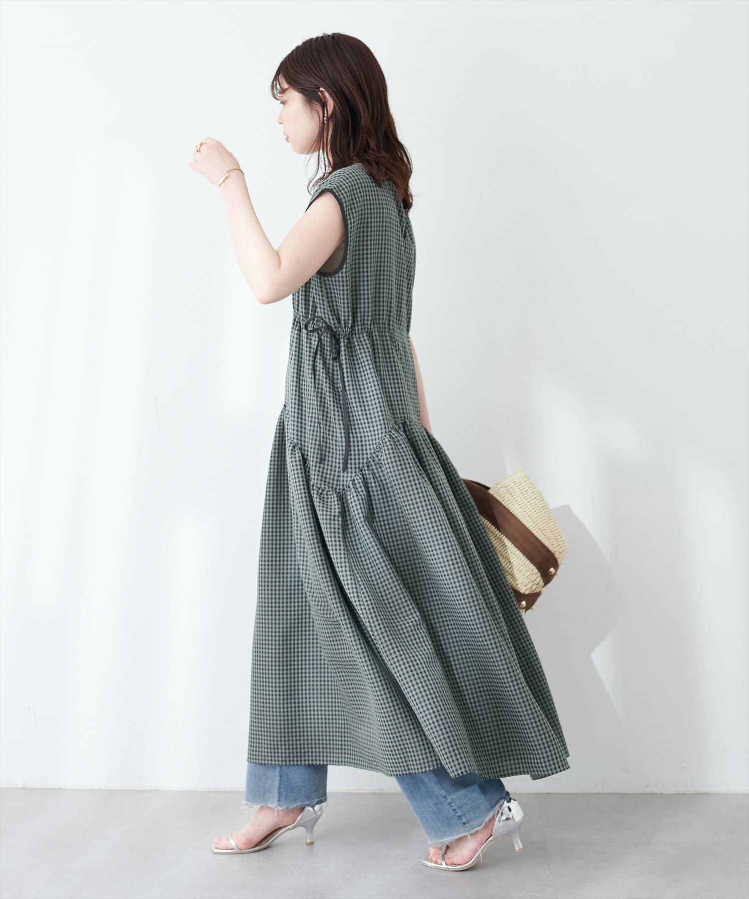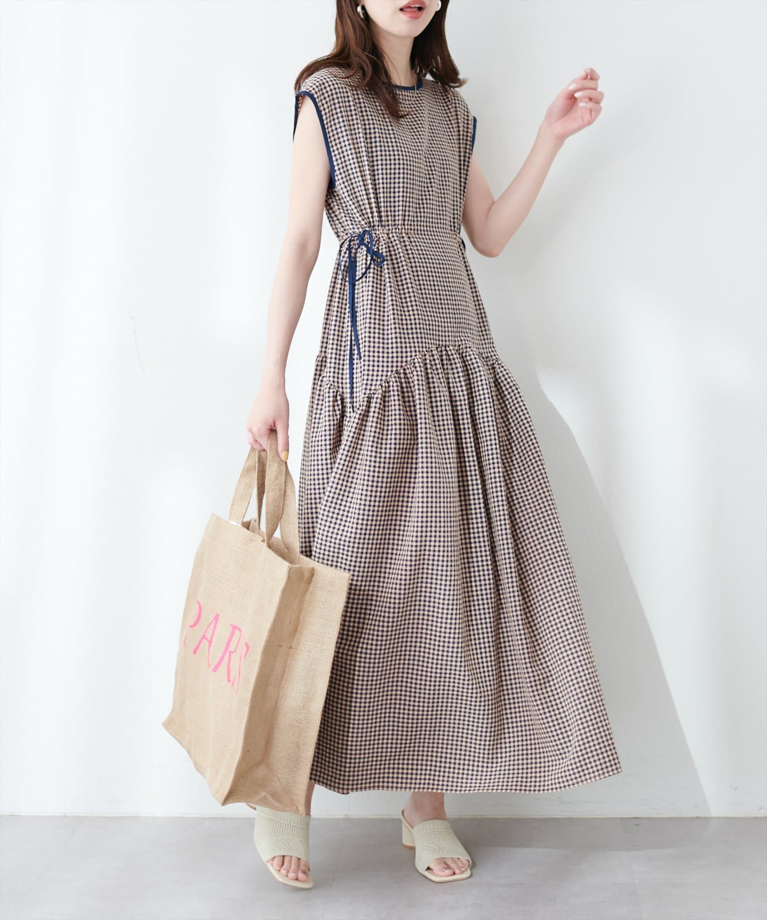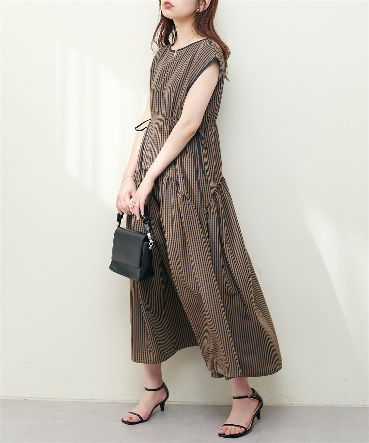 ウエストのドロストデザインがトレンドライクなノースリーブワンピース。