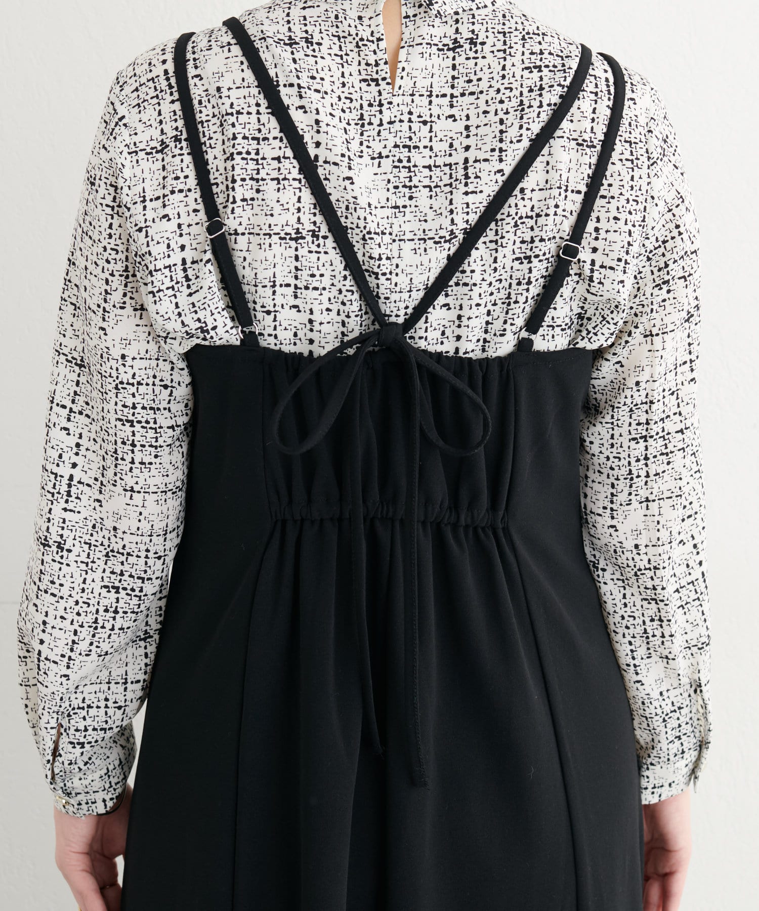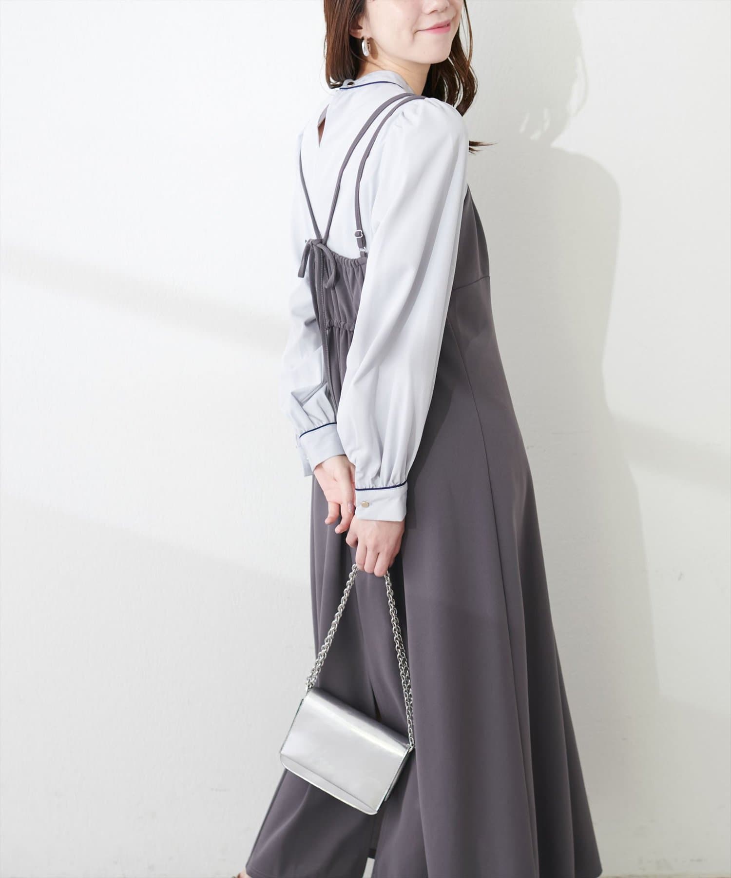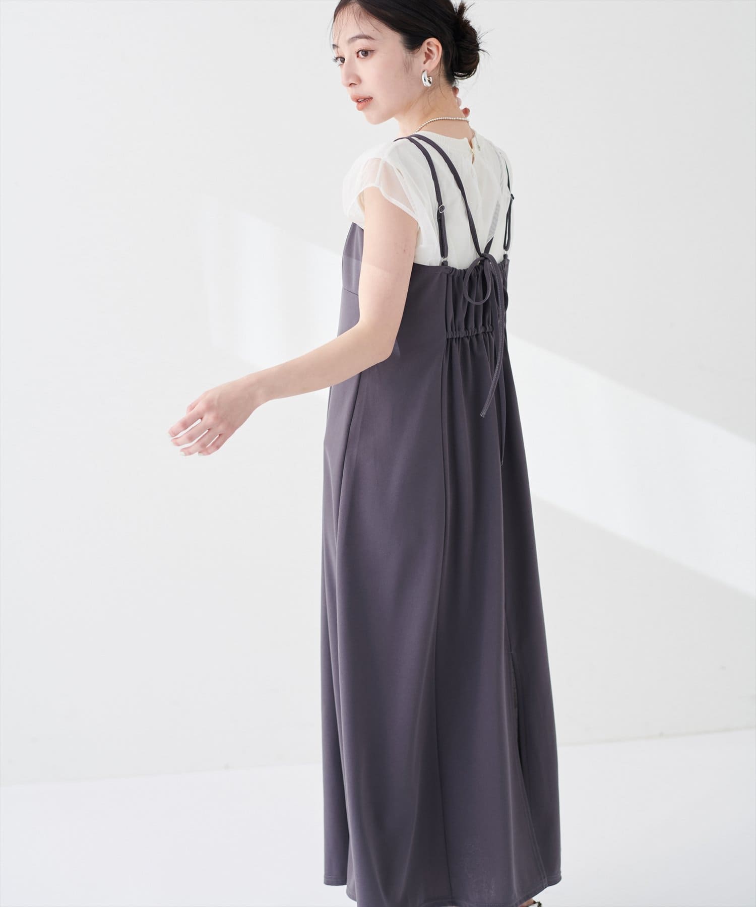 肩ヒモとリボンの2本使いで後ろ姿まで抜かりなく!アジャスターで着丈の調節もラクラクです。