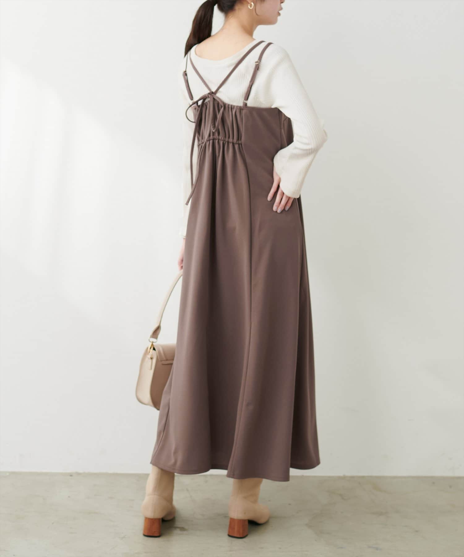 カットソーのような柔らかい素材感と風合いのキャミワンピース。