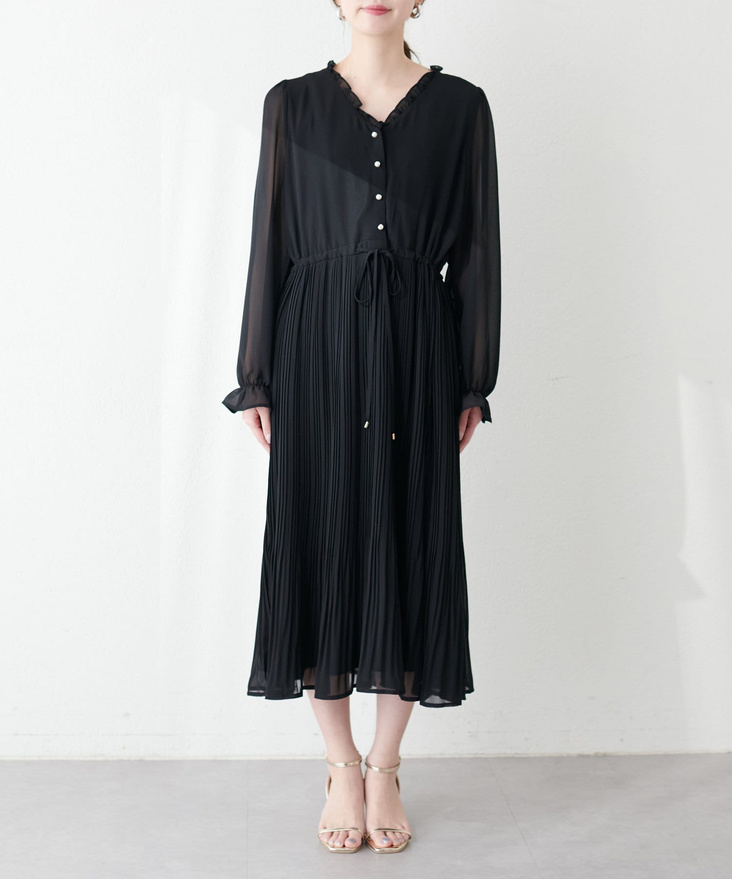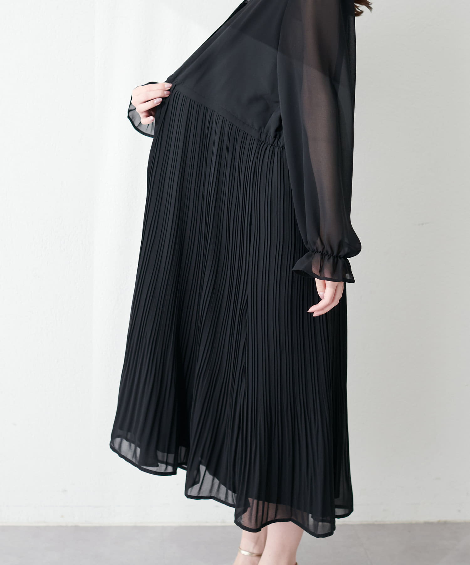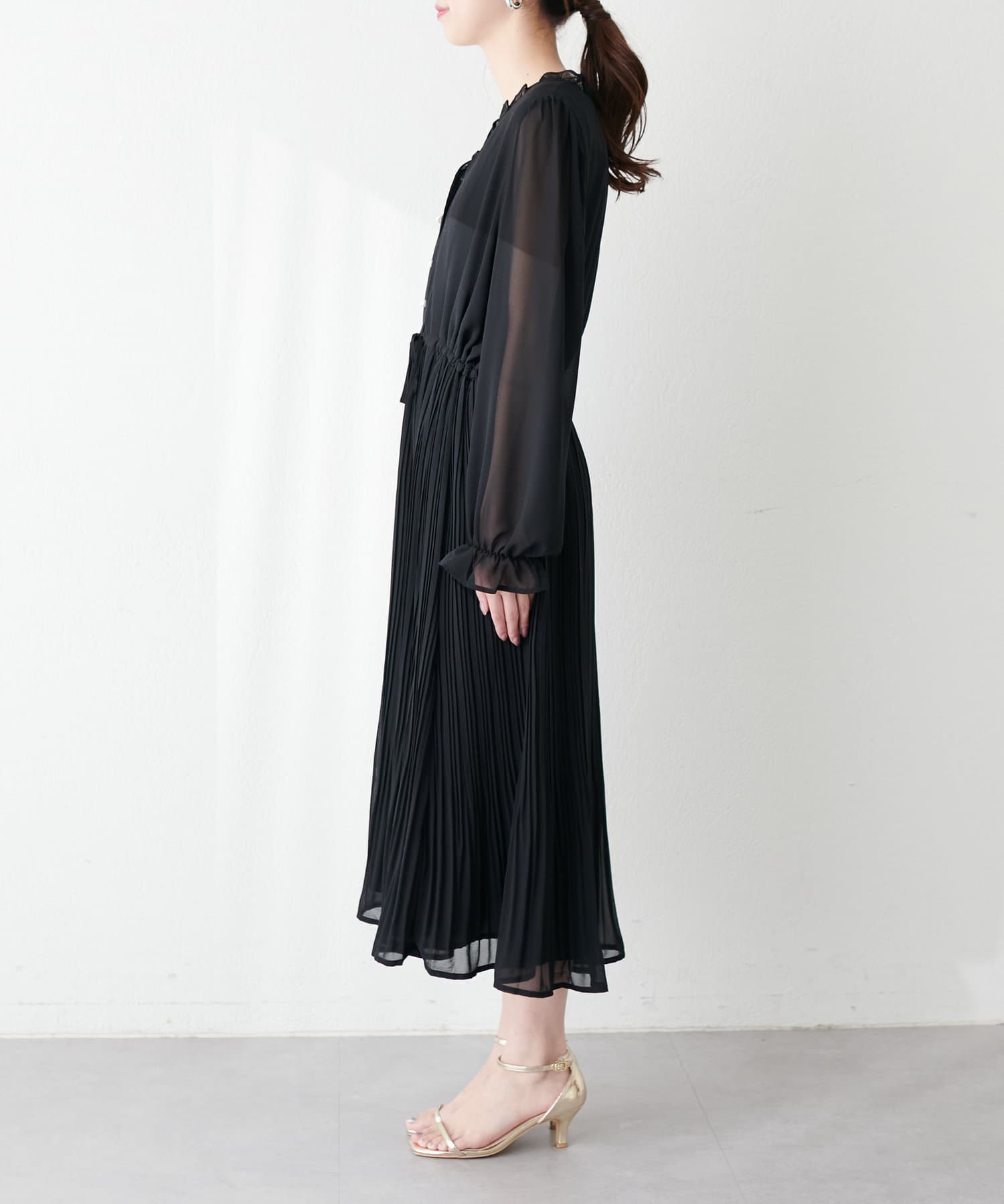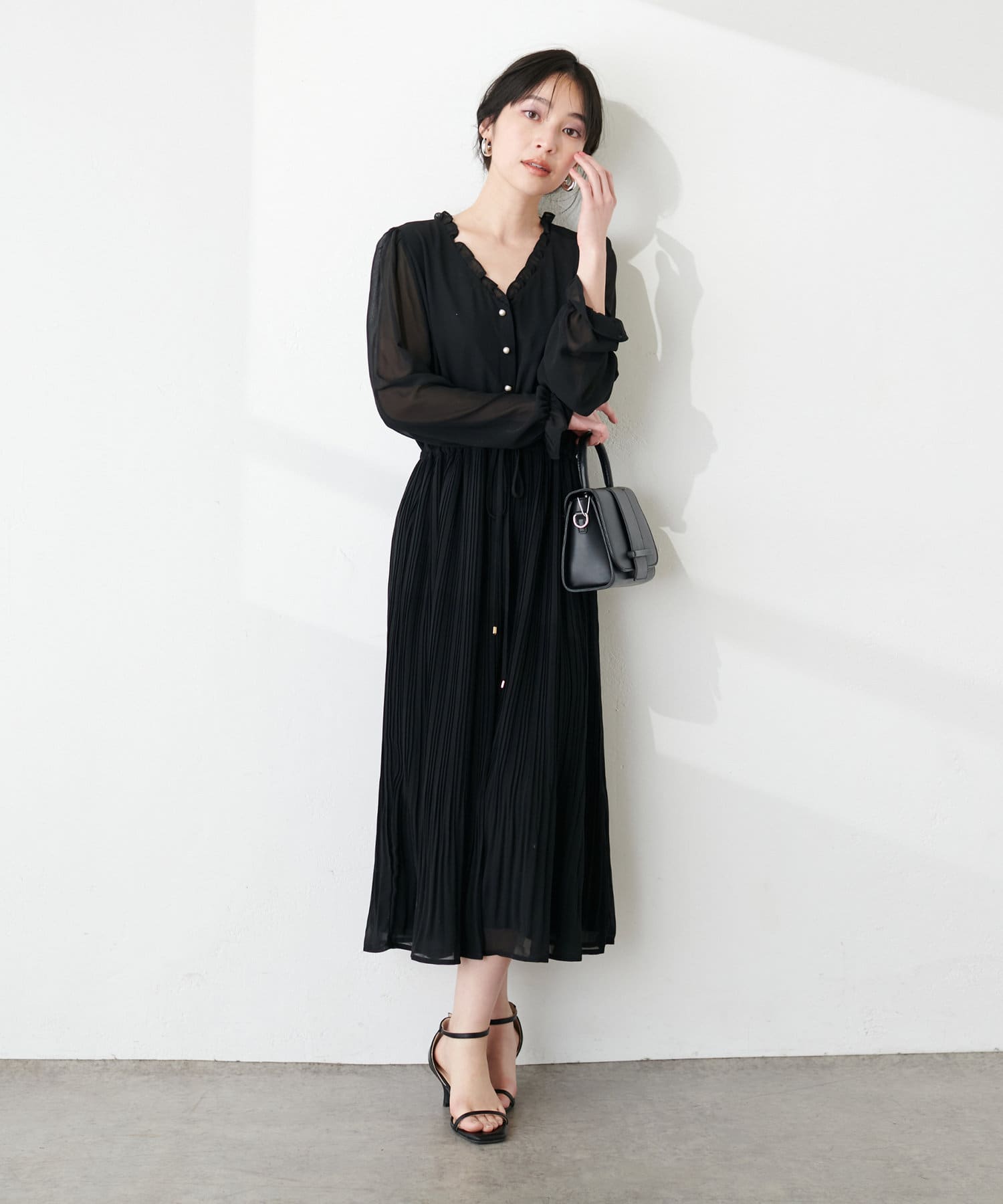 たっぷりのシフォンと細かなプリーツが動くたびにゆったりと揺れ、女性らしさを引き立ててくれるレディなワンピース。