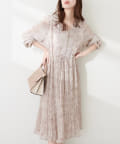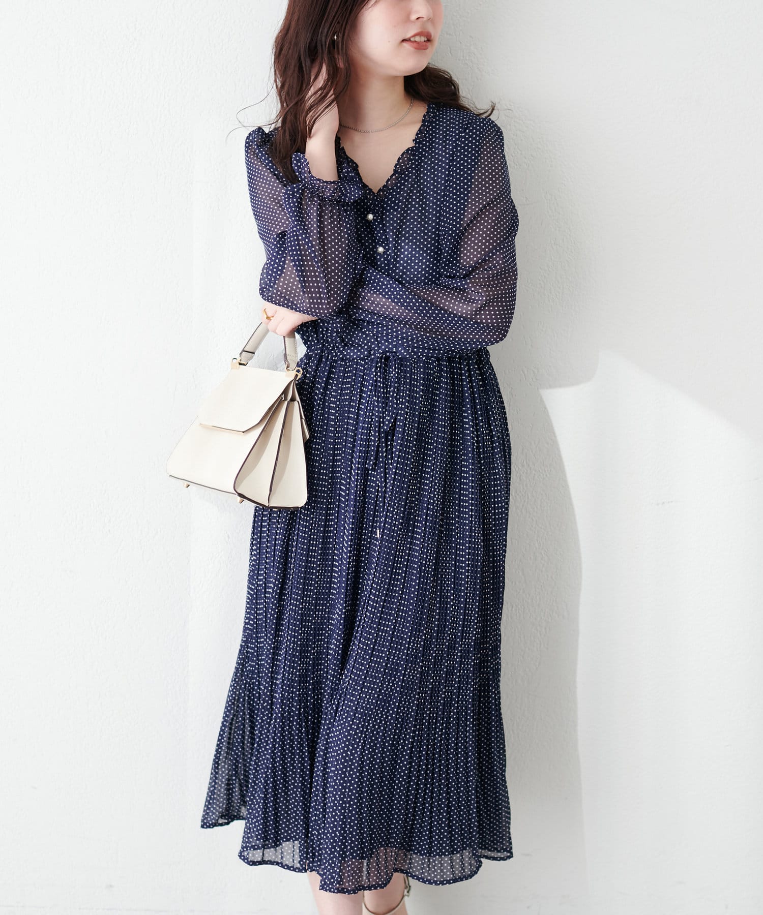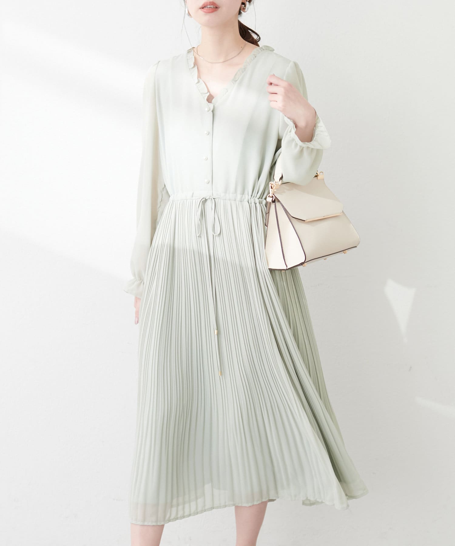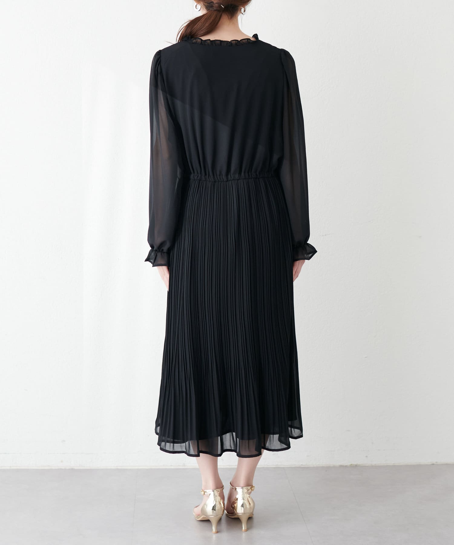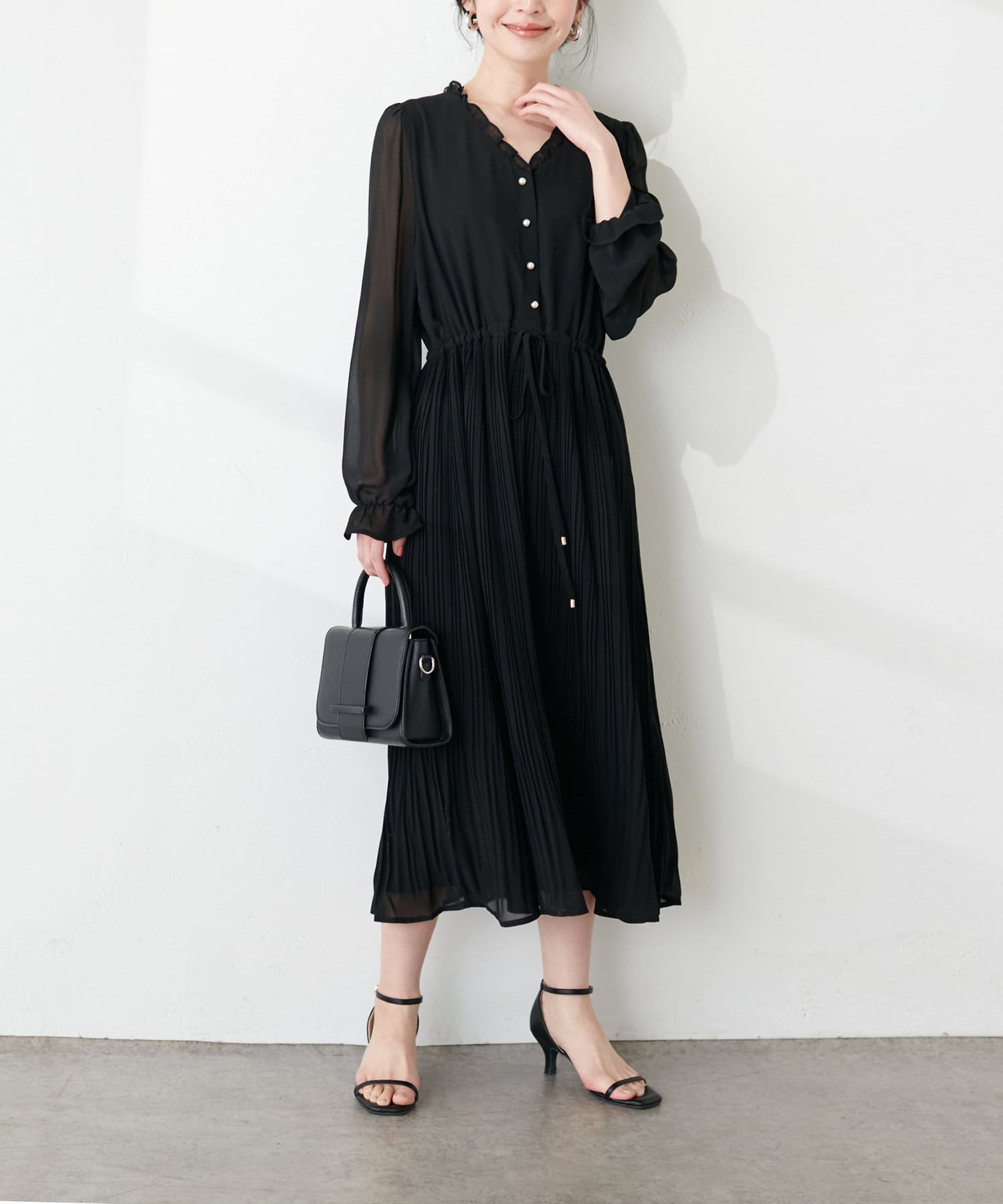 たっぷりのシフォンと細かなプリーツが動くたびにゆったりと揺れ、女性らしさを引き立ててくれるレディなワンピース。