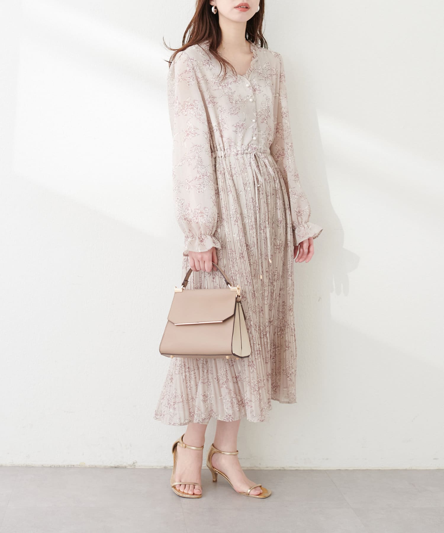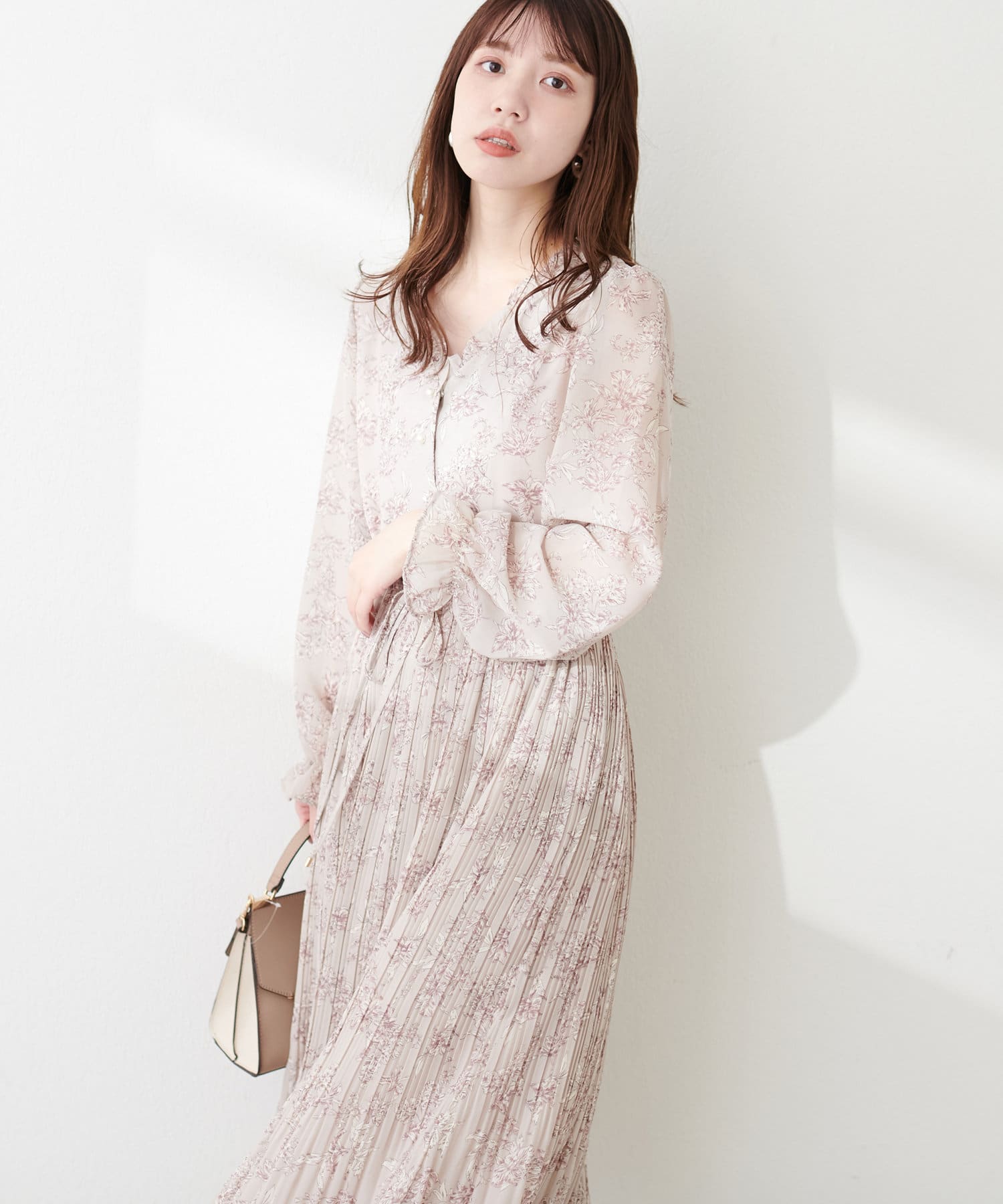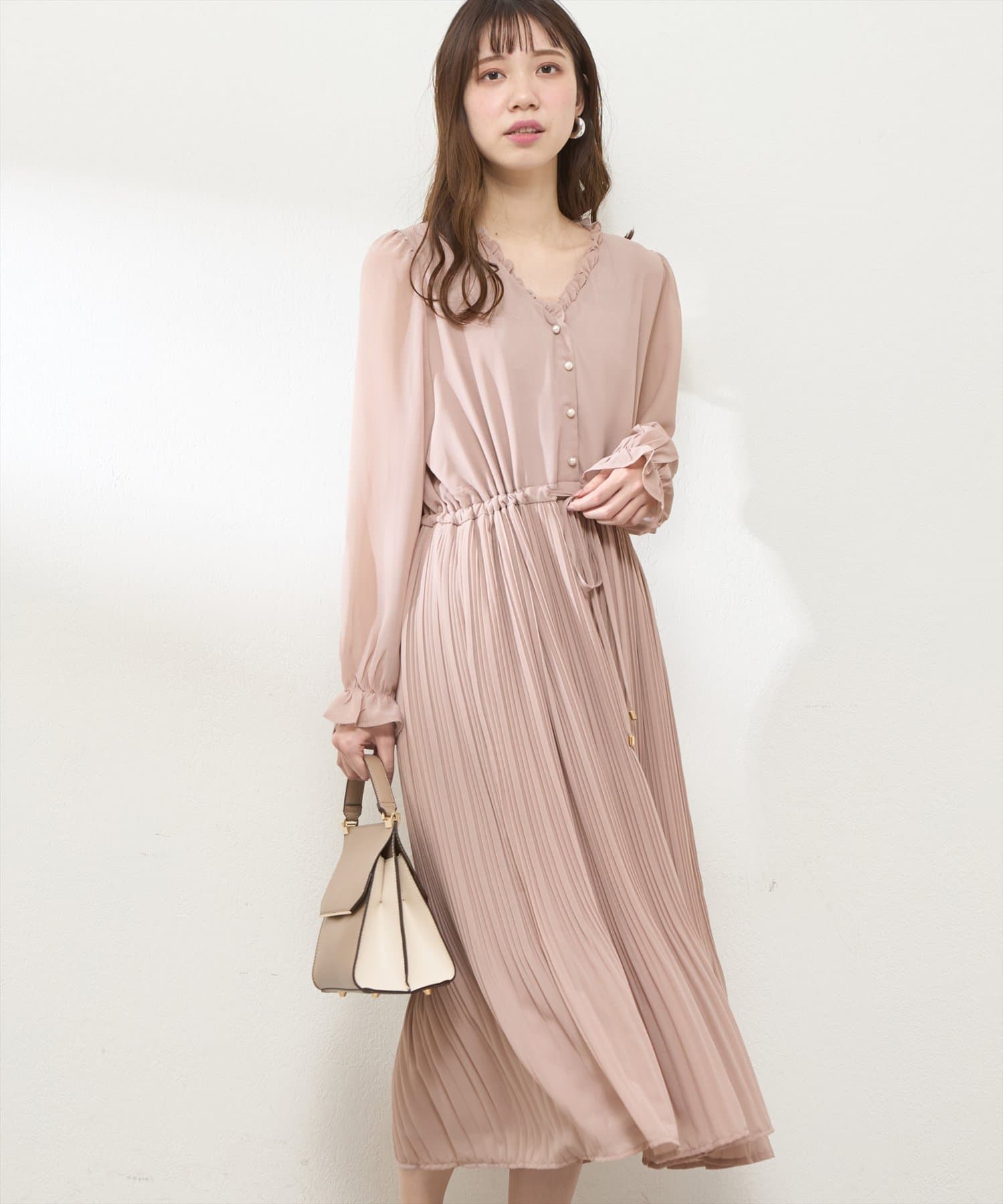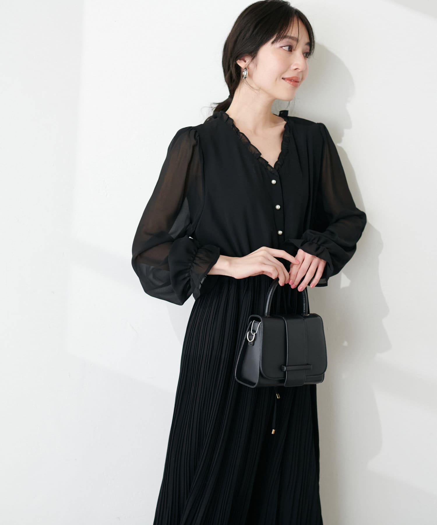 たっぷりのシフォンと細かなプリーツが動くたびにゆったりと揺れ、女性らしさを引き立ててくれるレディなワンピース。