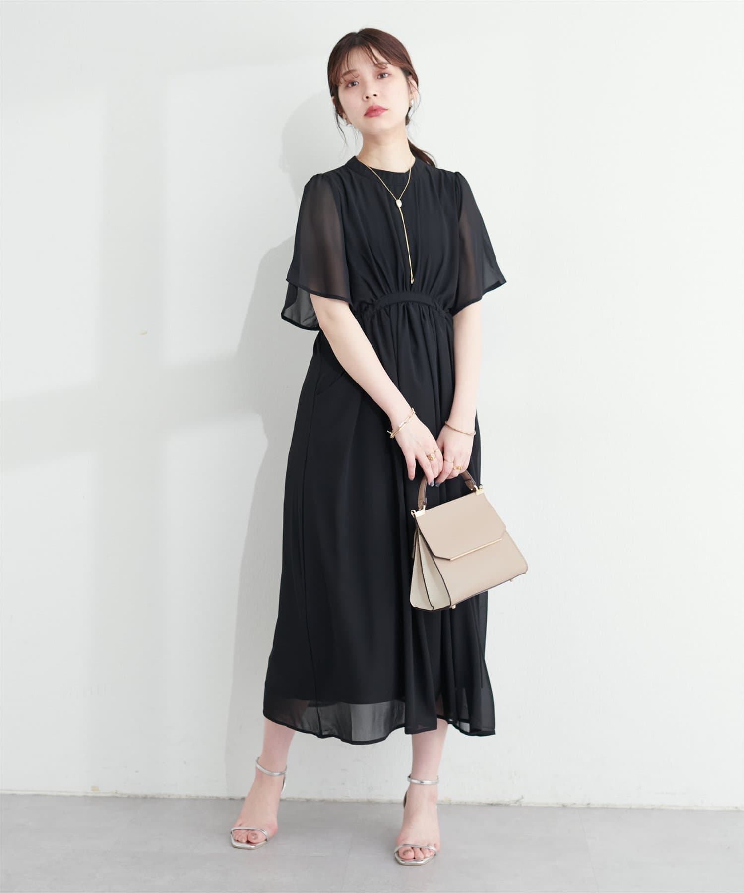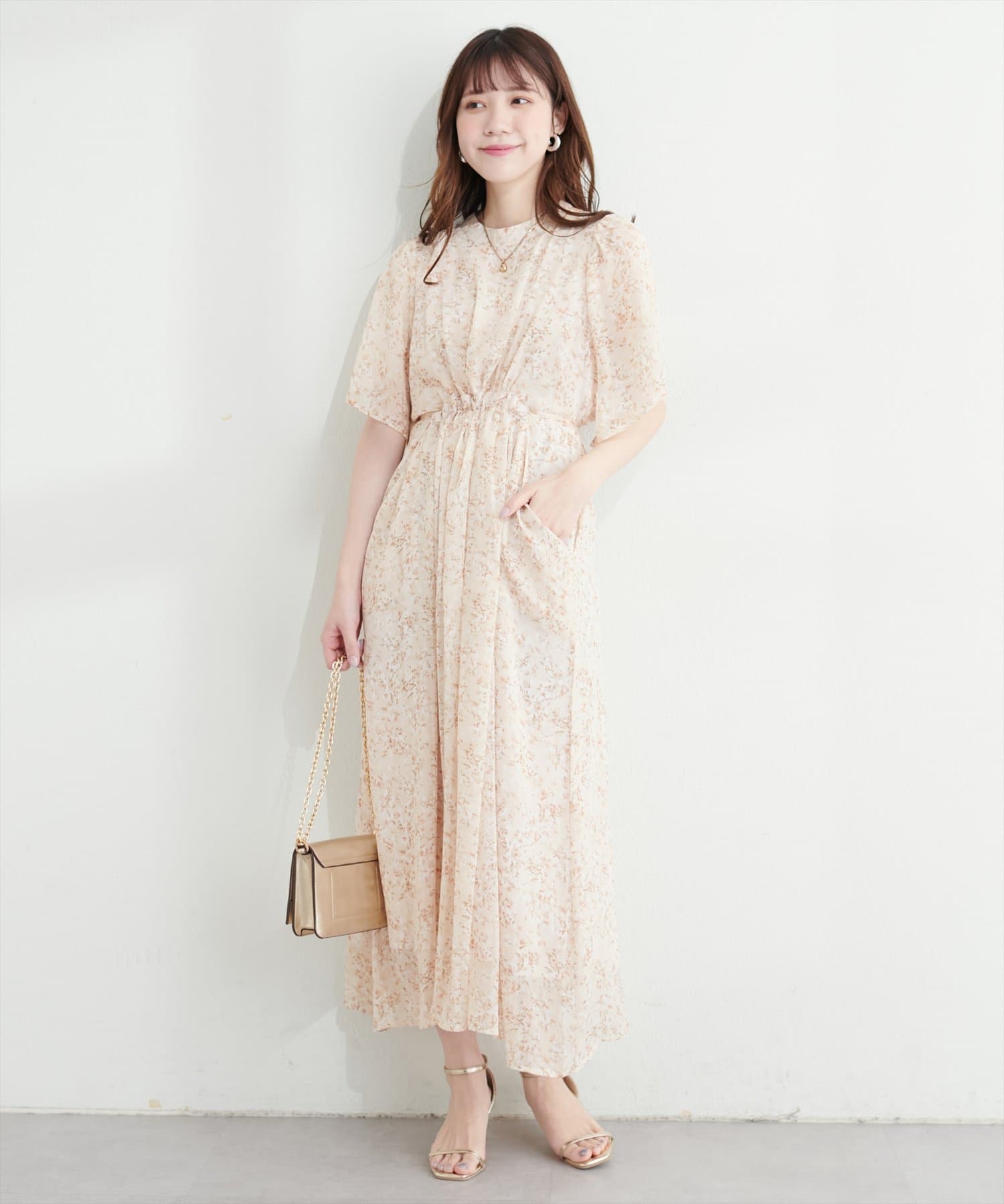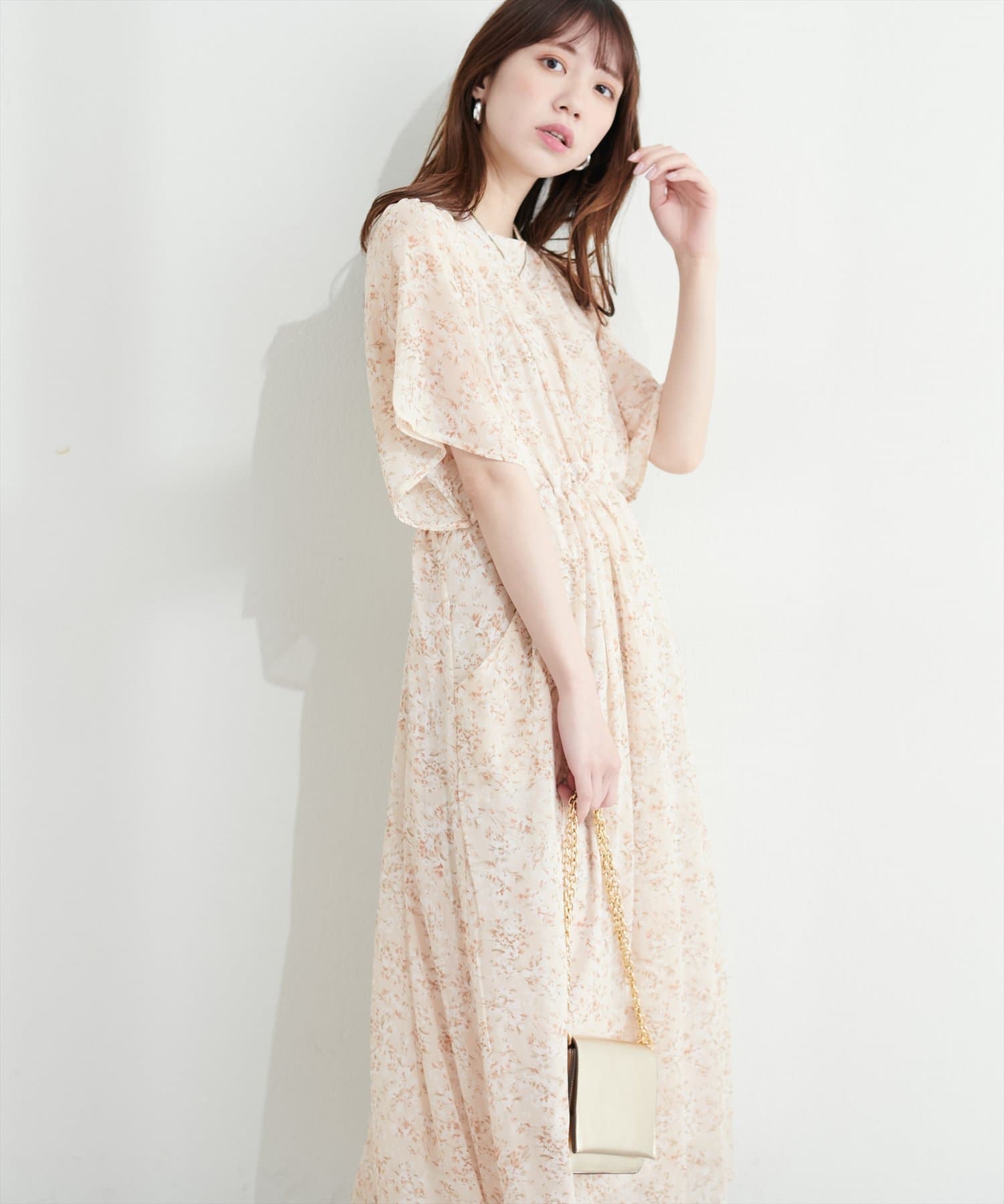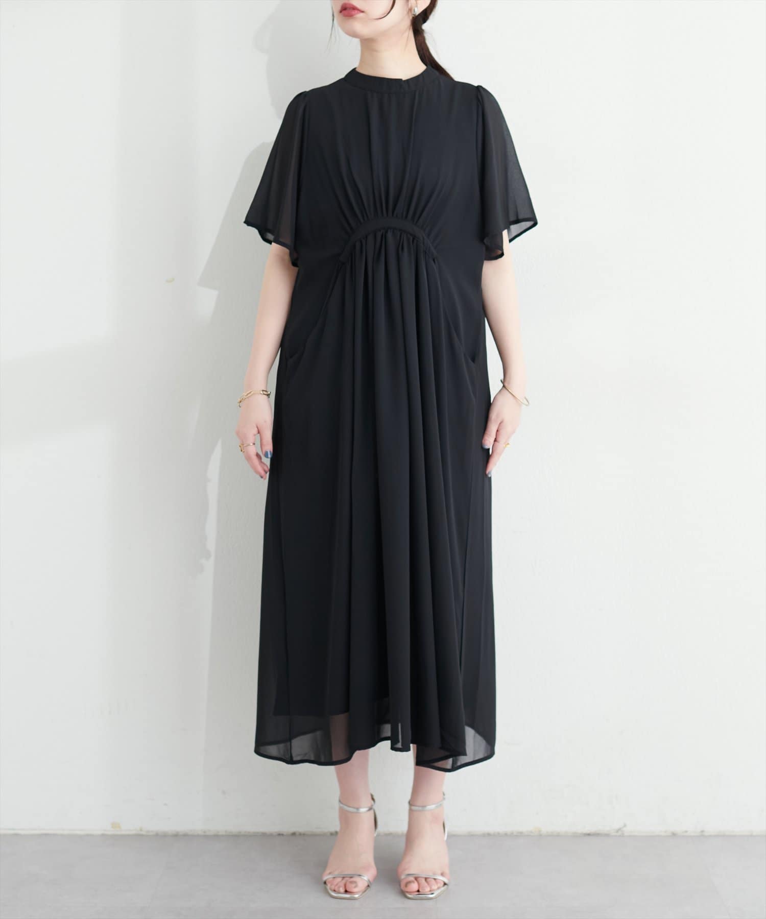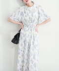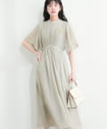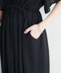 ウエストに向かってたっぷりのシャーリングが施され、スタイルアップ効果抜群の1着。
