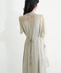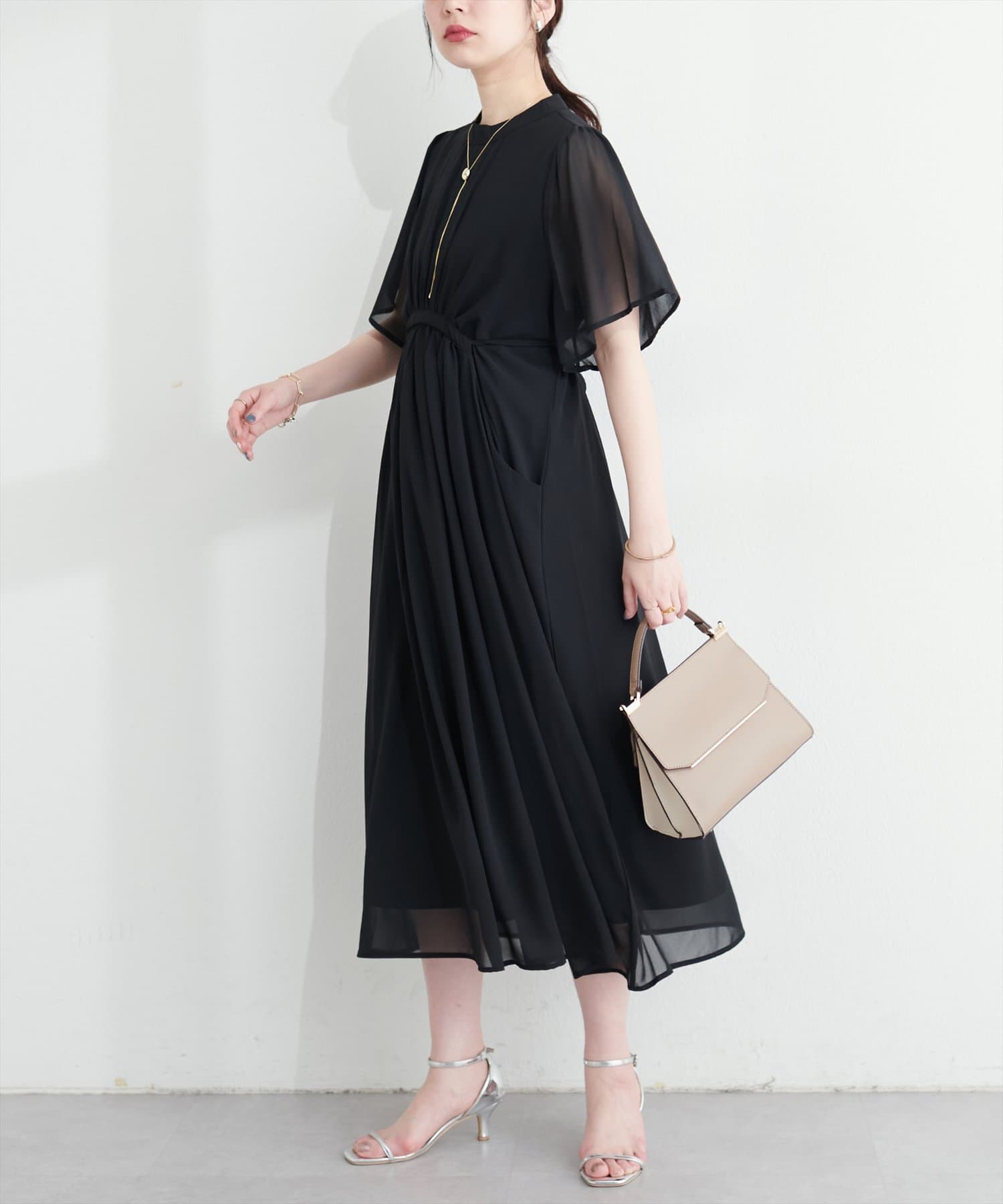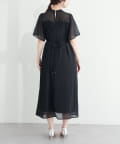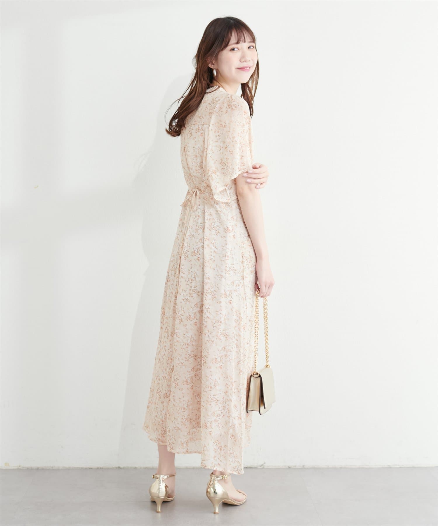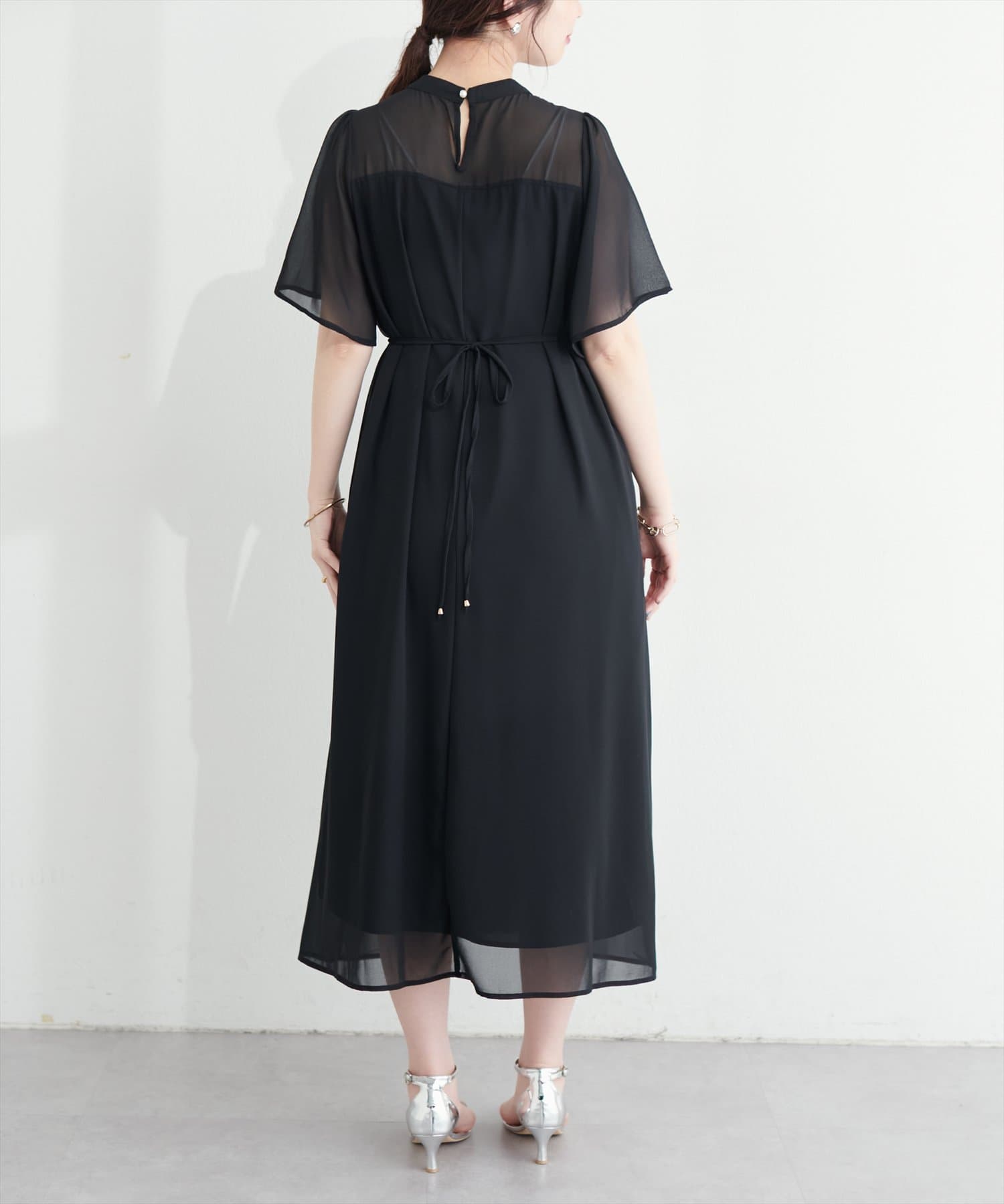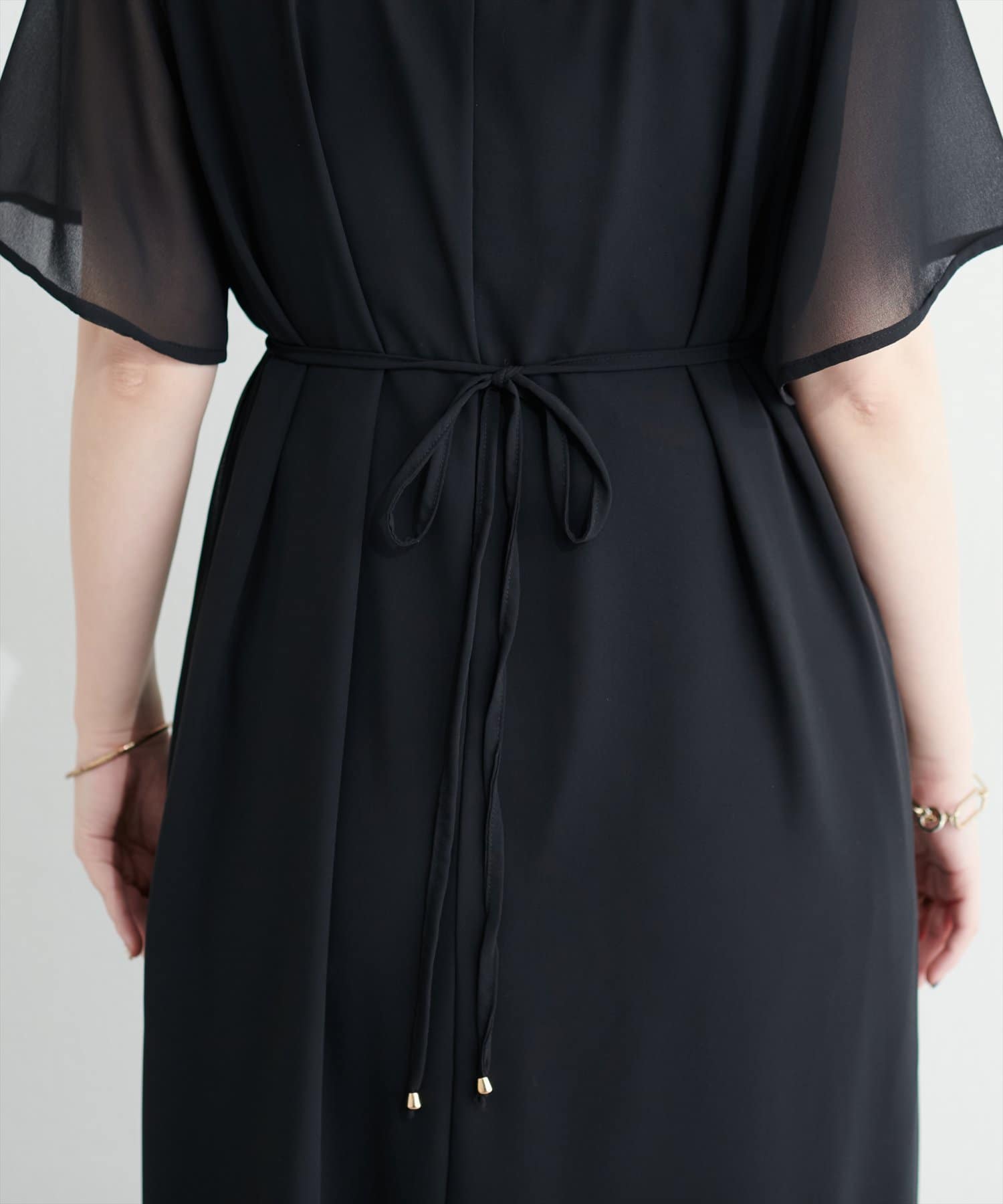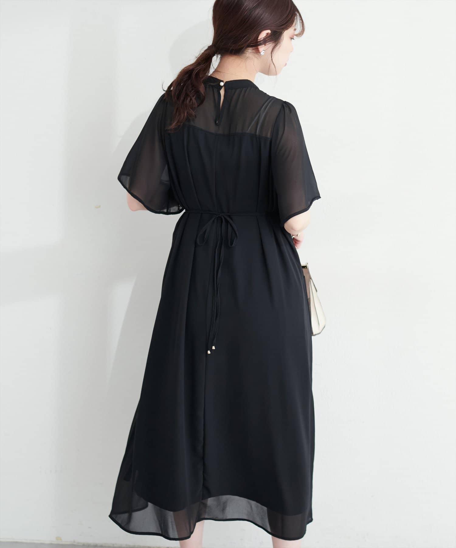ウエストリボンを後ろで結べばフェミニンさがプラスされ、バックススタイルまで美しく。