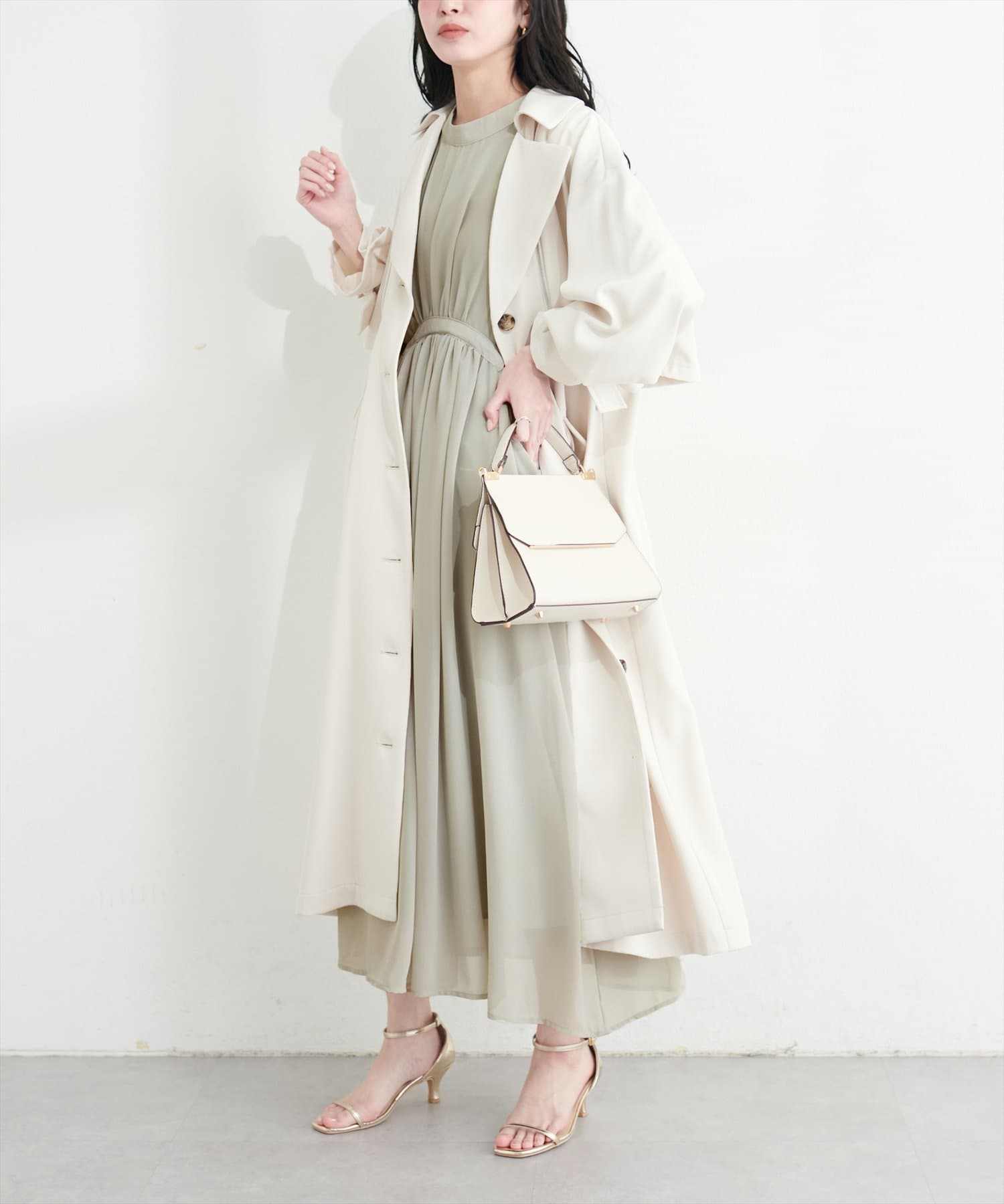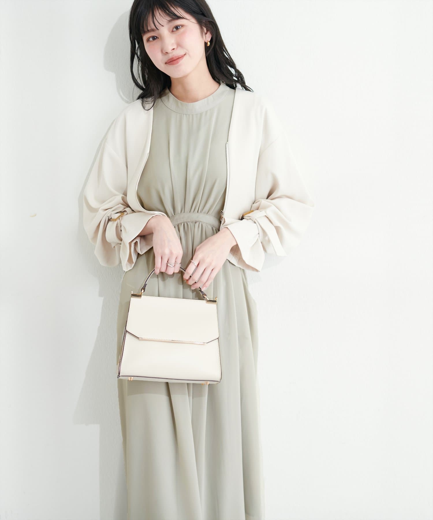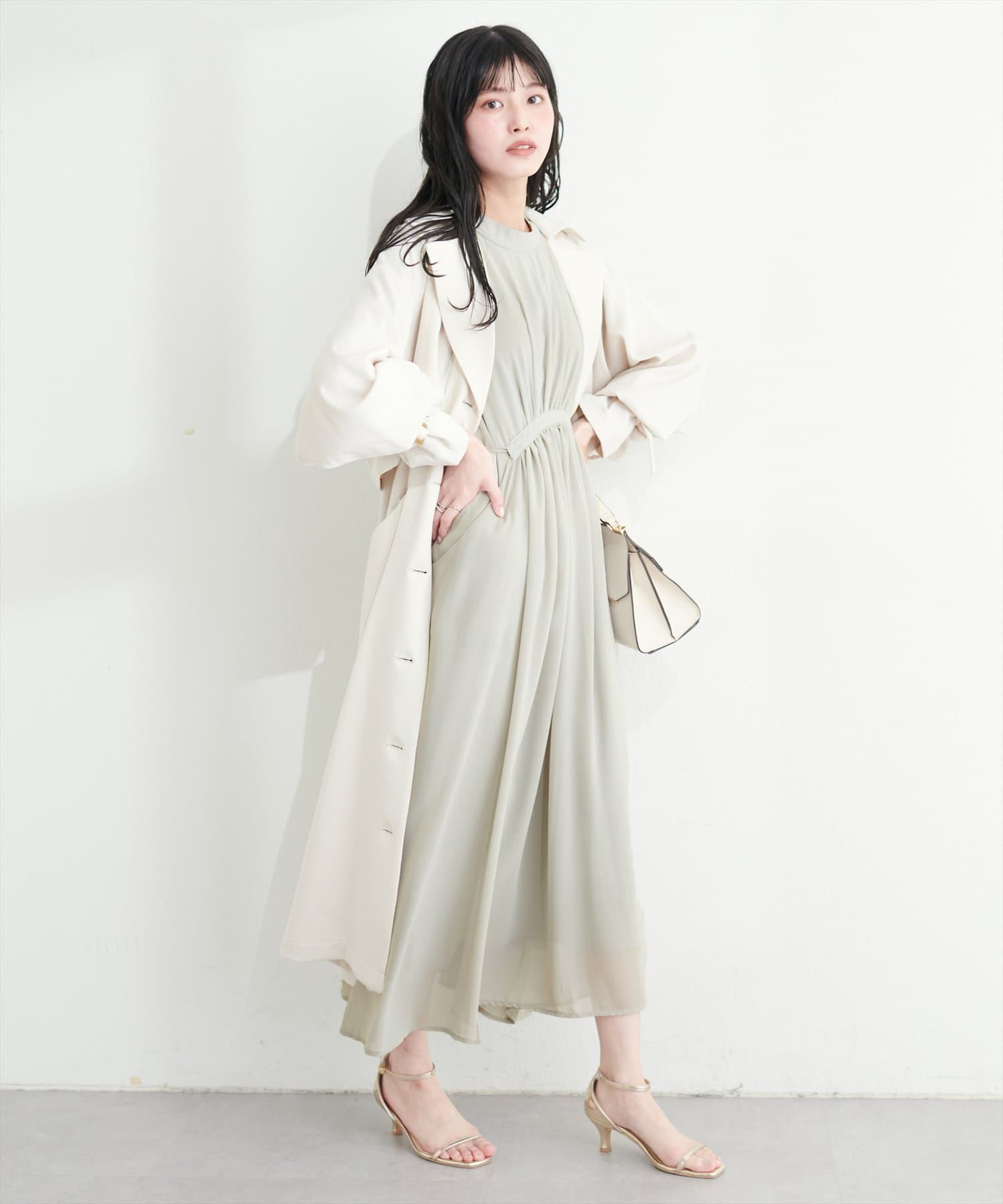 ウエストのドロストリボンを絞ればよりきれいめなスタイリングに。