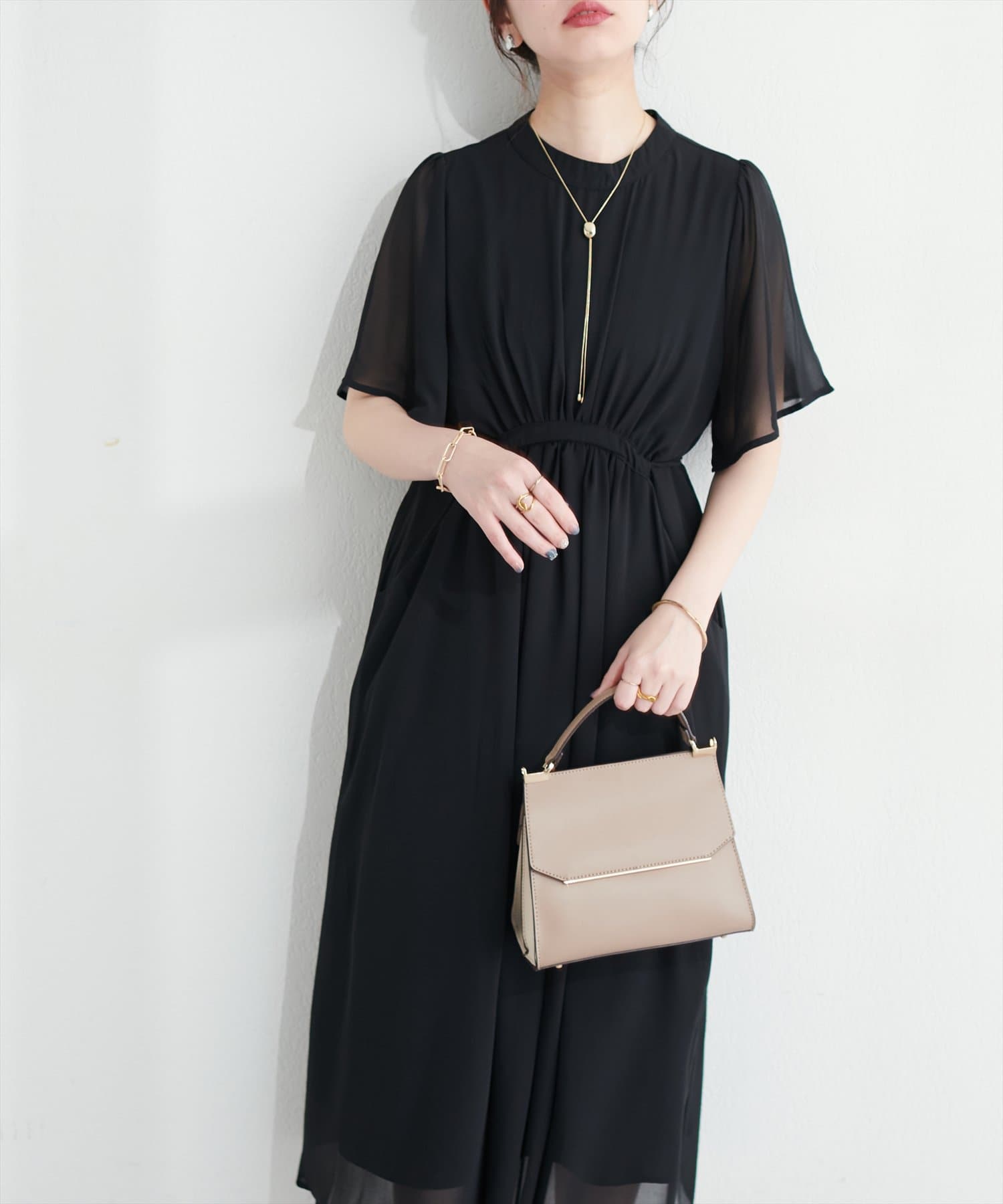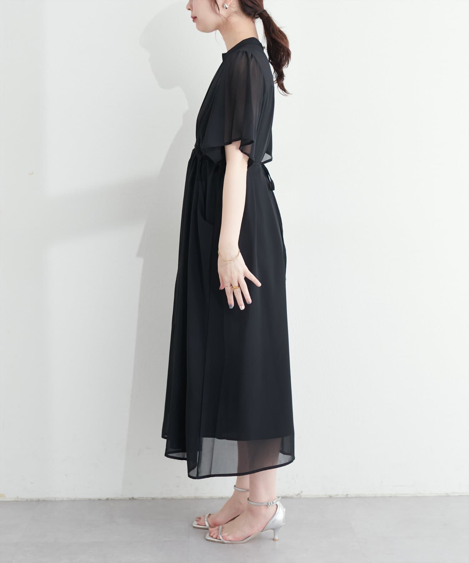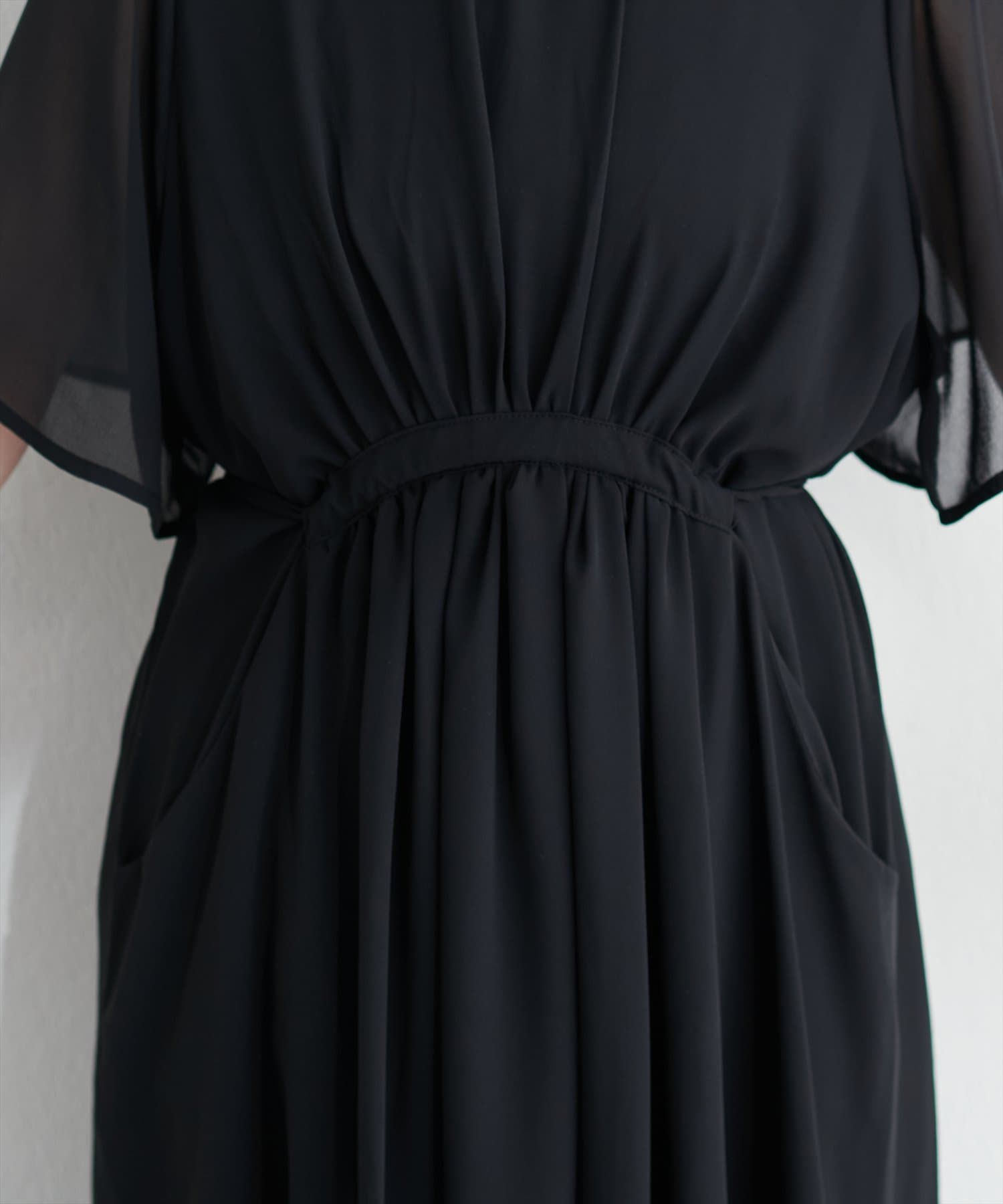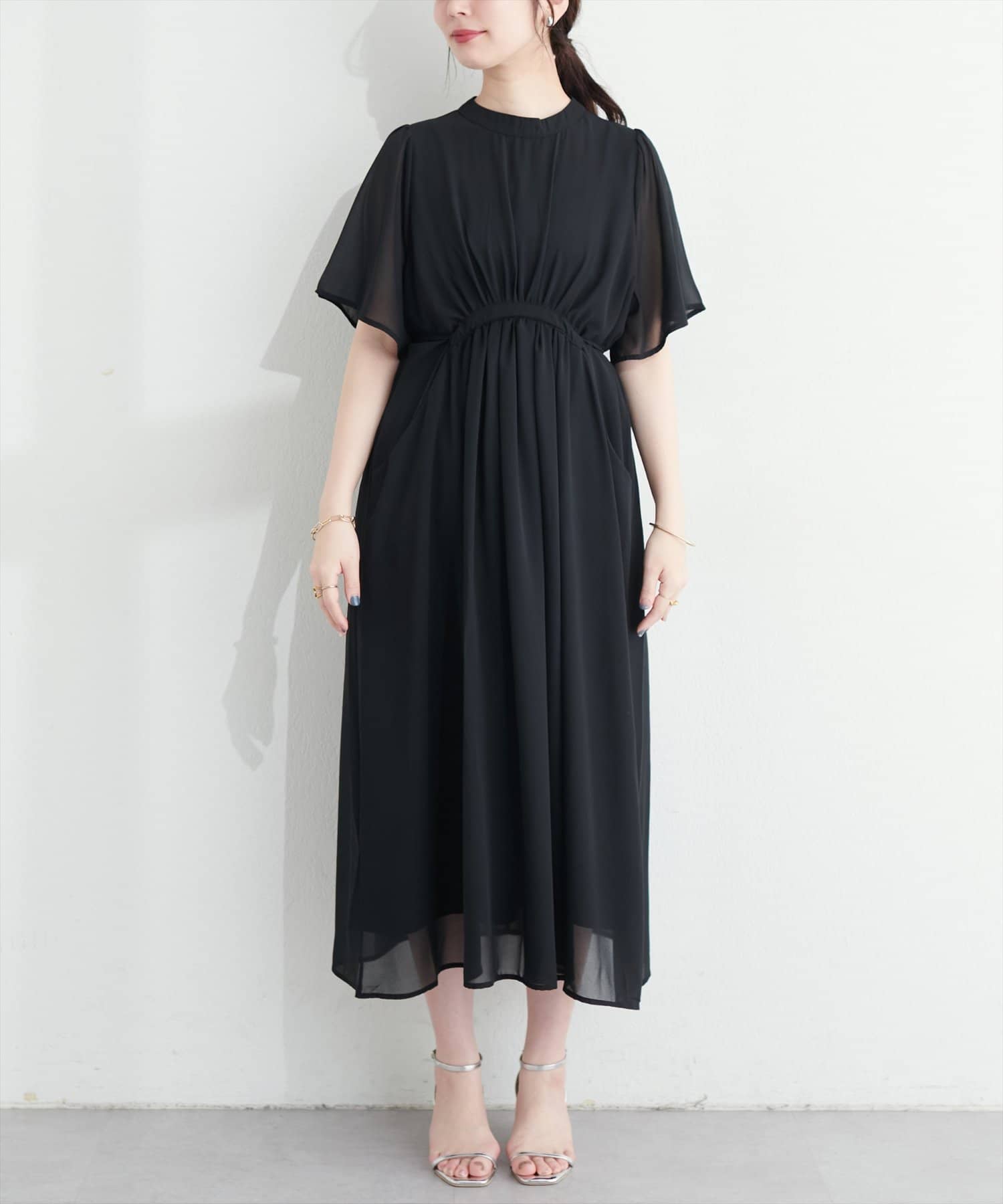 落ち感のある素材とシアーなスリーブが大人の雰囲気を引き立てるハイネックワンピース。