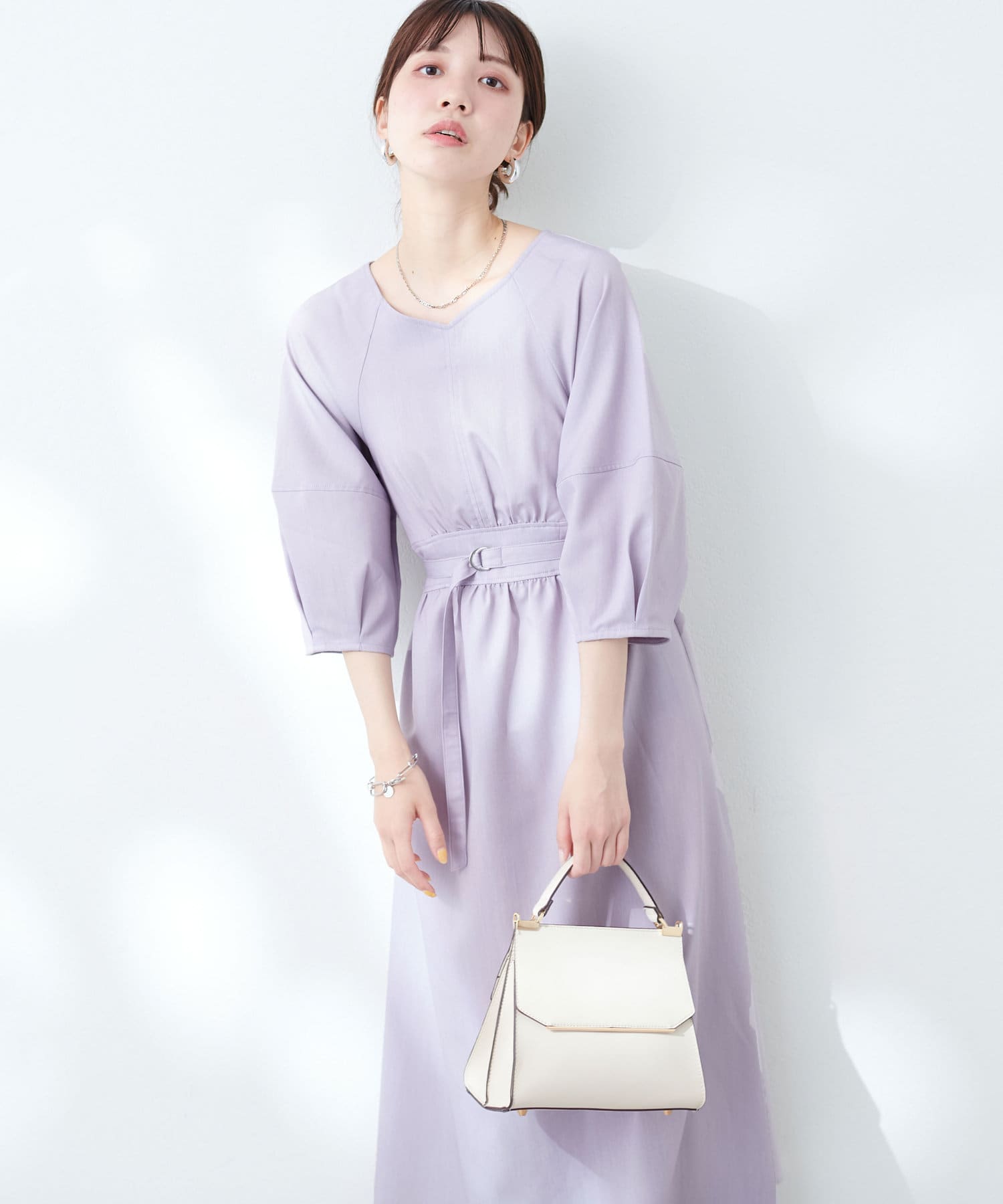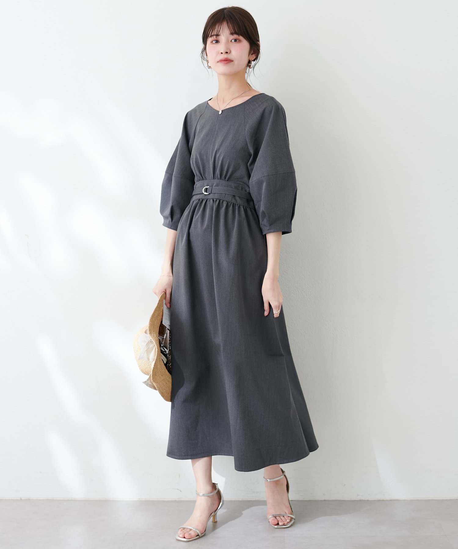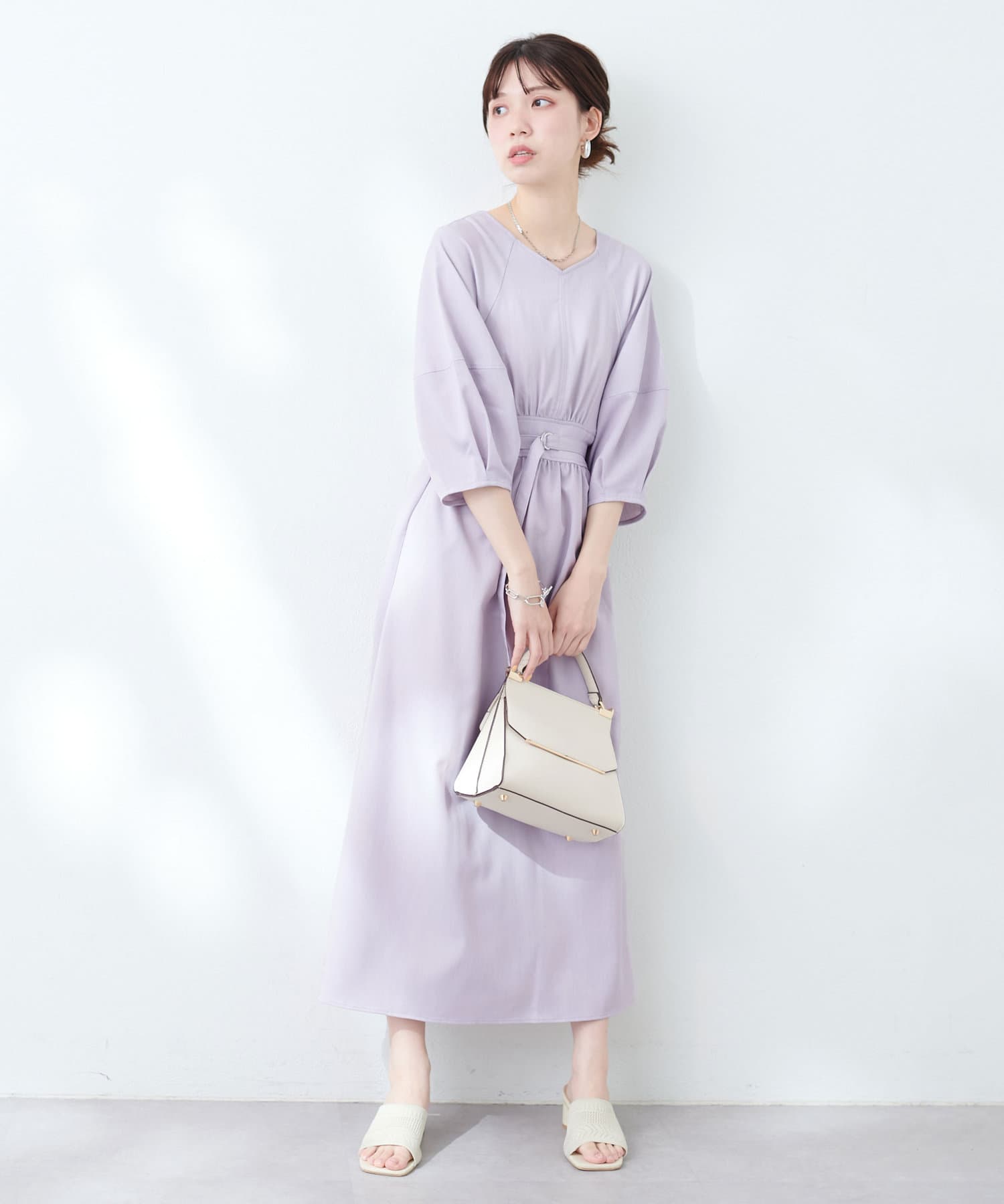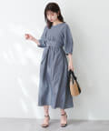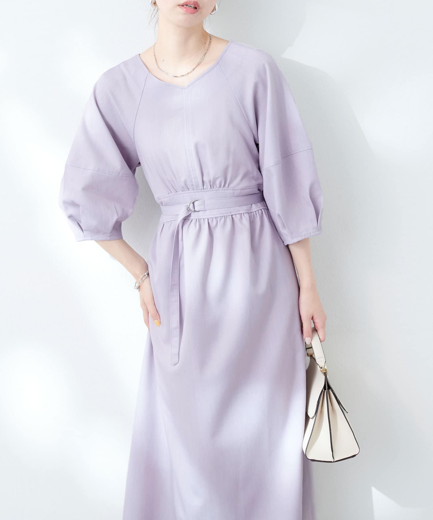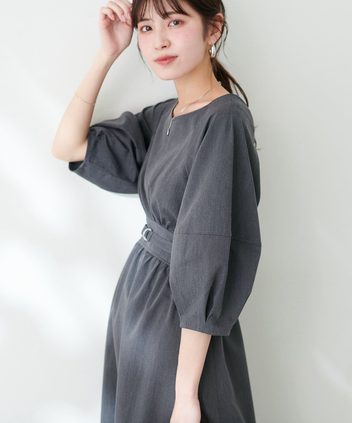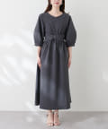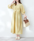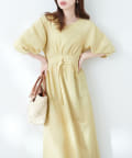 腕を華奢に見せてくれるランタンスリーブが目を惹くワンピース。