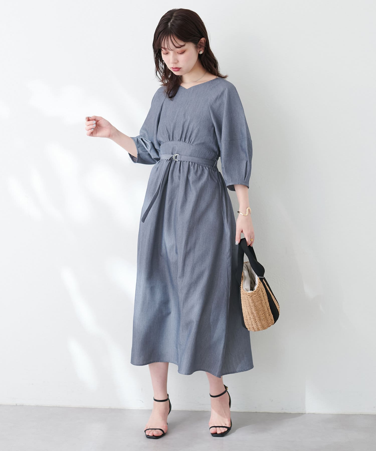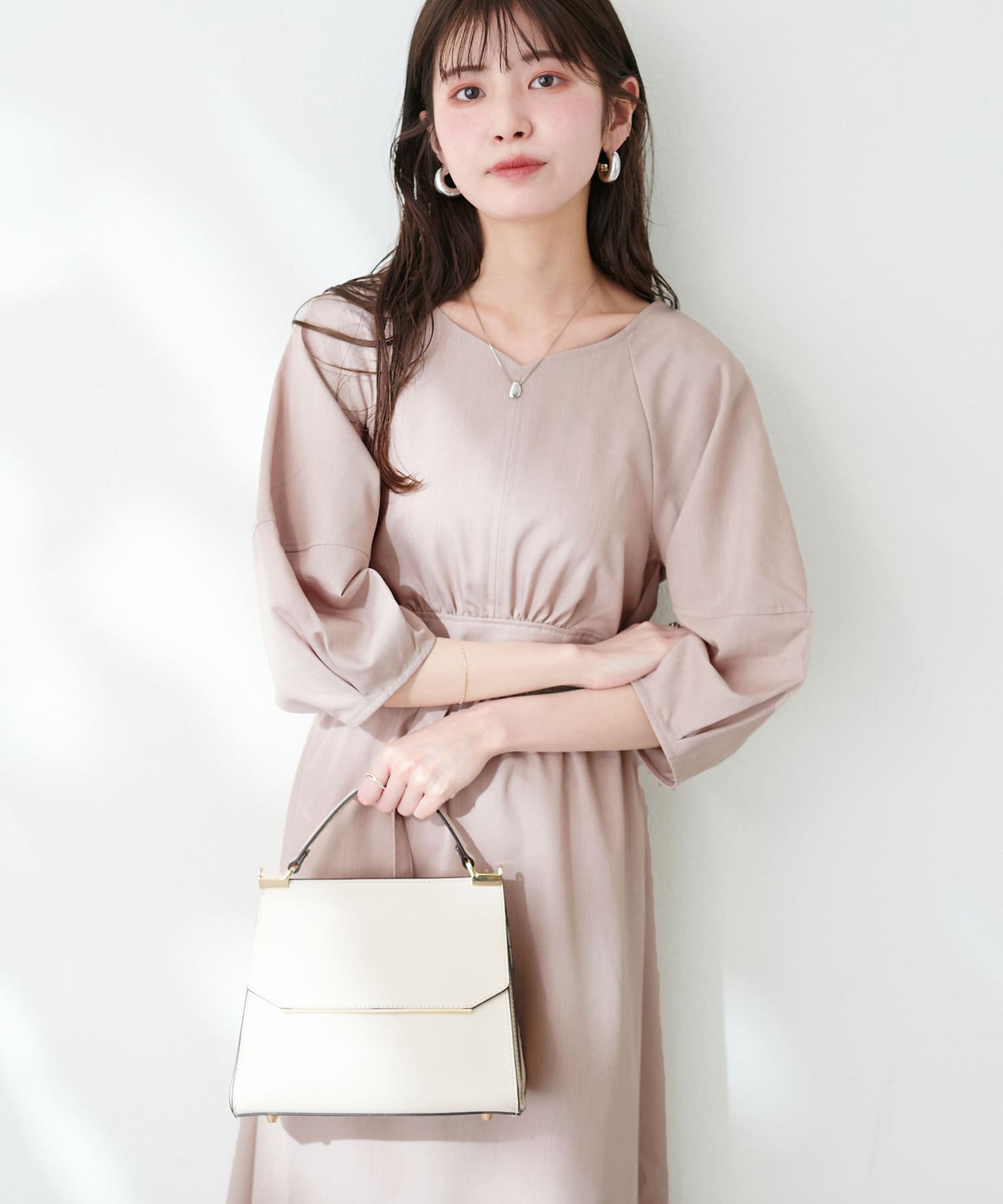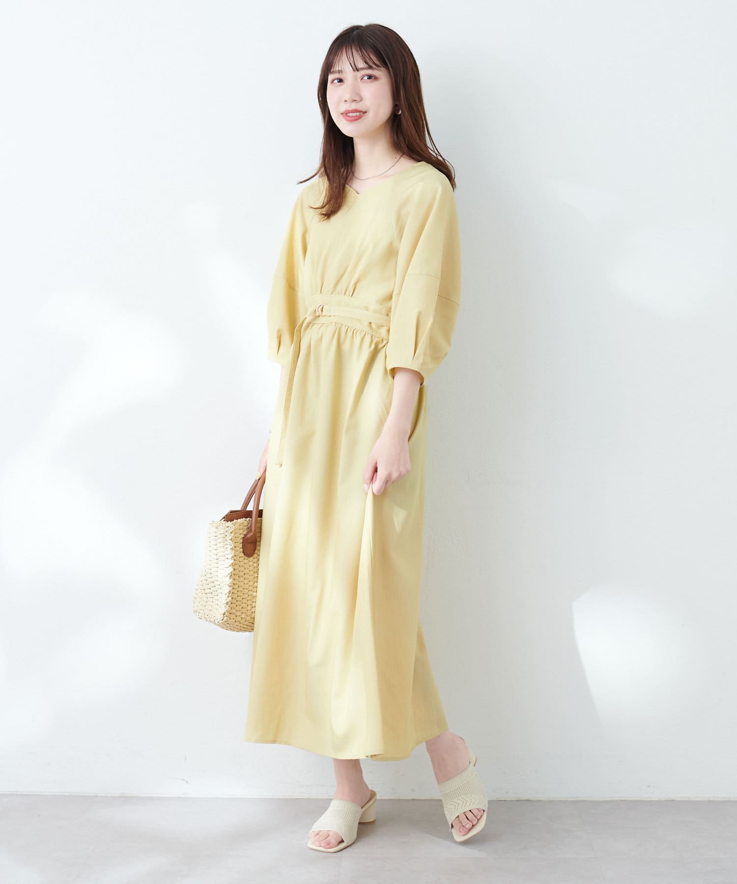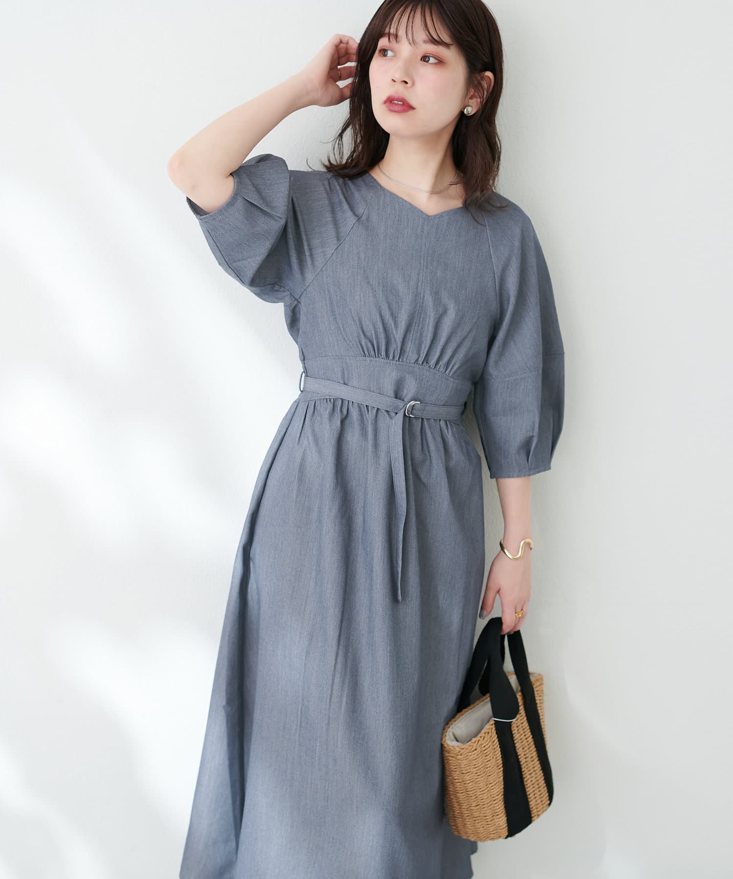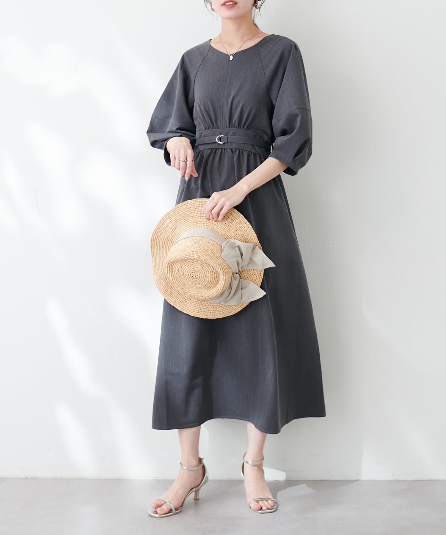 腕を華奢に見せてくれるランタンスリーブが目を惹くワンピース。