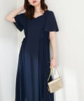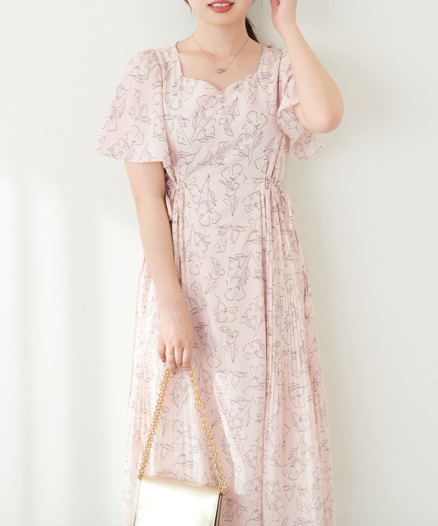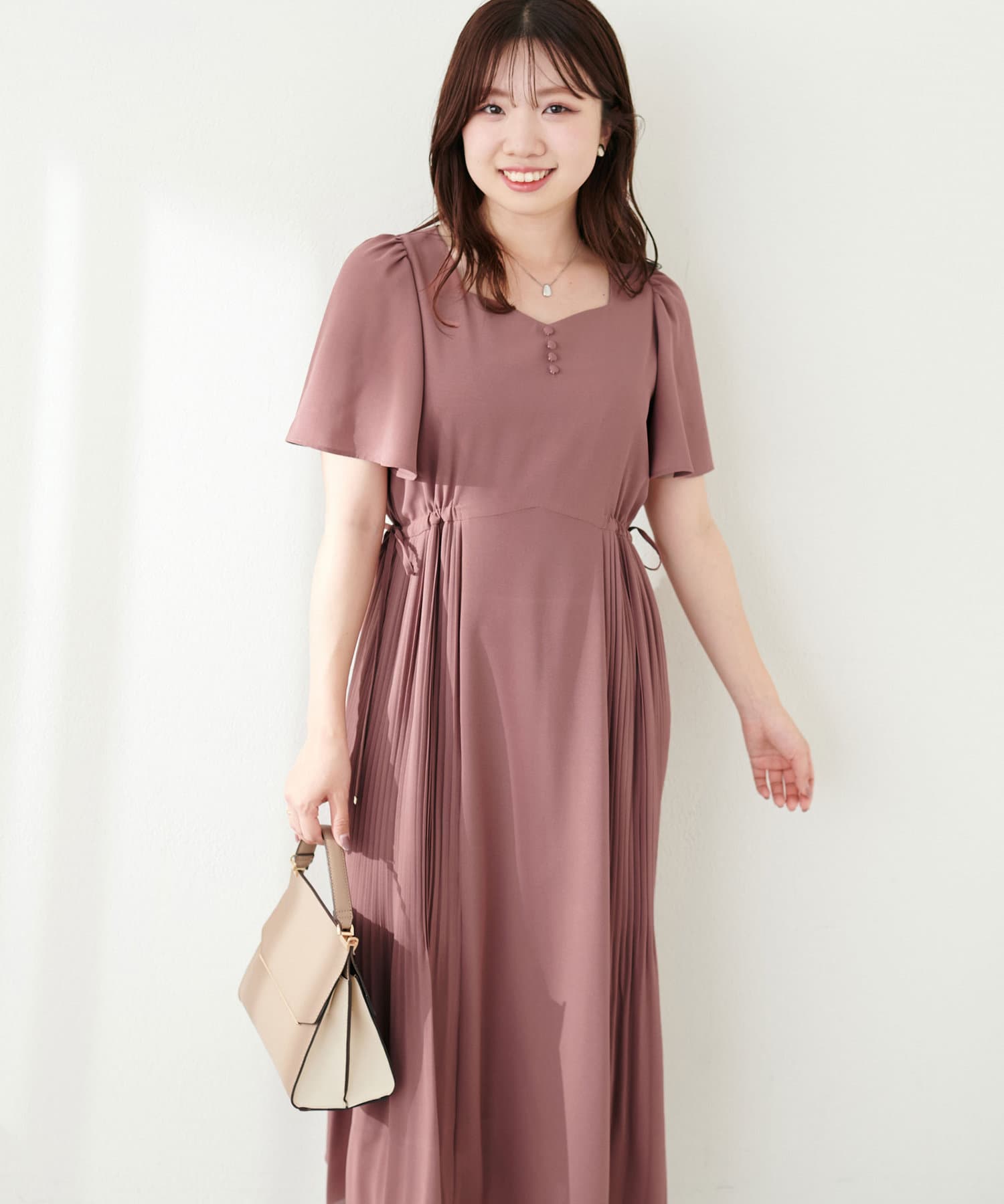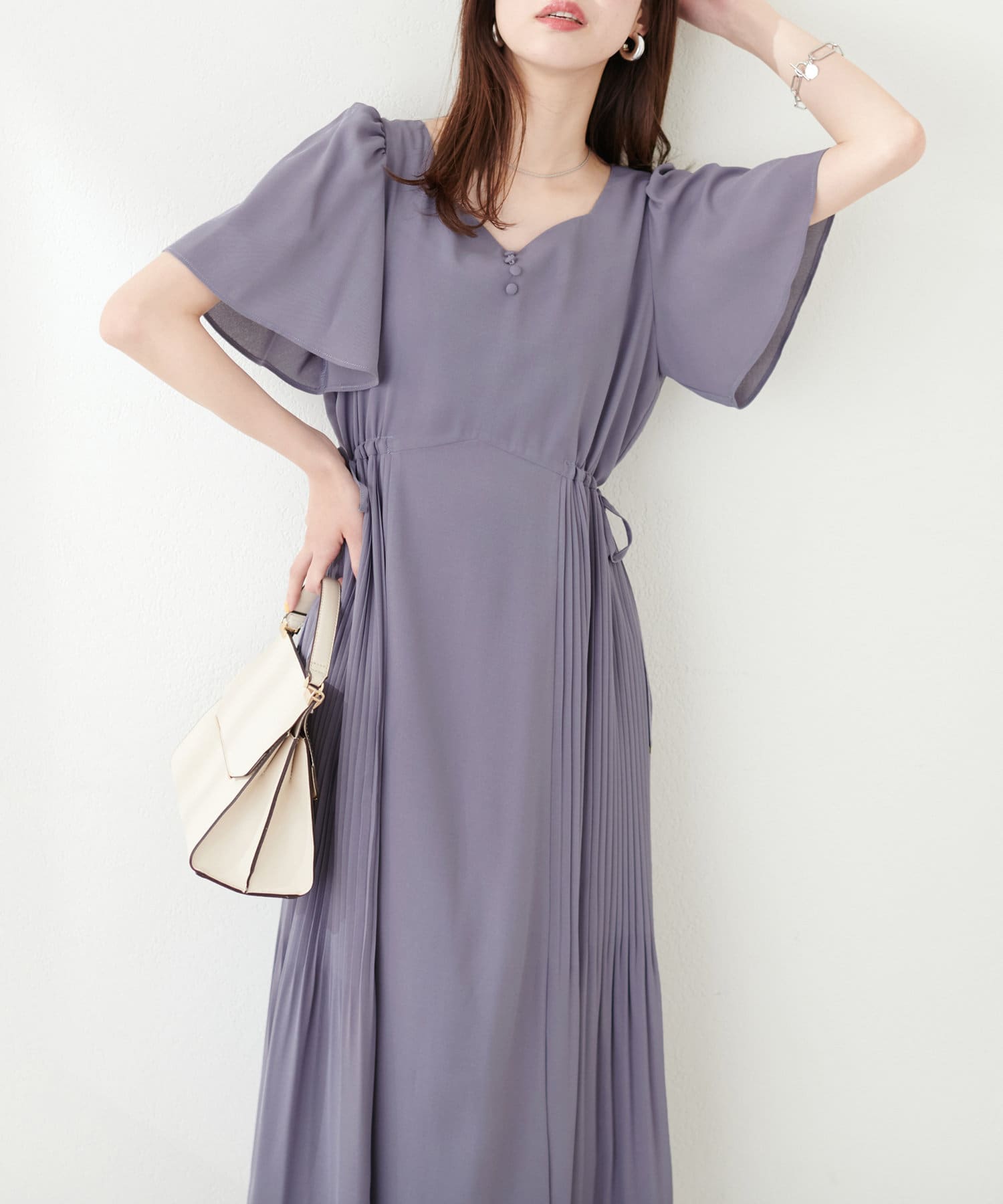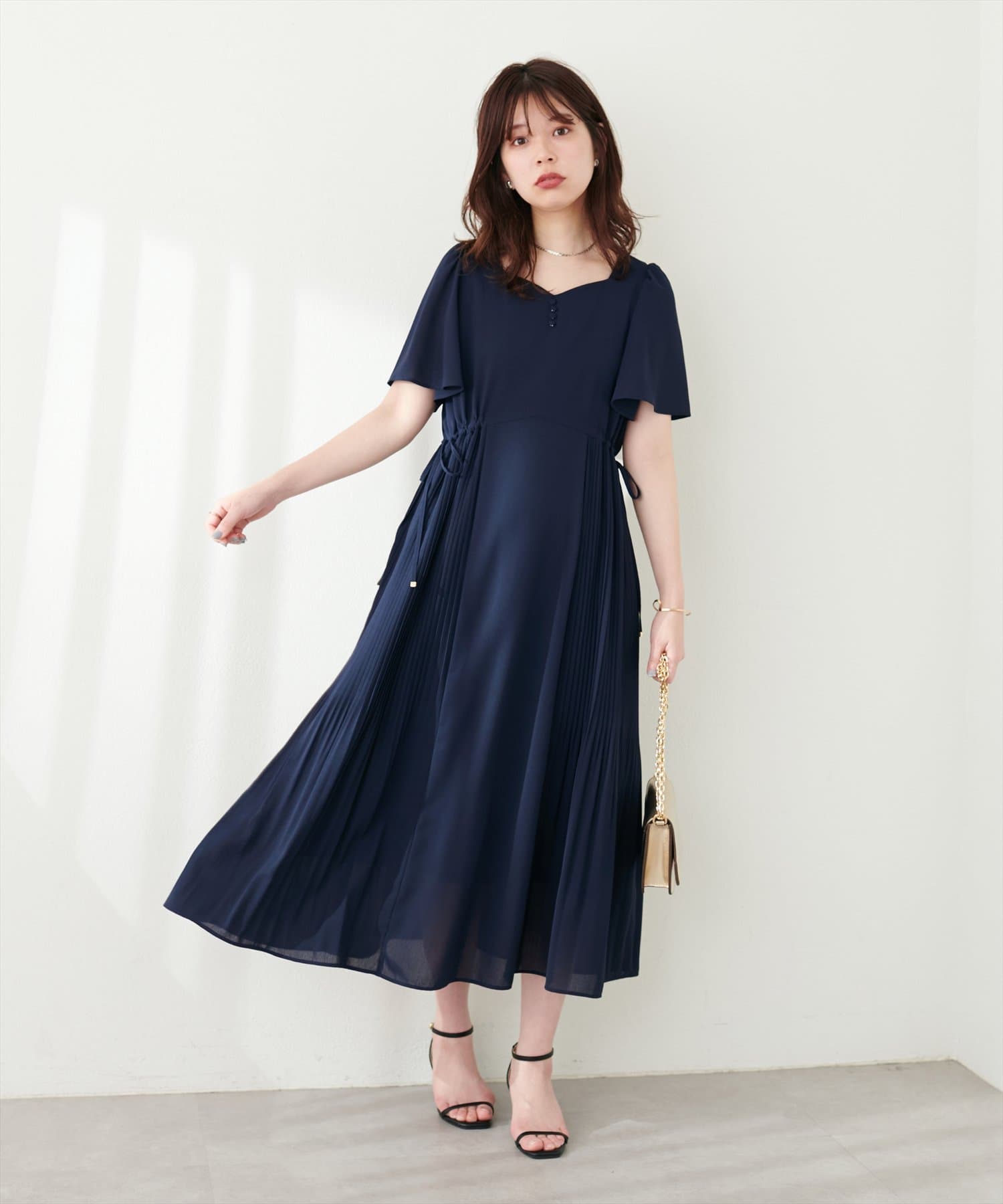 【canami】ハートネック両サイドプリーツフレアスリーブワンピース