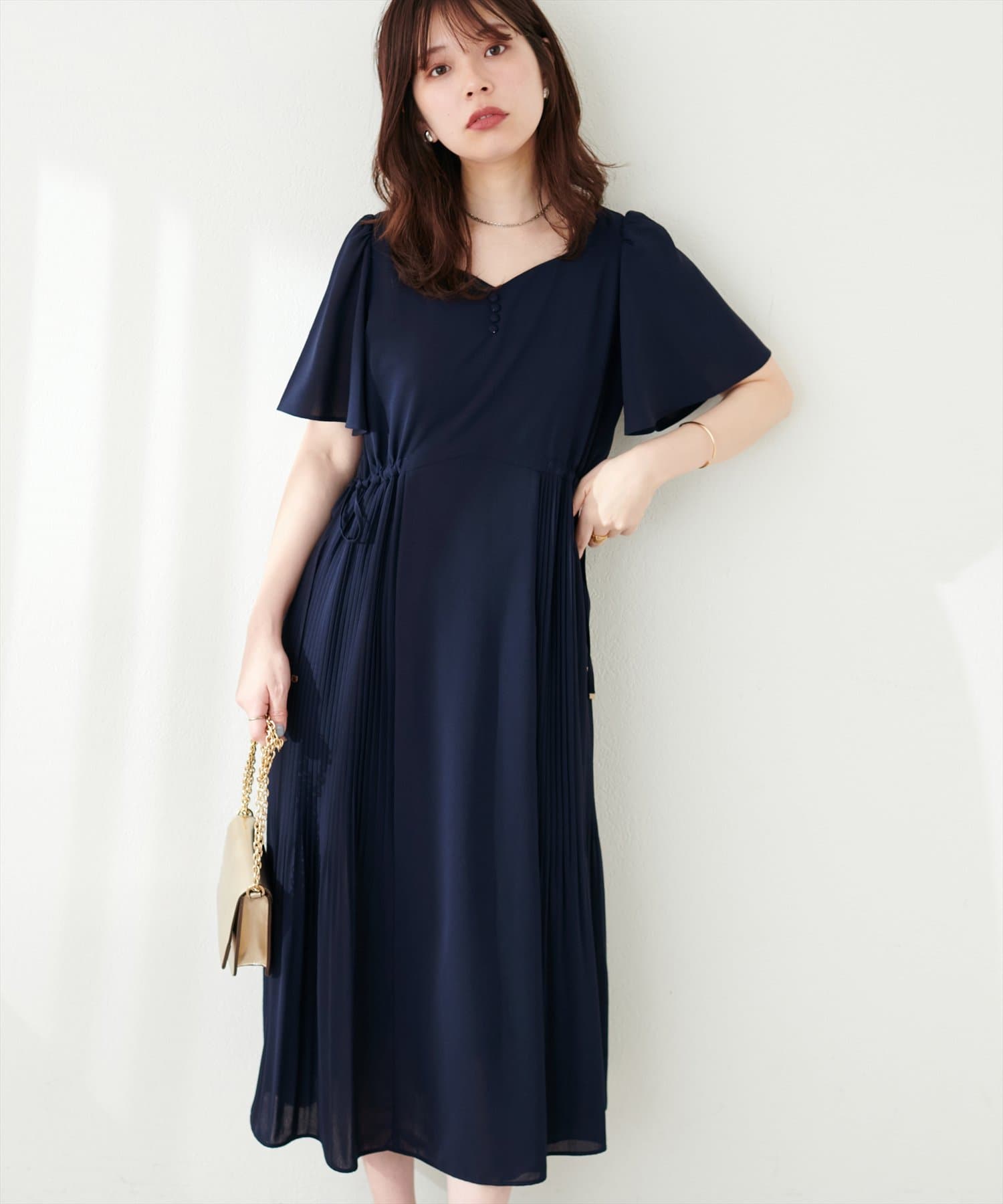 • natural couture(ナチュラルクチュール) 【canami】ハートネック両サイドプリーツフレアスリーブワンピース