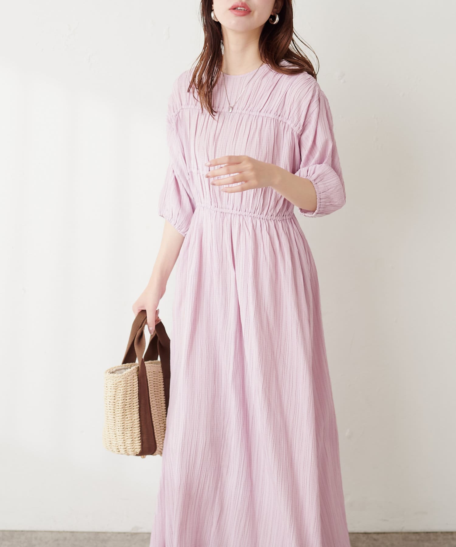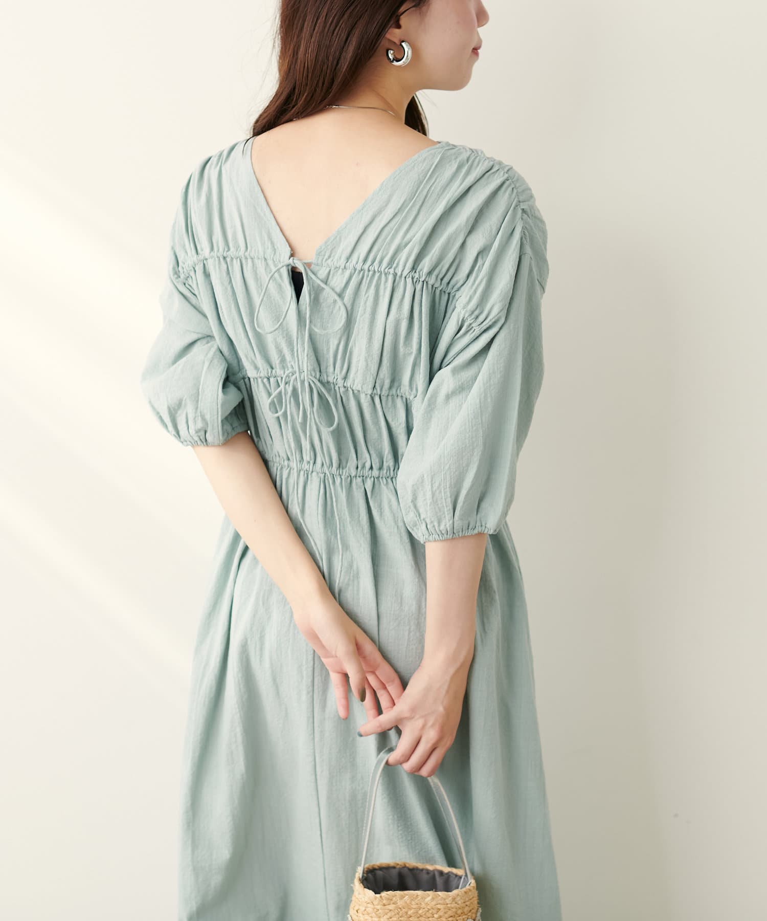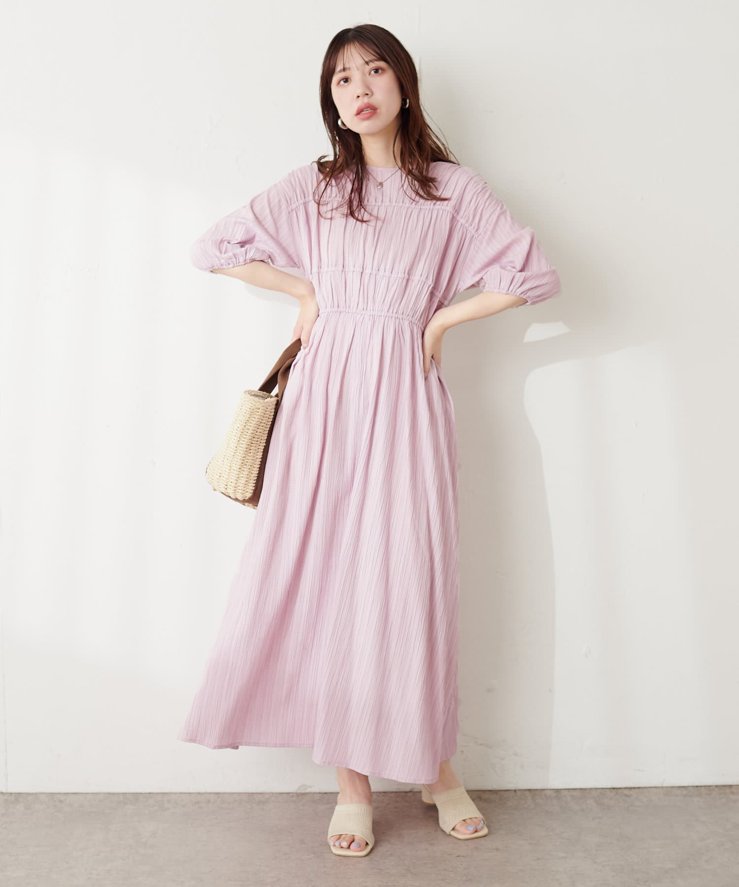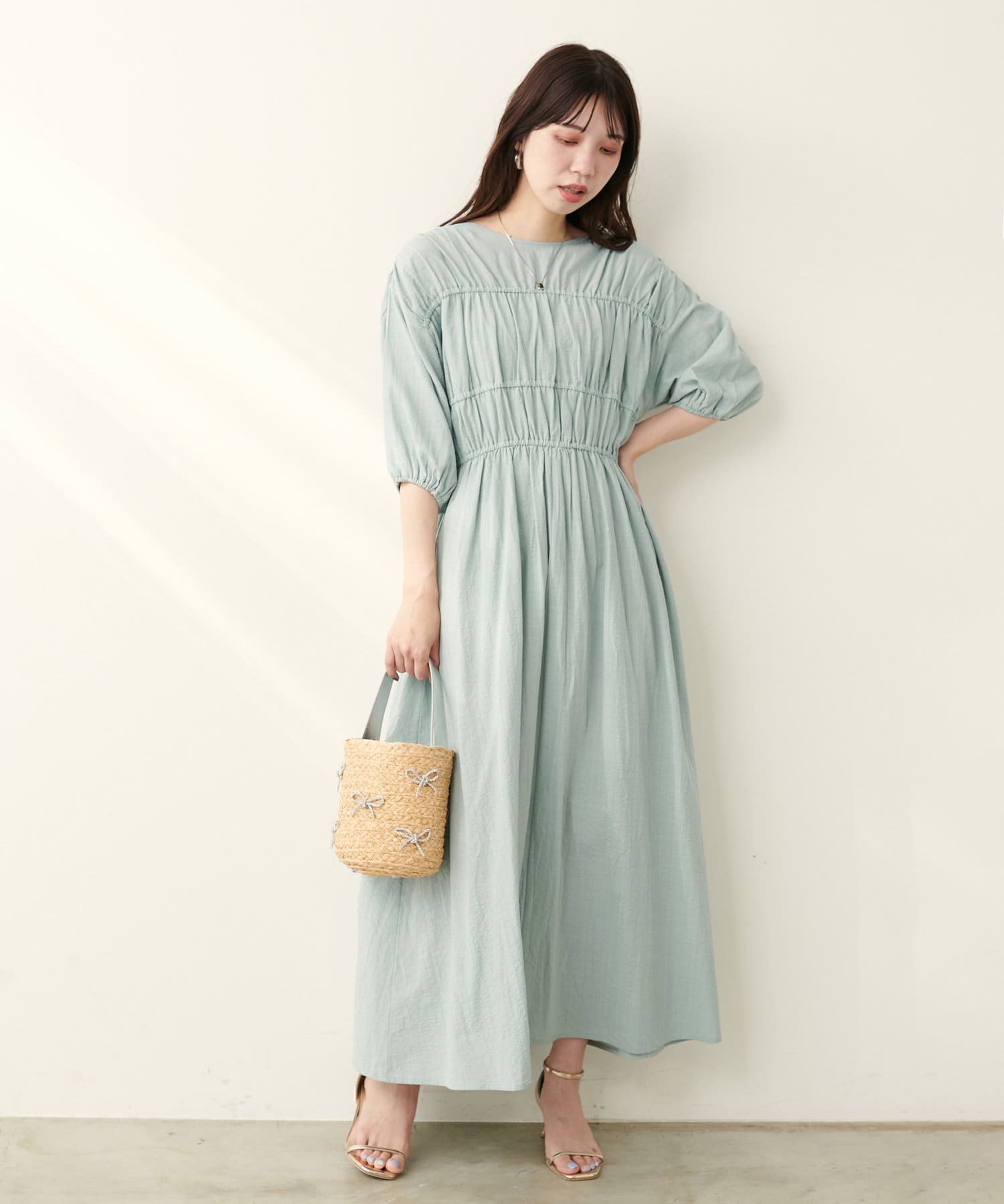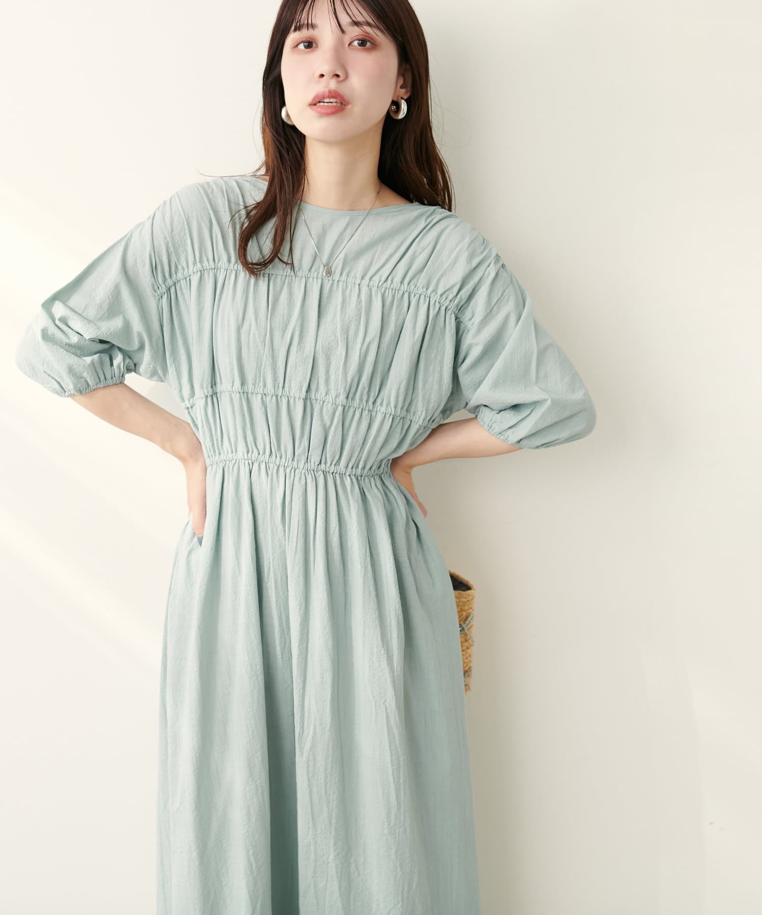 優しく爽やかなカラーなので、晩夏から秋口だけでなく、春先にも使える1枚持っておくと便利なワンピースです。